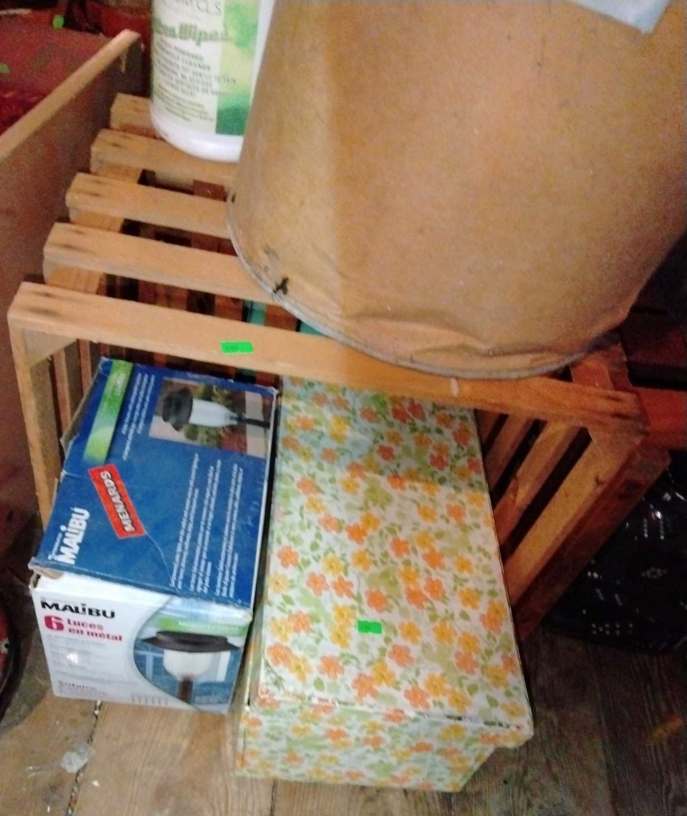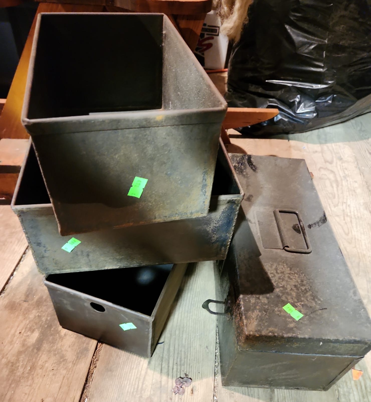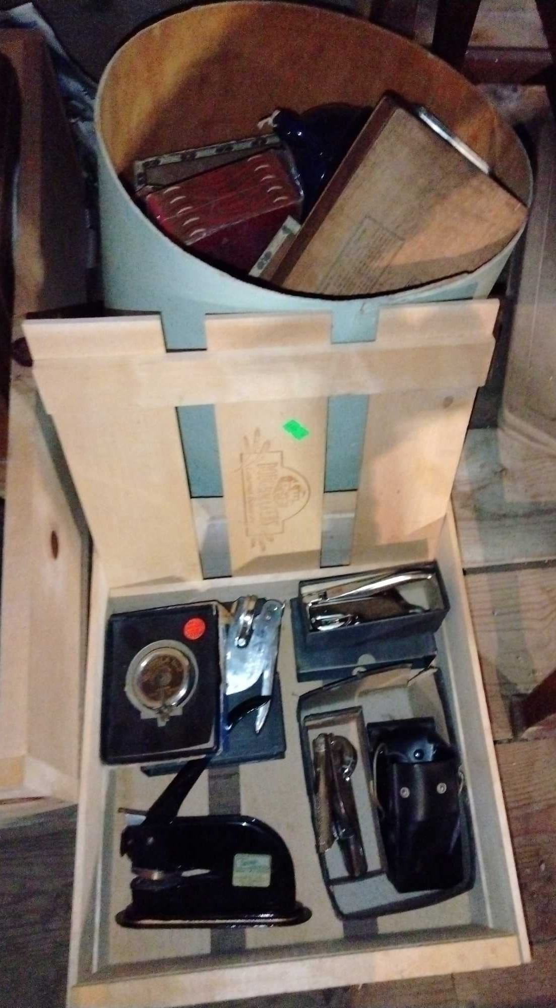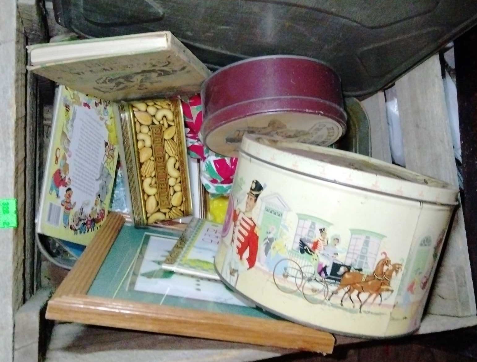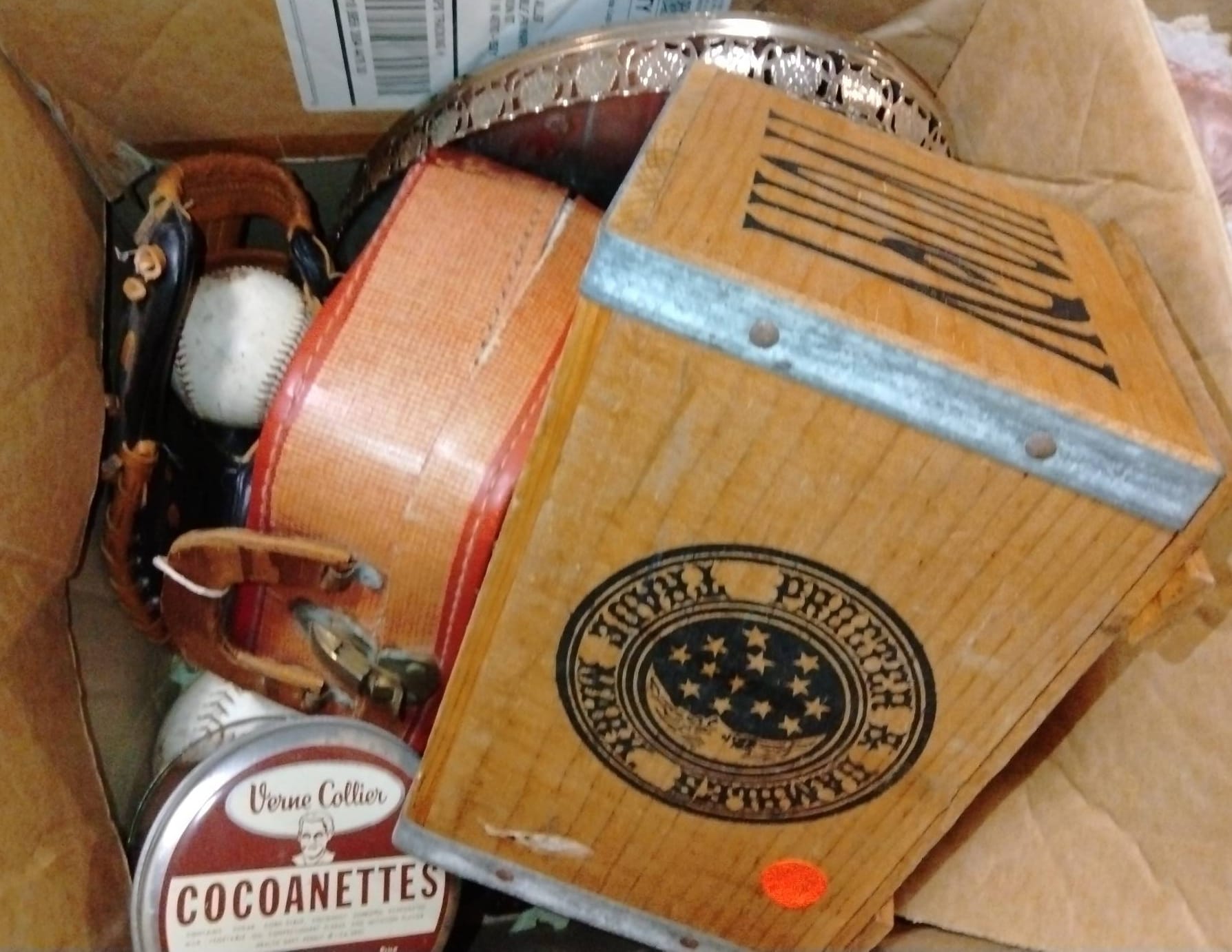 204 Wood crates, metal bread box, dominoes, books, cardboard barrel, metal lights