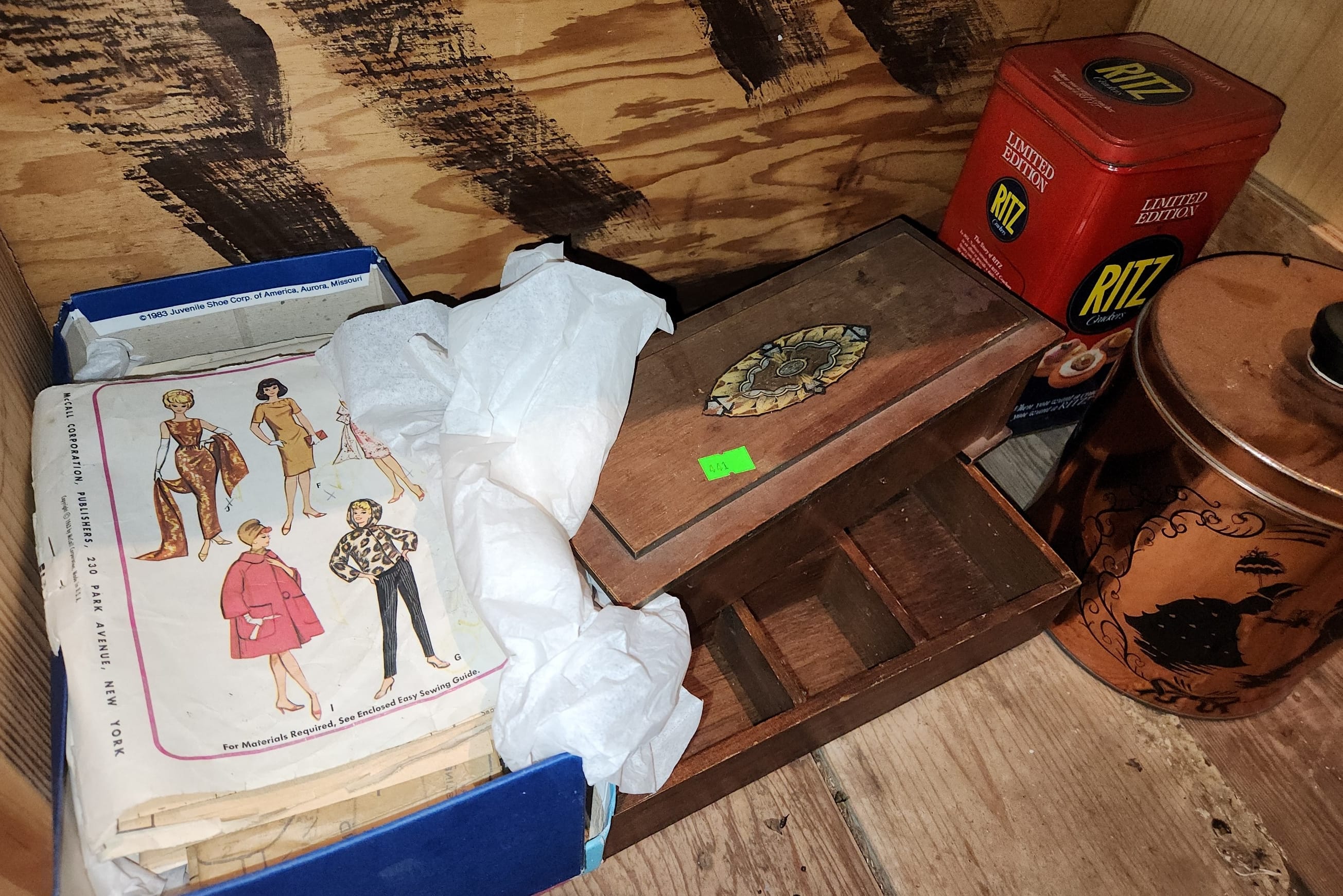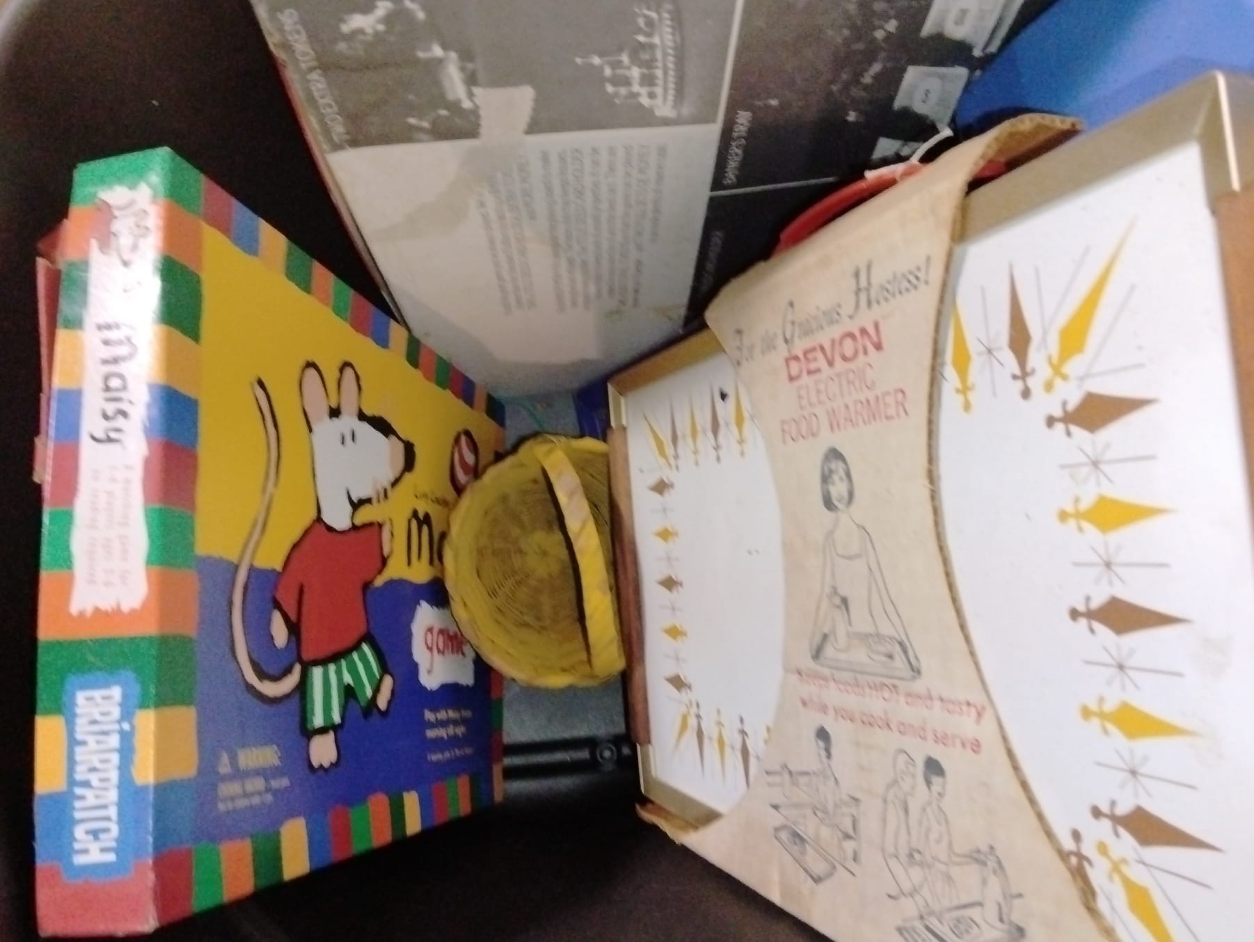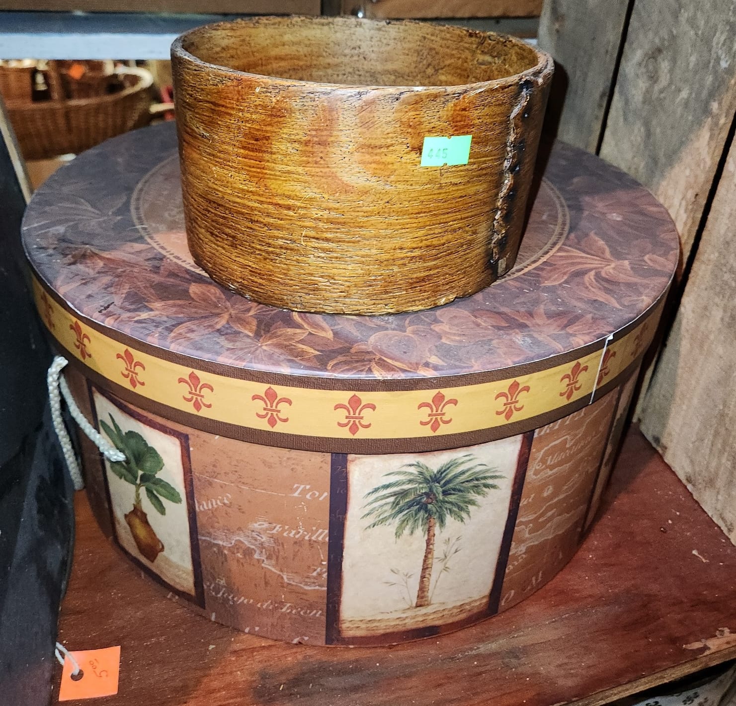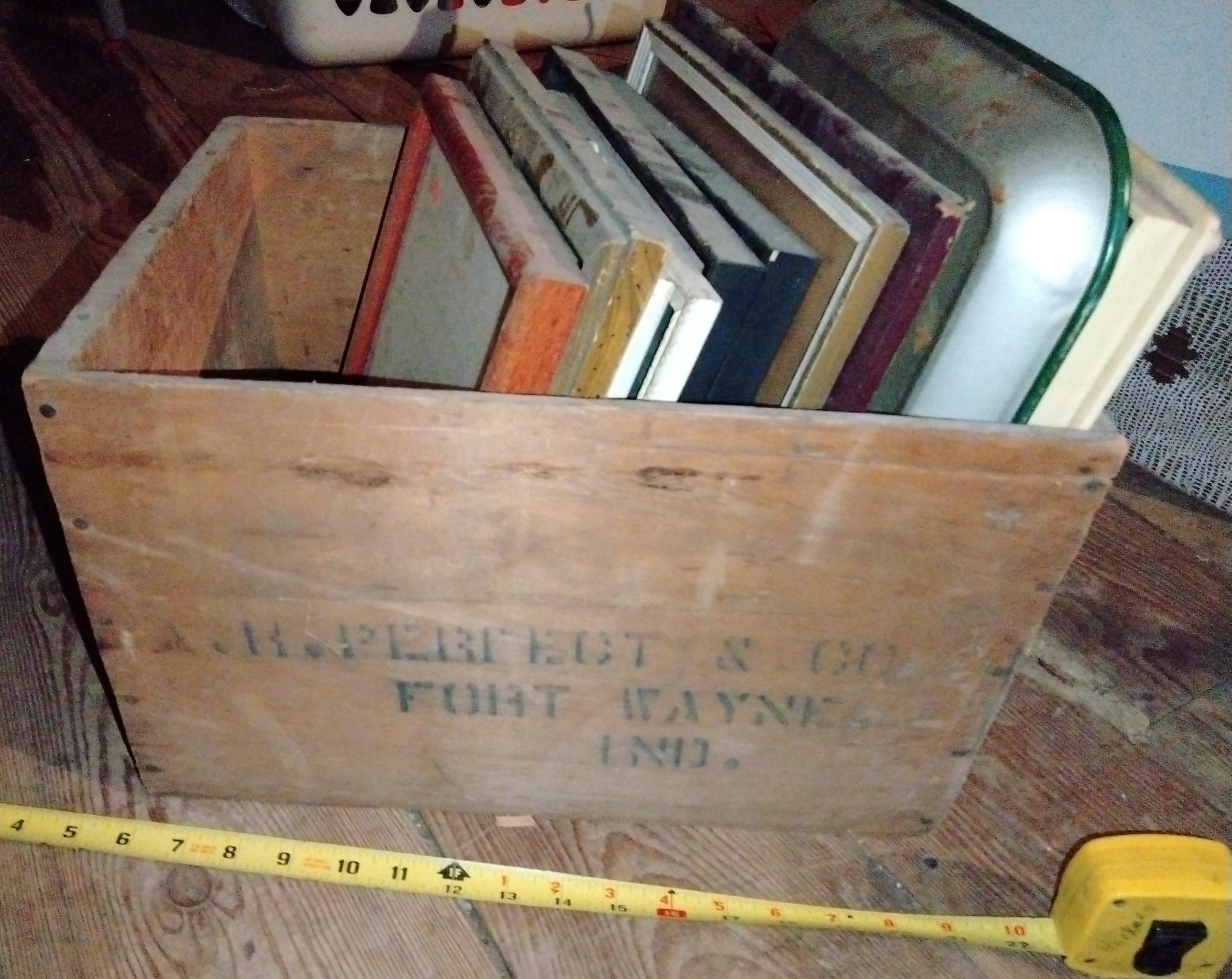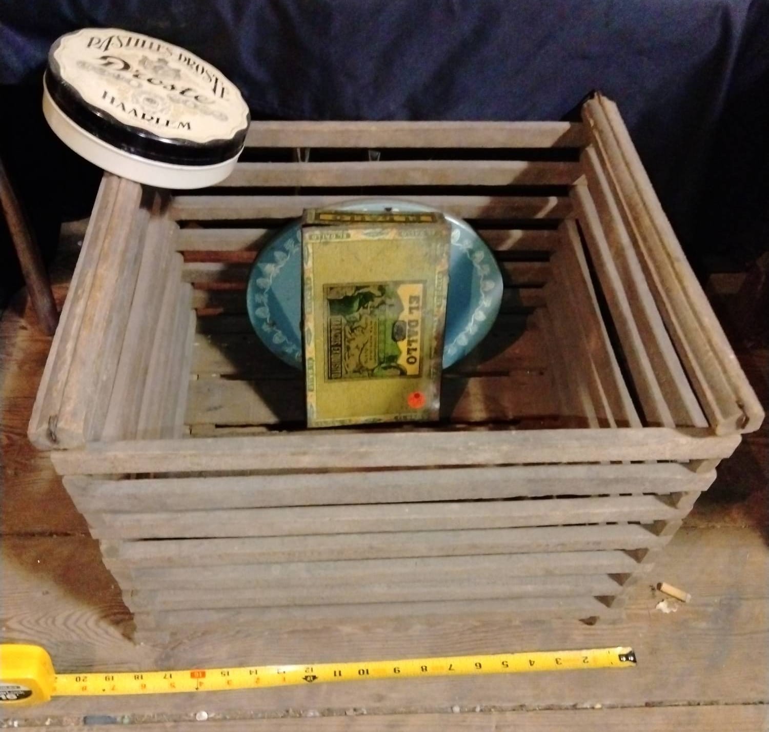 204 Wood crates, metal bread box, dominoes, books, cardboard barrel, metal lights