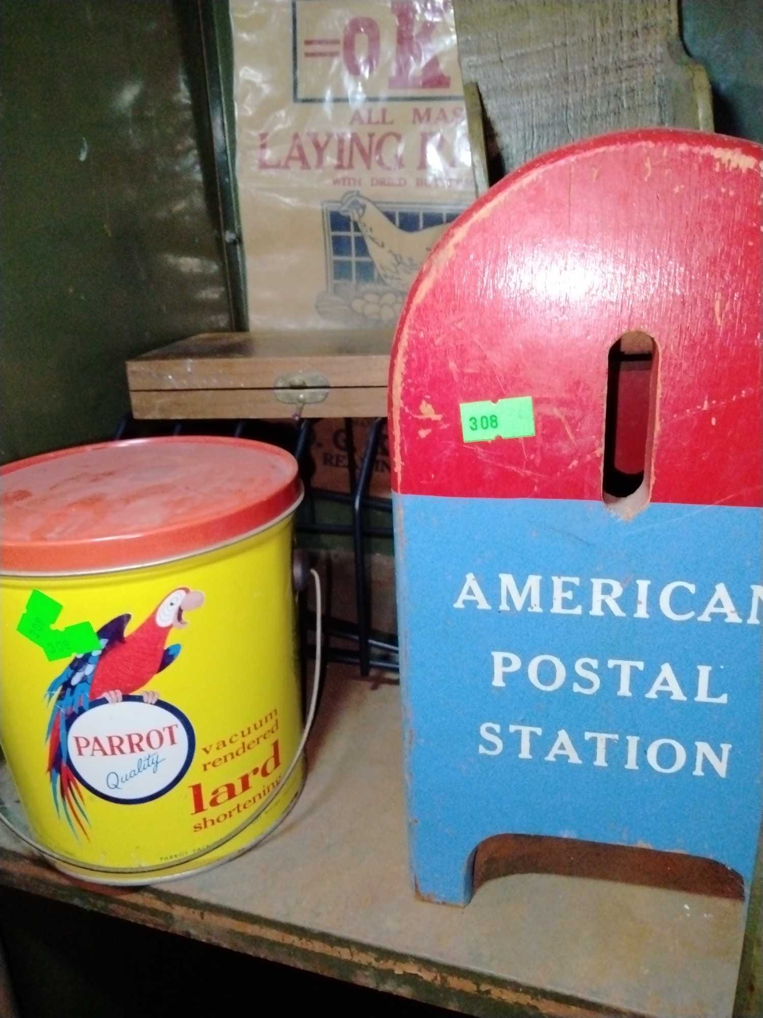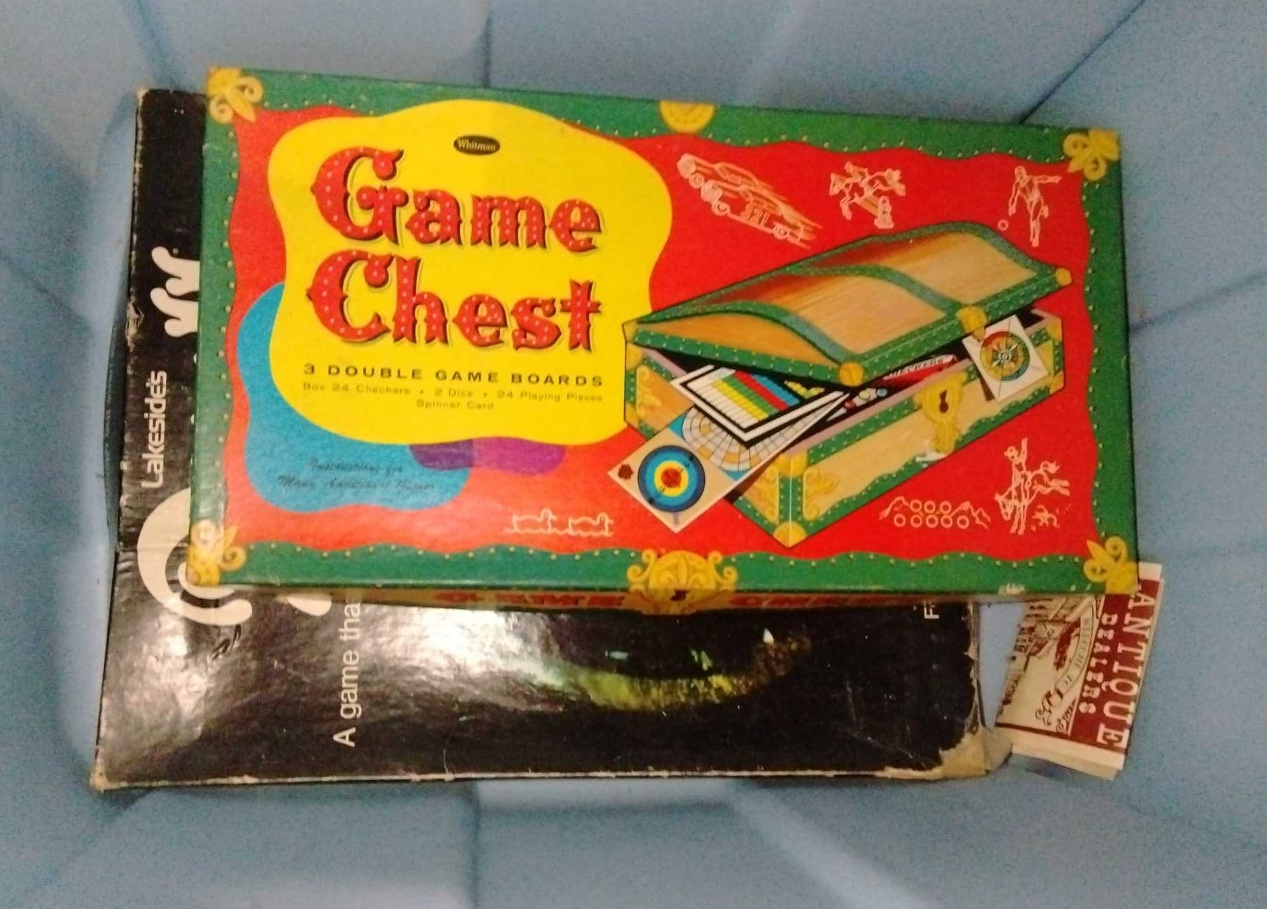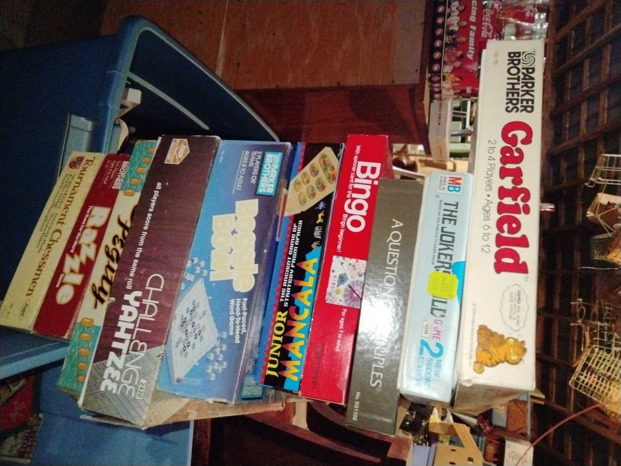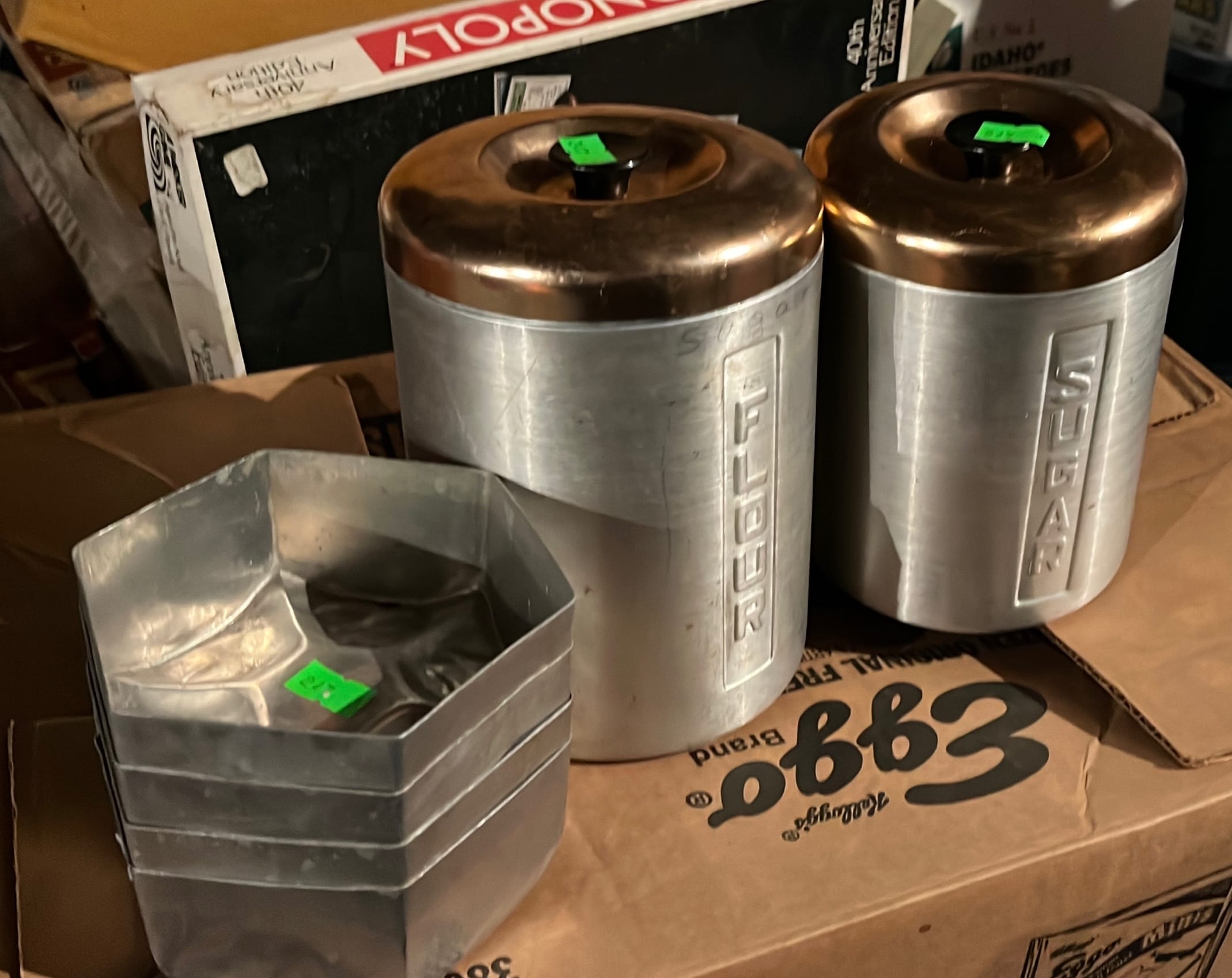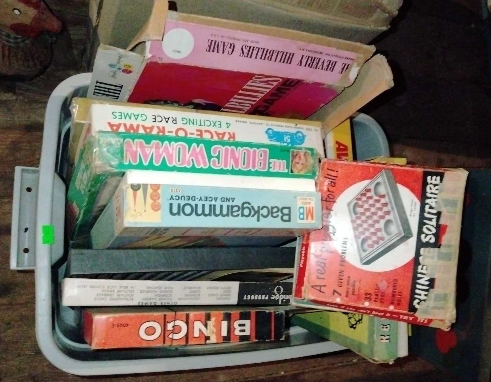 204 Wood crates, metal bread box, dominoes, books, cardboard barrel, metal lights