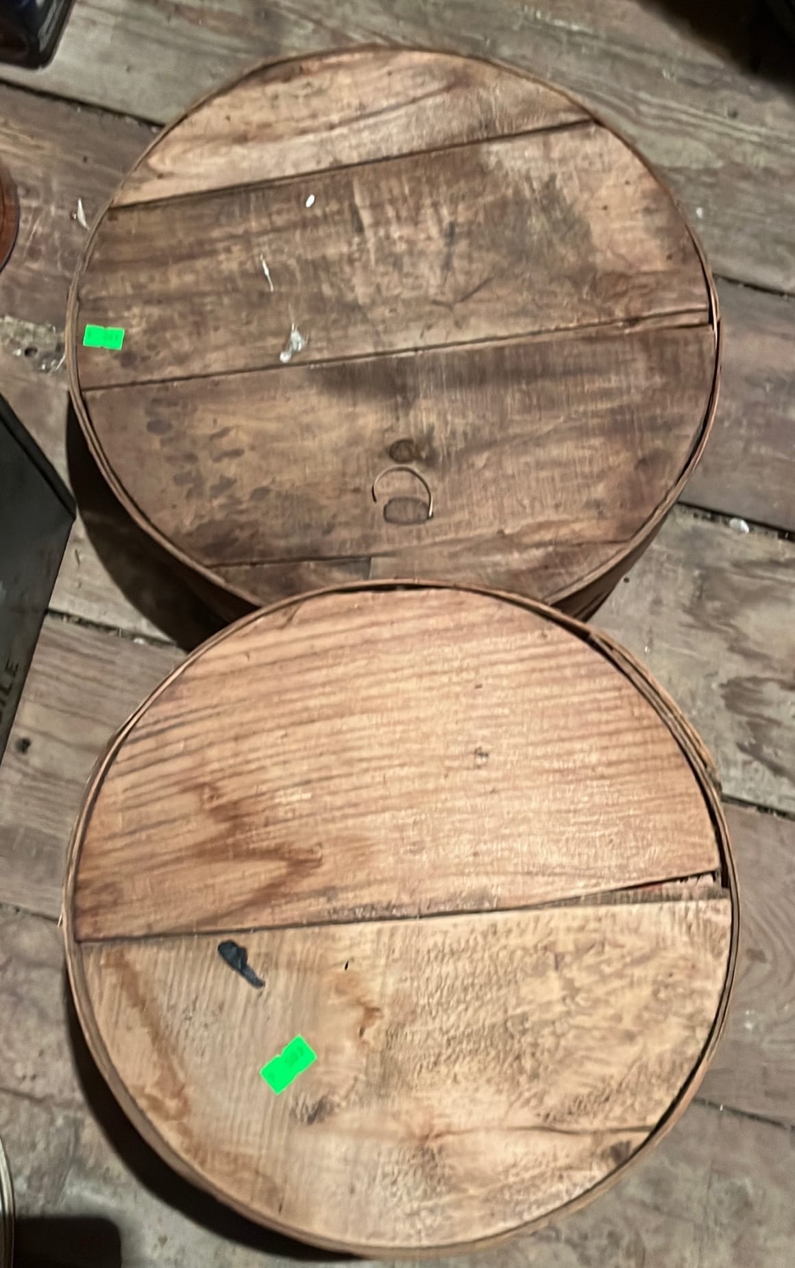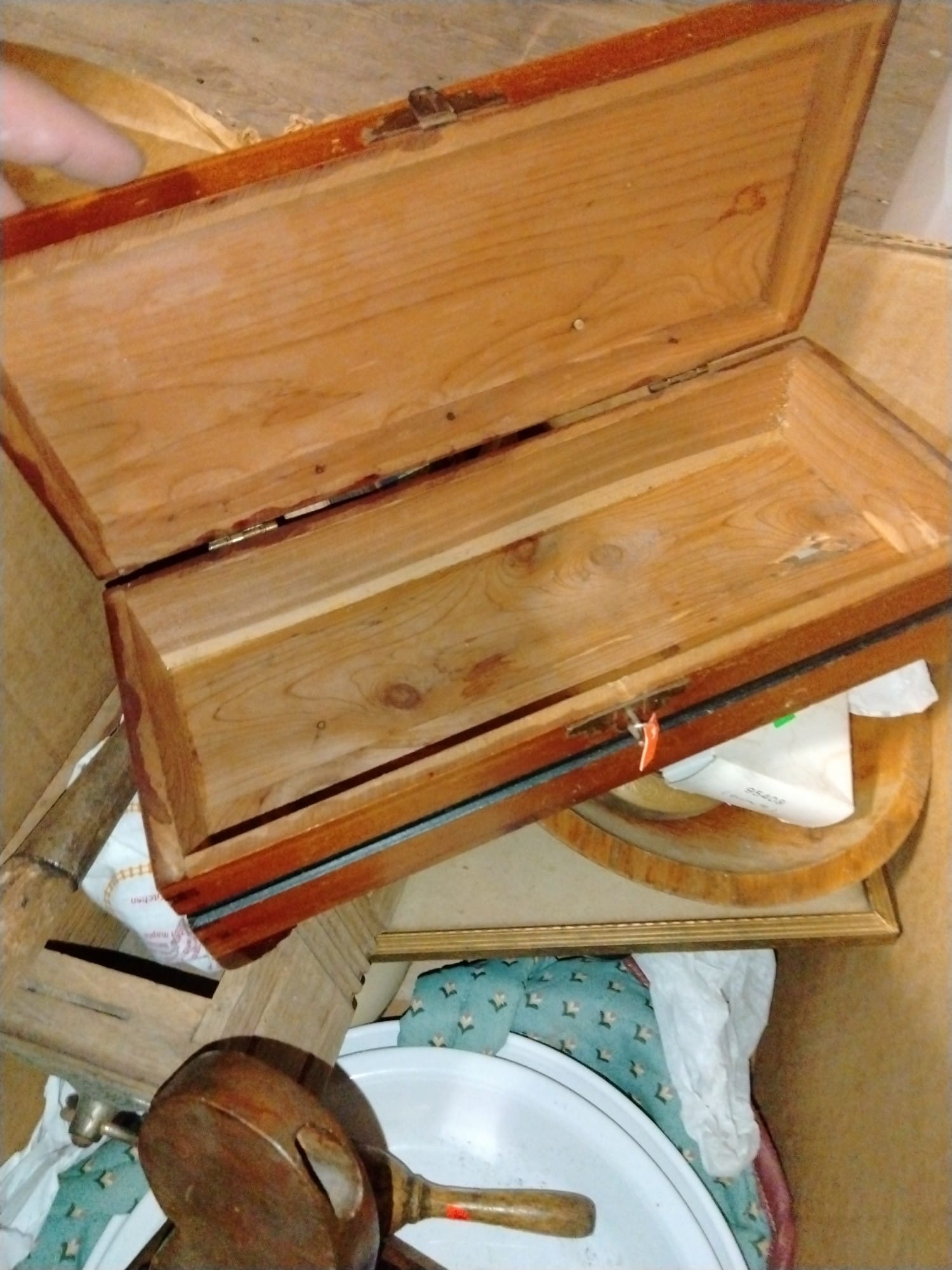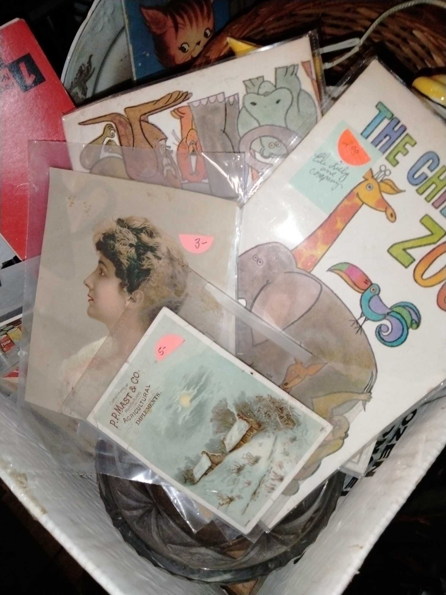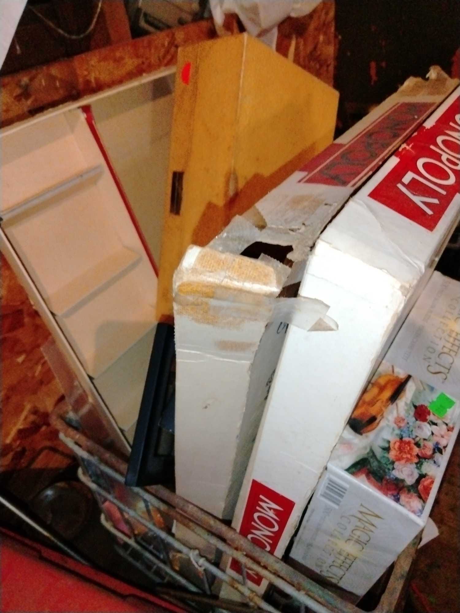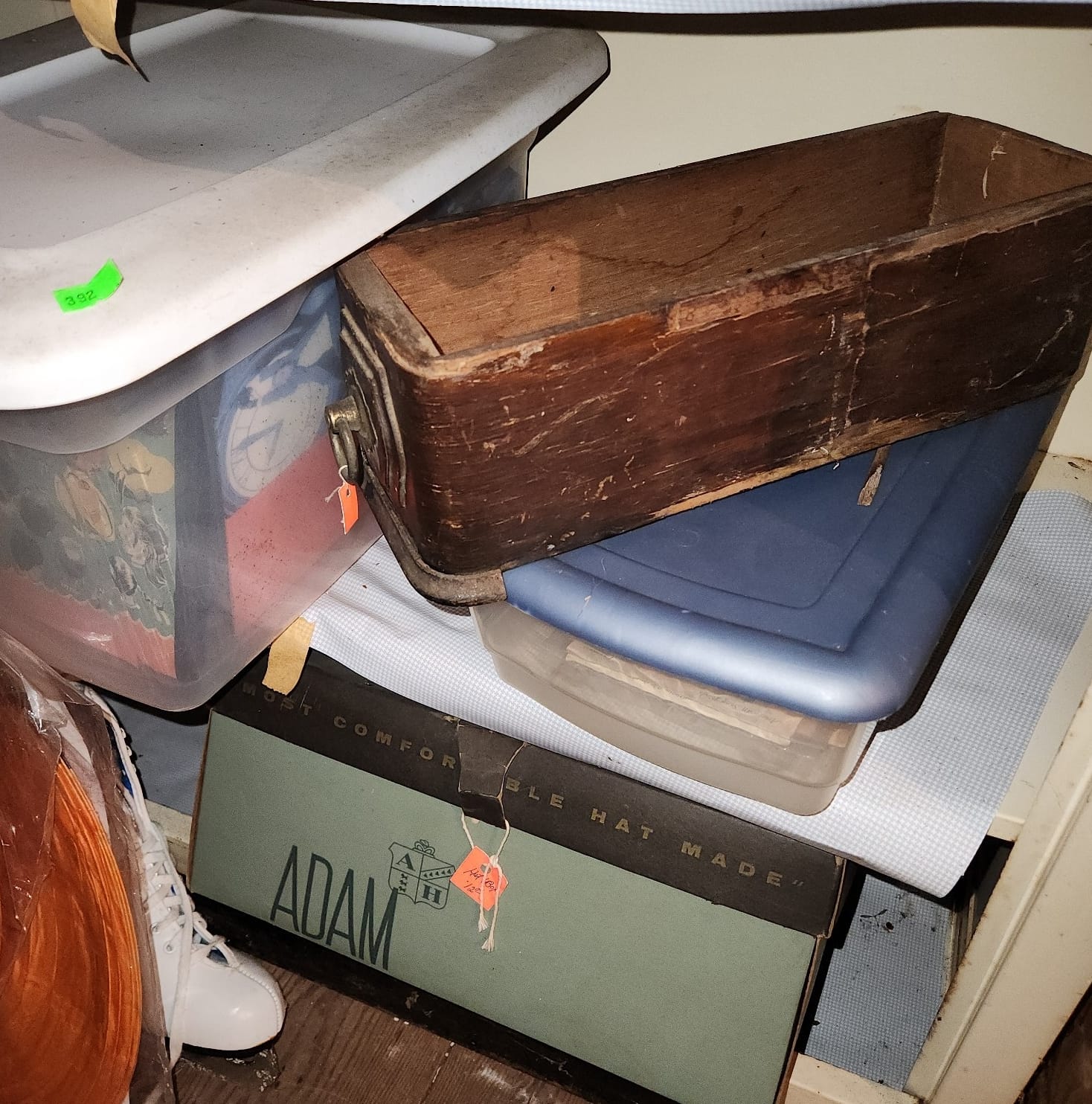 204 Wood crates, metal bread box, dominoes, books, cardboard barrel, metal lights