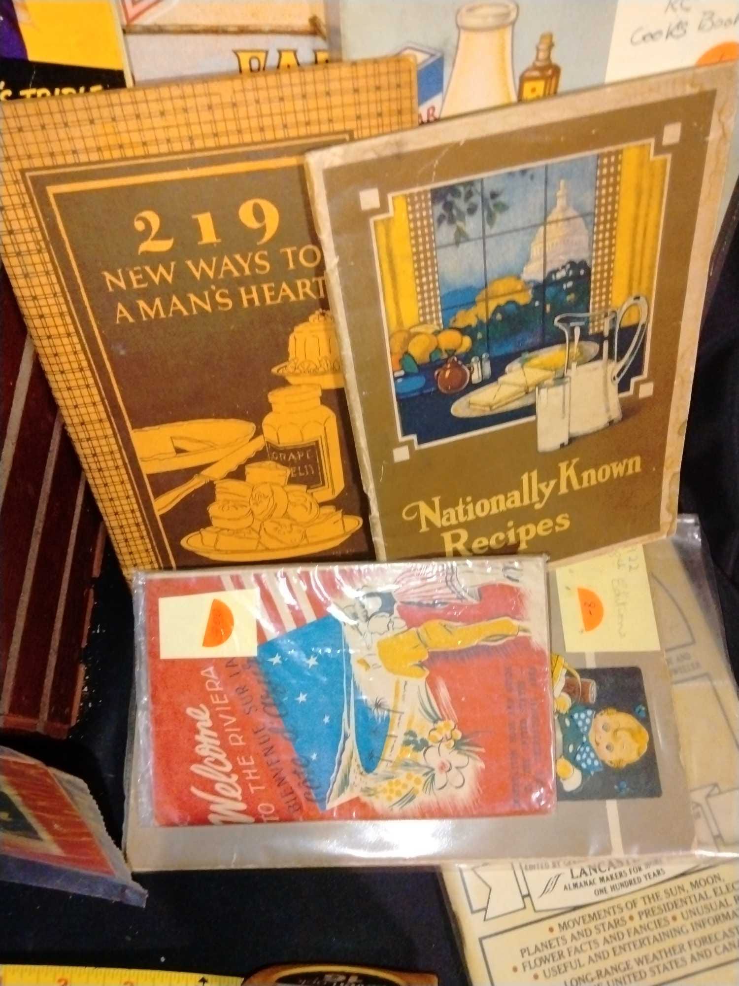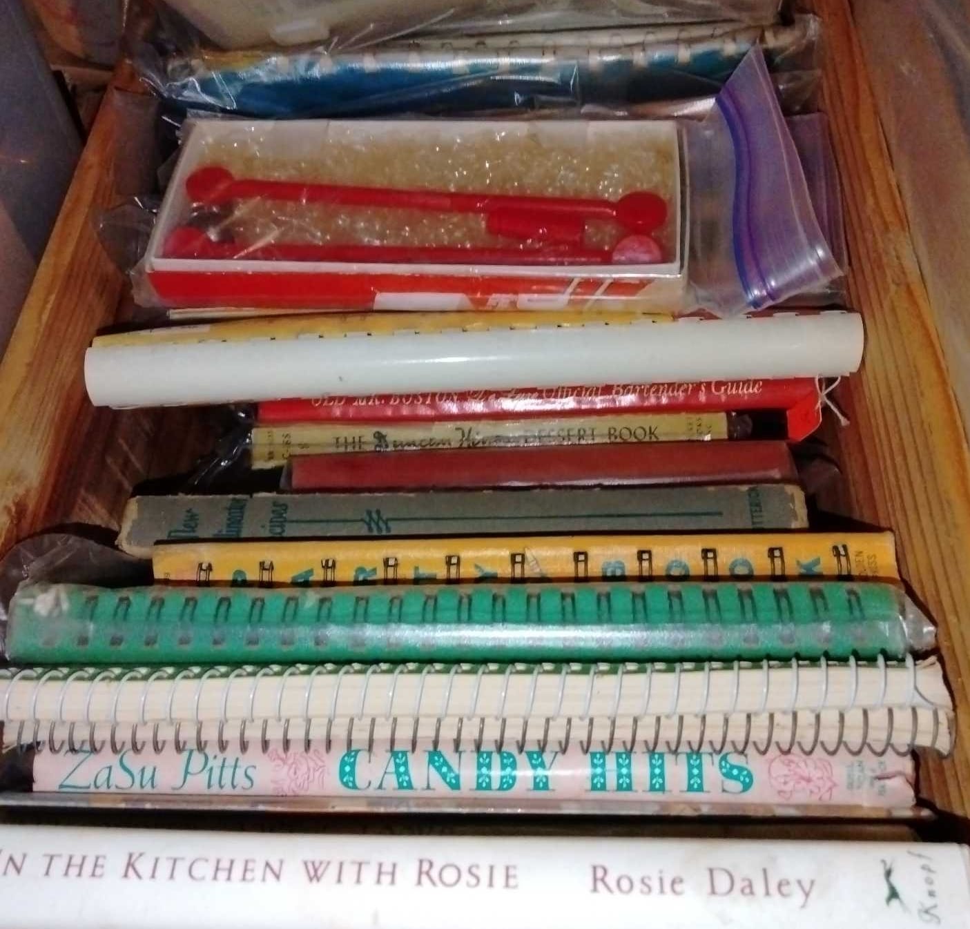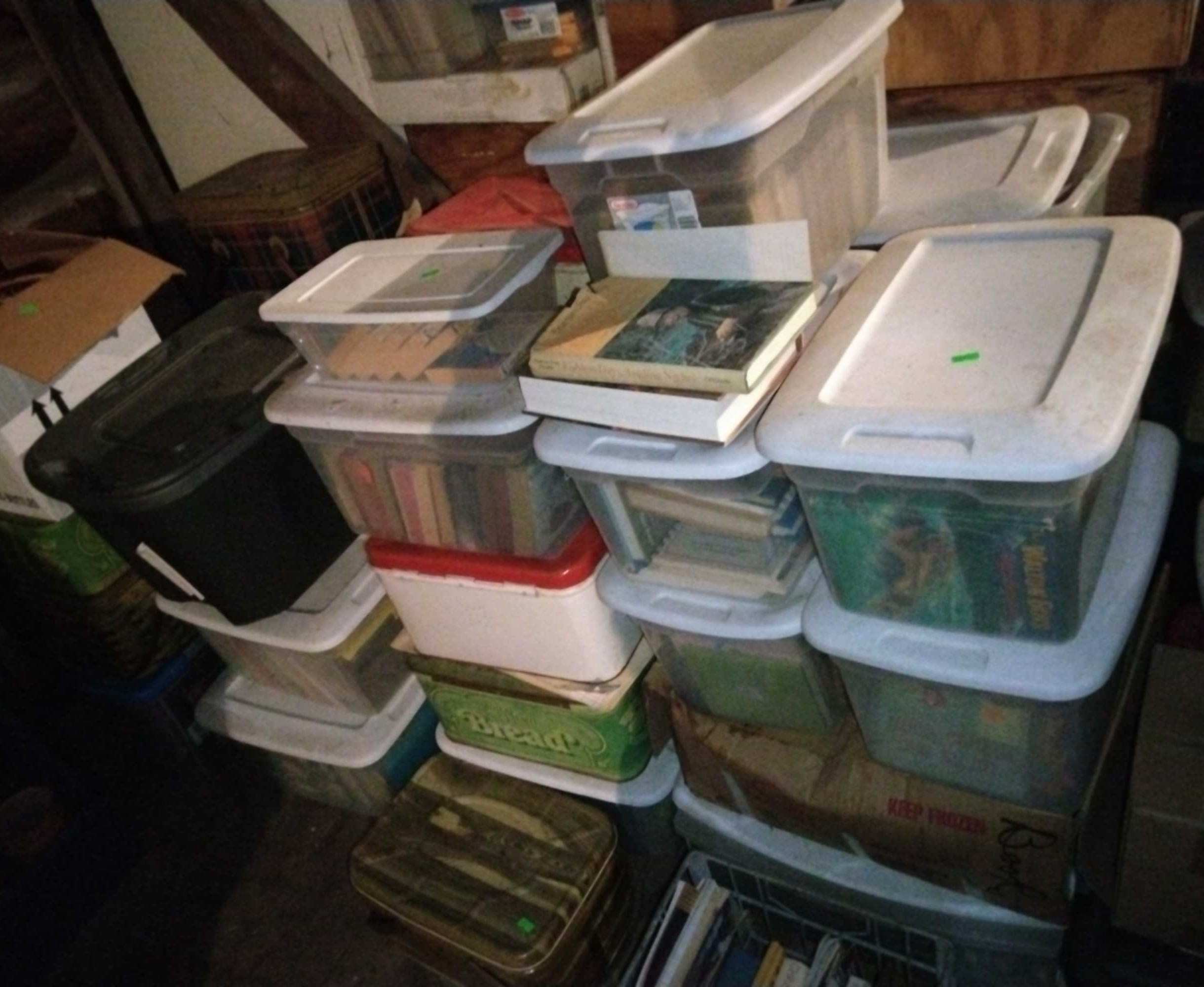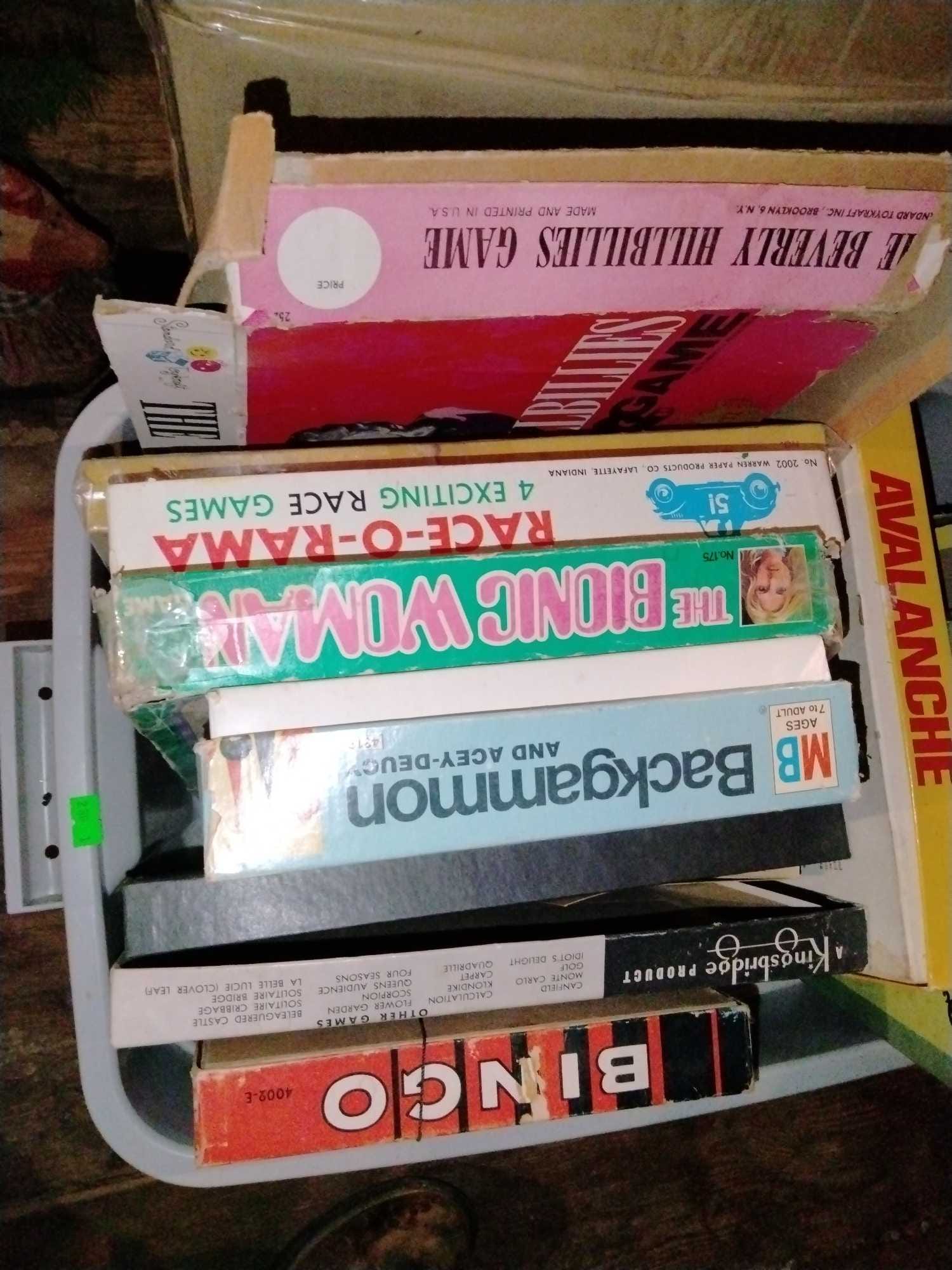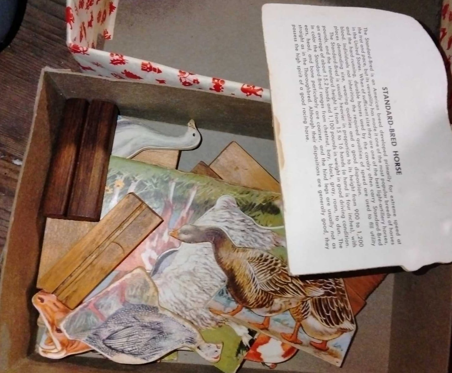 204 Wood crates, metal bread box, dominoes, books, cardboard barrel, metal lights