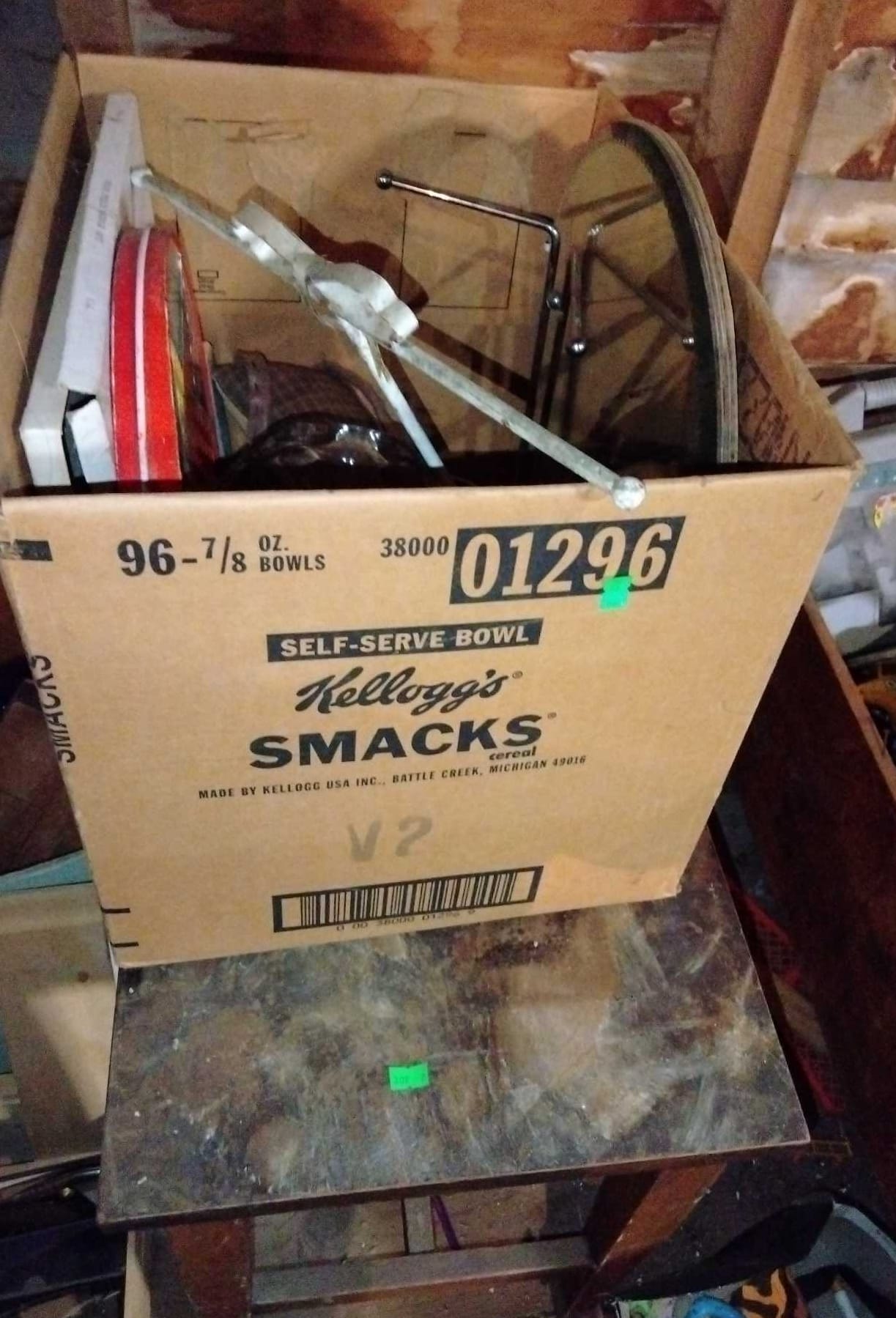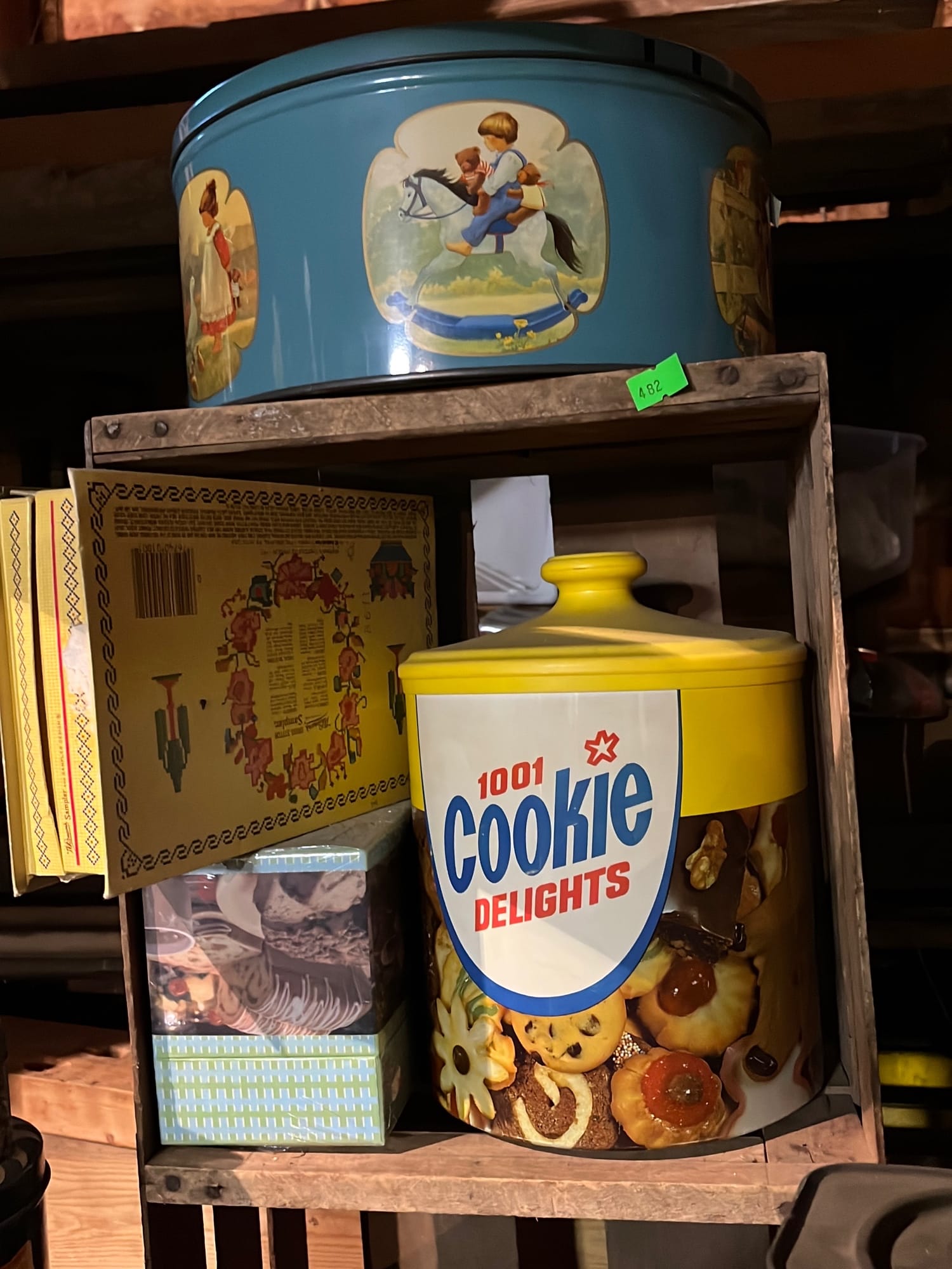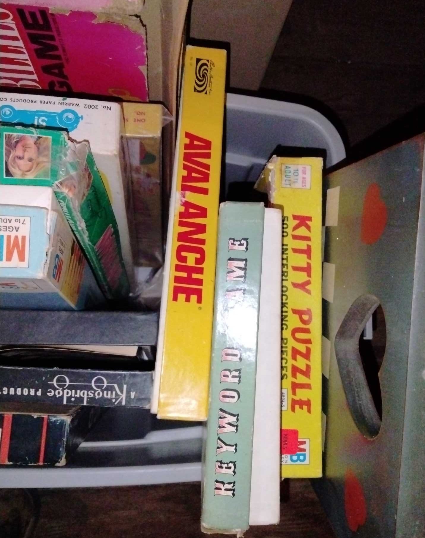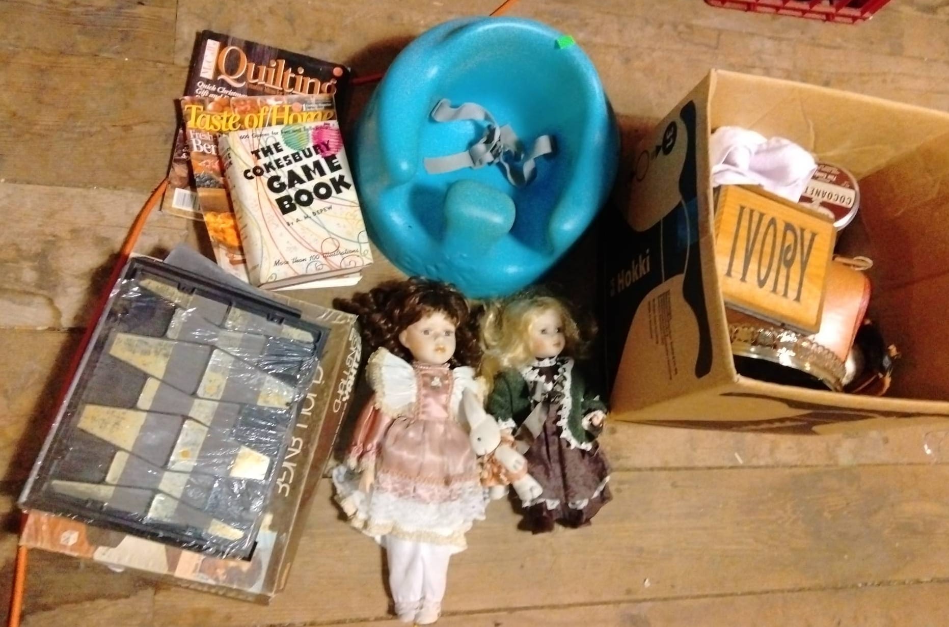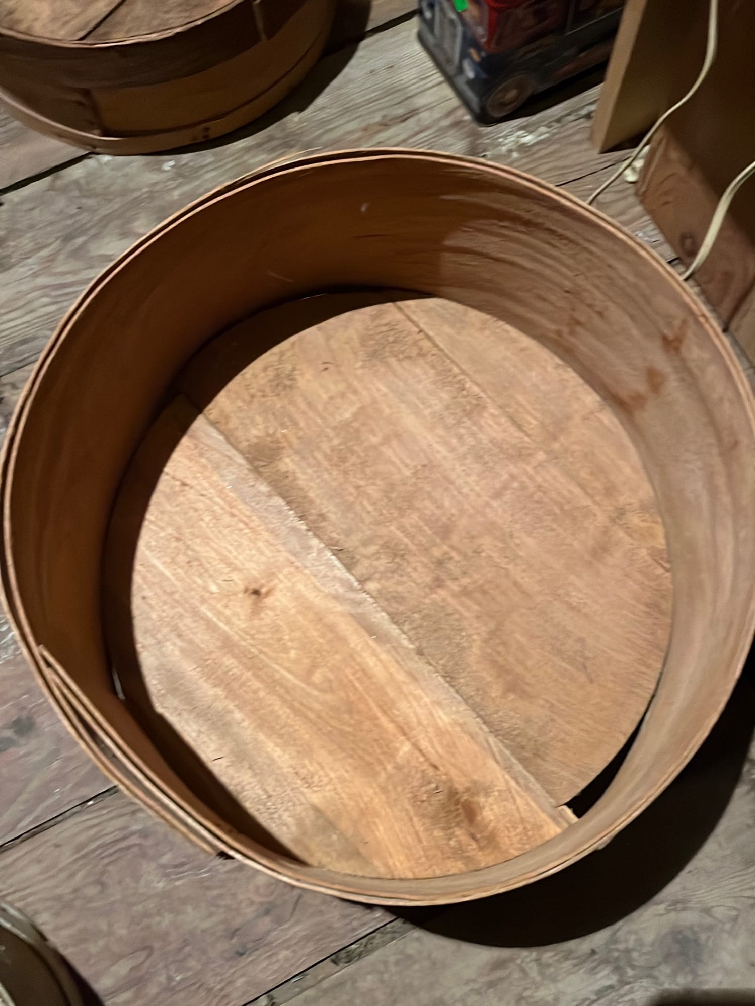 204 Wood crates, metal bread box, dominoes, books, cardboard barrel, metal lights