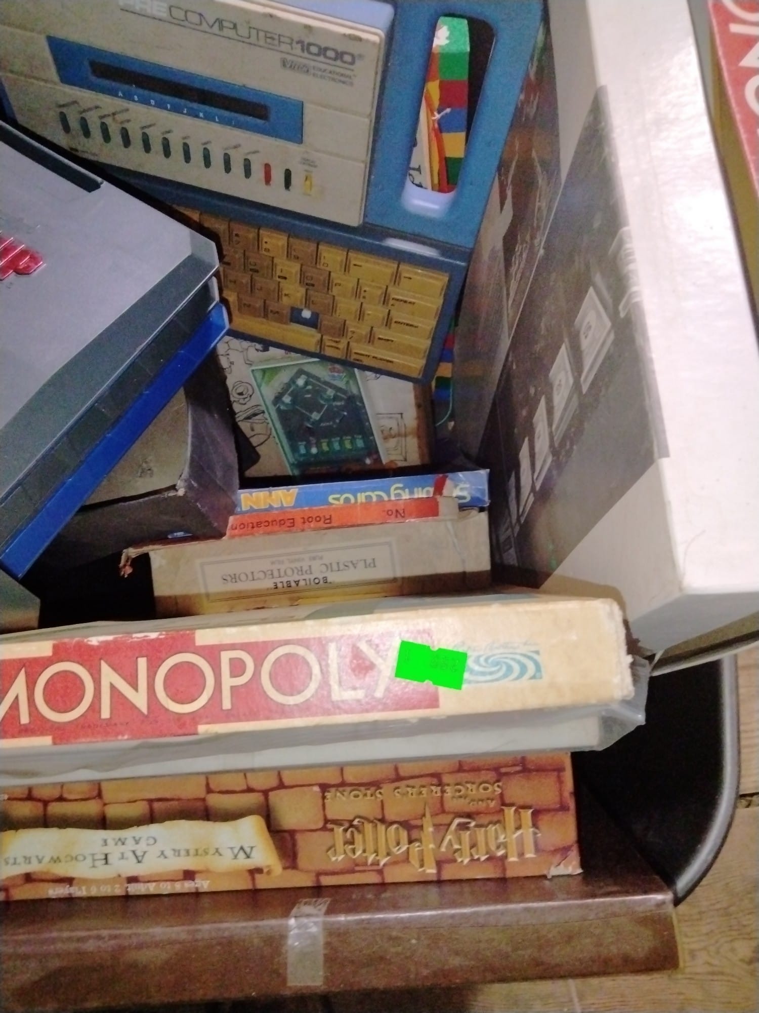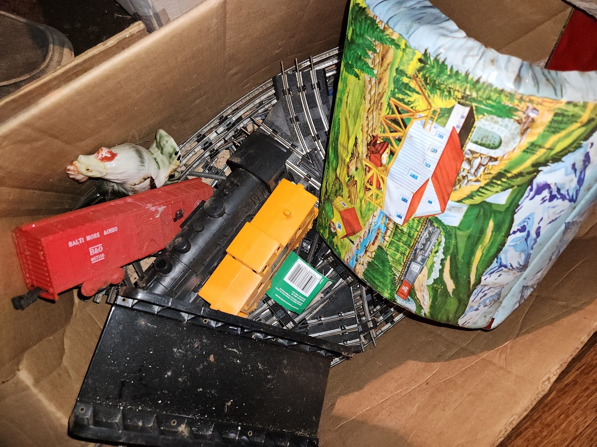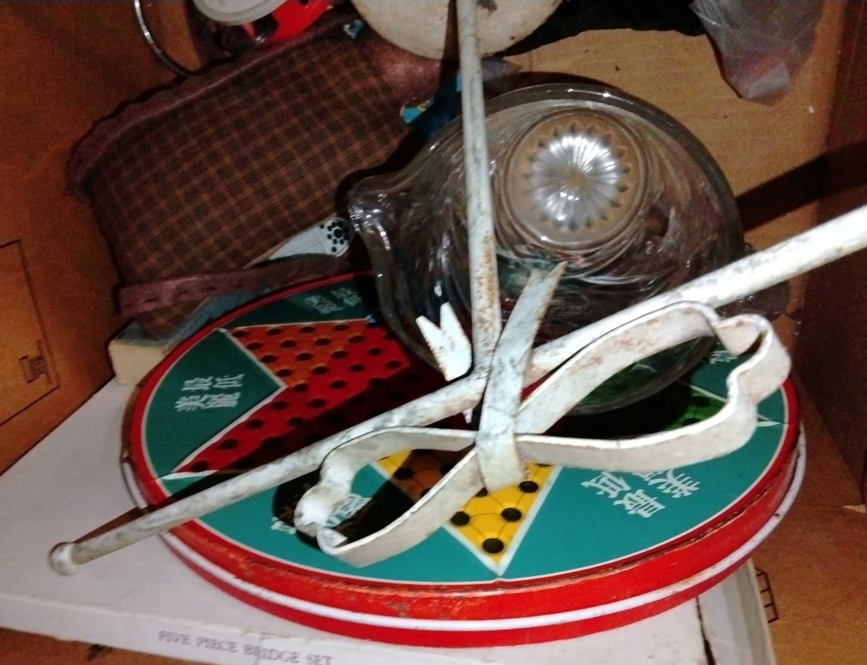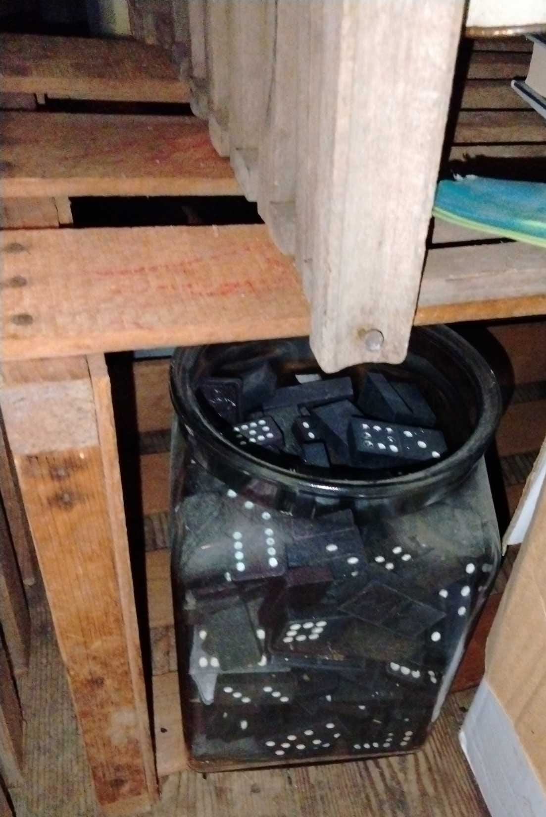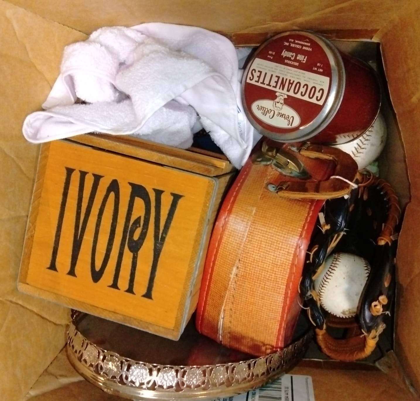 204 Wood crates, metal bread box, dominoes, books, cardboard barrel, metal lights