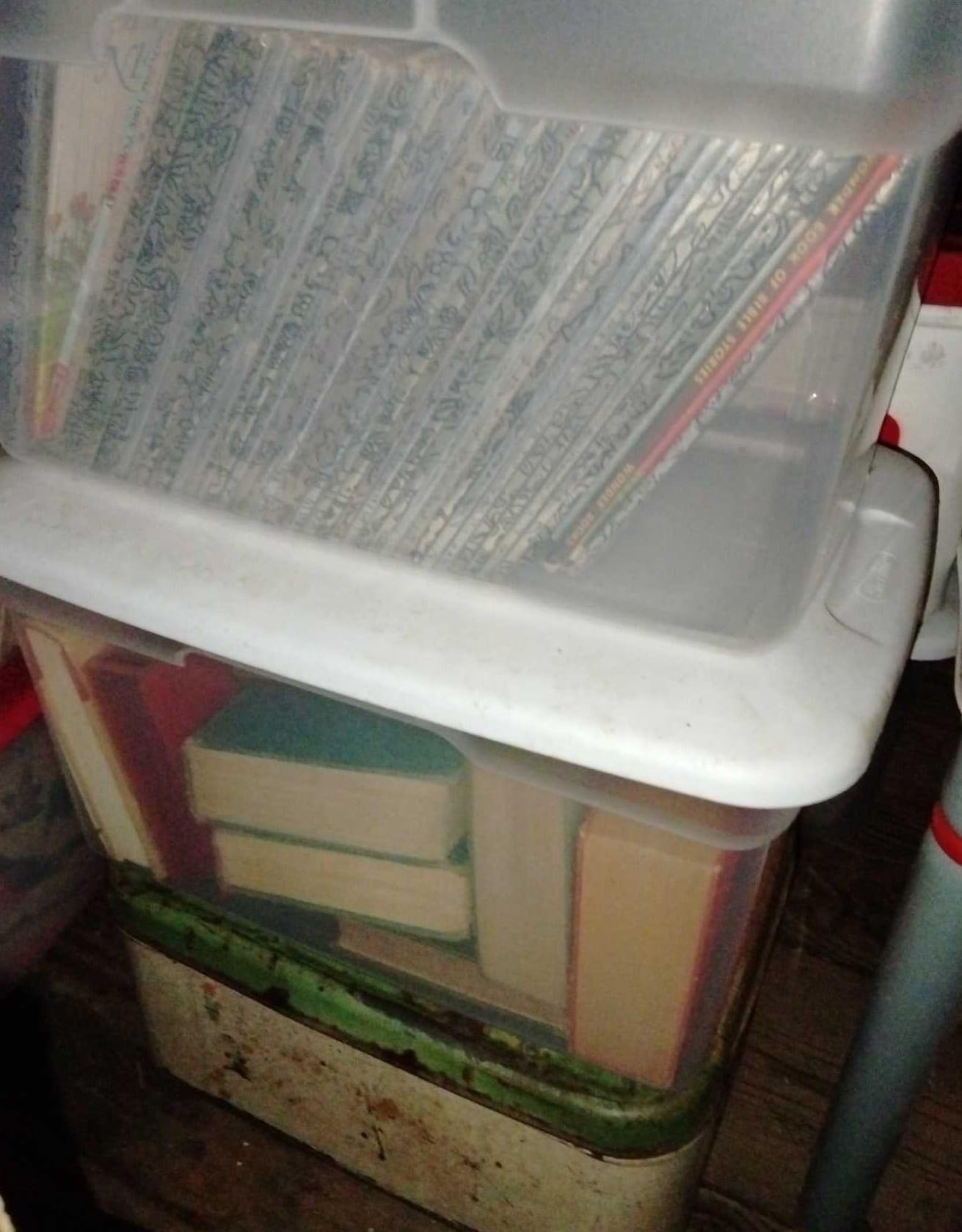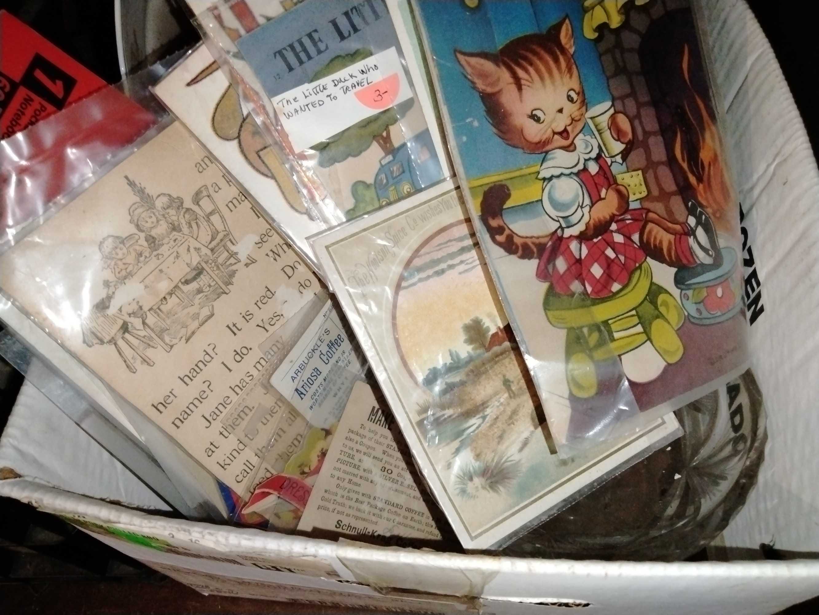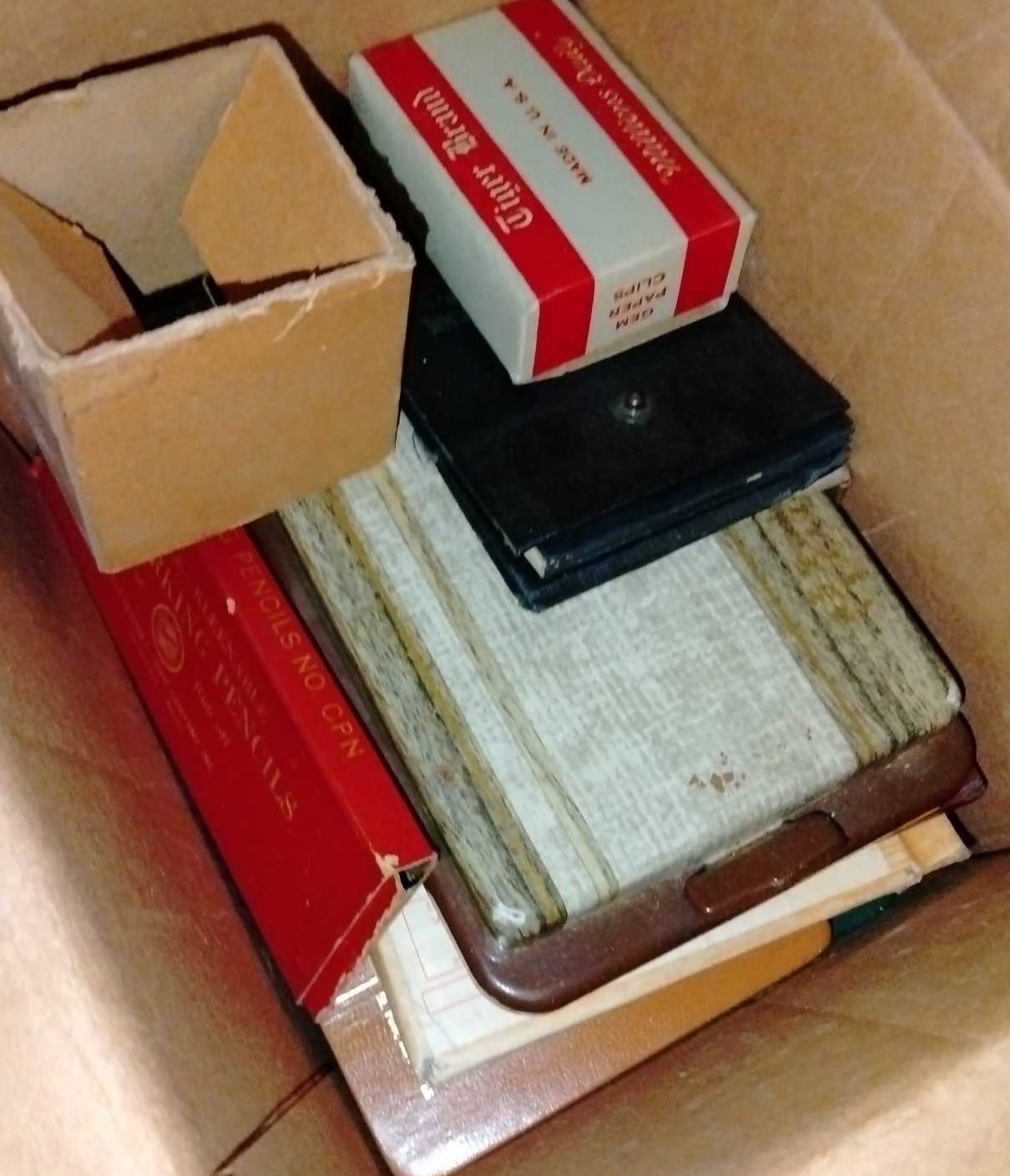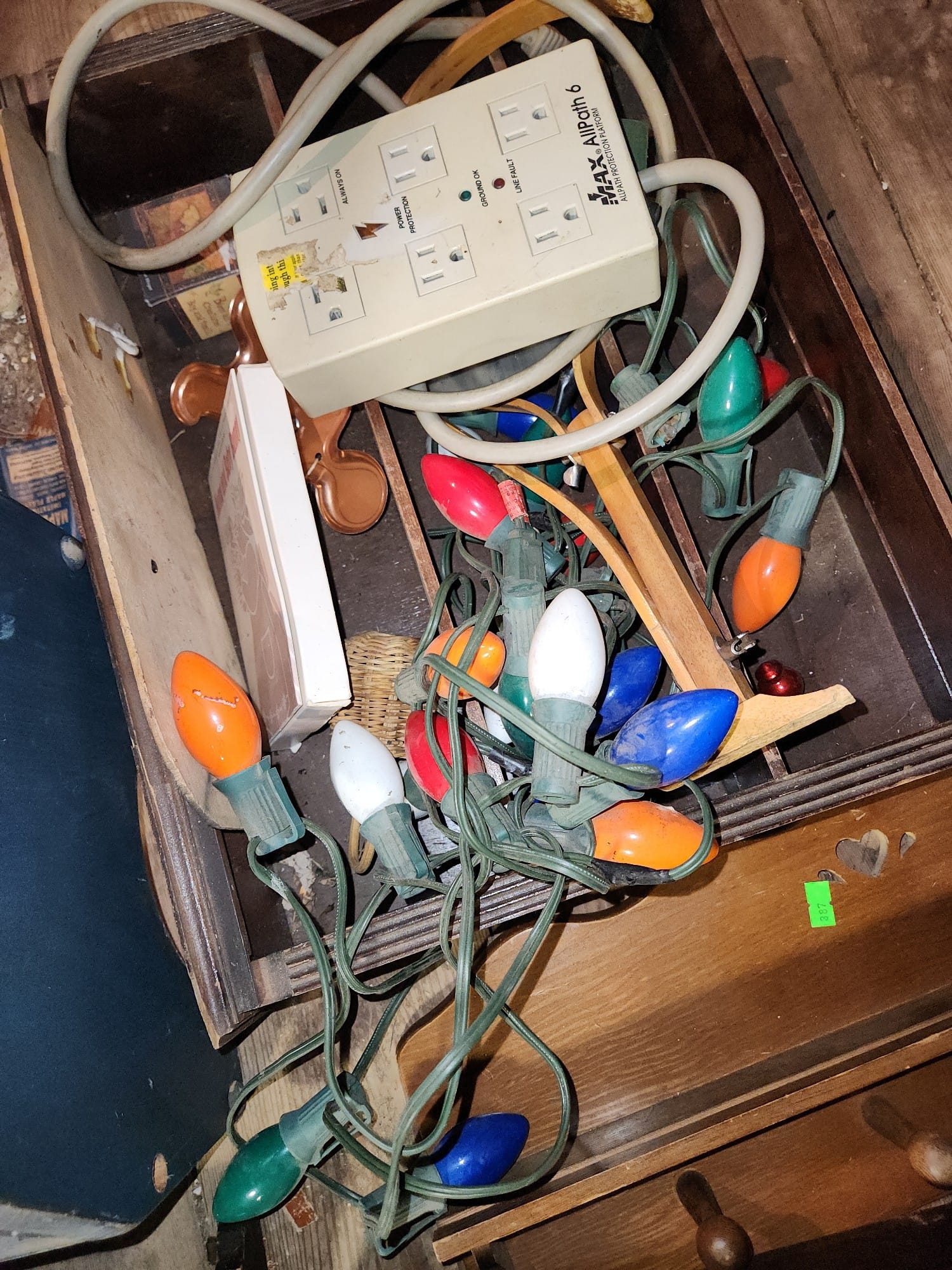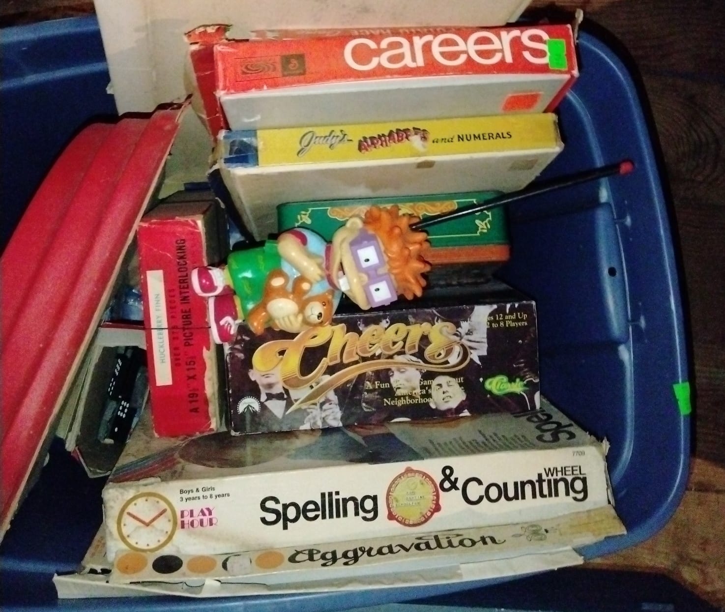 204 Wood crates, metal bread box, dominoes, books, cardboard barrel, metal lights