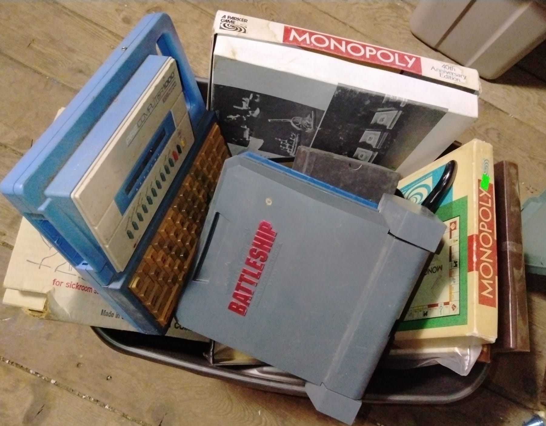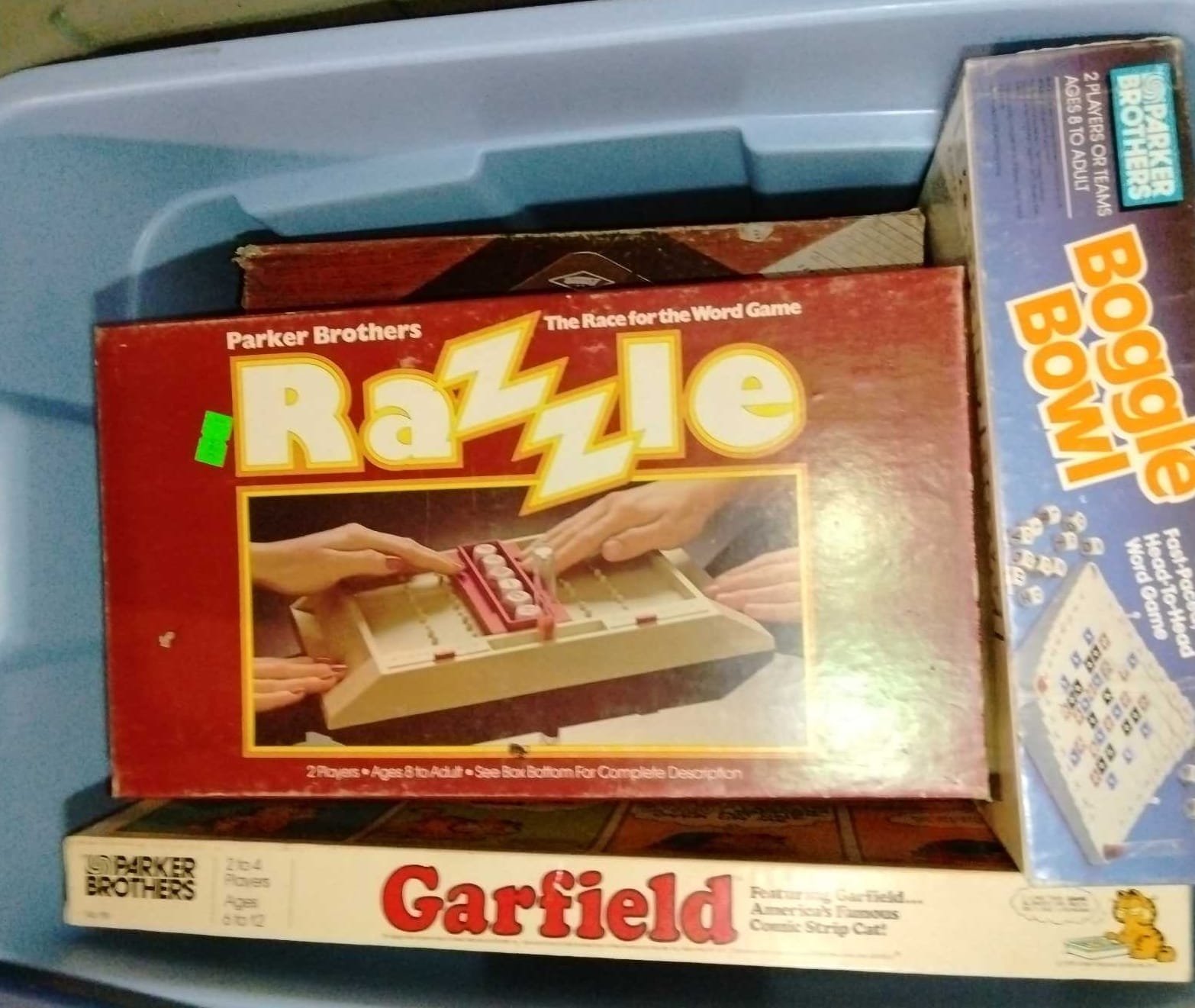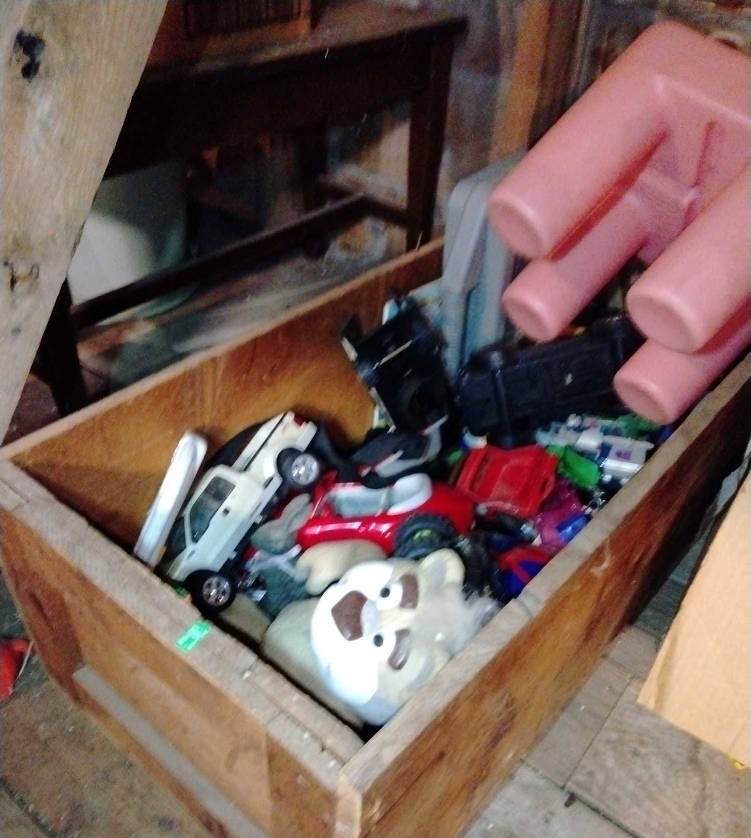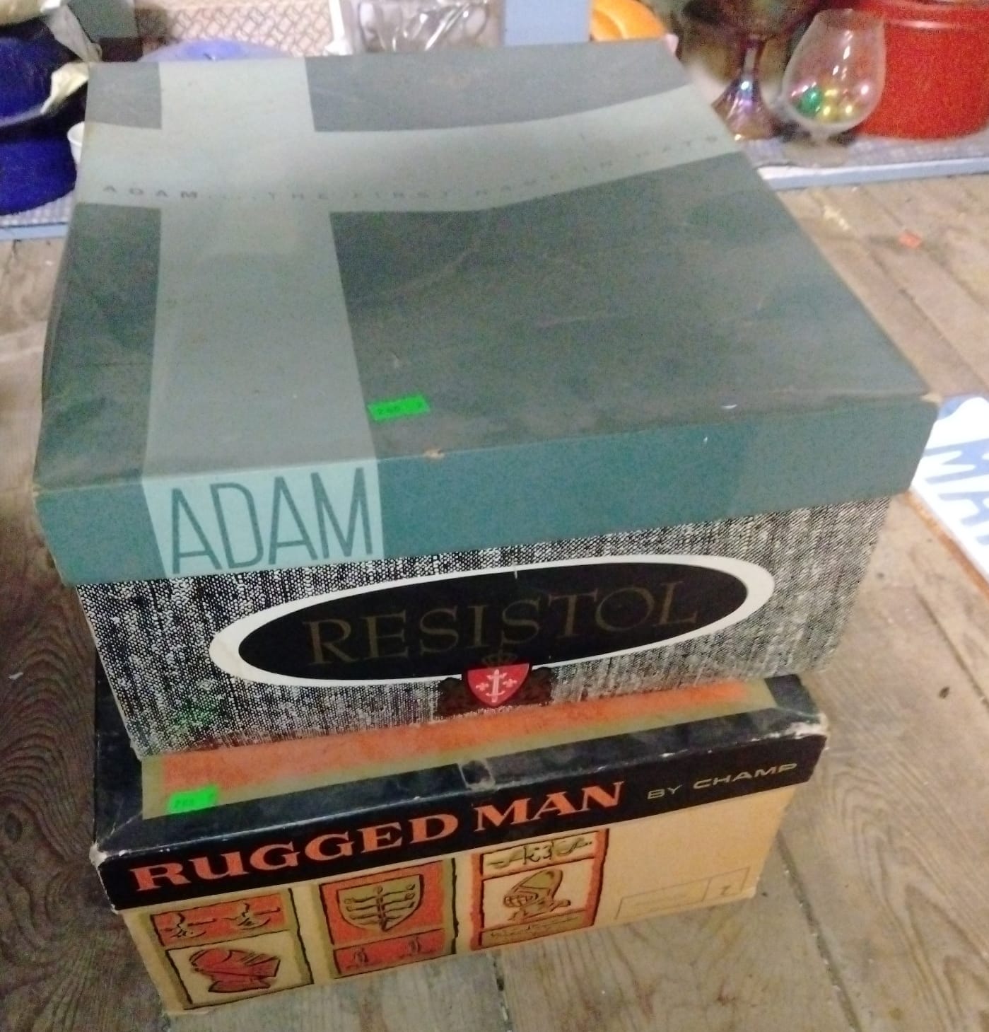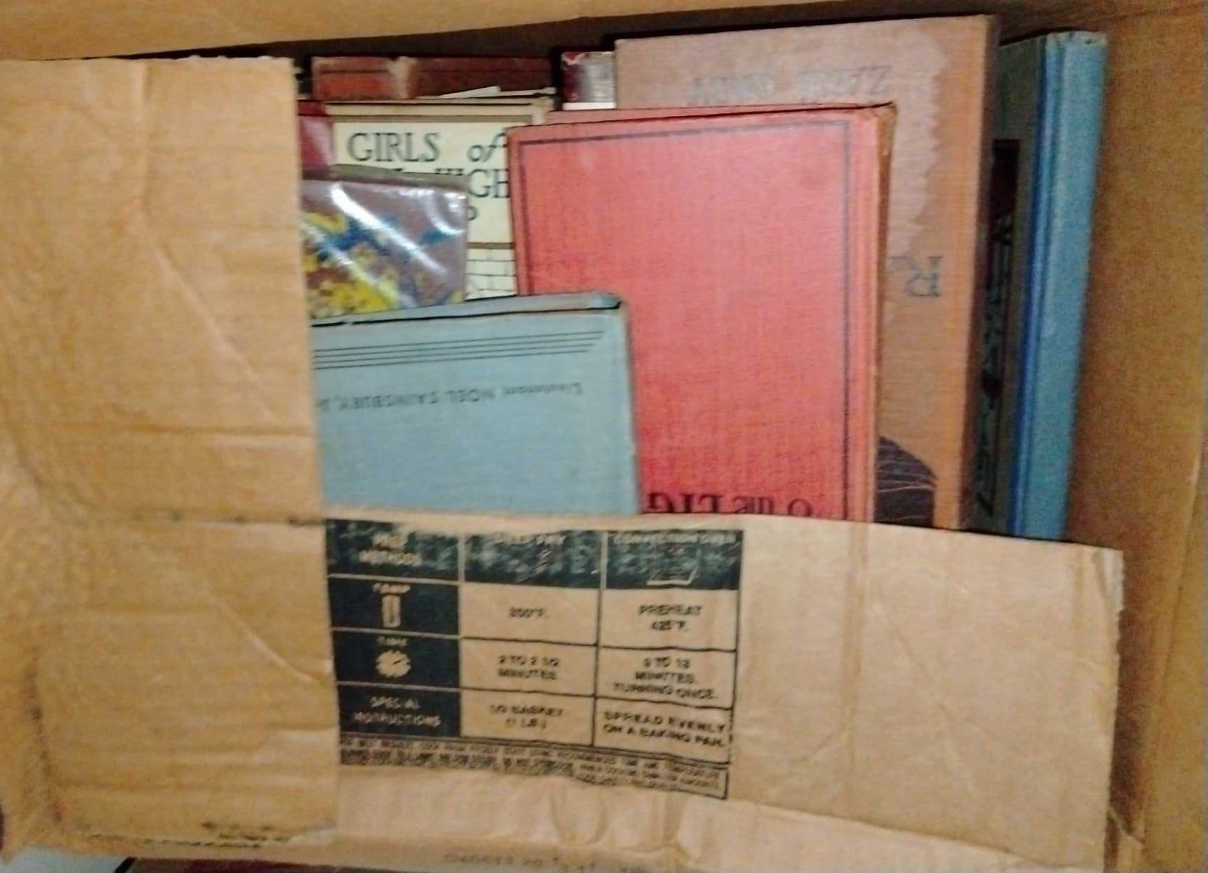 204 Wood crates, metal bread box, dominoes, books, cardboard barrel, metal lights