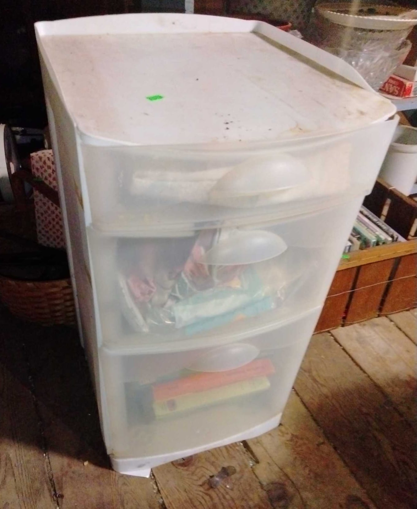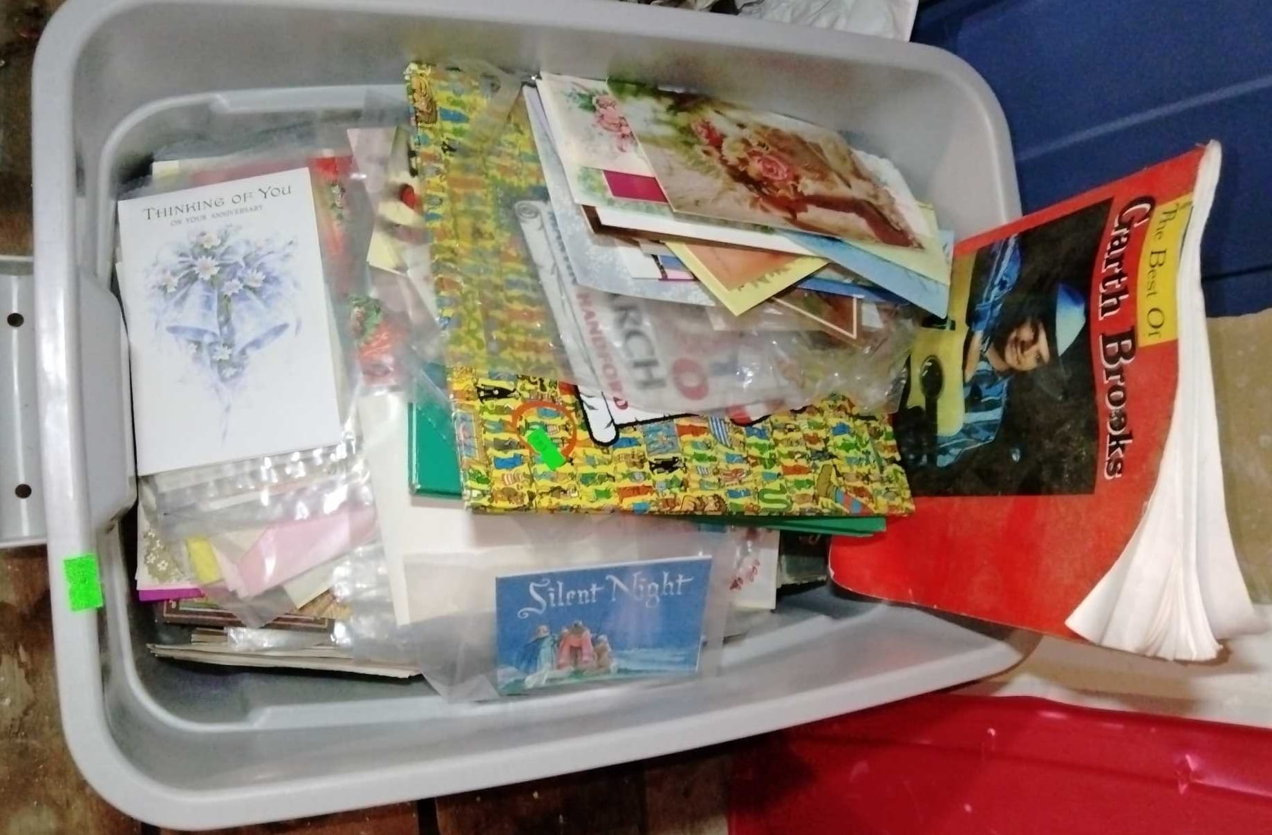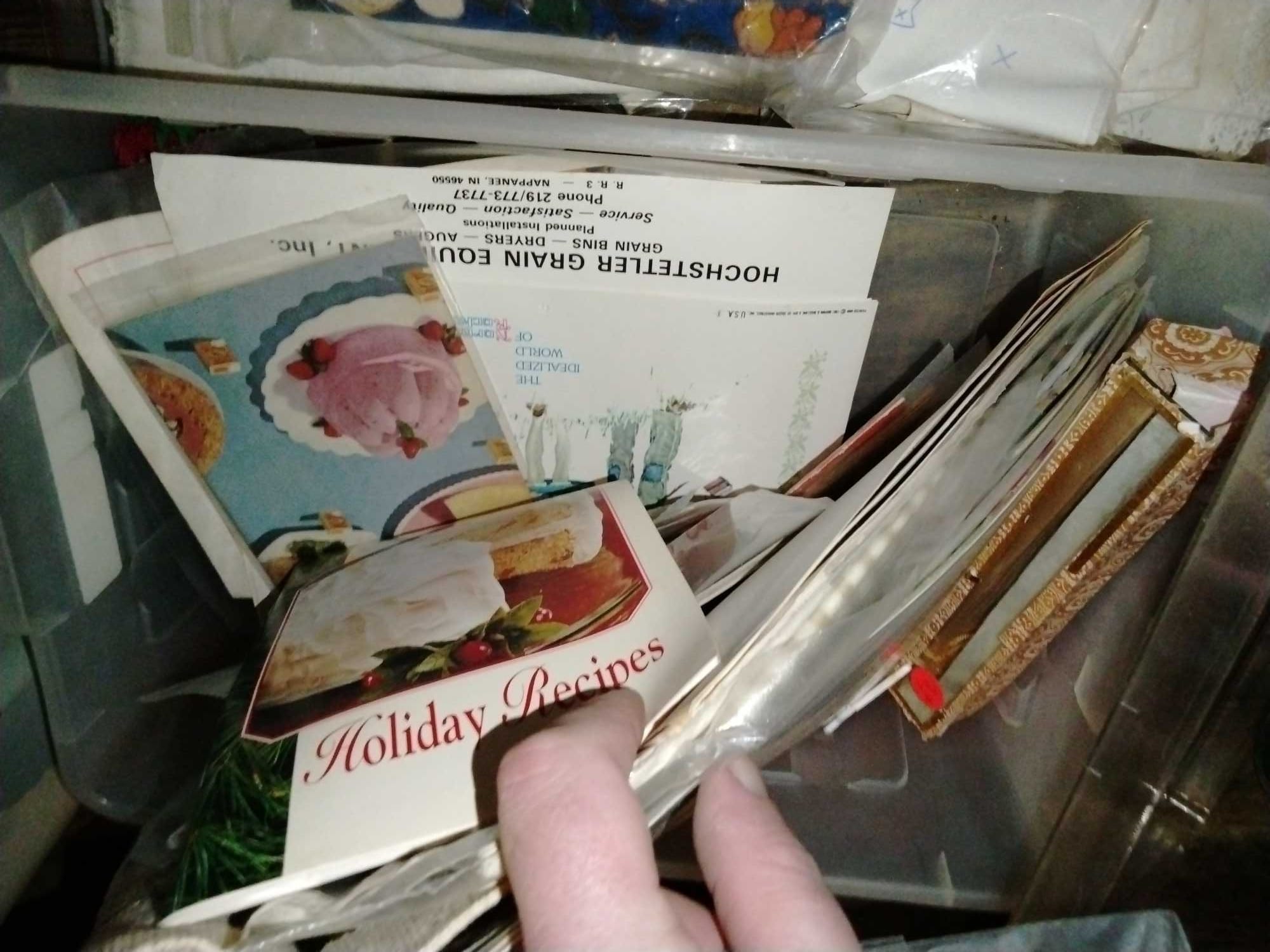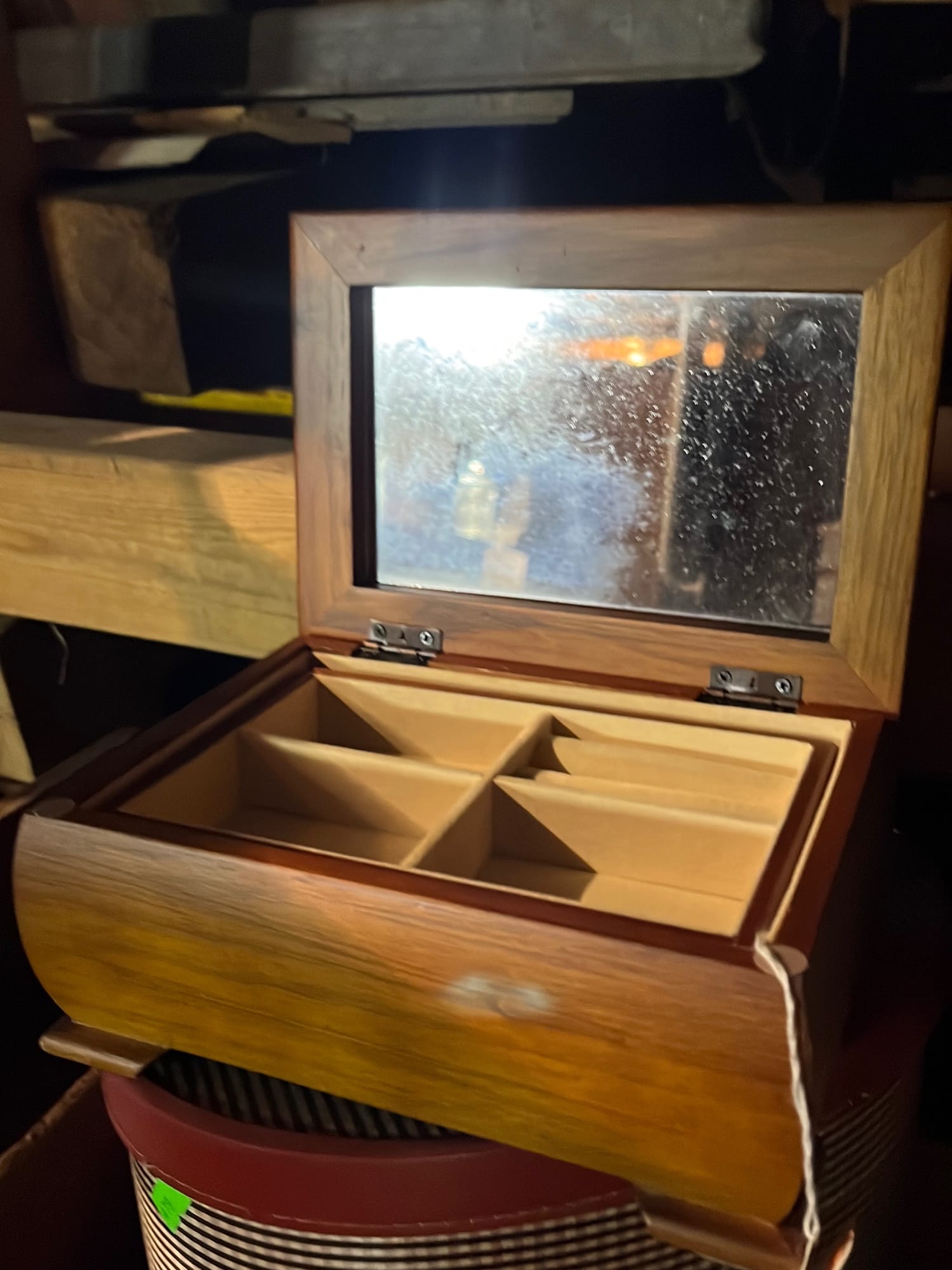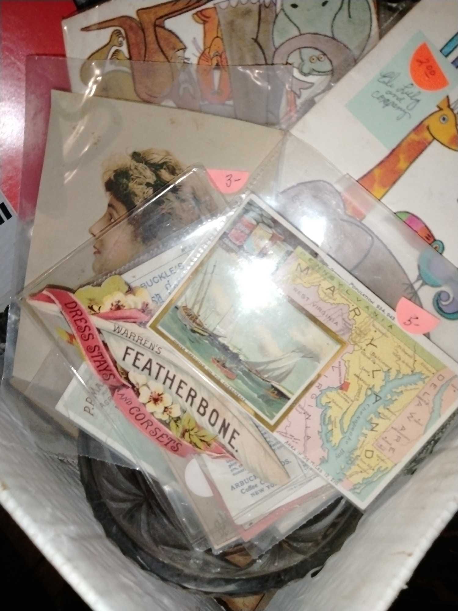 204 Wood crates, metal bread box, dominoes, books, cardboard barrel, metal lights