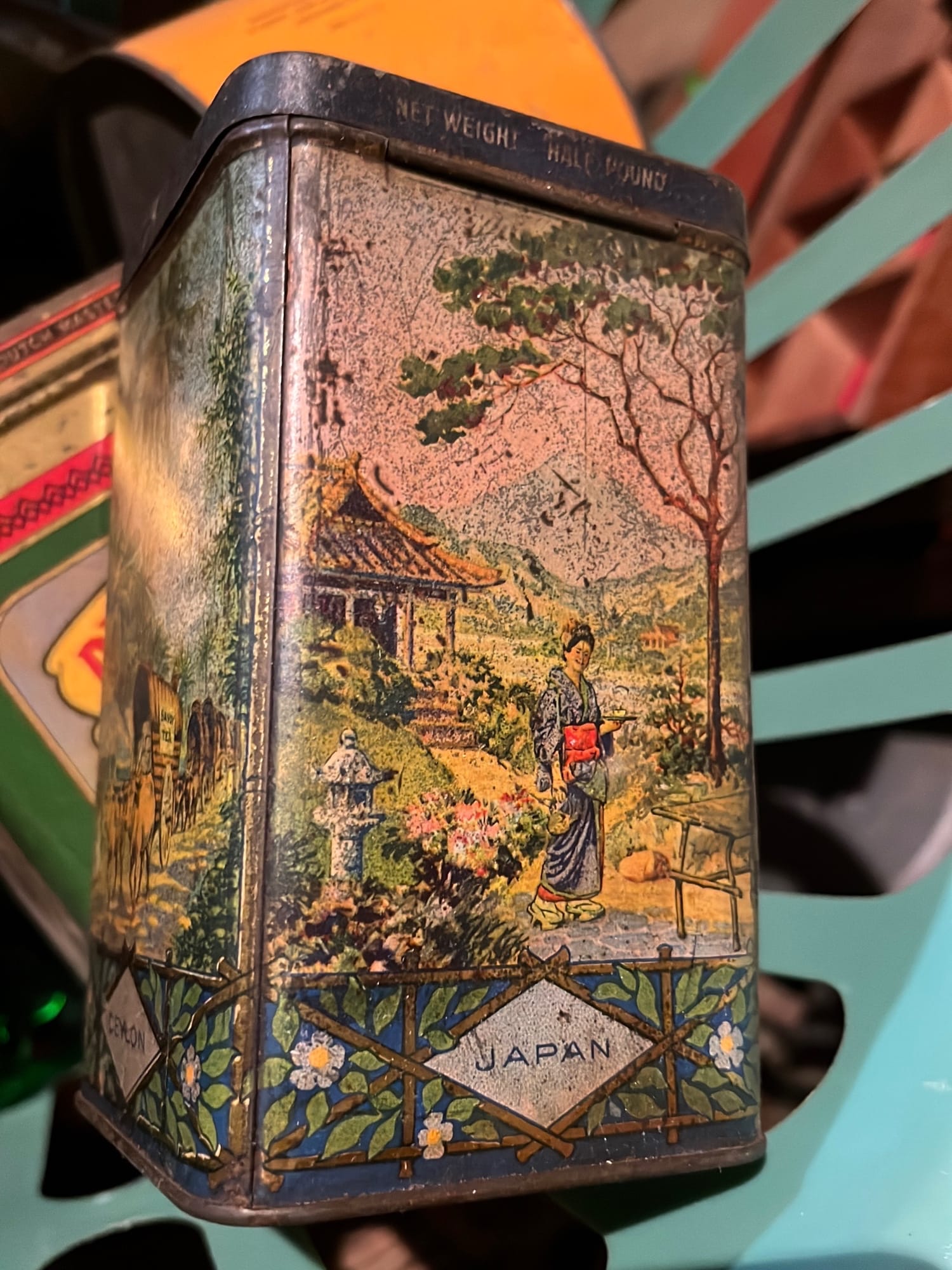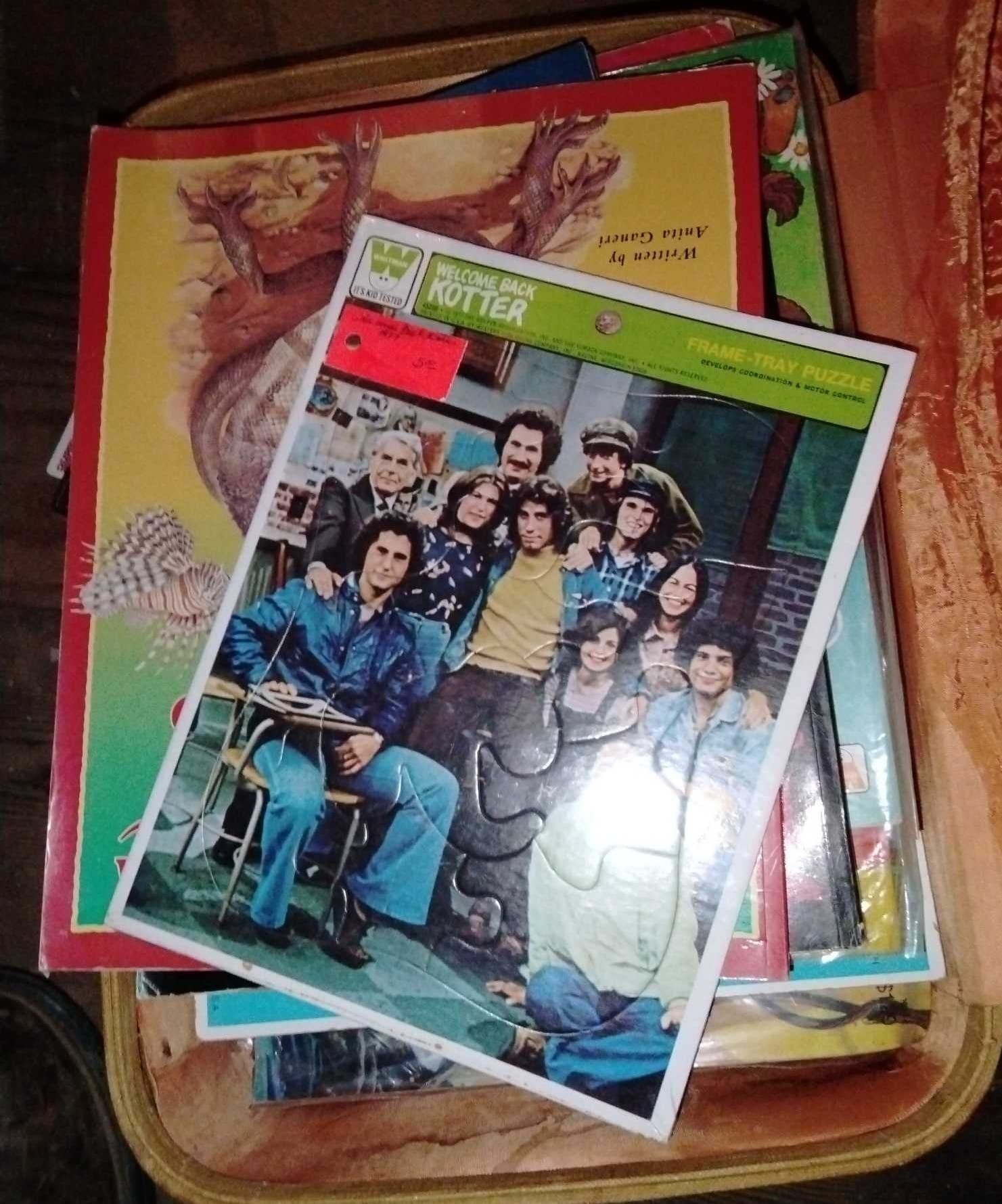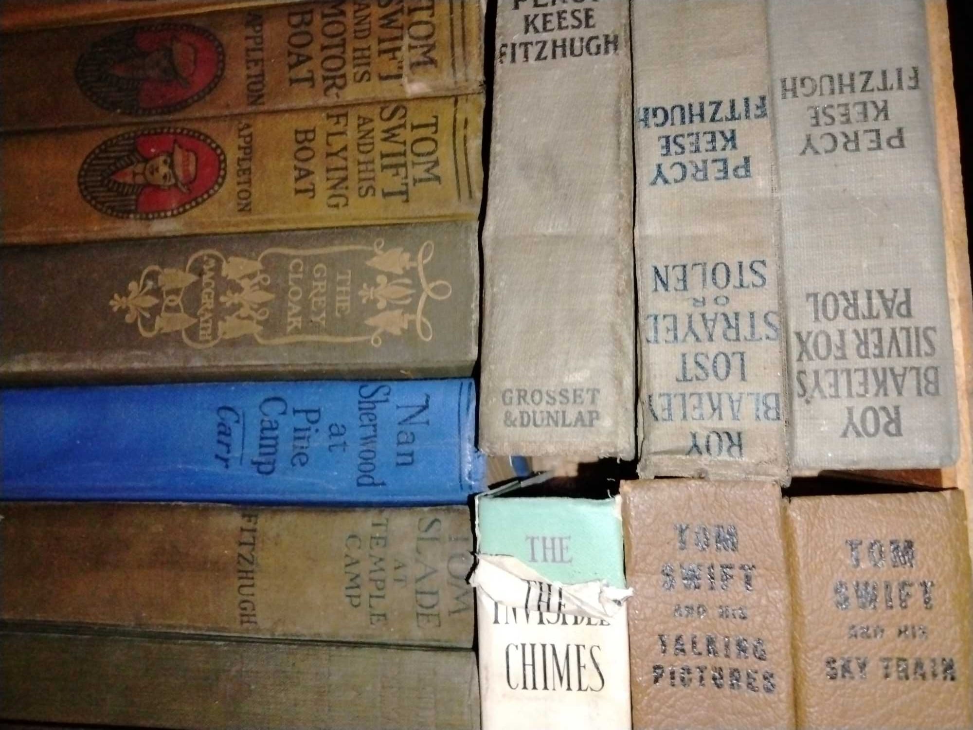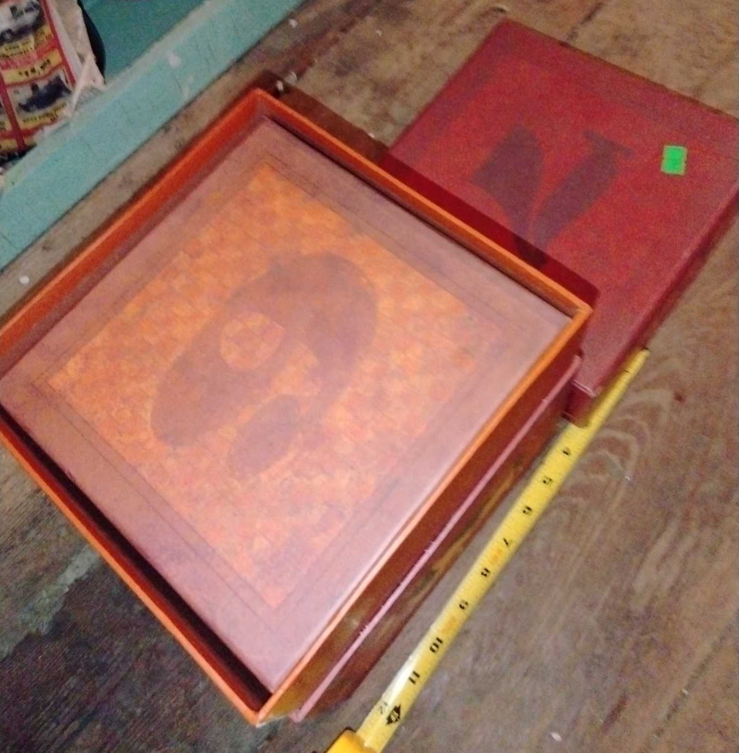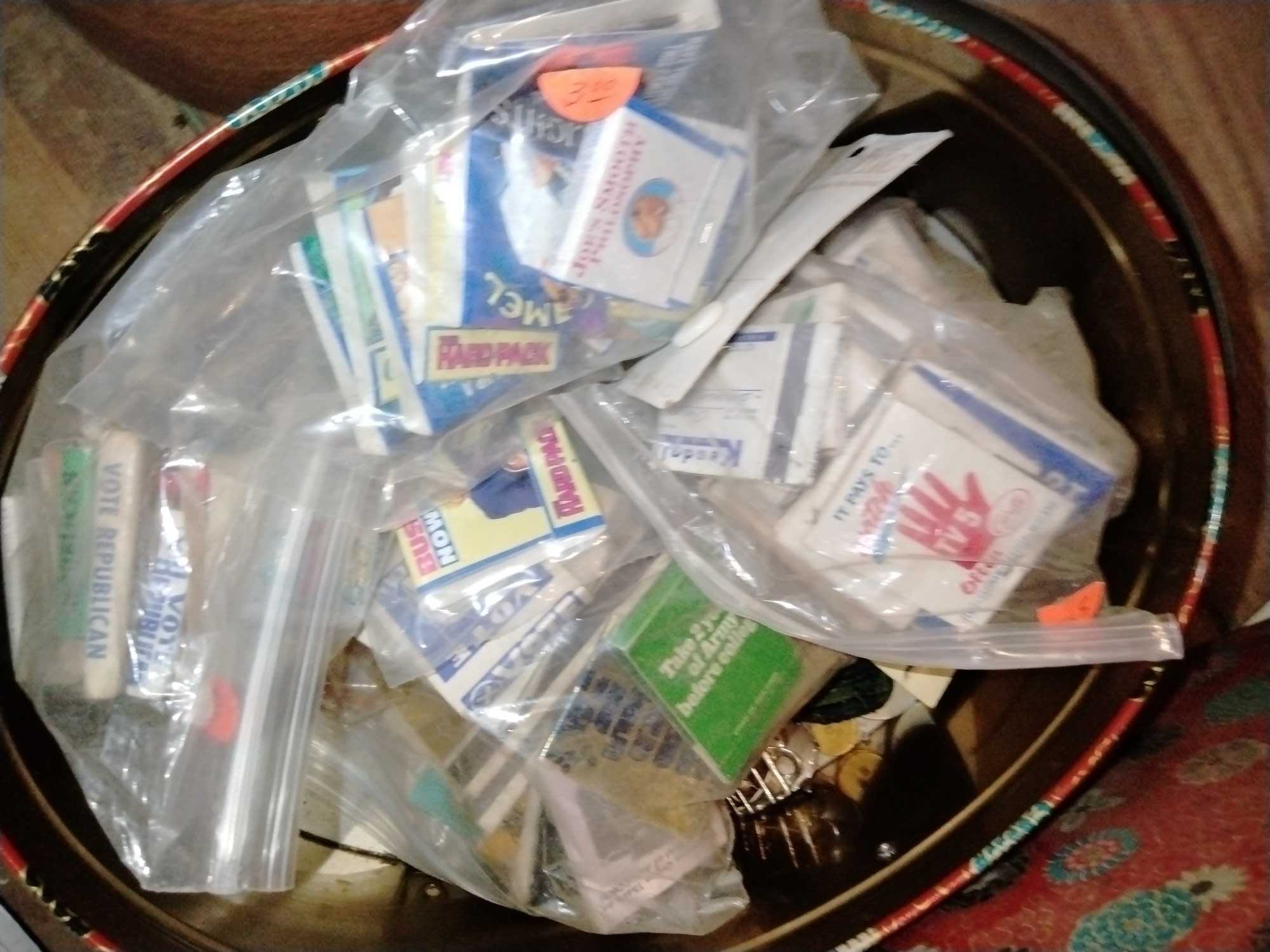 204 Wood crates, metal bread box, dominoes, books, cardboard barrel, metal lights