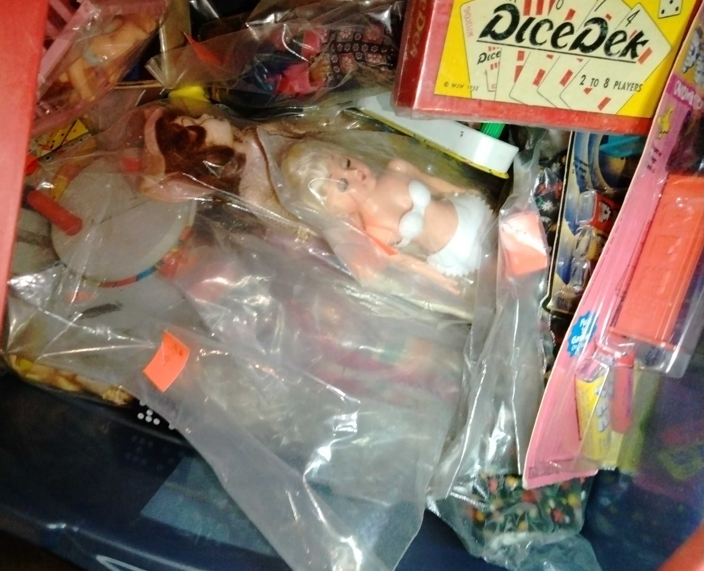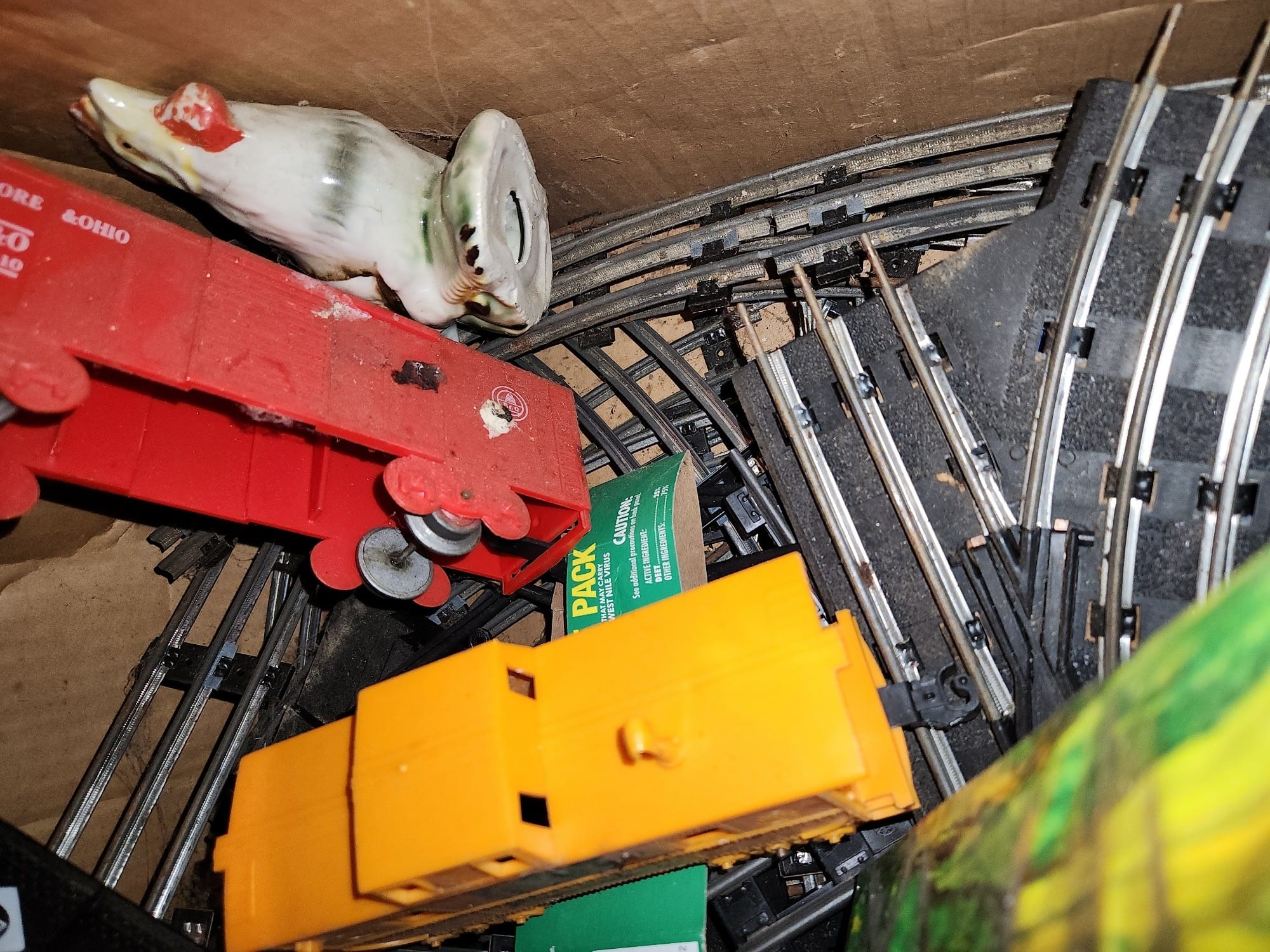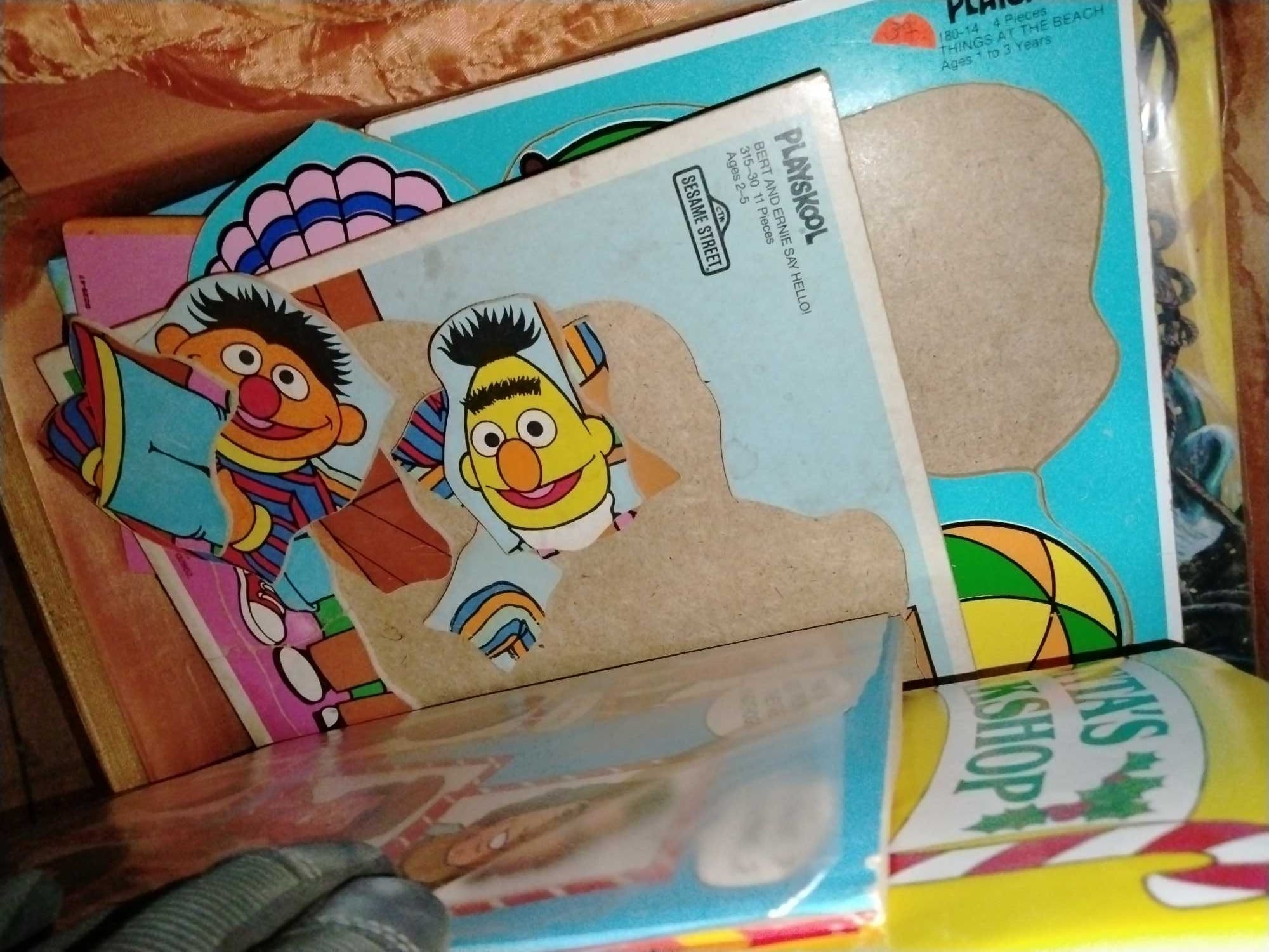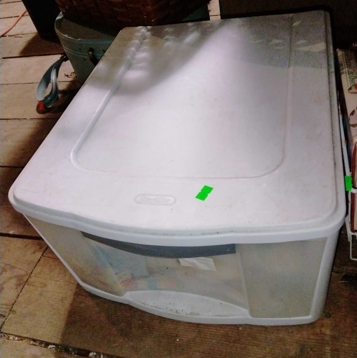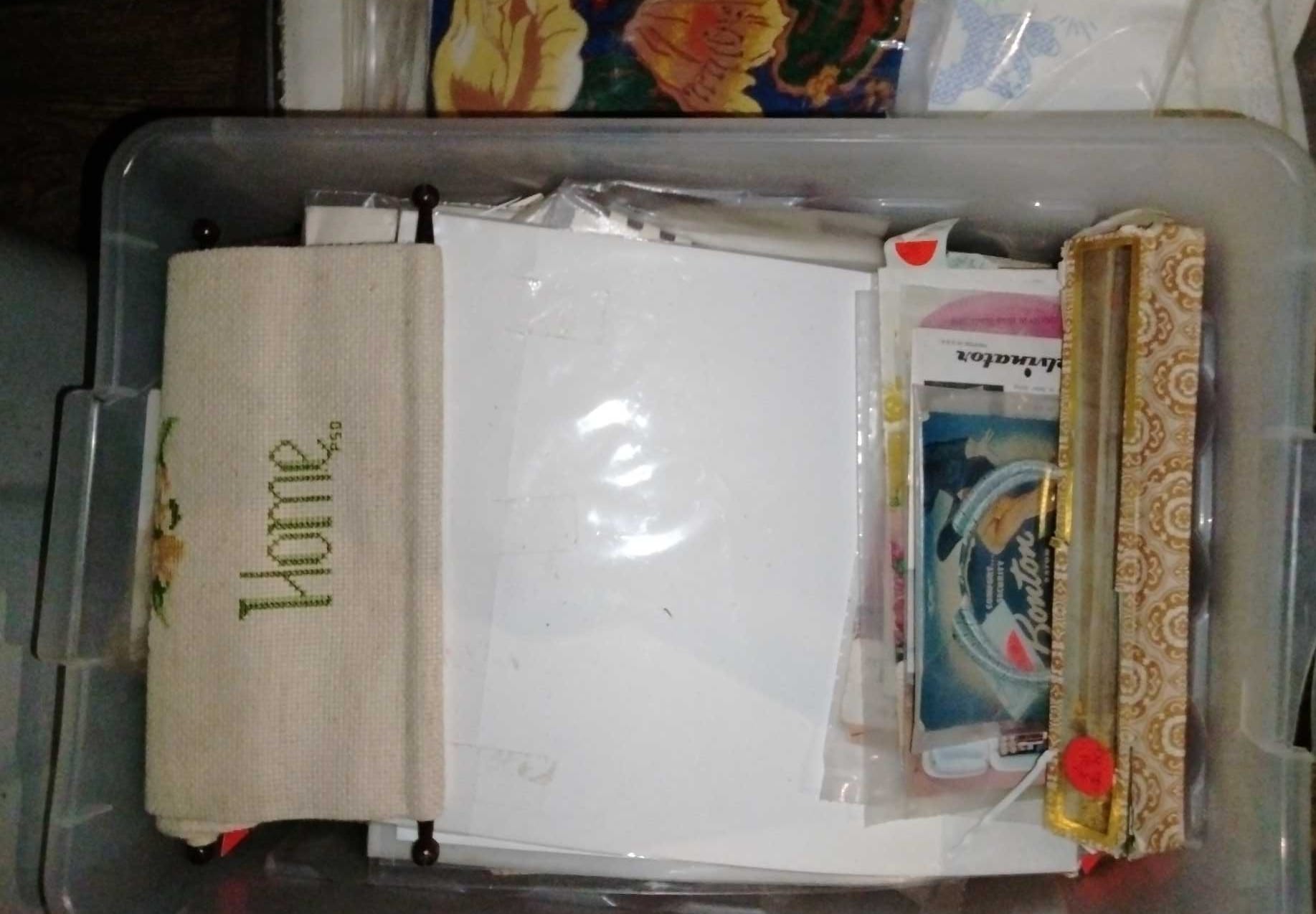 204 Wood crates, metal bread box, dominoes, books, cardboard barrel, metal lights