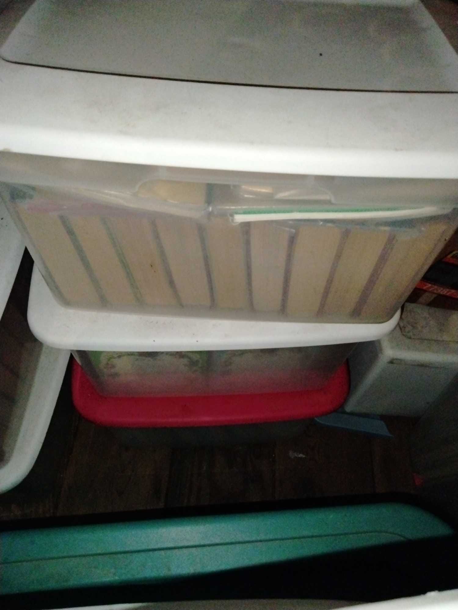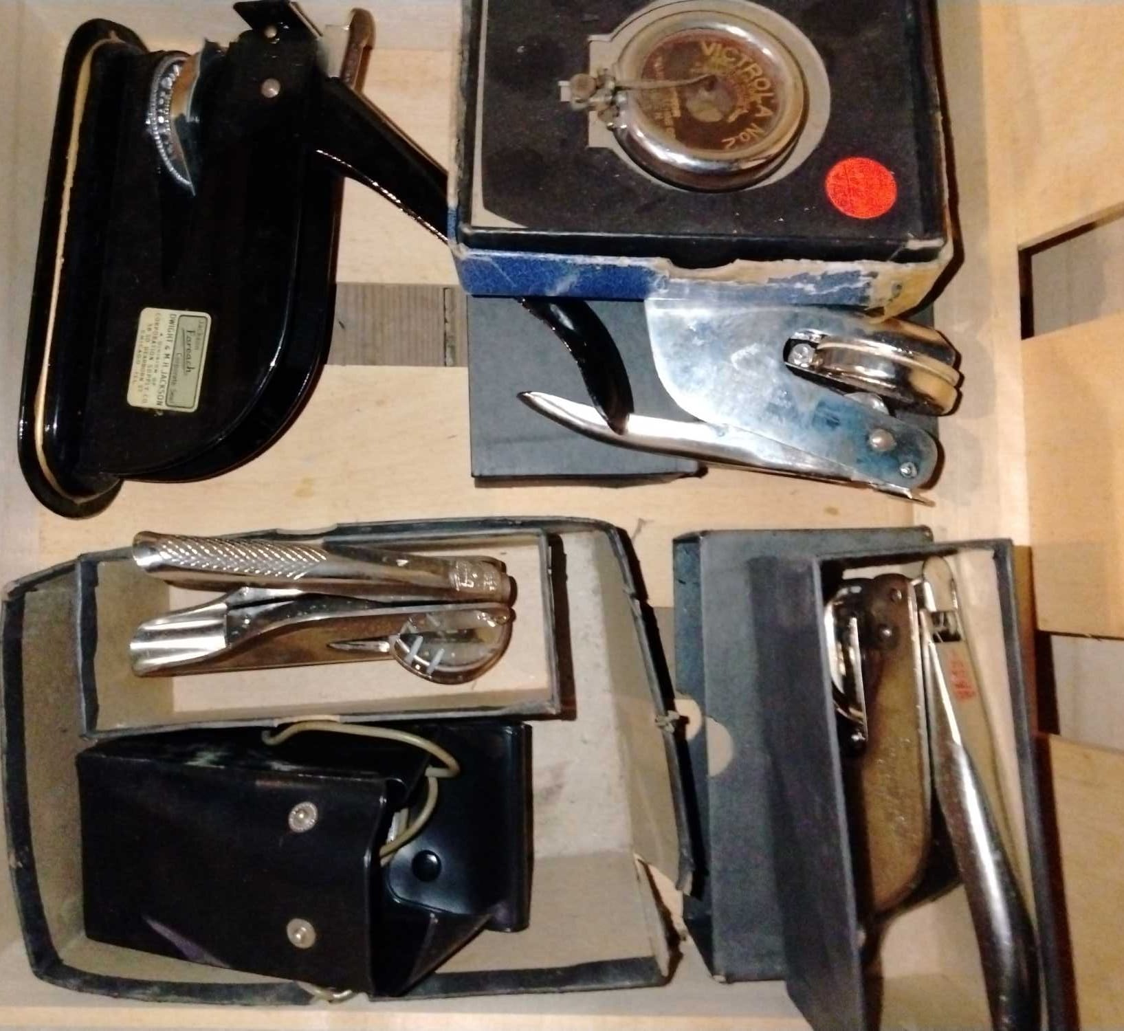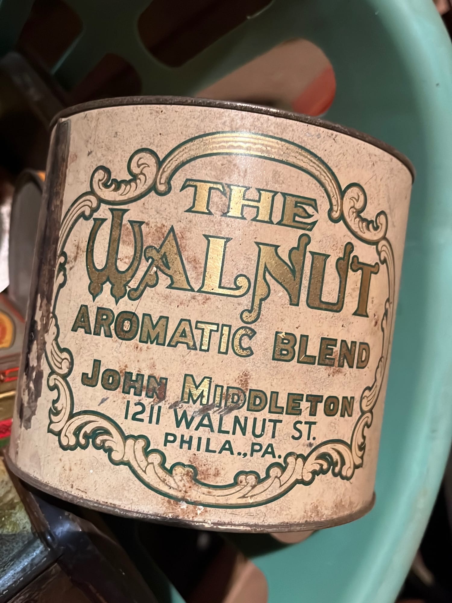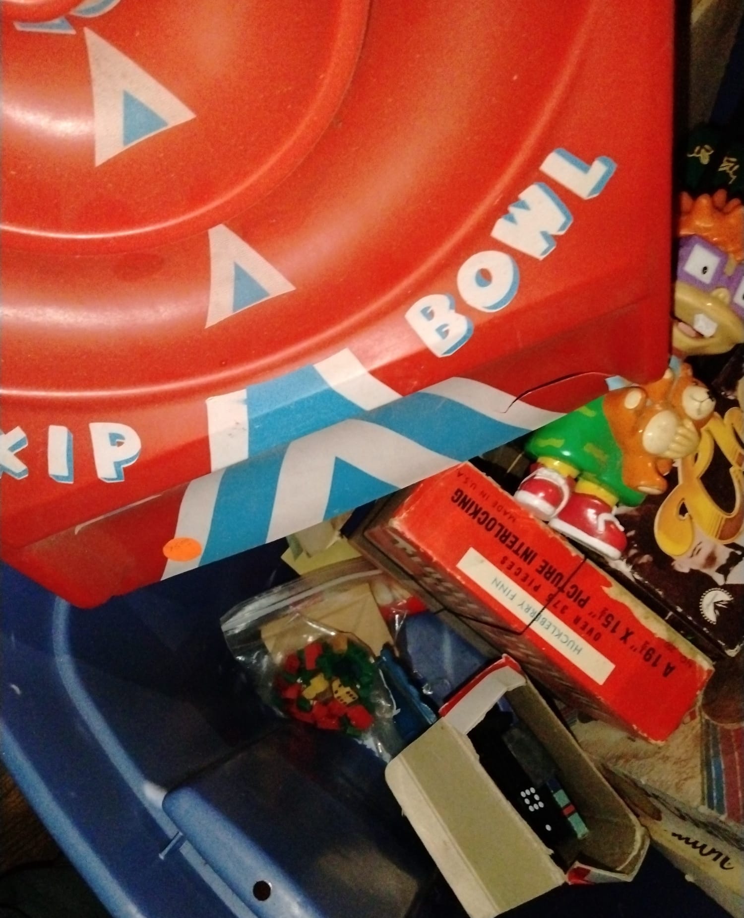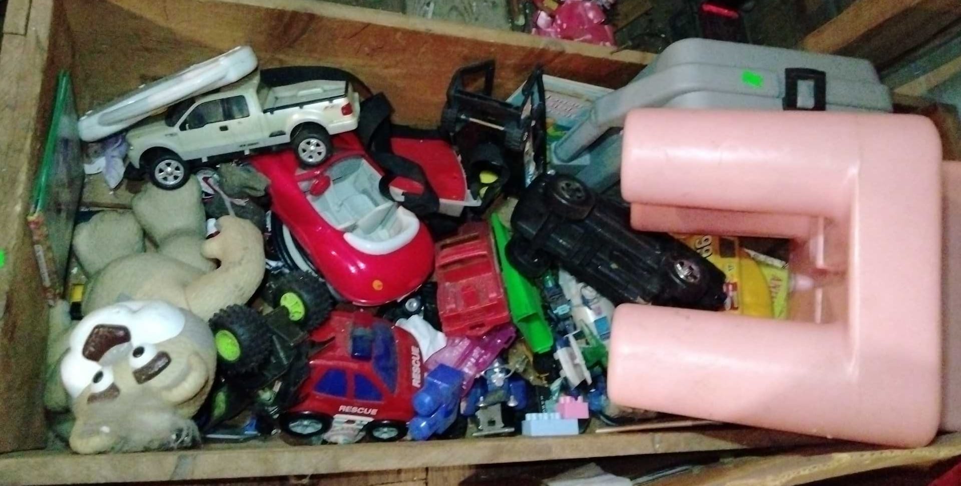 204 Wood crates, metal bread box, dominoes, books, cardboard barrel, metal lights