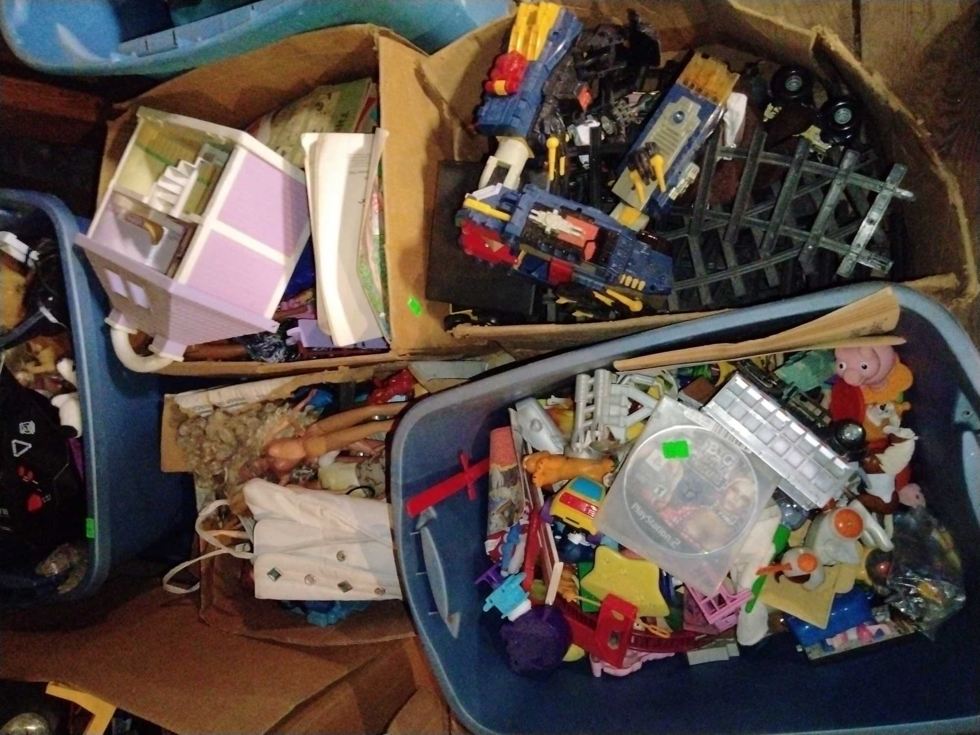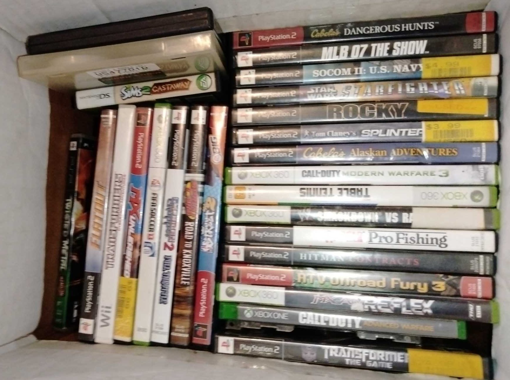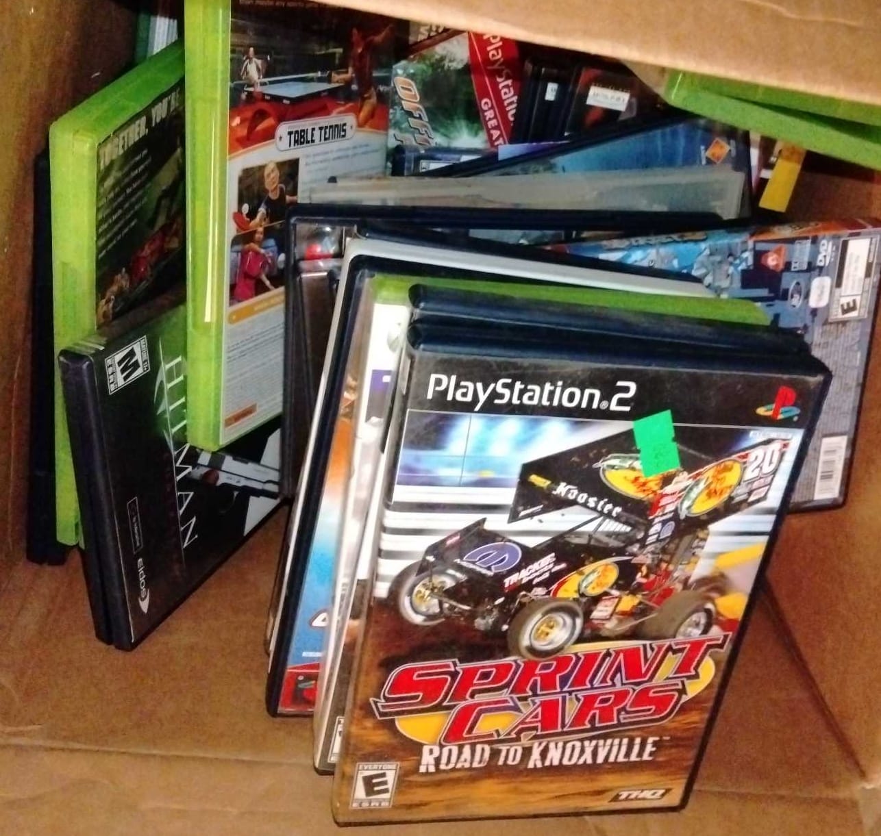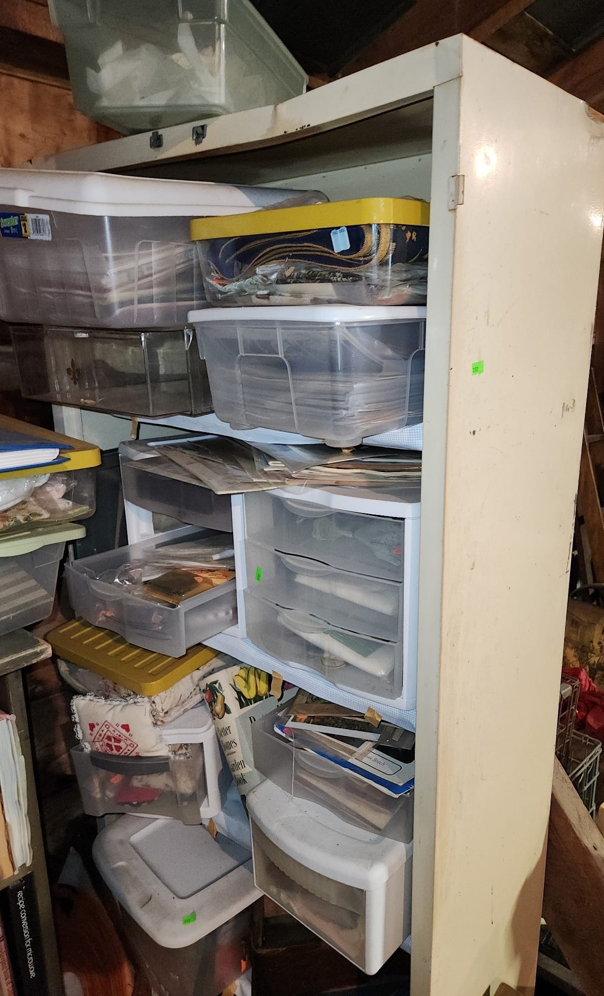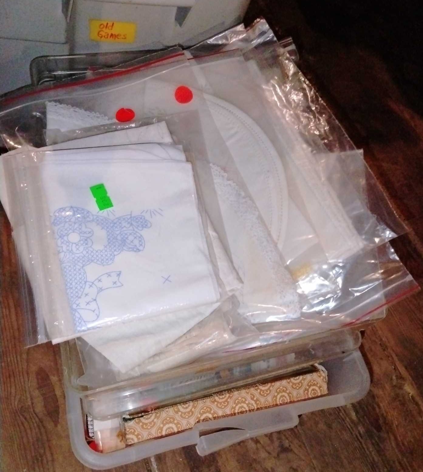 204 Wood crates, metal bread box, dominoes, books, cardboard barrel, metal lights