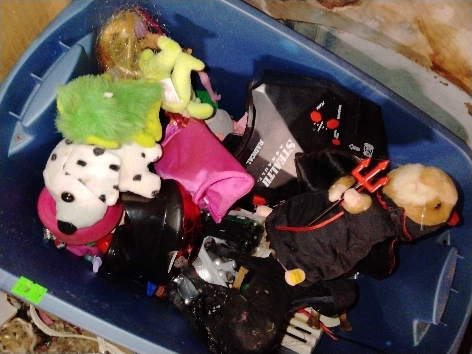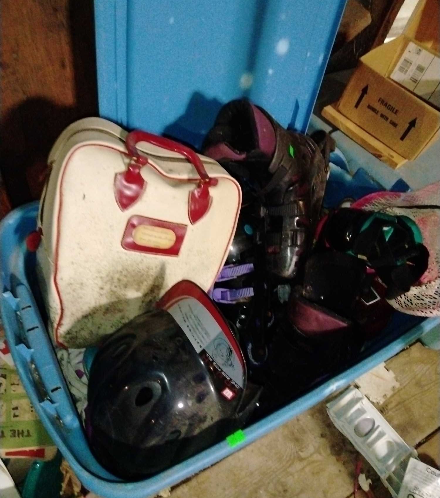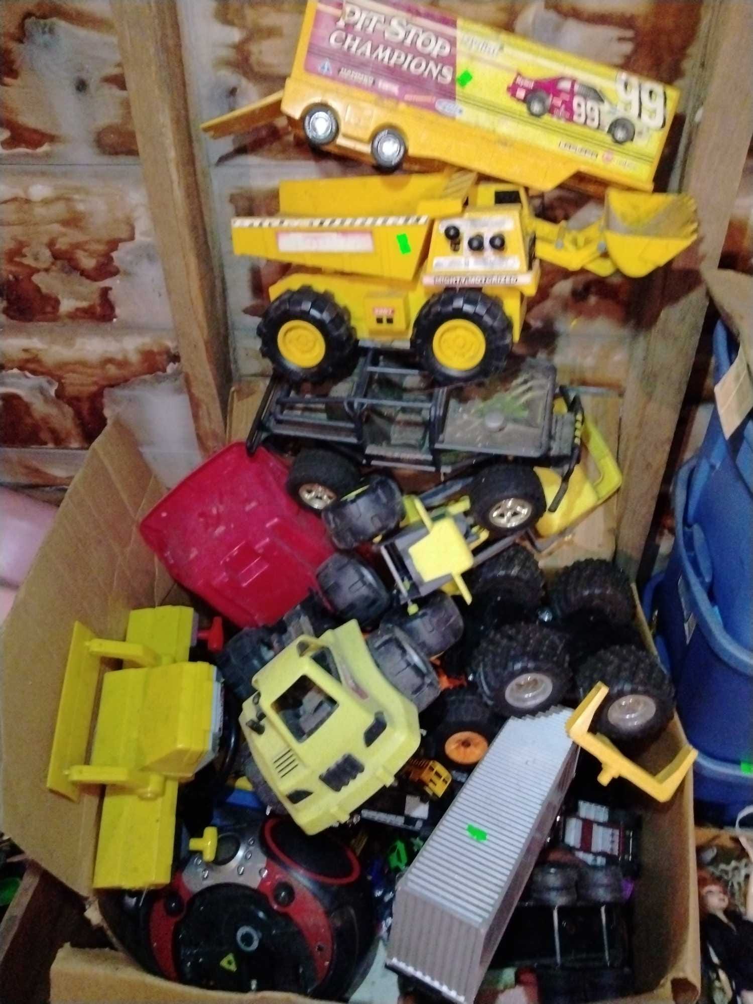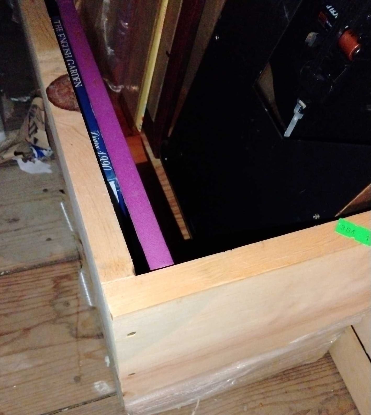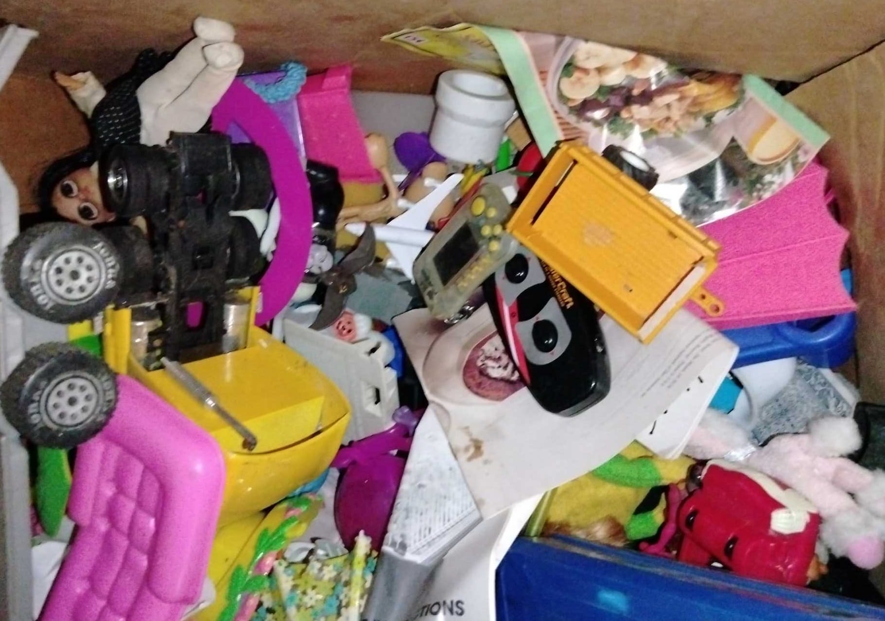 204 Wood crates, metal bread box, dominoes, books, cardboard barrel, metal lights