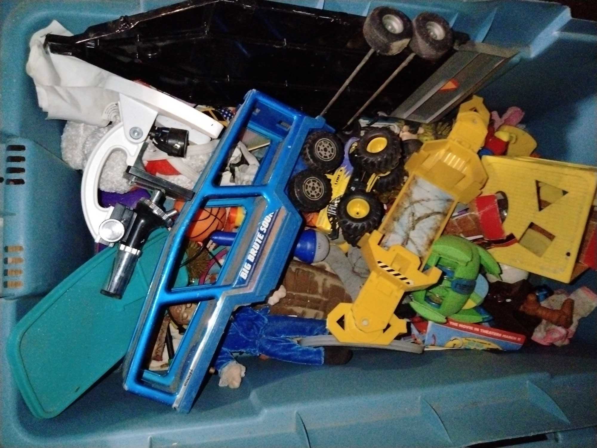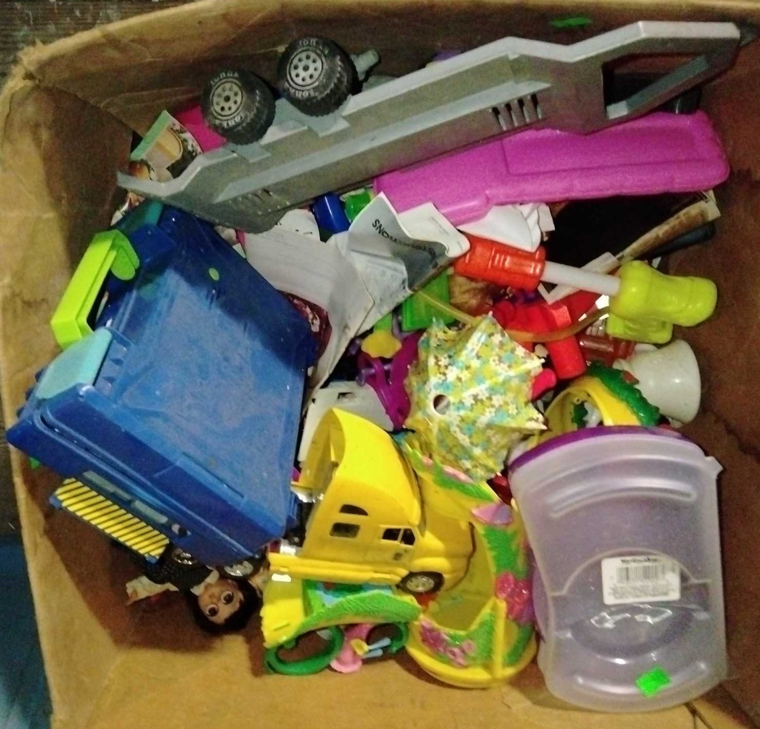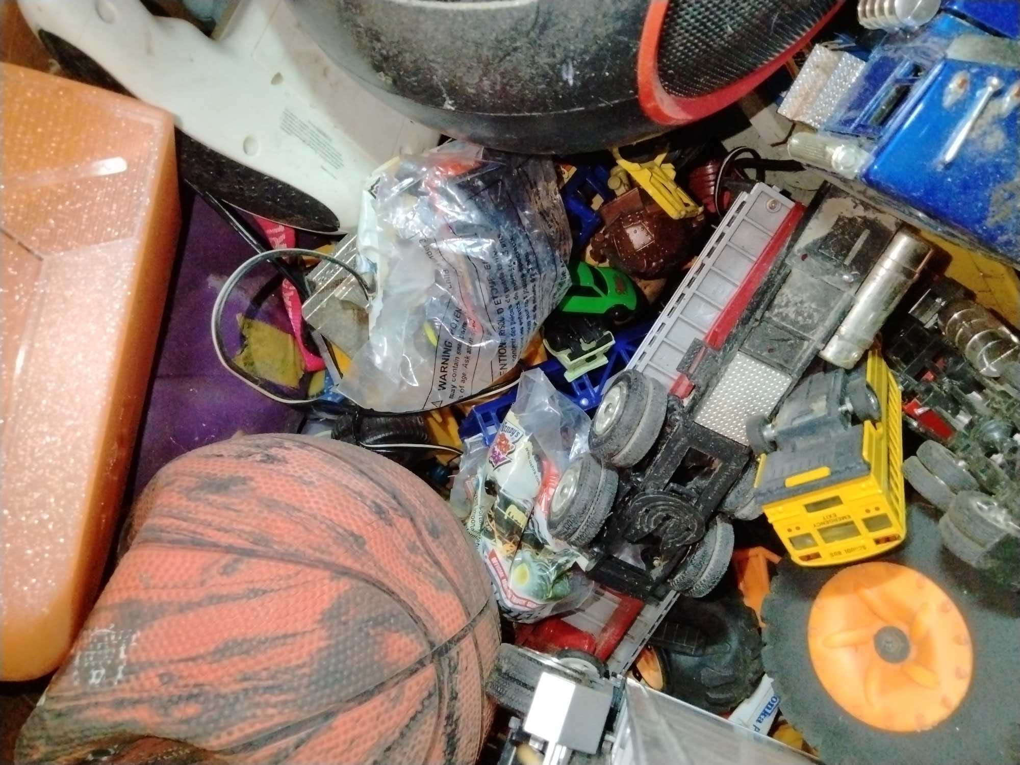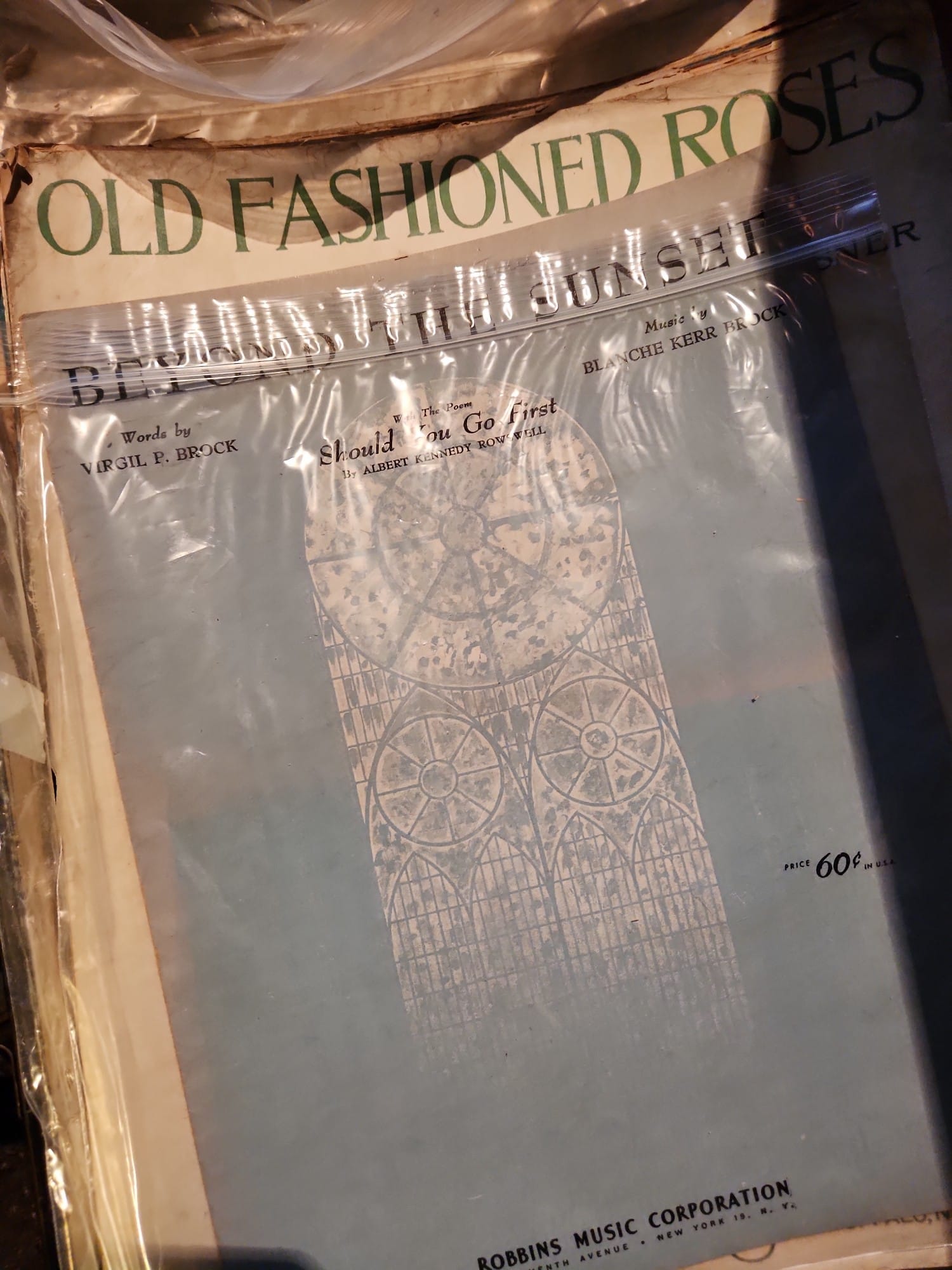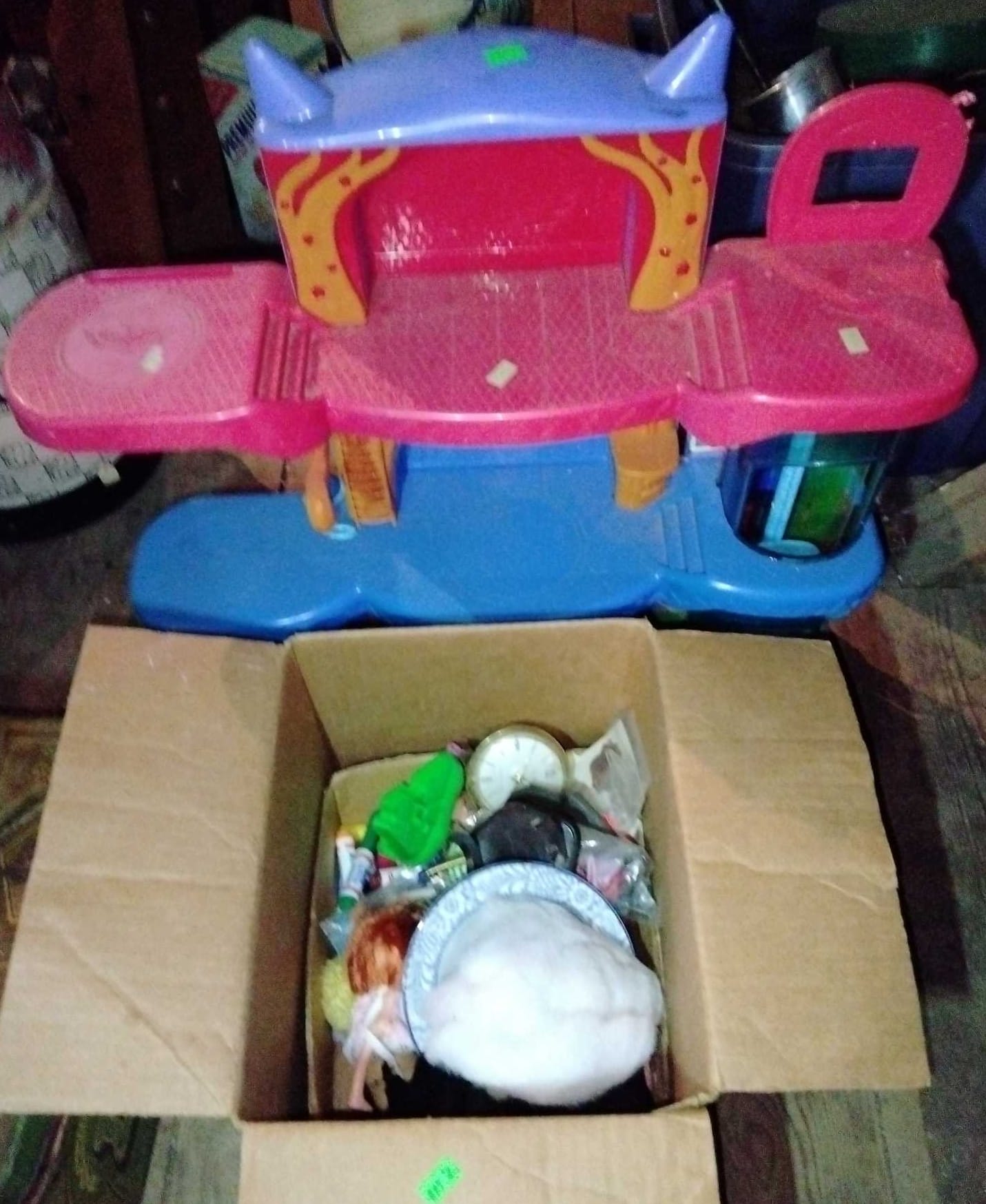 204 Wood crates, metal bread box, dominoes, books, cardboard barrel, metal lights