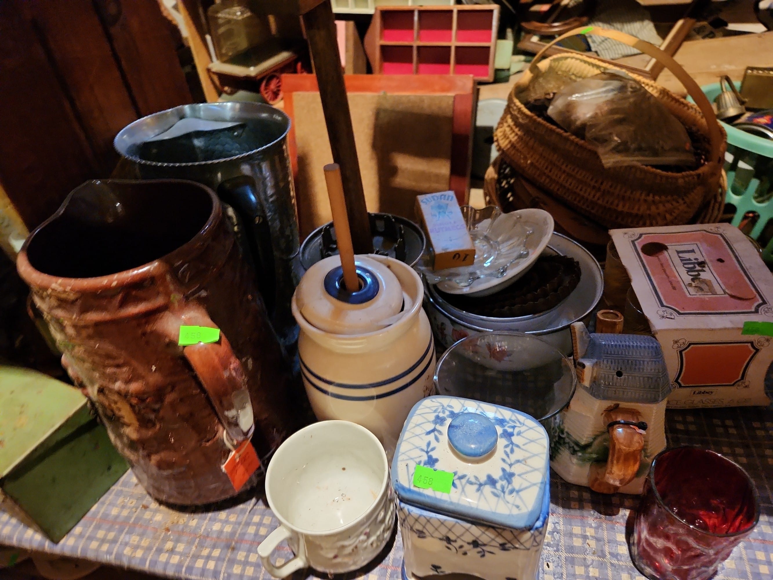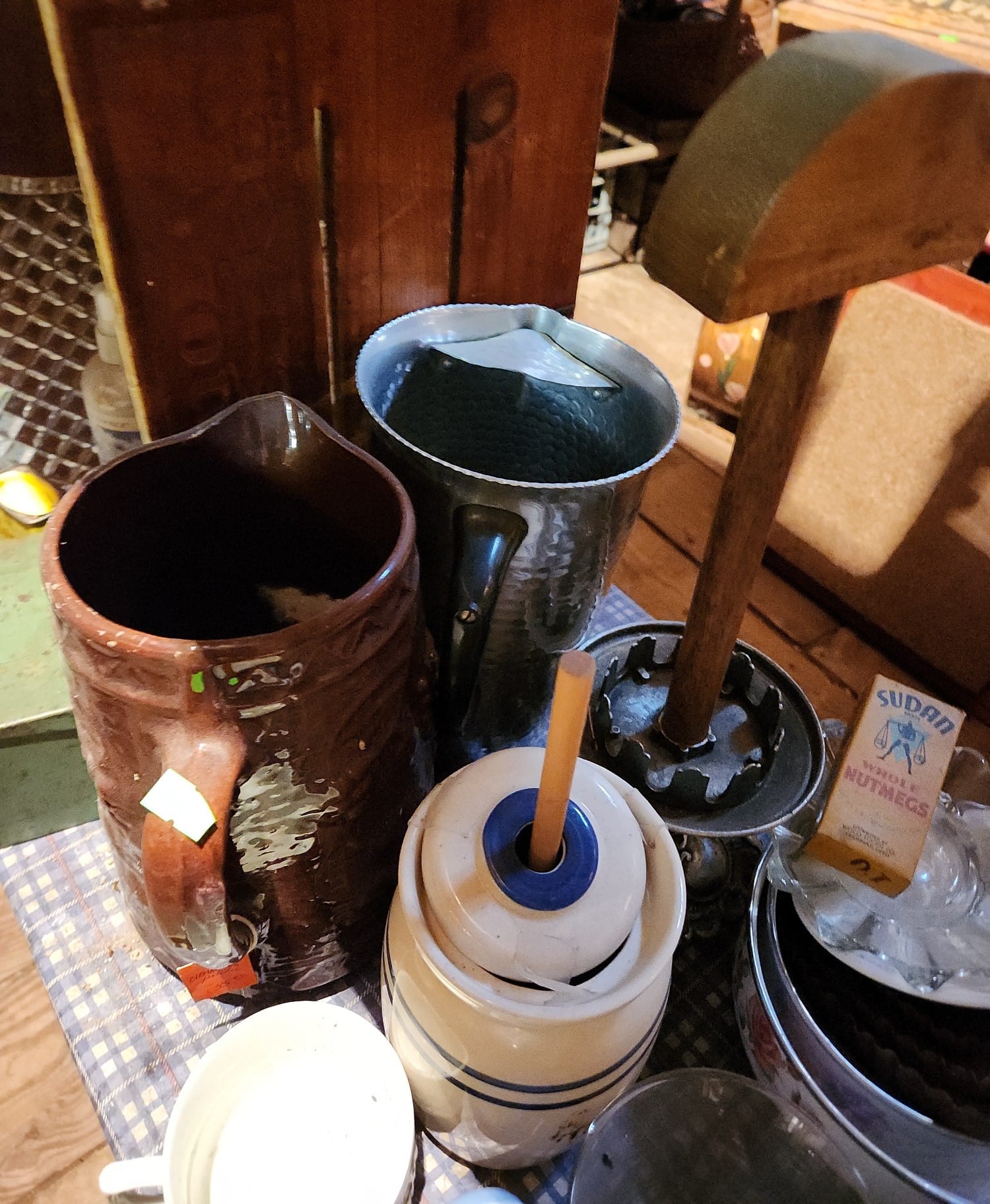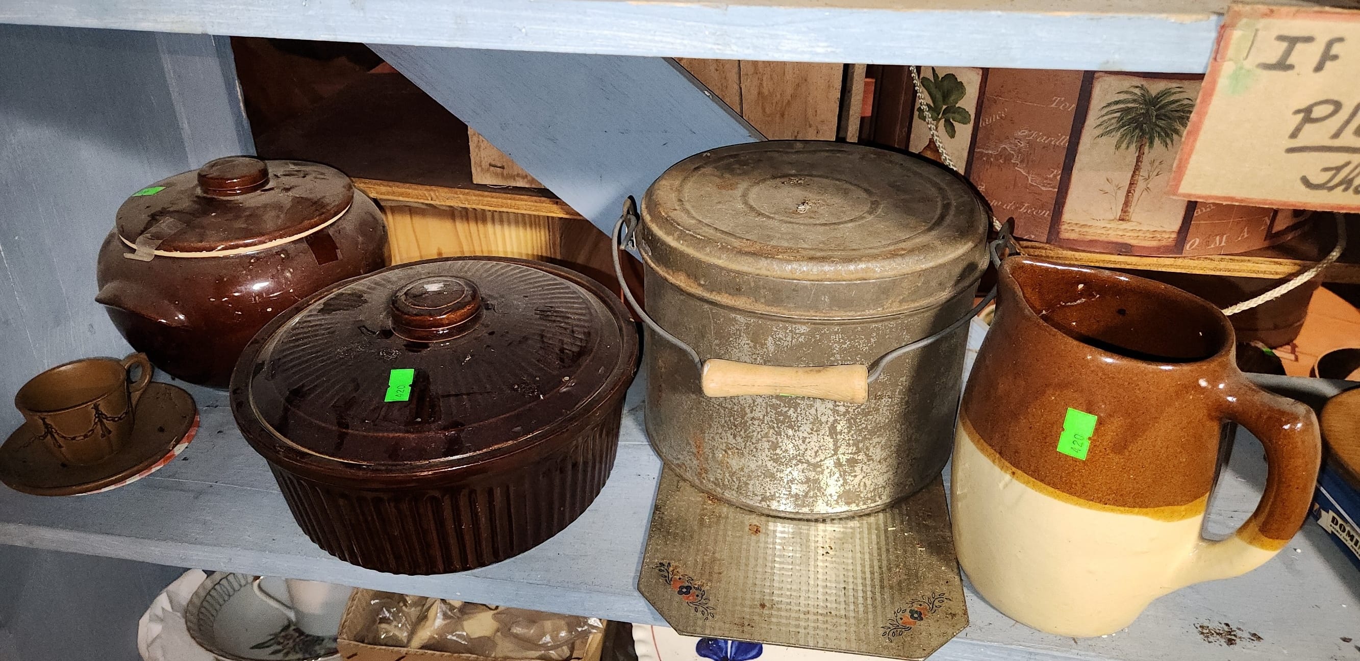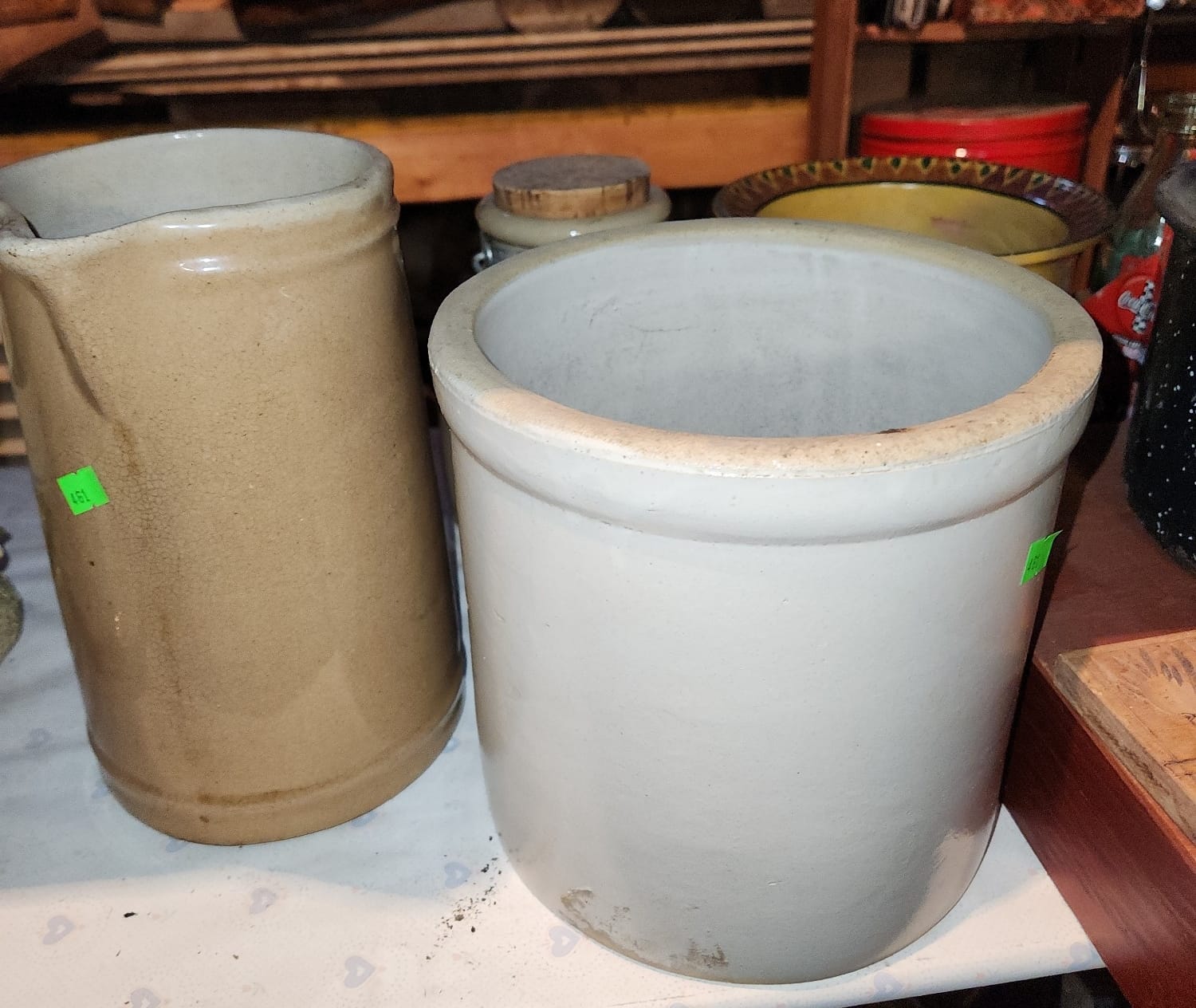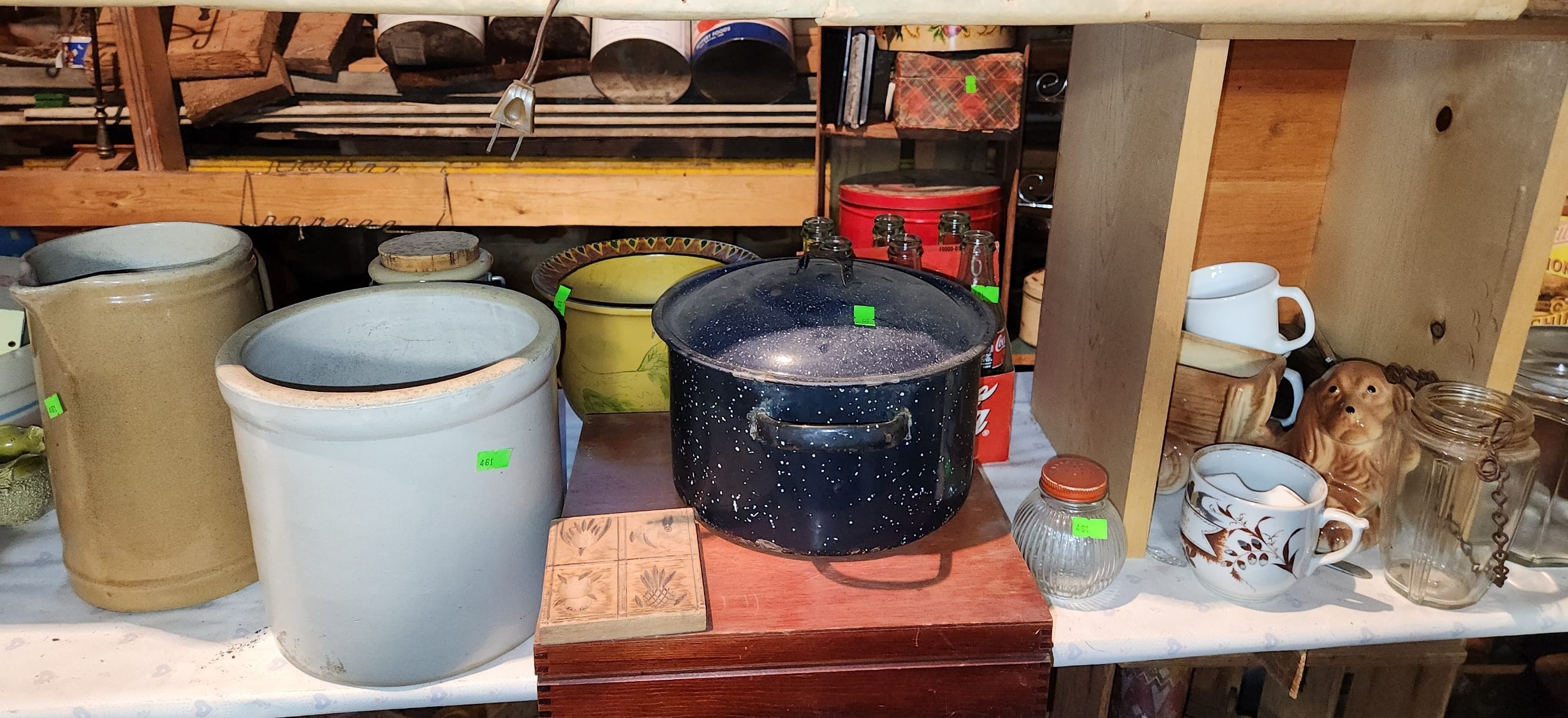 461 Crock, enamel pan, crock pitcher and jug, Coca-Cola bottles, planters, wood mold, wood box, cups, canister, miscellaneous