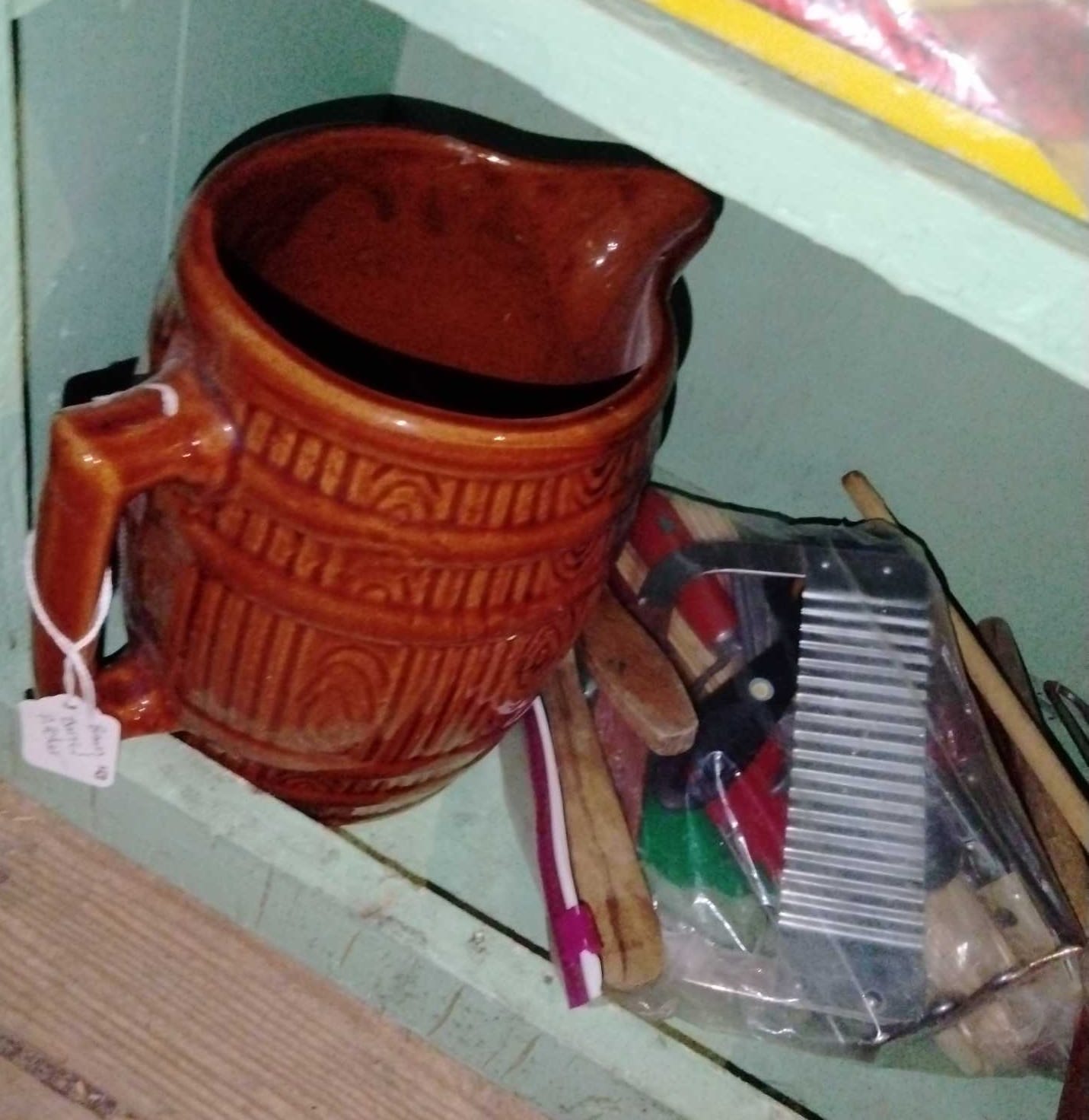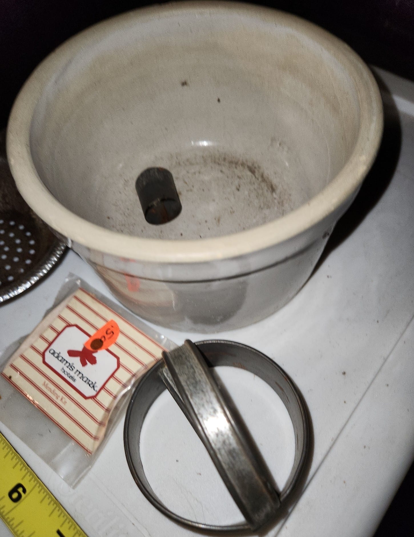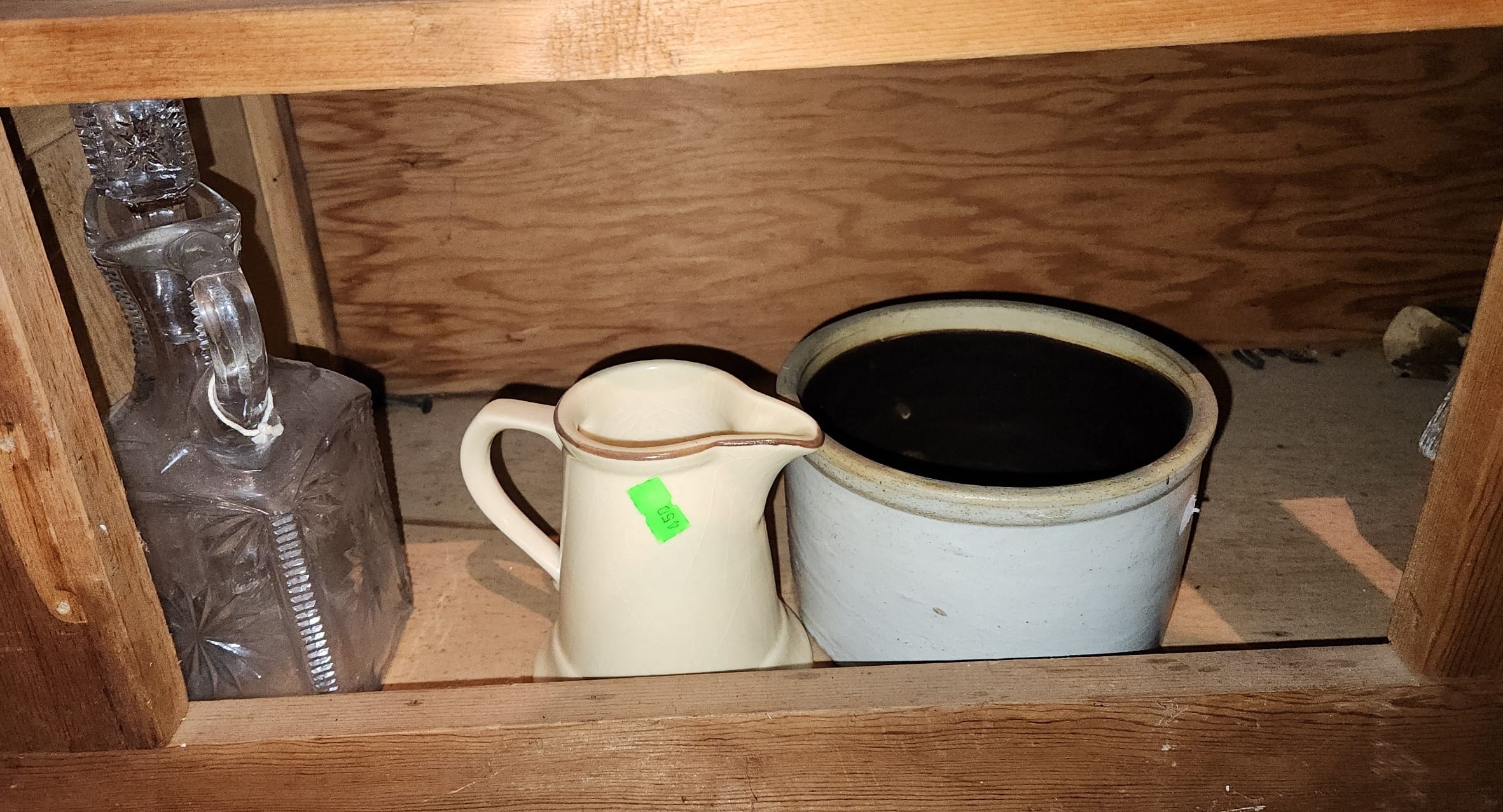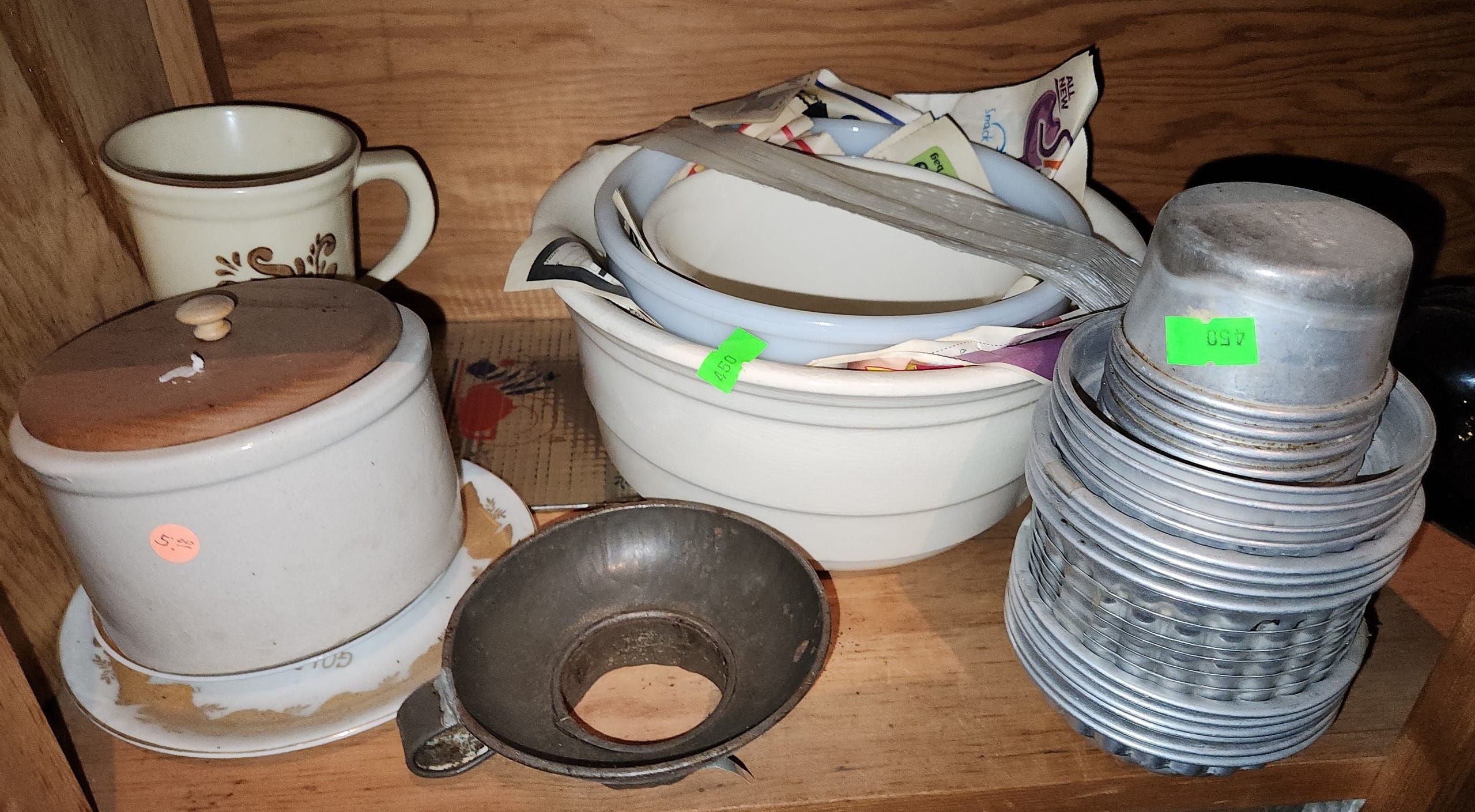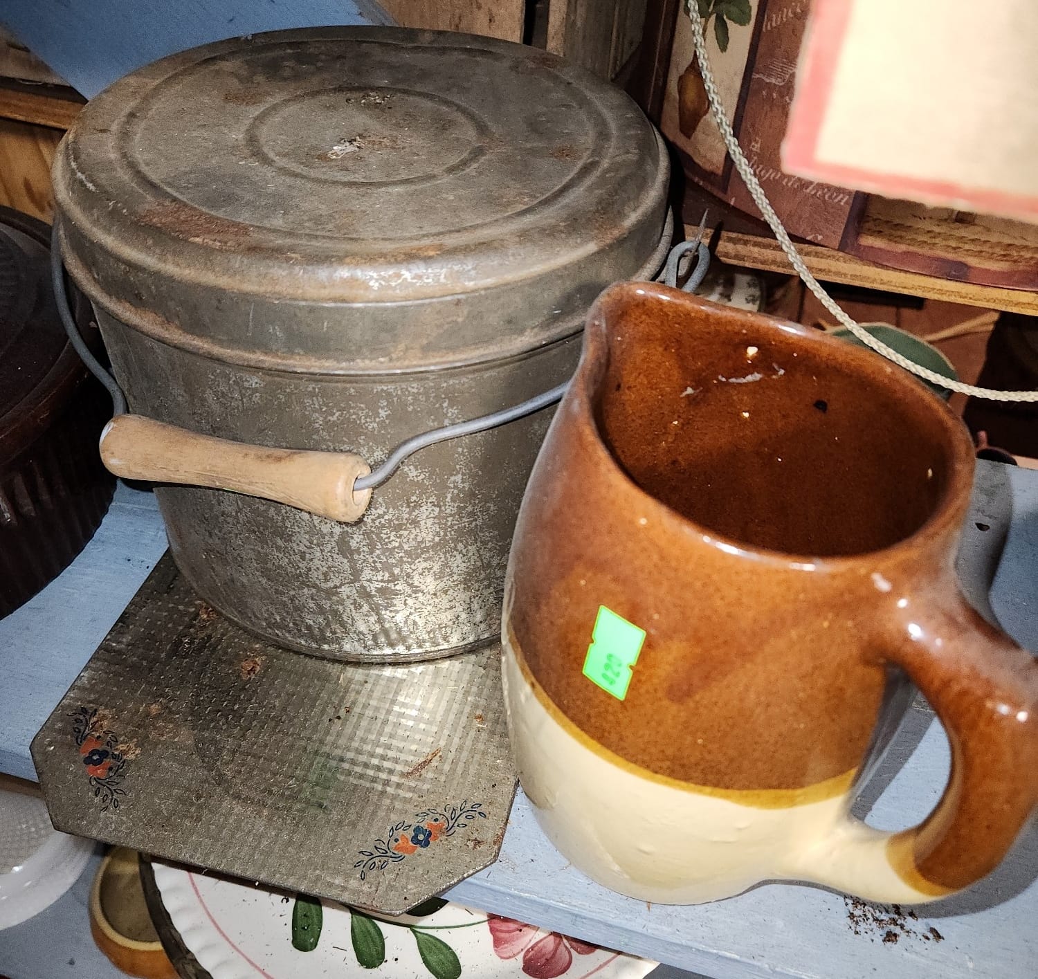 461 Crock, enamel pan, crock pitcher and jug, Coca-Cola bottles, planters, wood mold, wood box, cups, canister, miscellaneous
