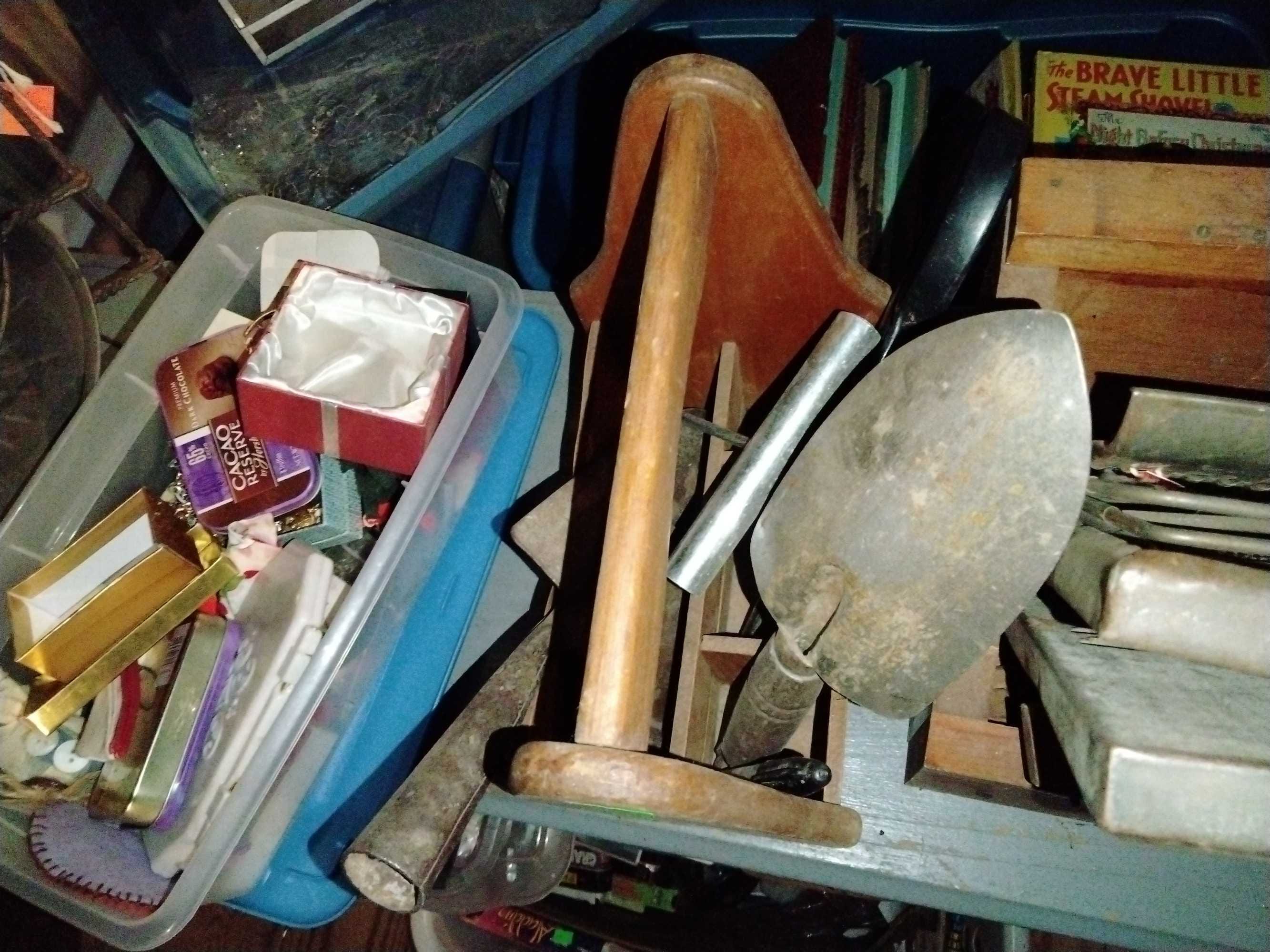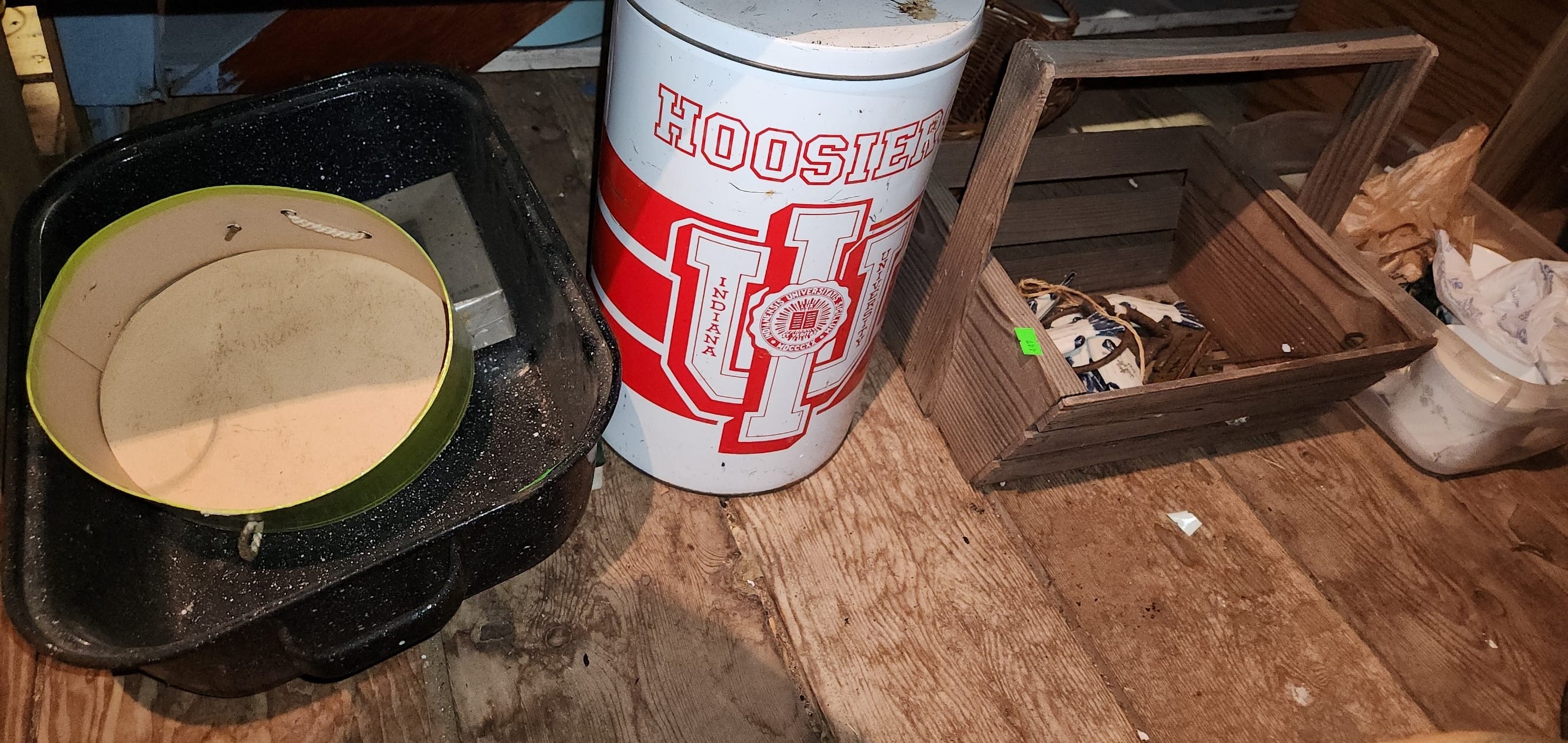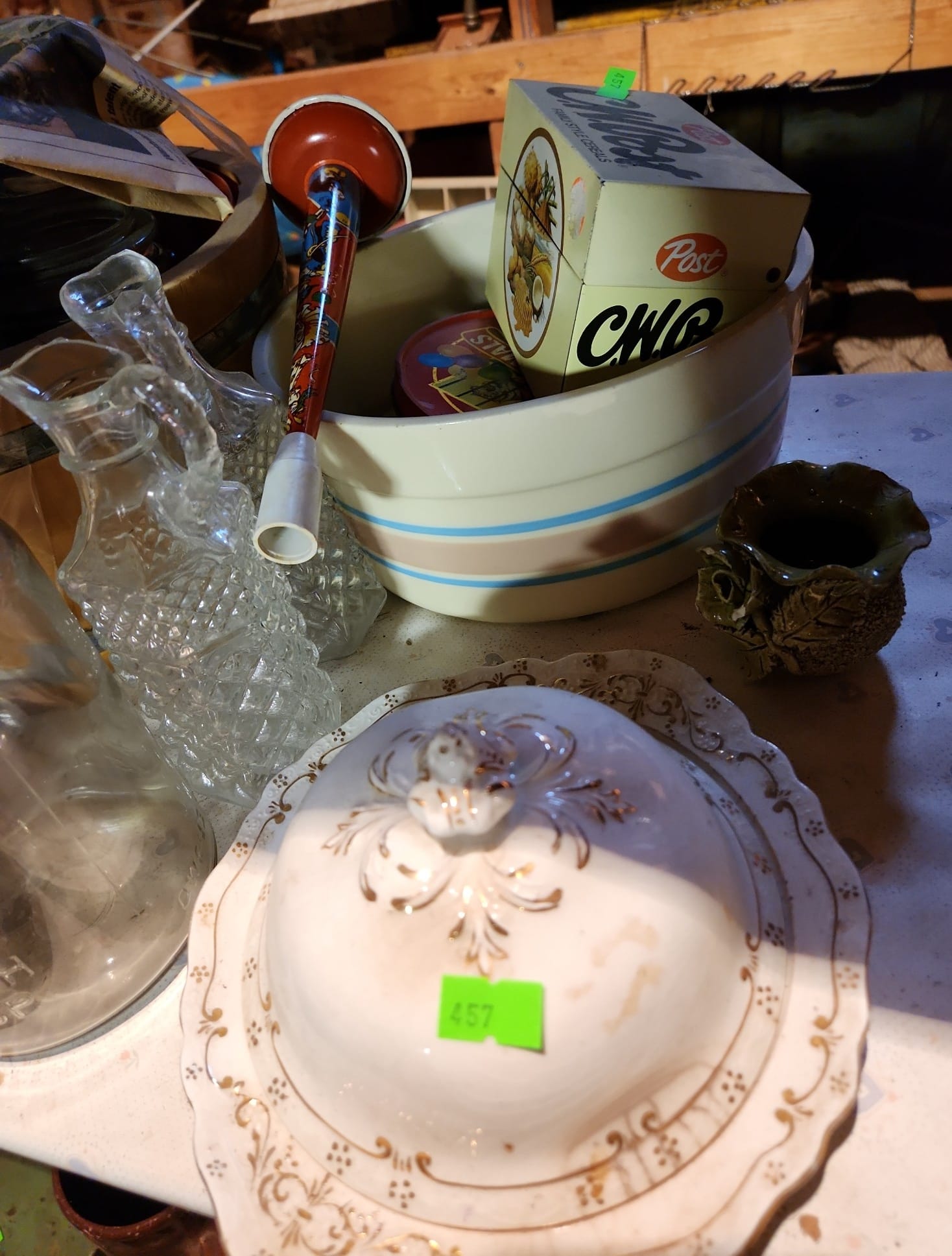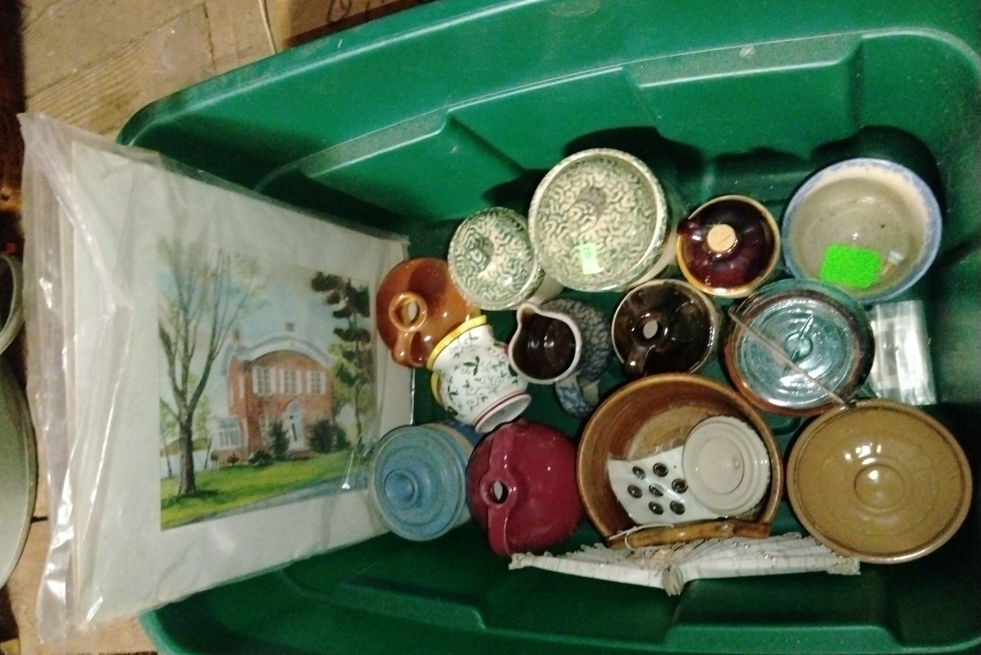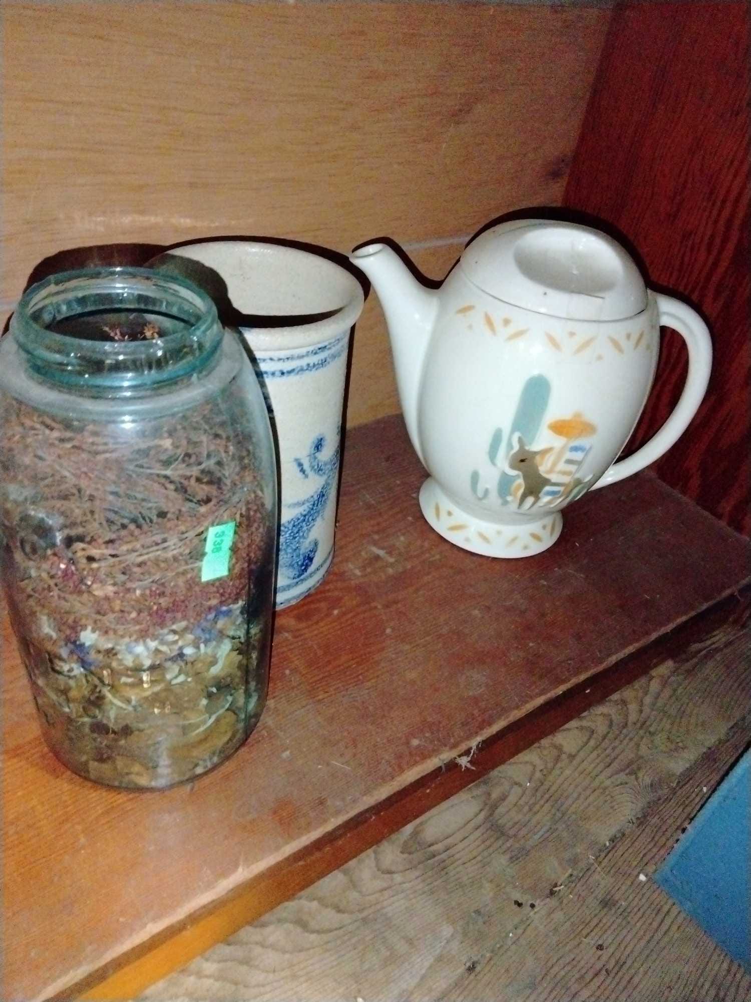 461 Crock, enamel pan, crock pitcher and jug, Coca-Cola bottles, planters, wood mold, wood box, cups, canister, miscellaneous
