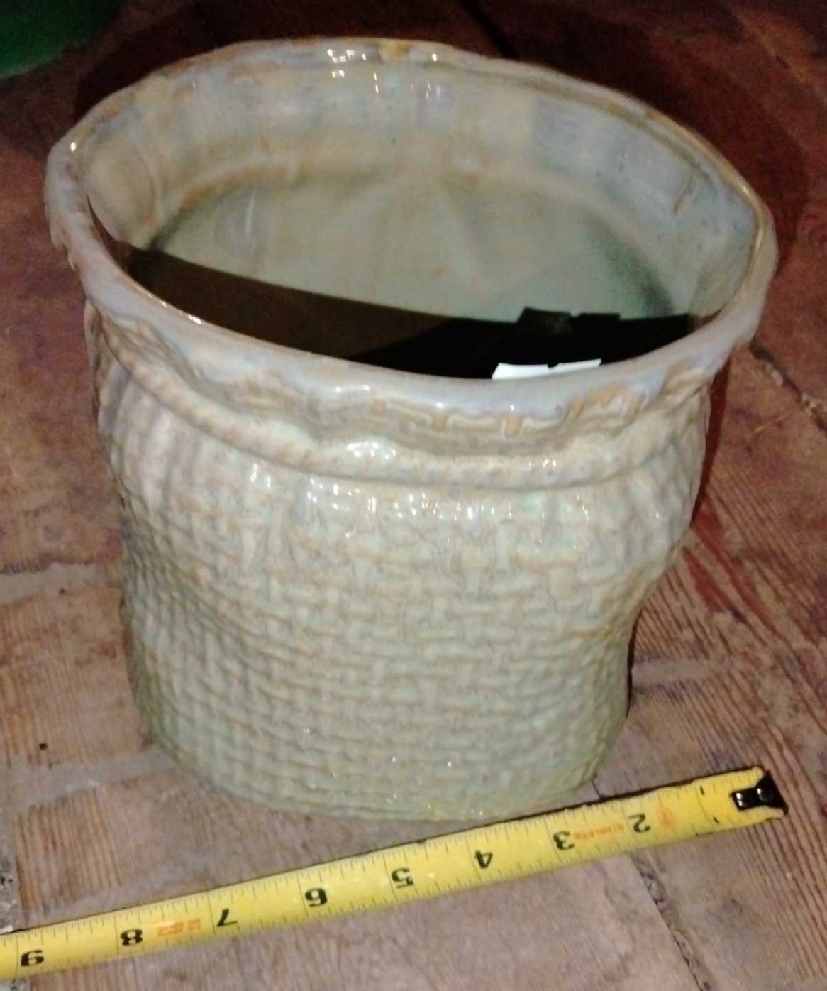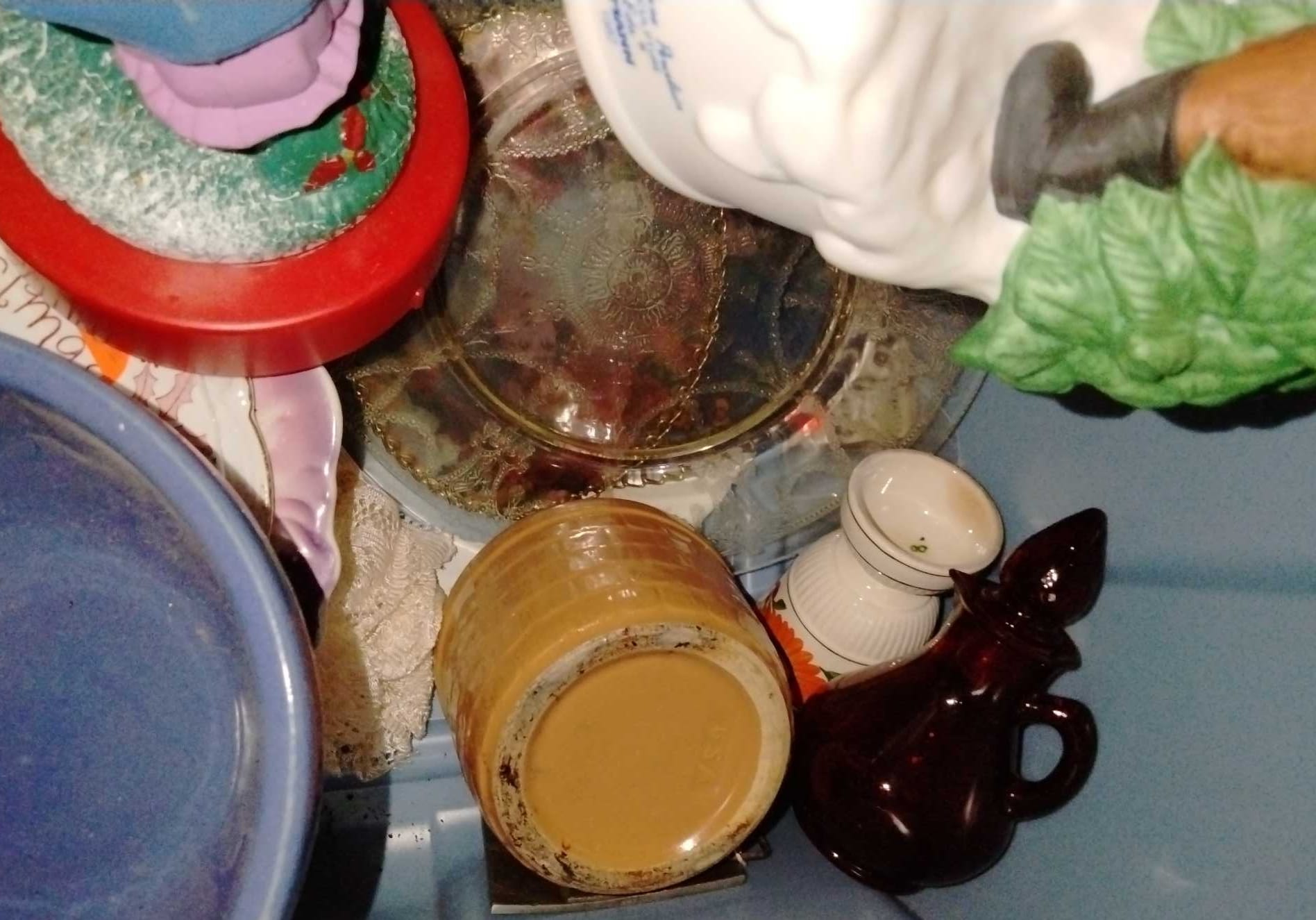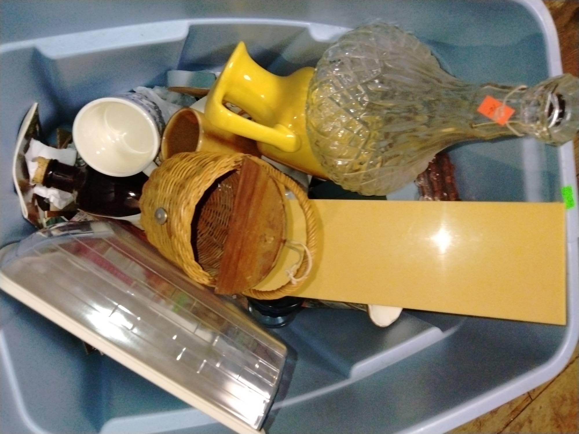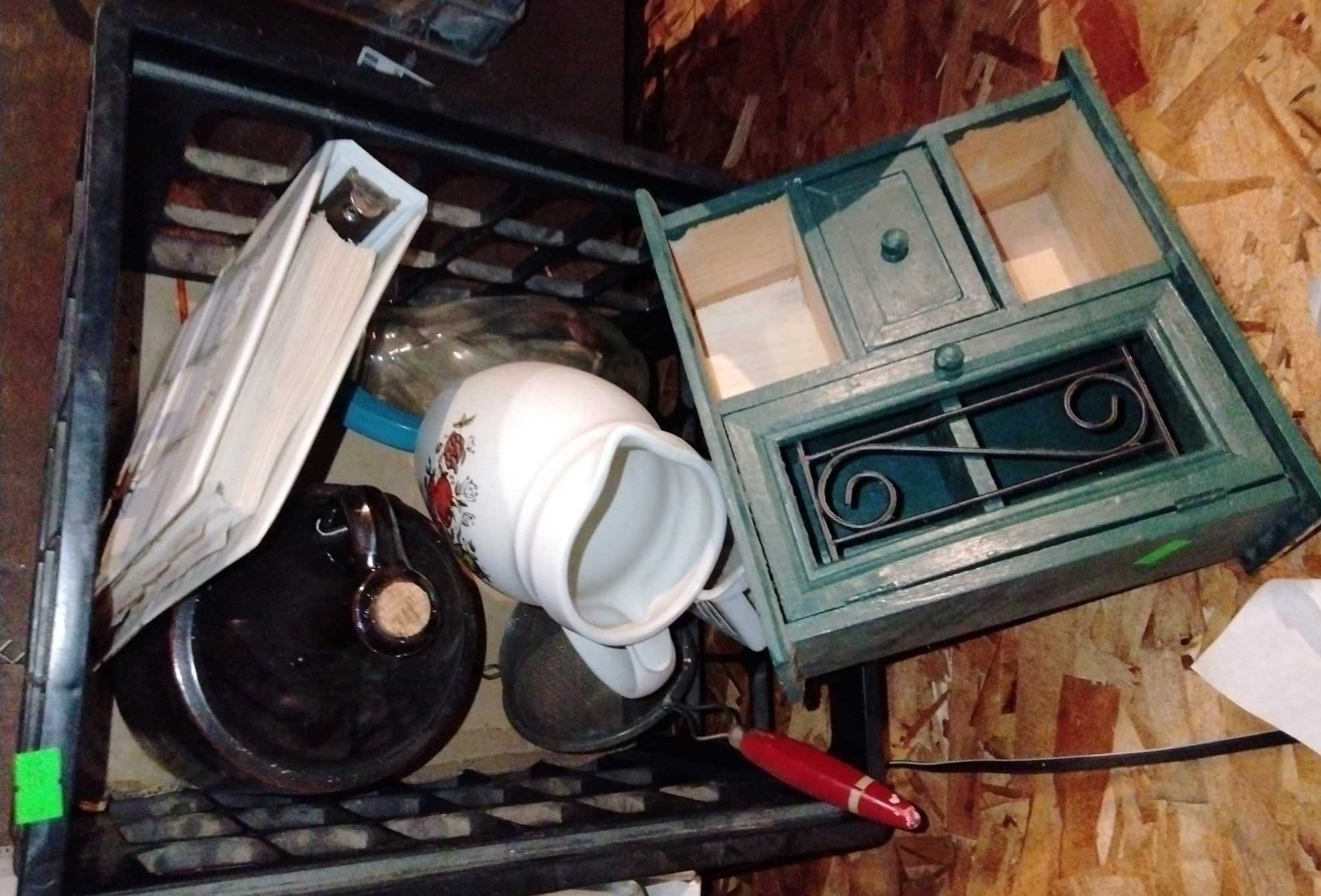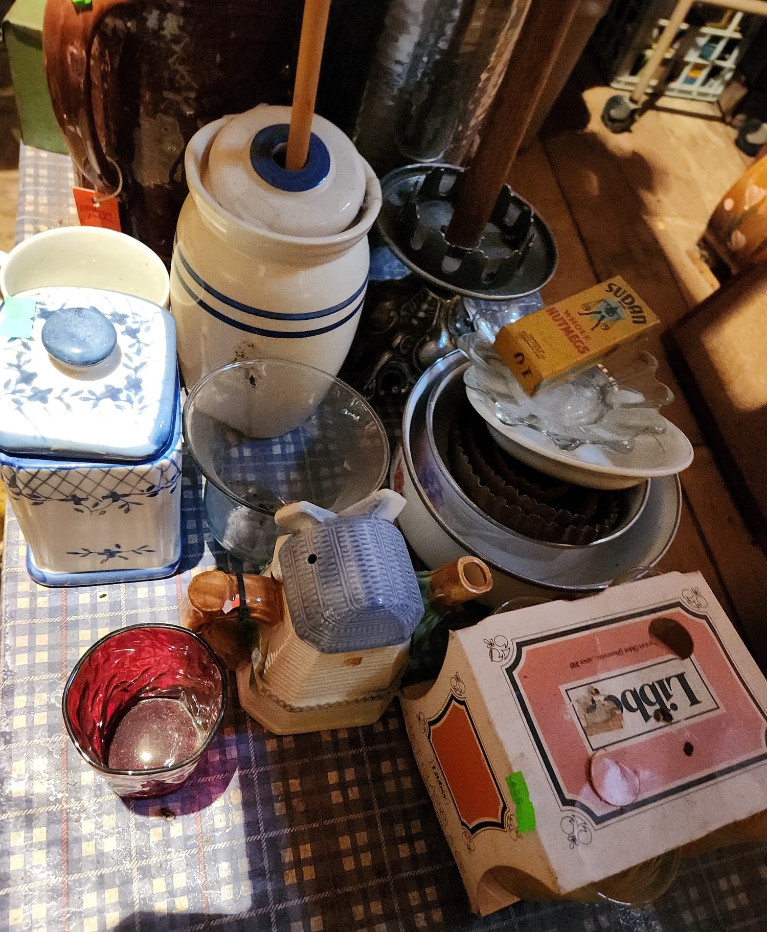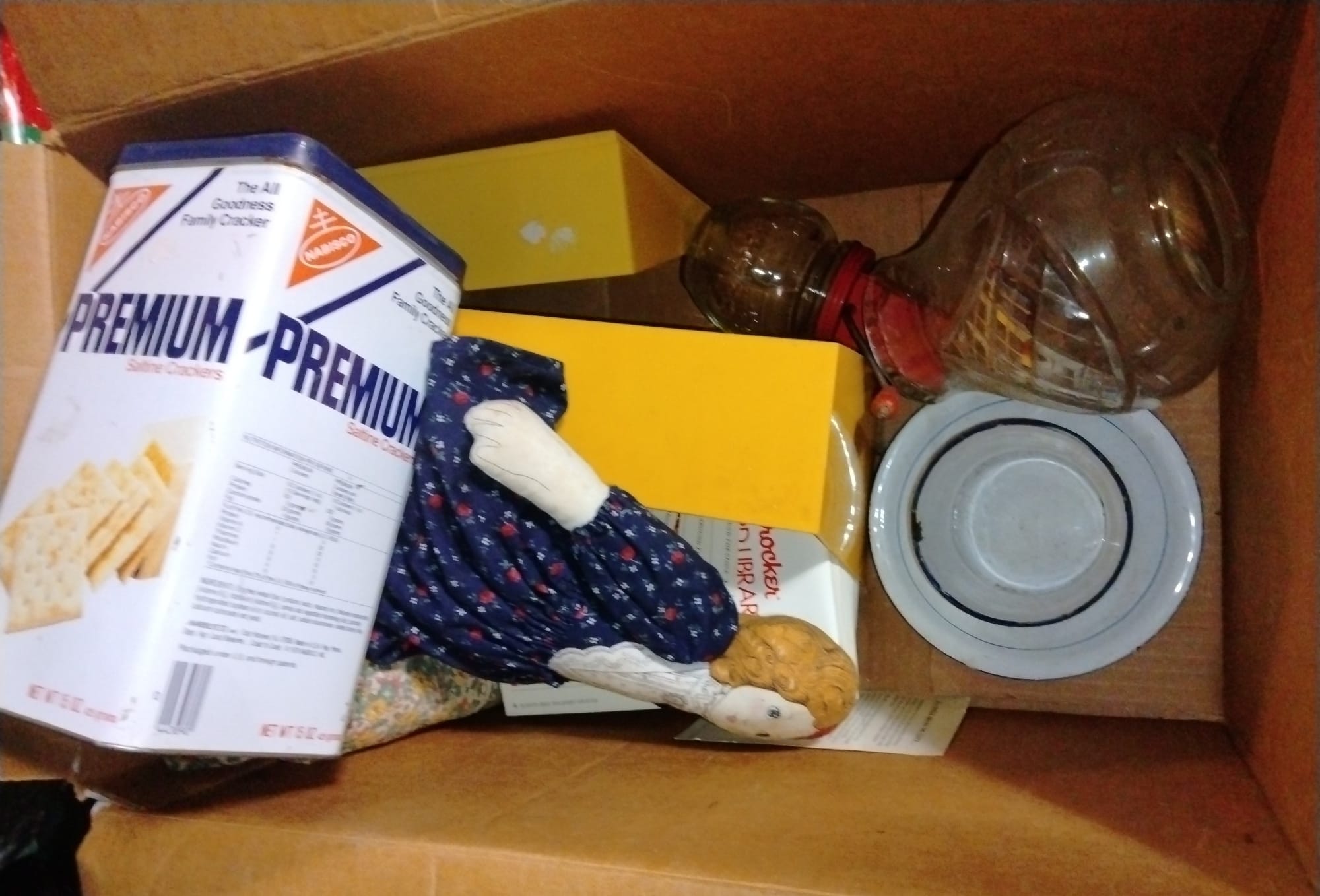 461 Crock, enamel pan, crock pitcher and jug, Coca-Cola bottles, planters, wood mold, wood box, cups, canister, miscellaneous