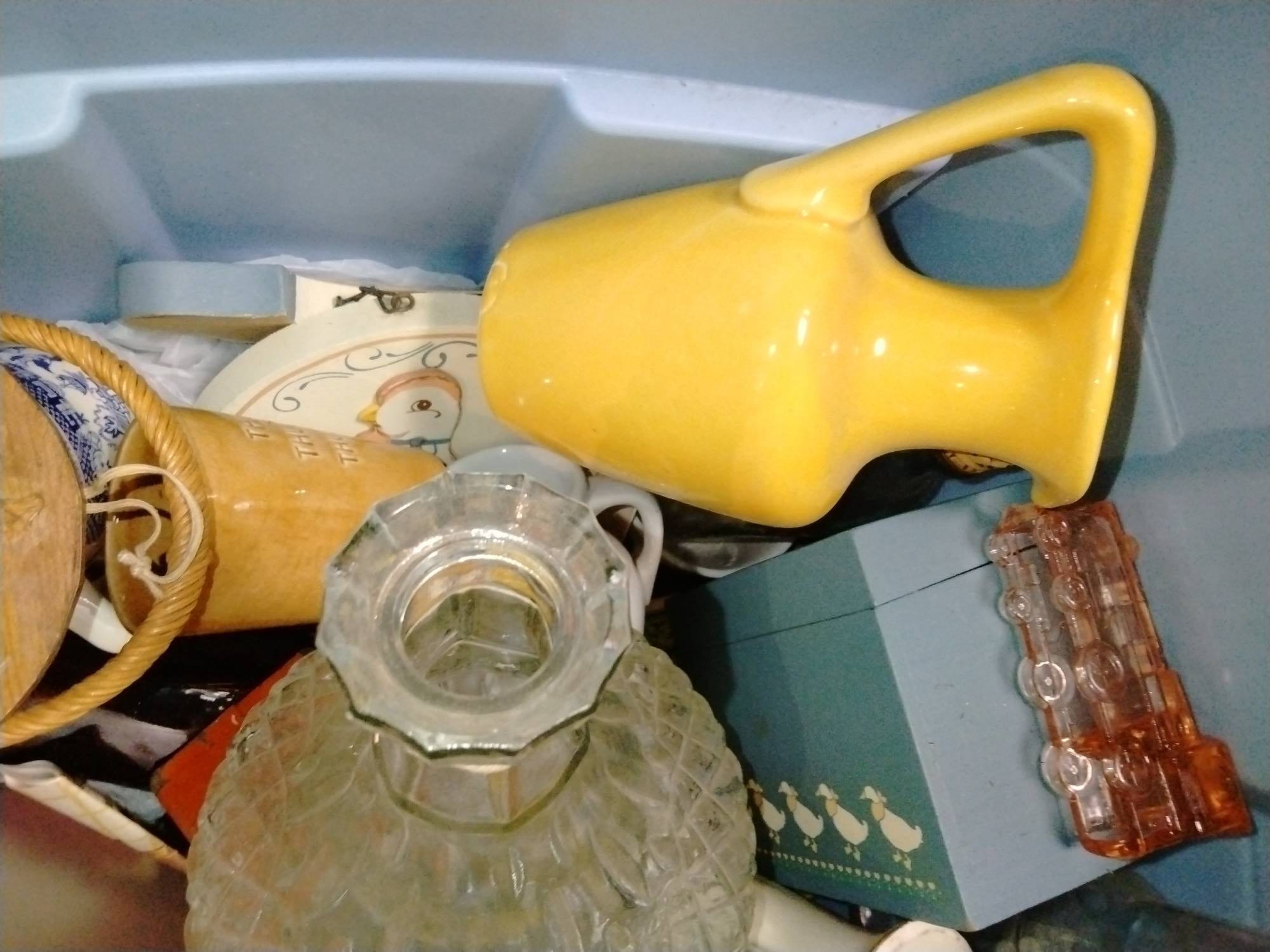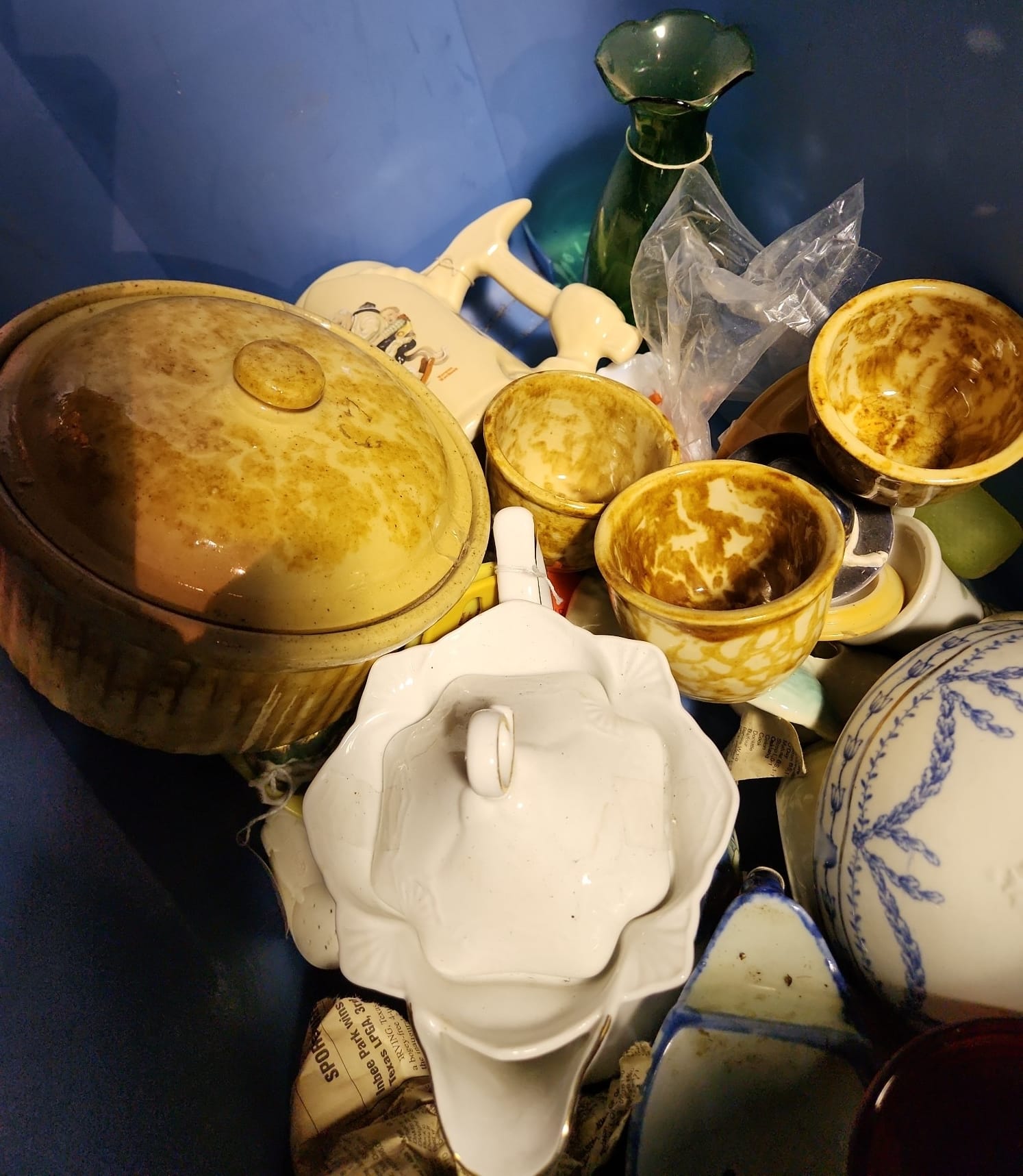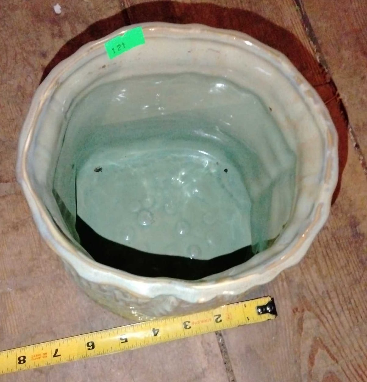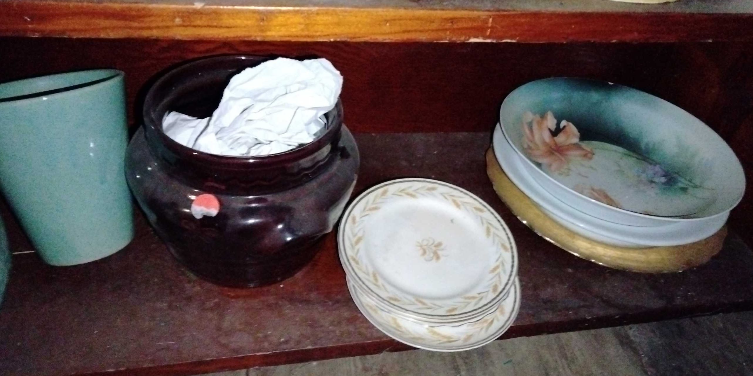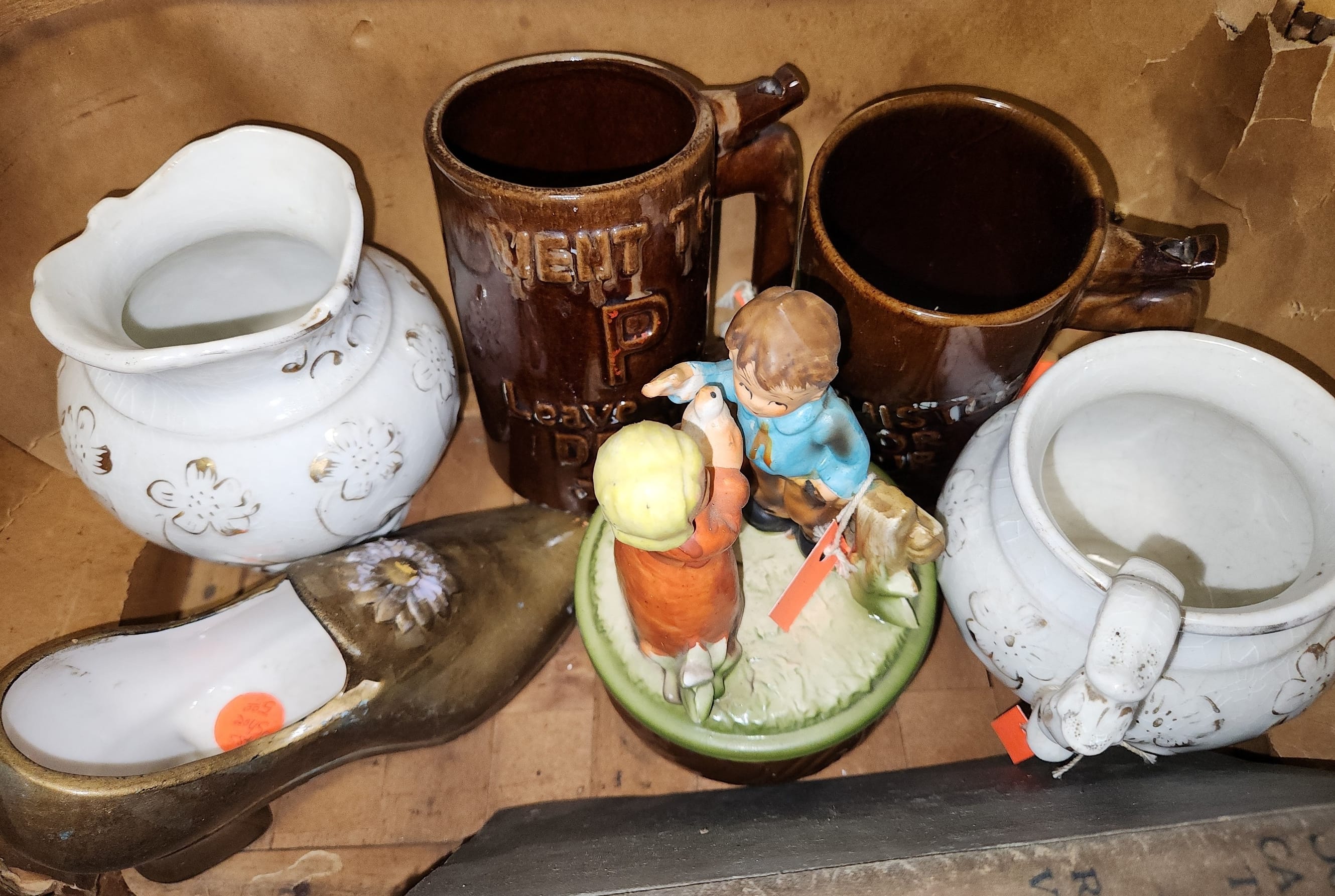 461 Crock, enamel pan, crock pitcher and jug, Coca-Cola bottles, planters, wood mold, wood box, cups, canister, miscellaneous