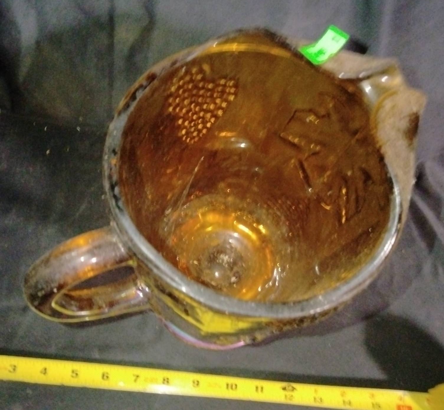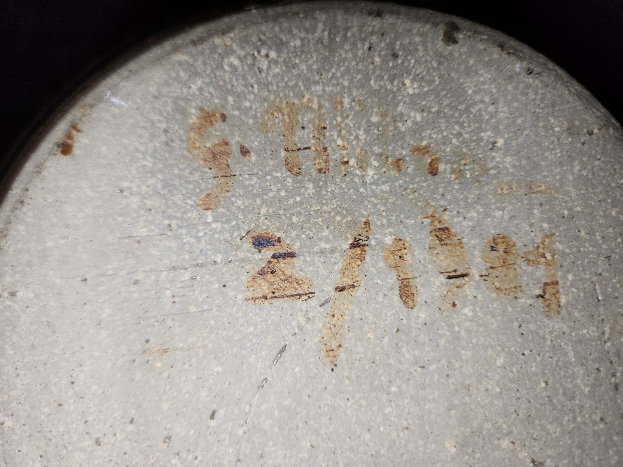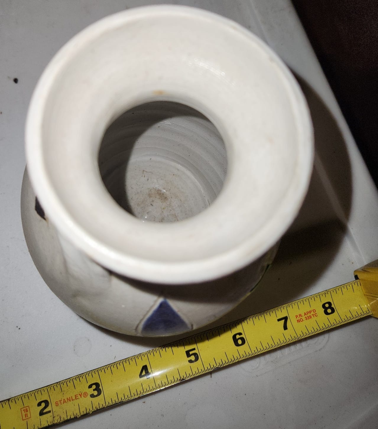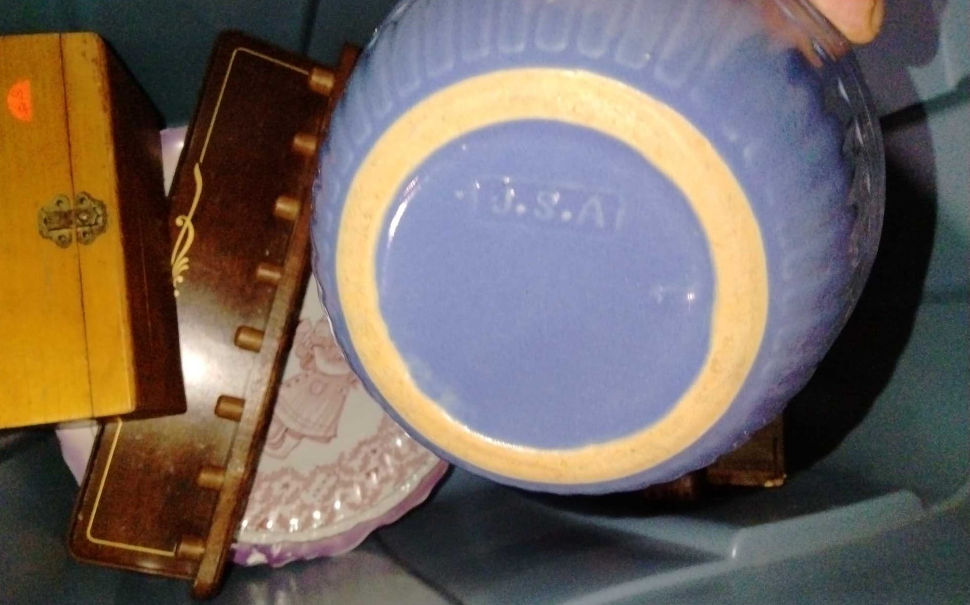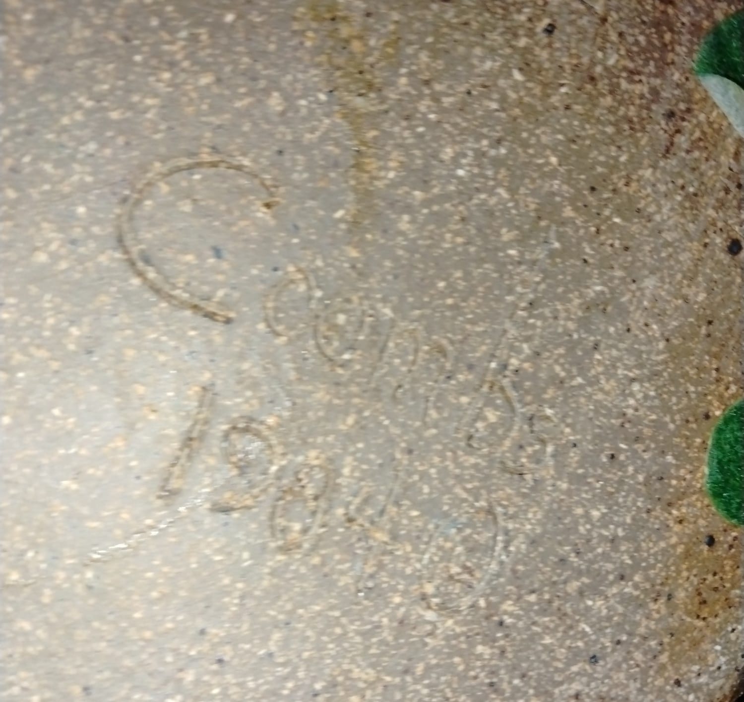 461 Crock, enamel pan, crock pitcher and jug, Coca-Cola bottles, planters, wood mold, wood box, cups, canister, miscellaneous