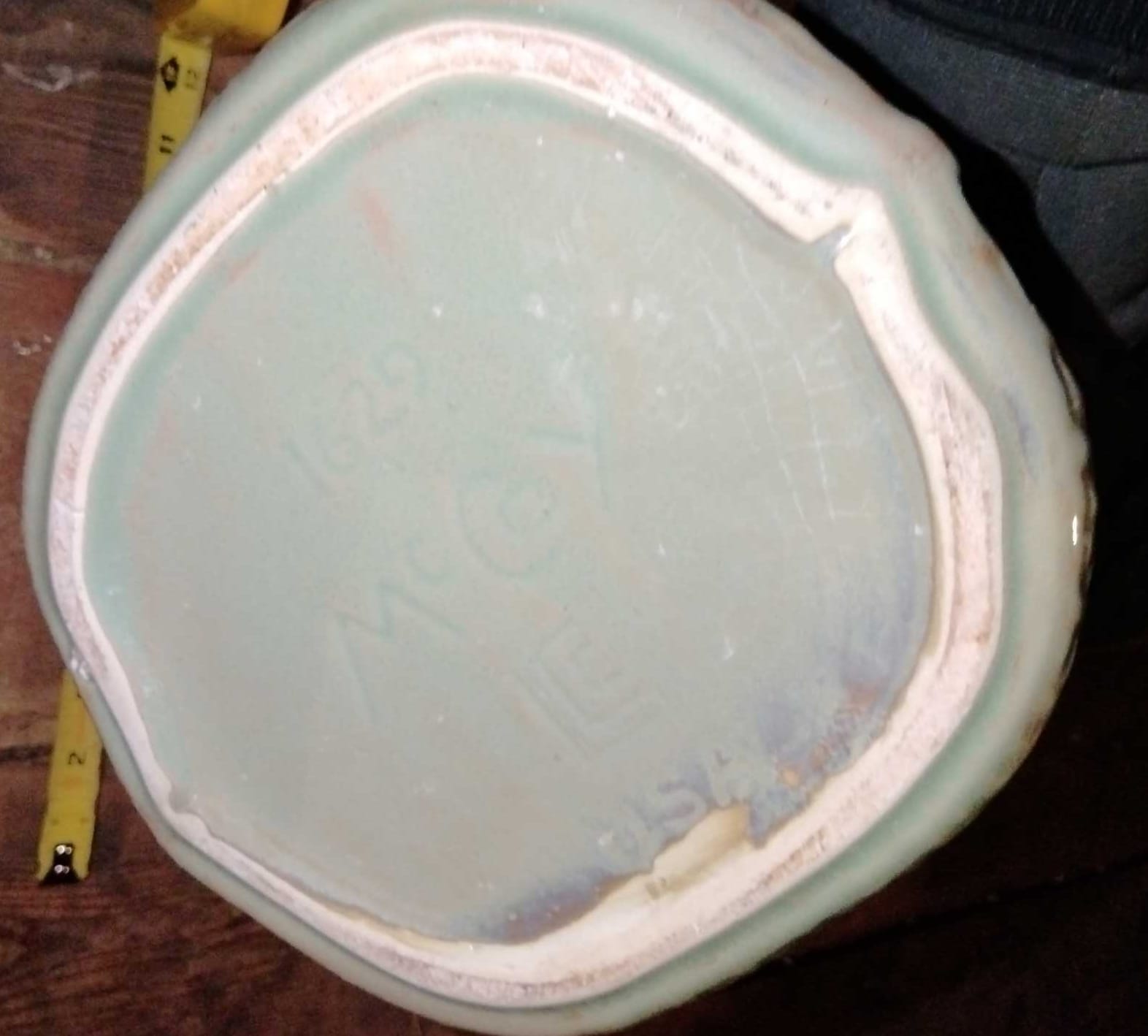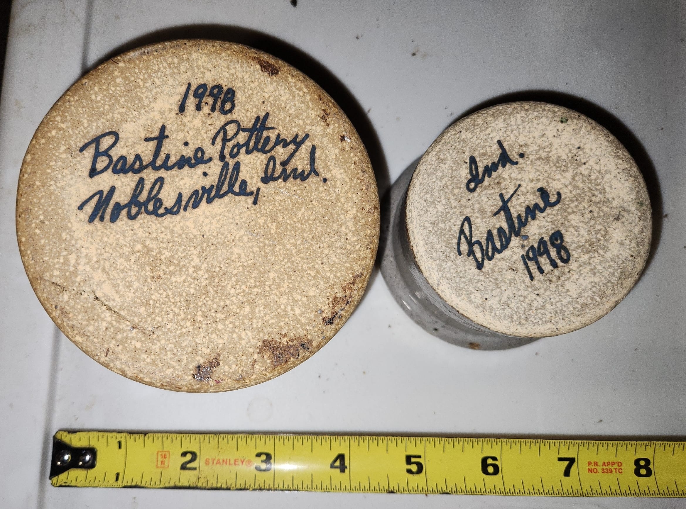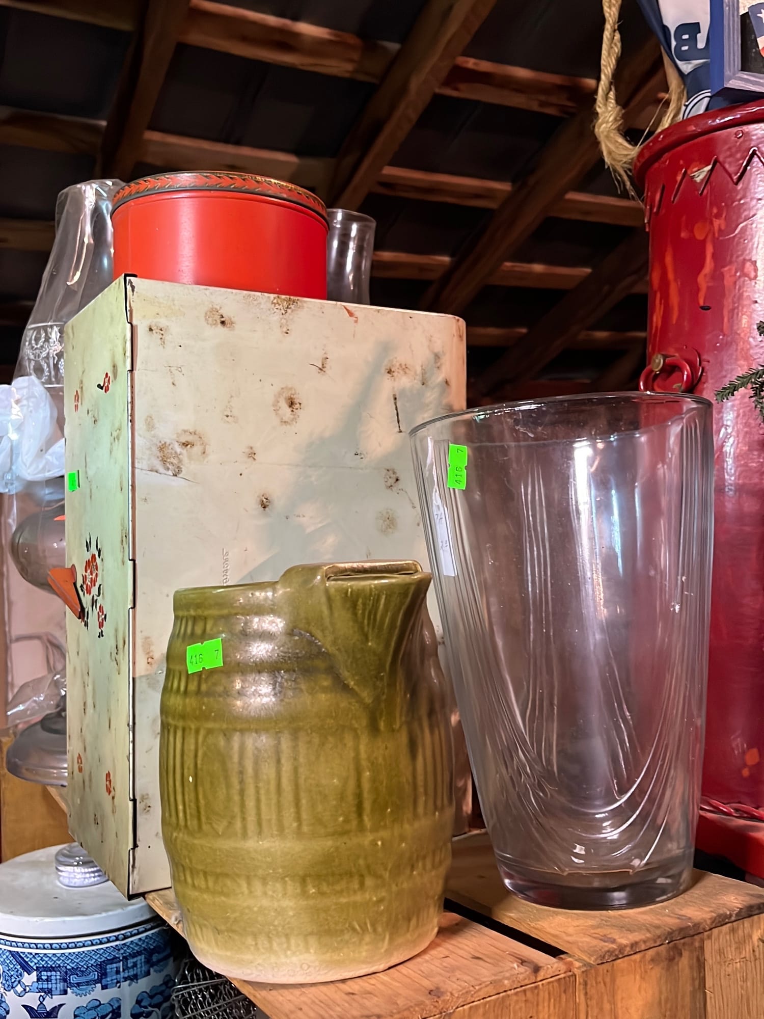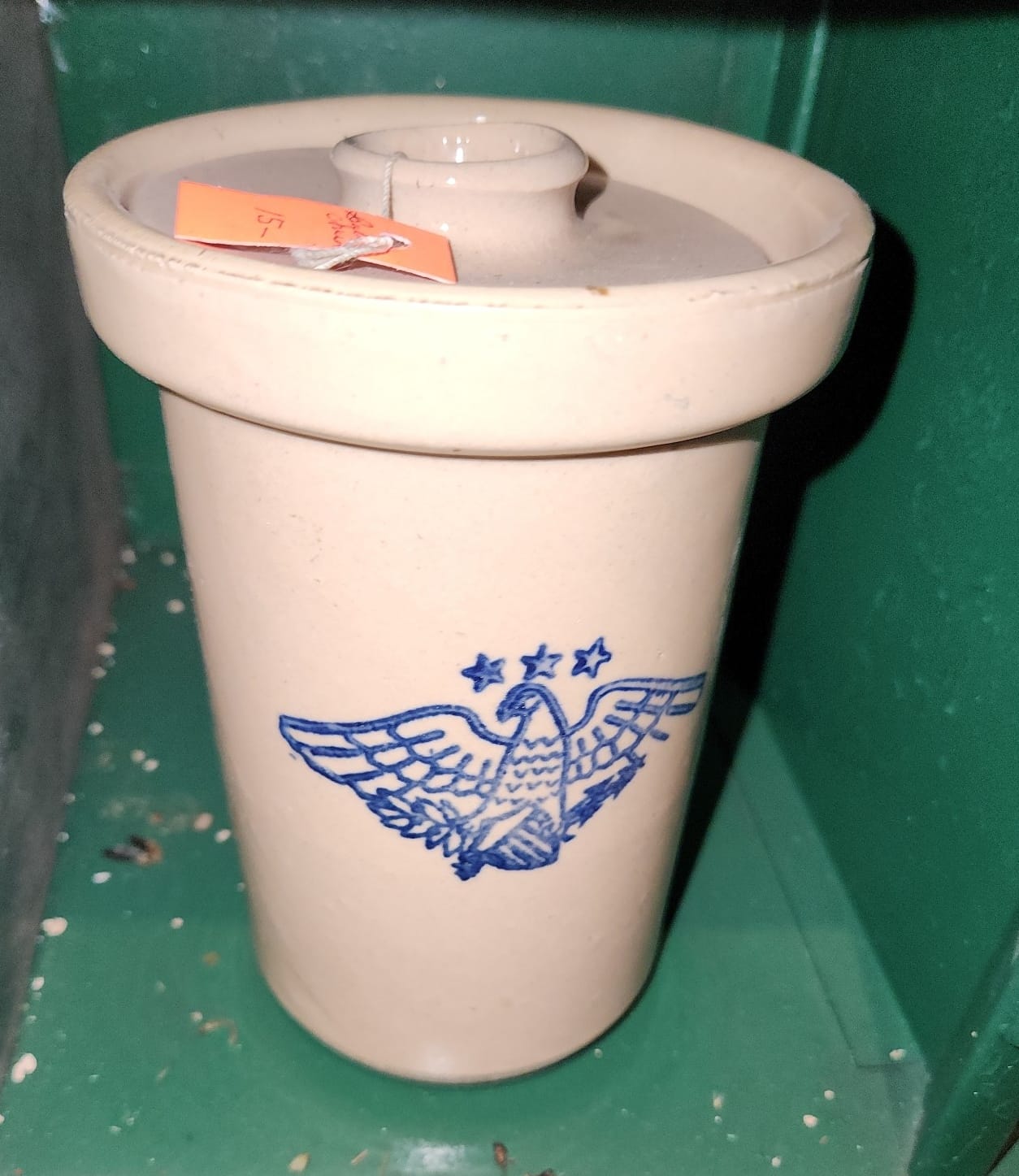 429 Beaumont Brothers Pottery jug 5”, Roseville crock, crocks, covered dish, tins, bird, bowls, vases