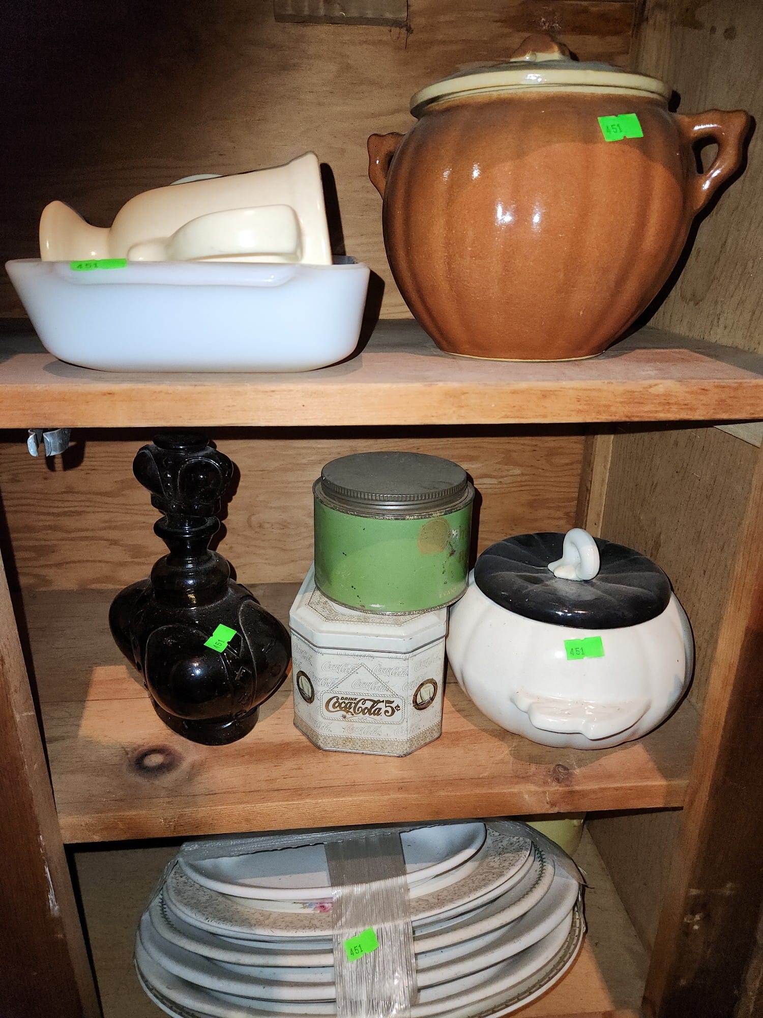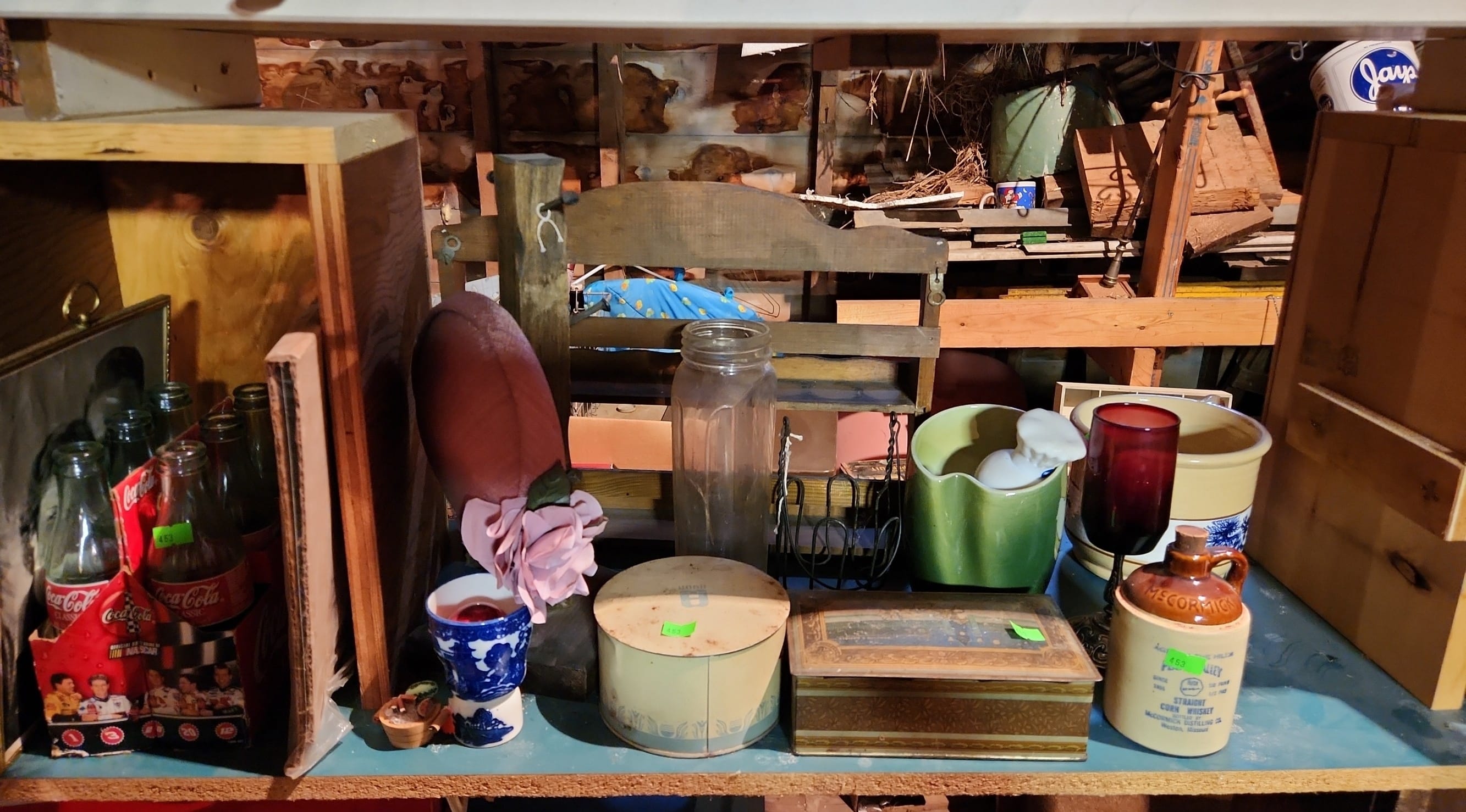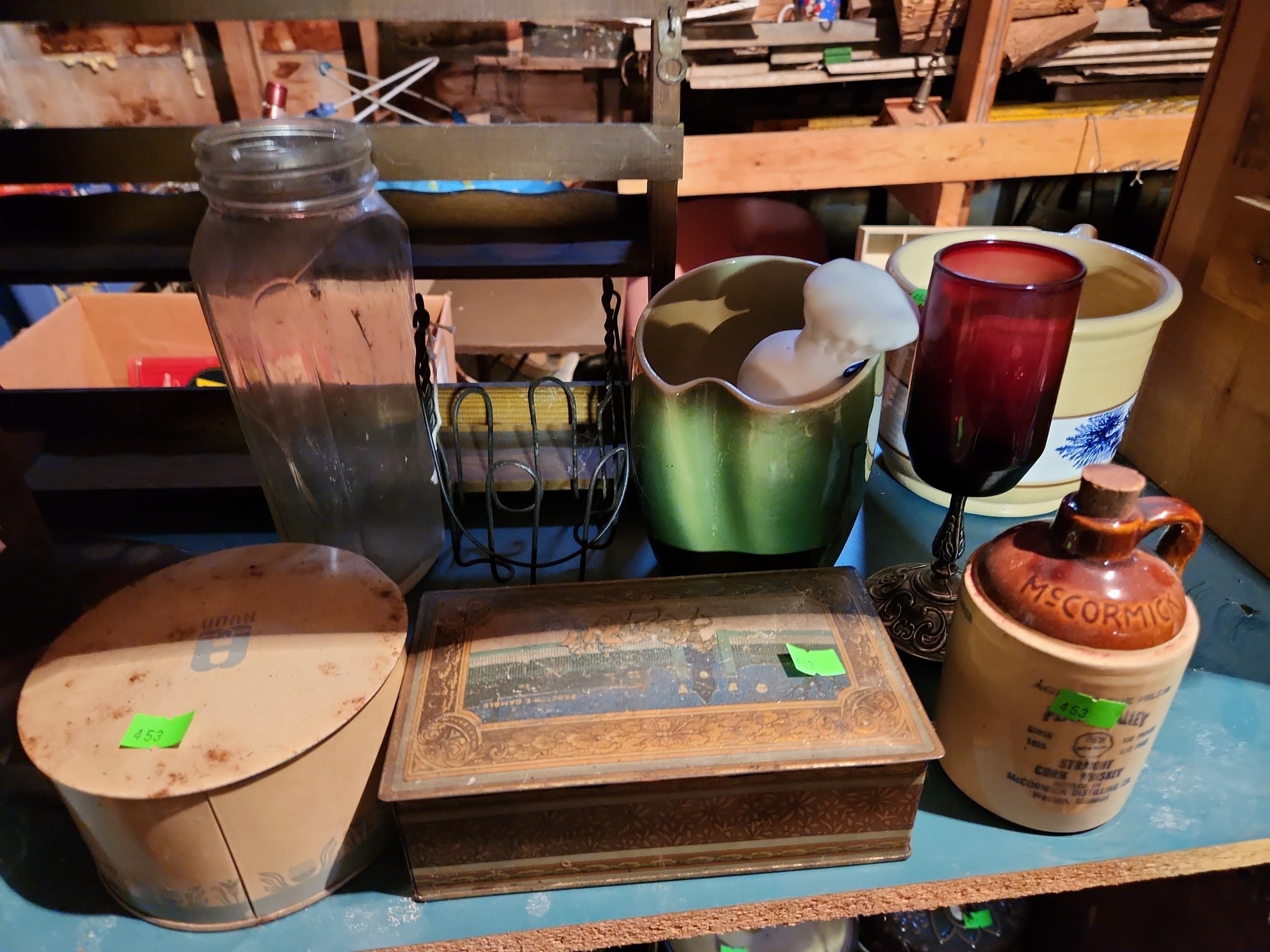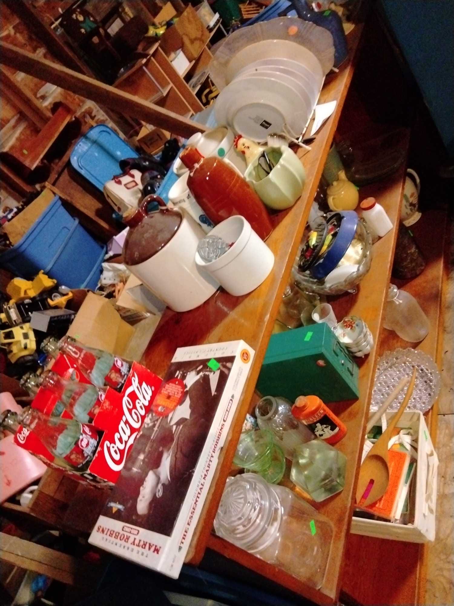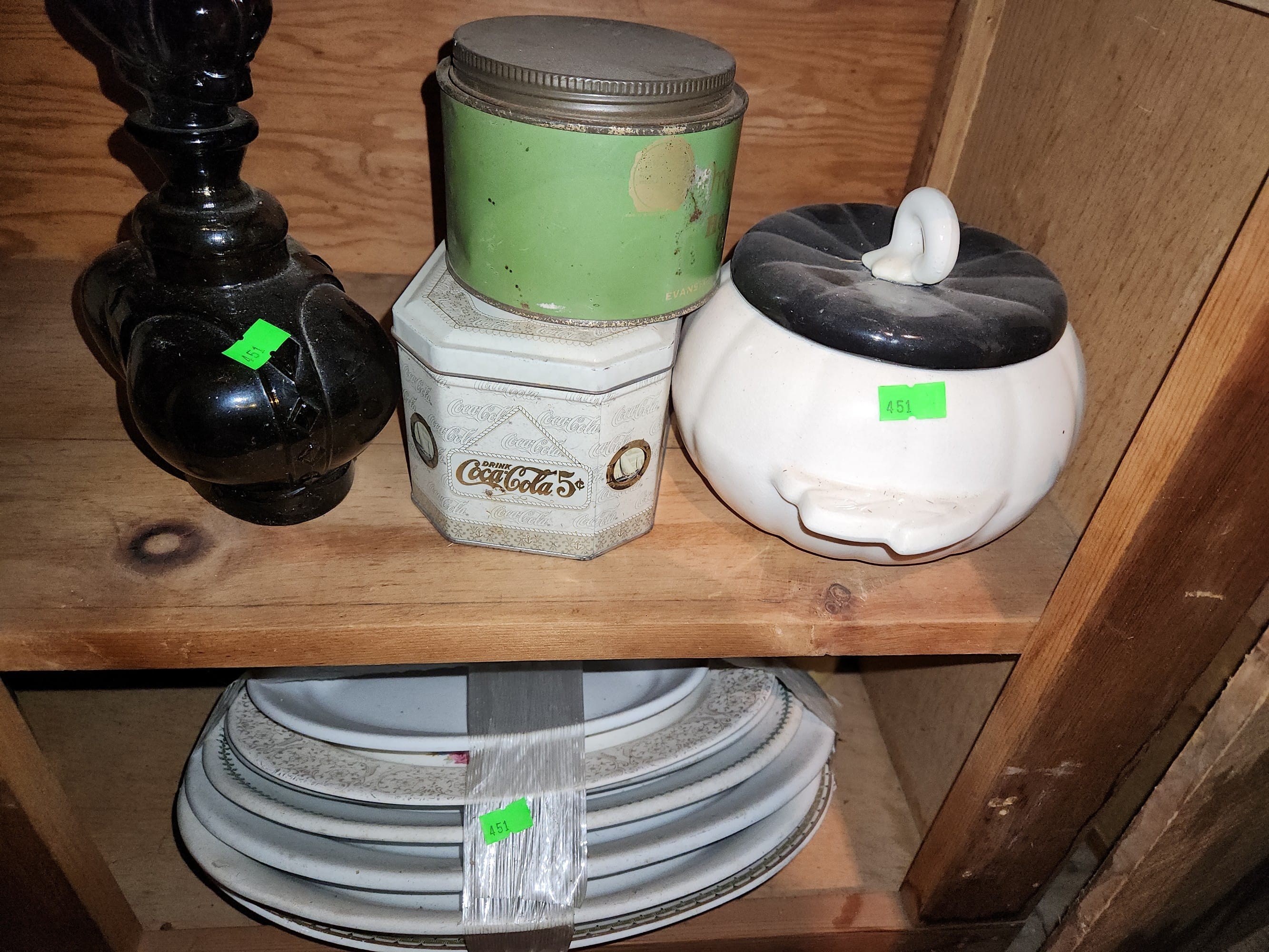 453 Coca-Cola bottles, Avon tin, East Knoll Pottery pitcher, pottery vase, McCormick Whiskey - empty, tins, miscellaneous