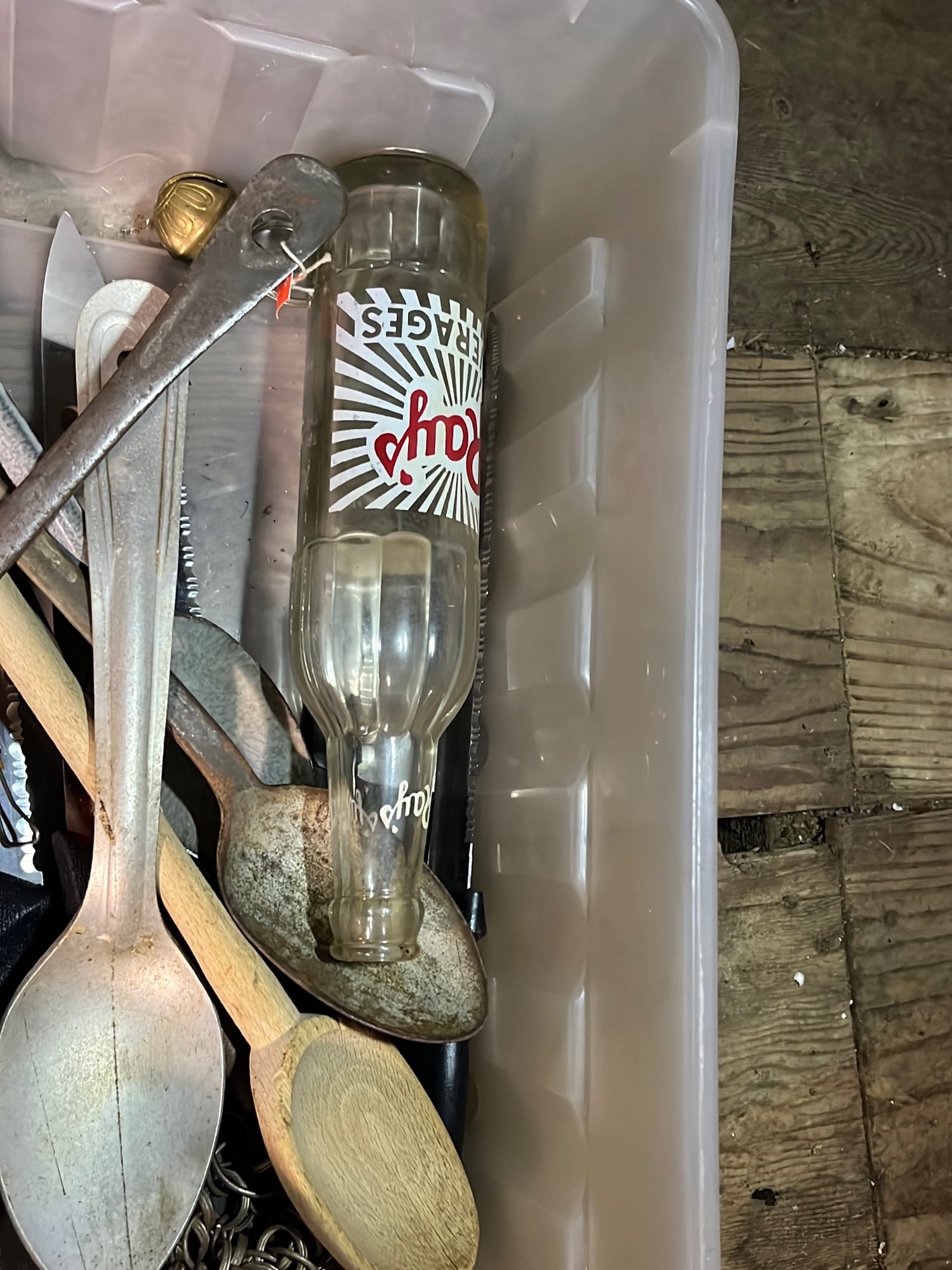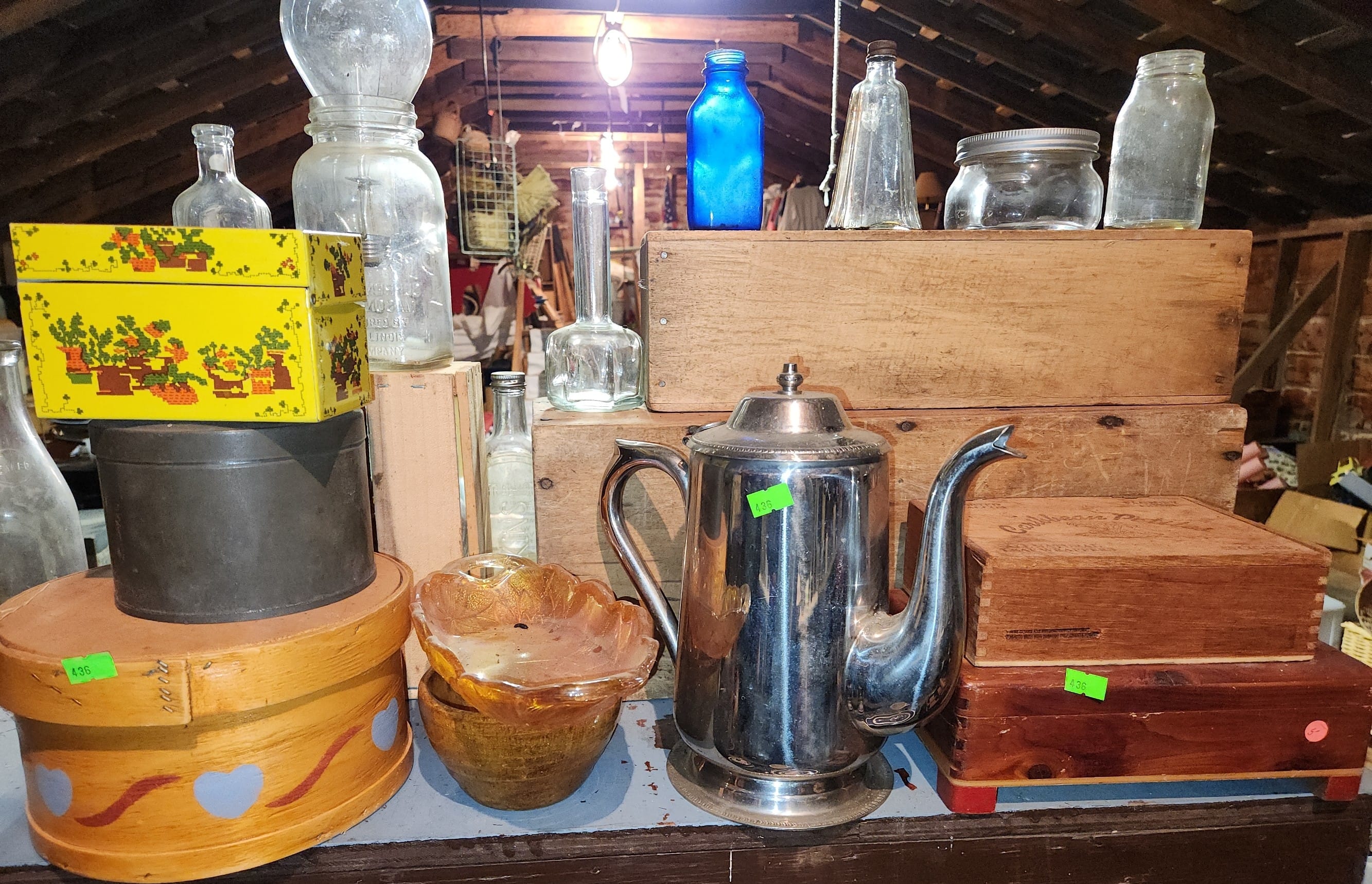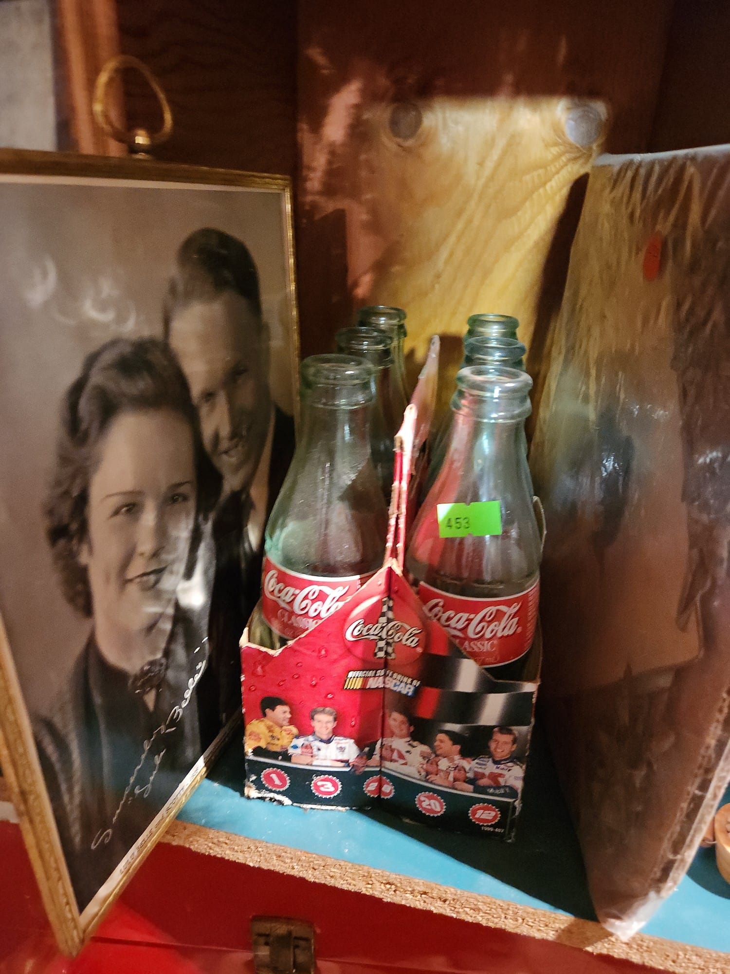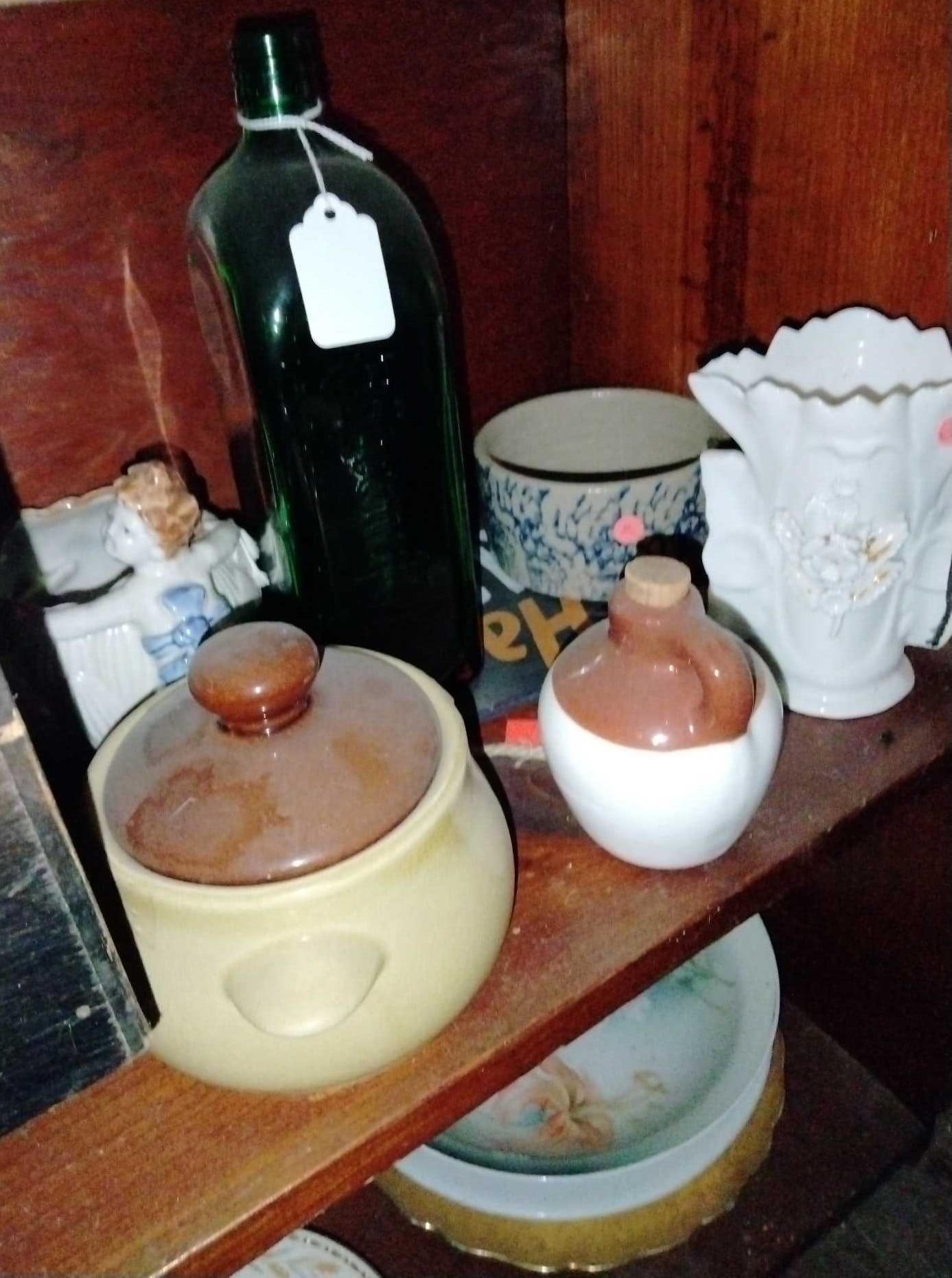 453 Coca-Cola bottles, Avon tin, East Knoll Pottery pitcher, pottery vase, McCormick Whiskey - empty, tins, miscellaneous