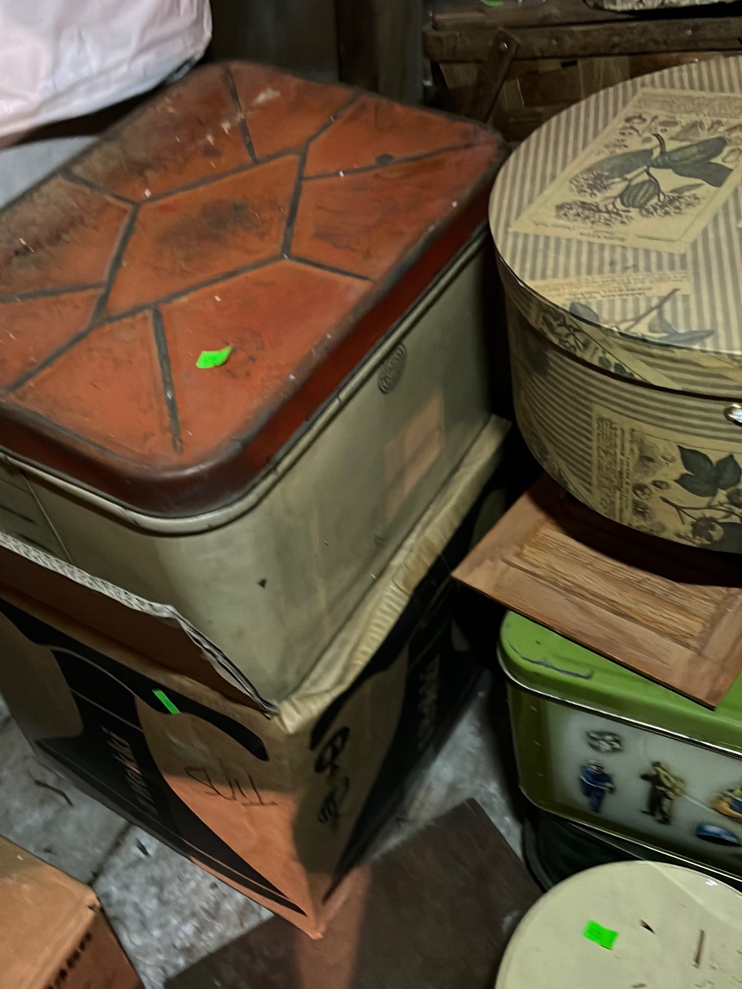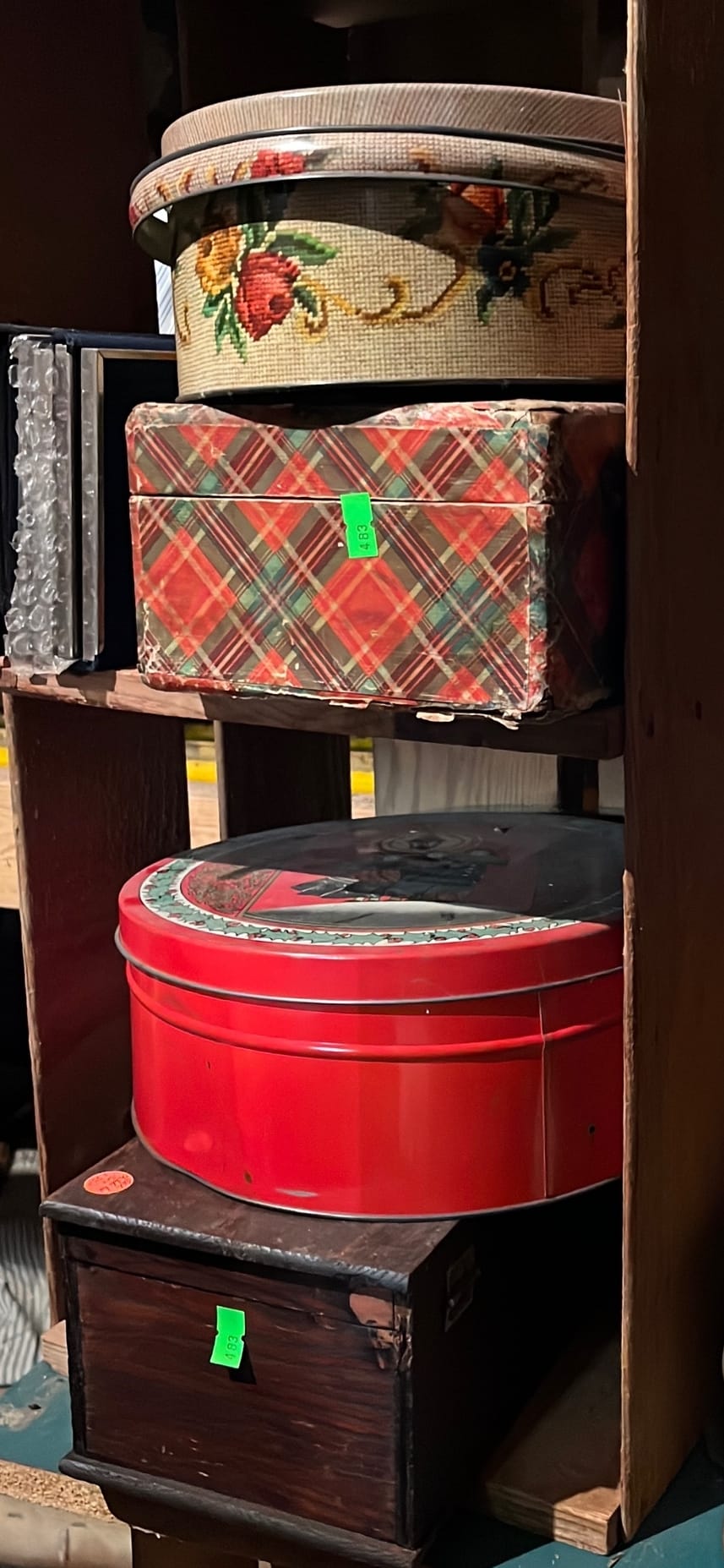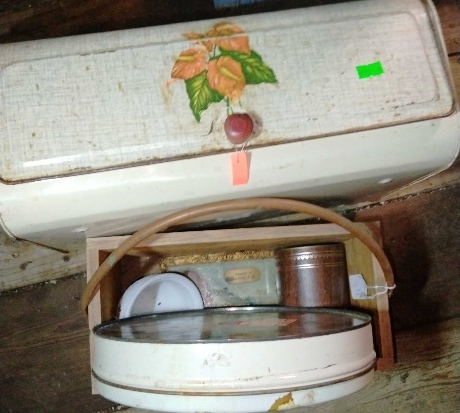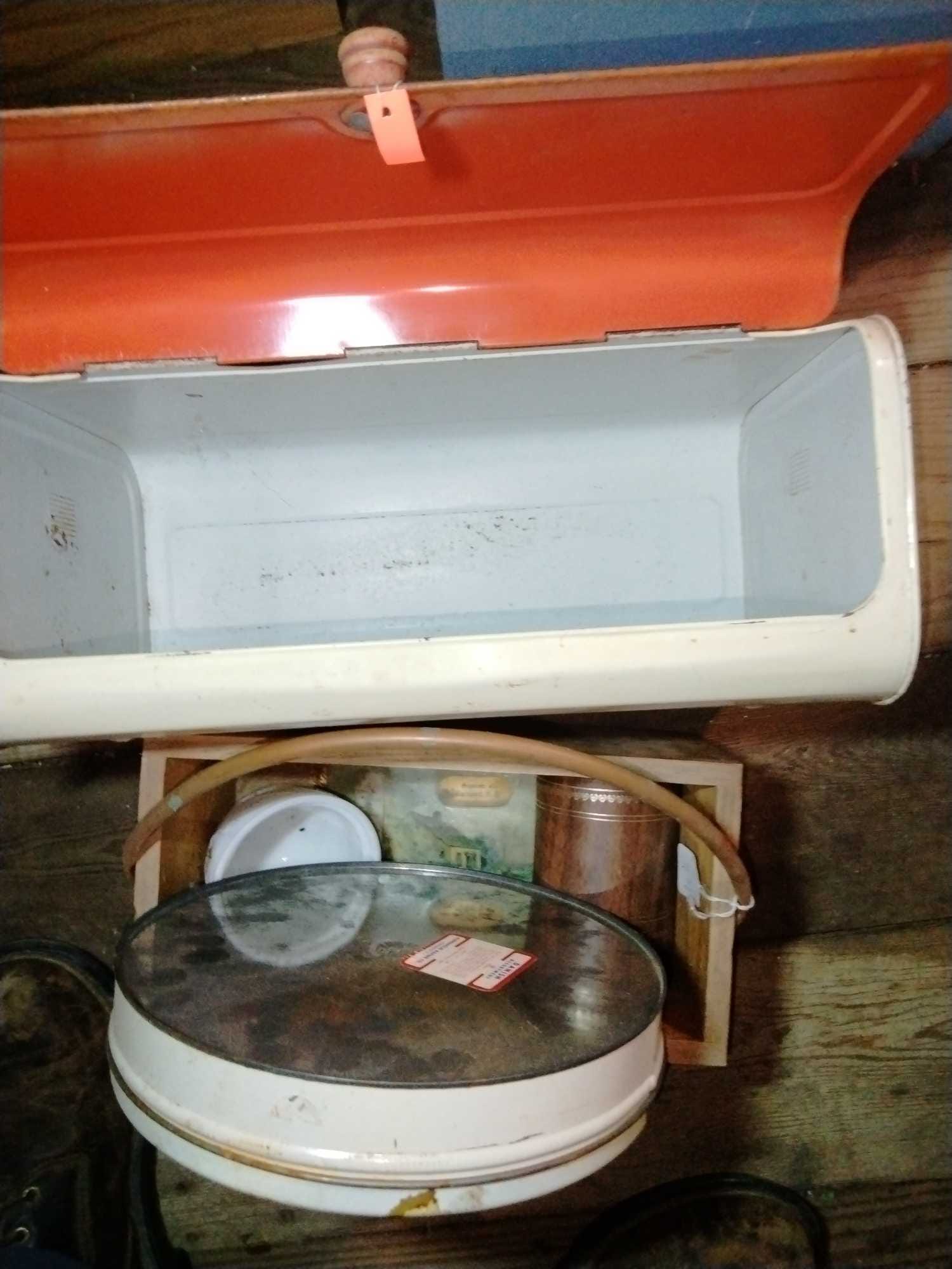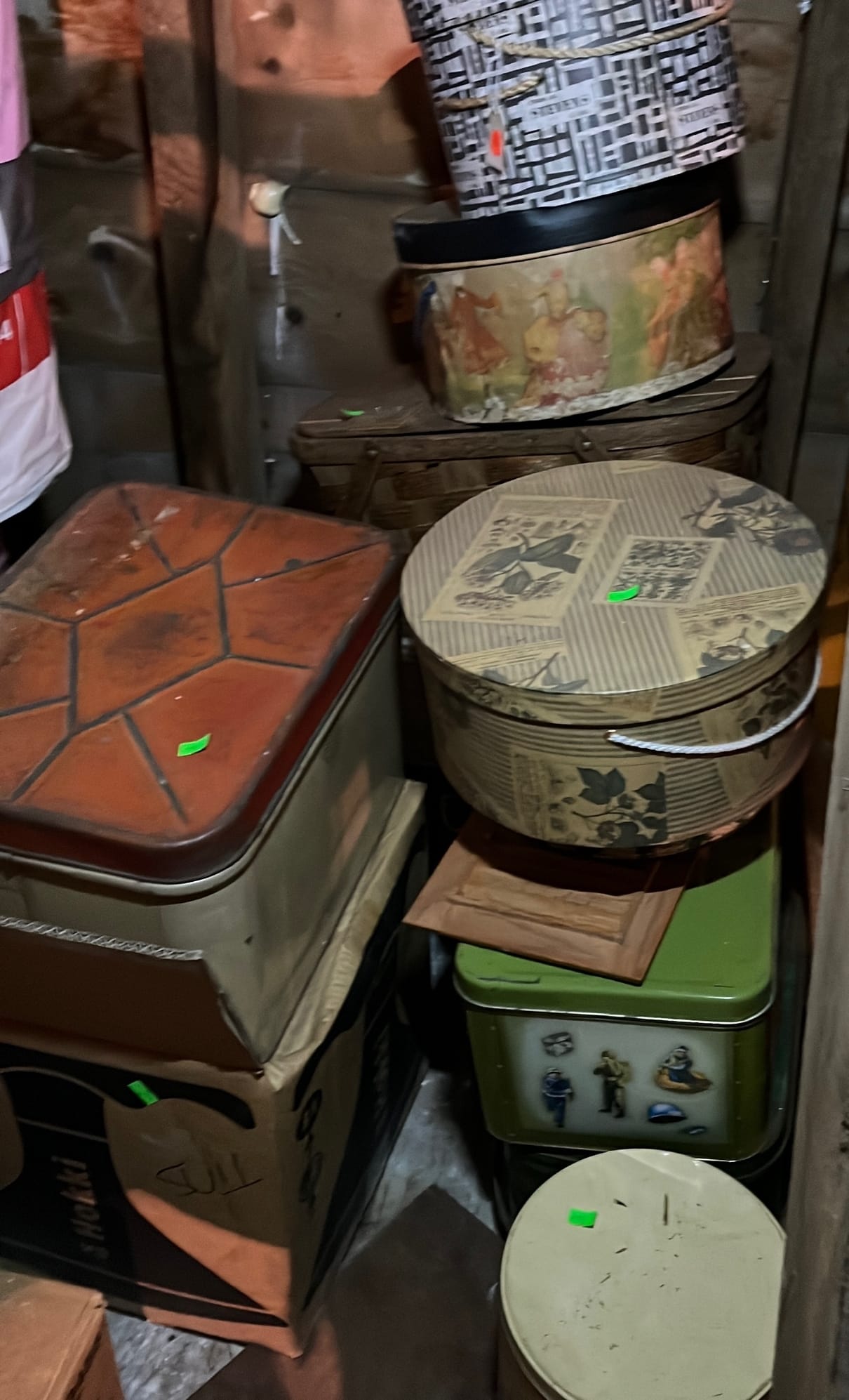 475 Metal bread boxes, hat boxes, picnic basket, tin