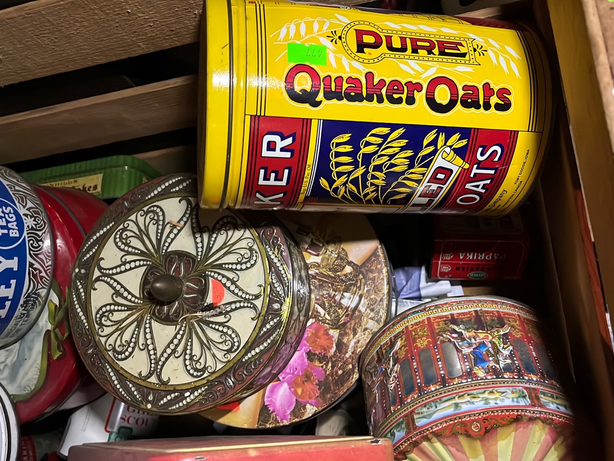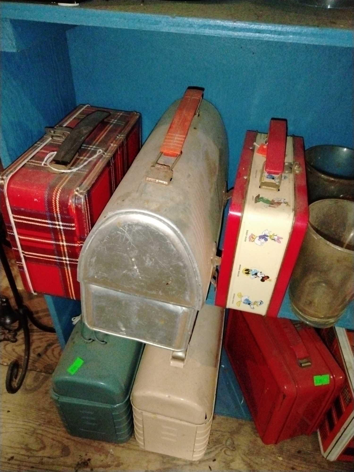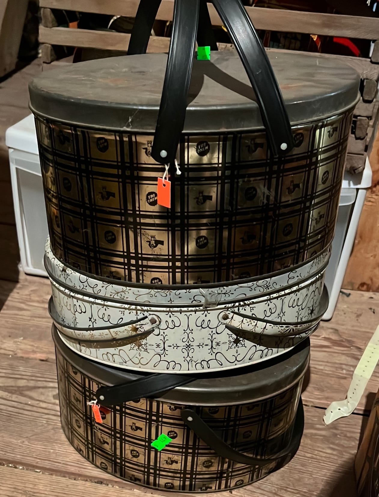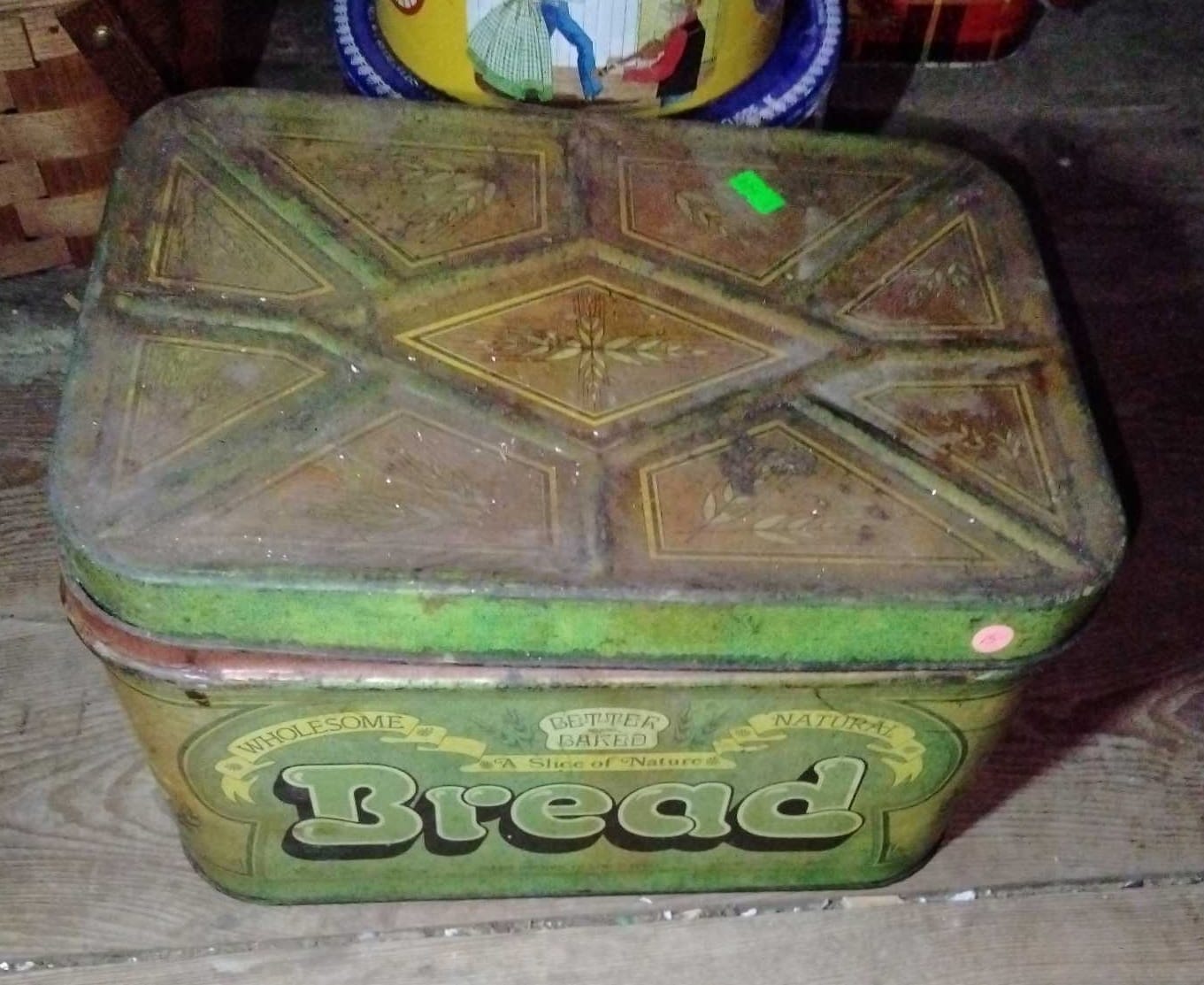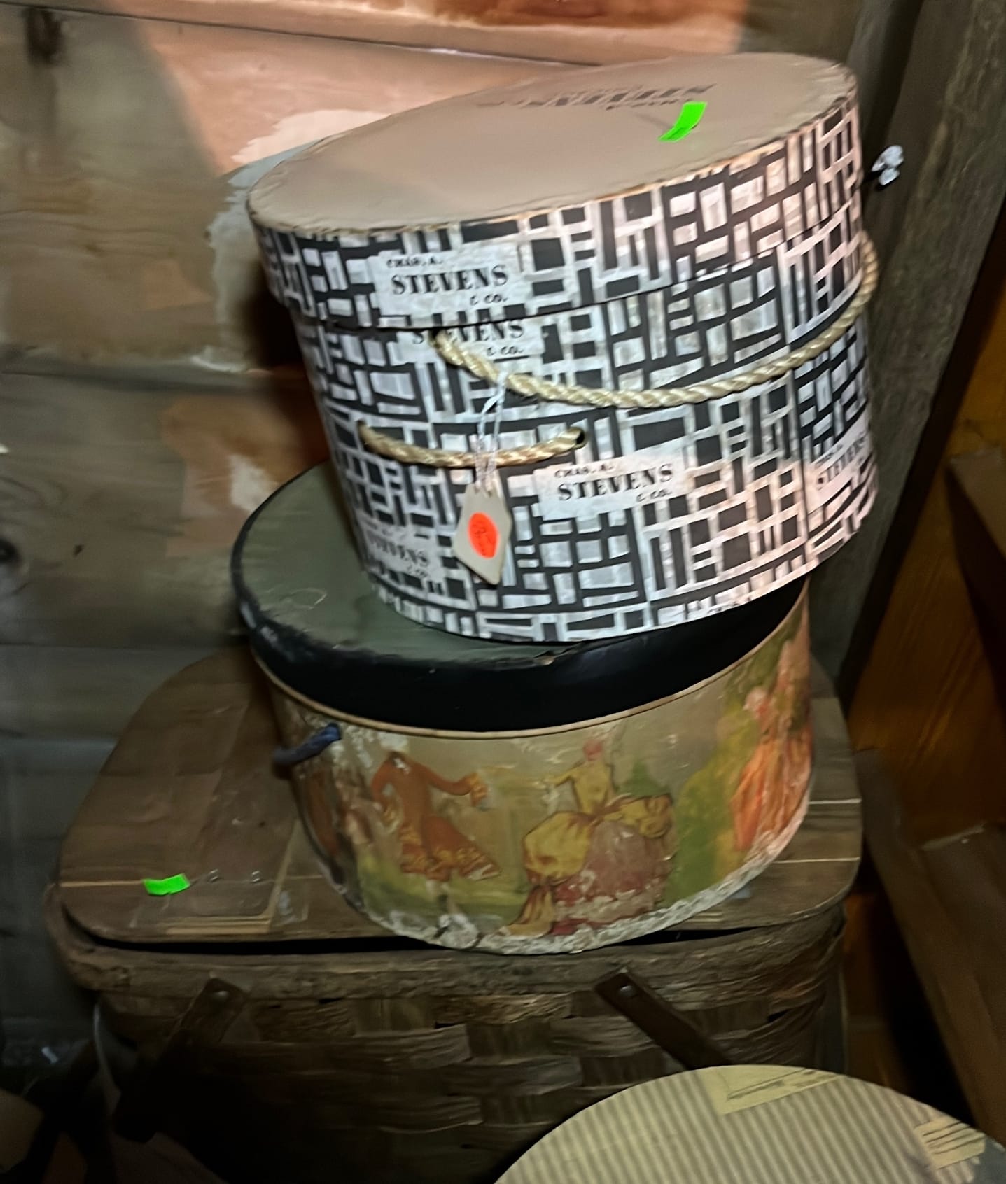 475 Metal bread boxes, hat boxes, picnic basket, tin