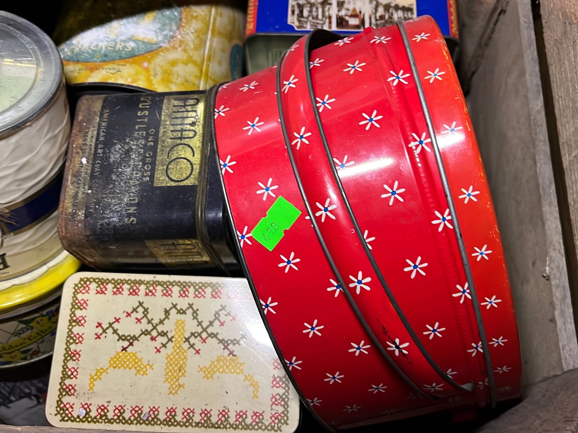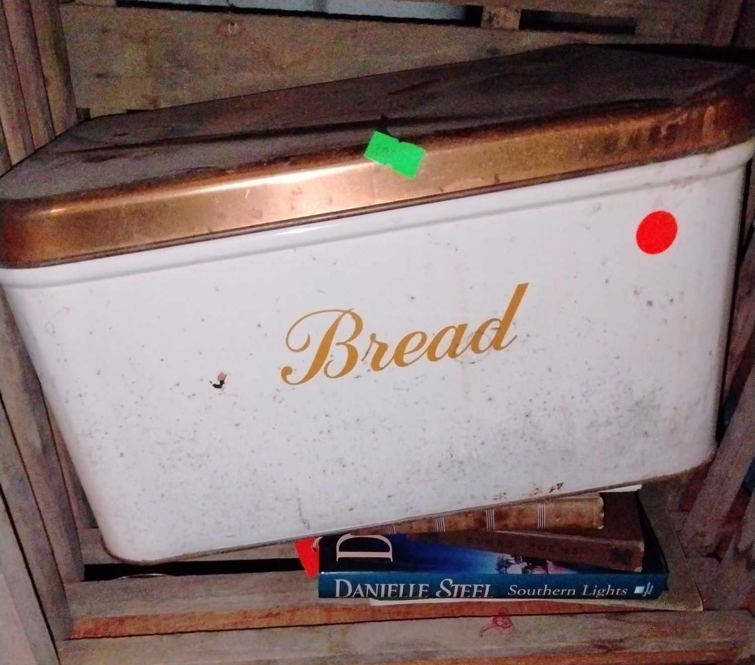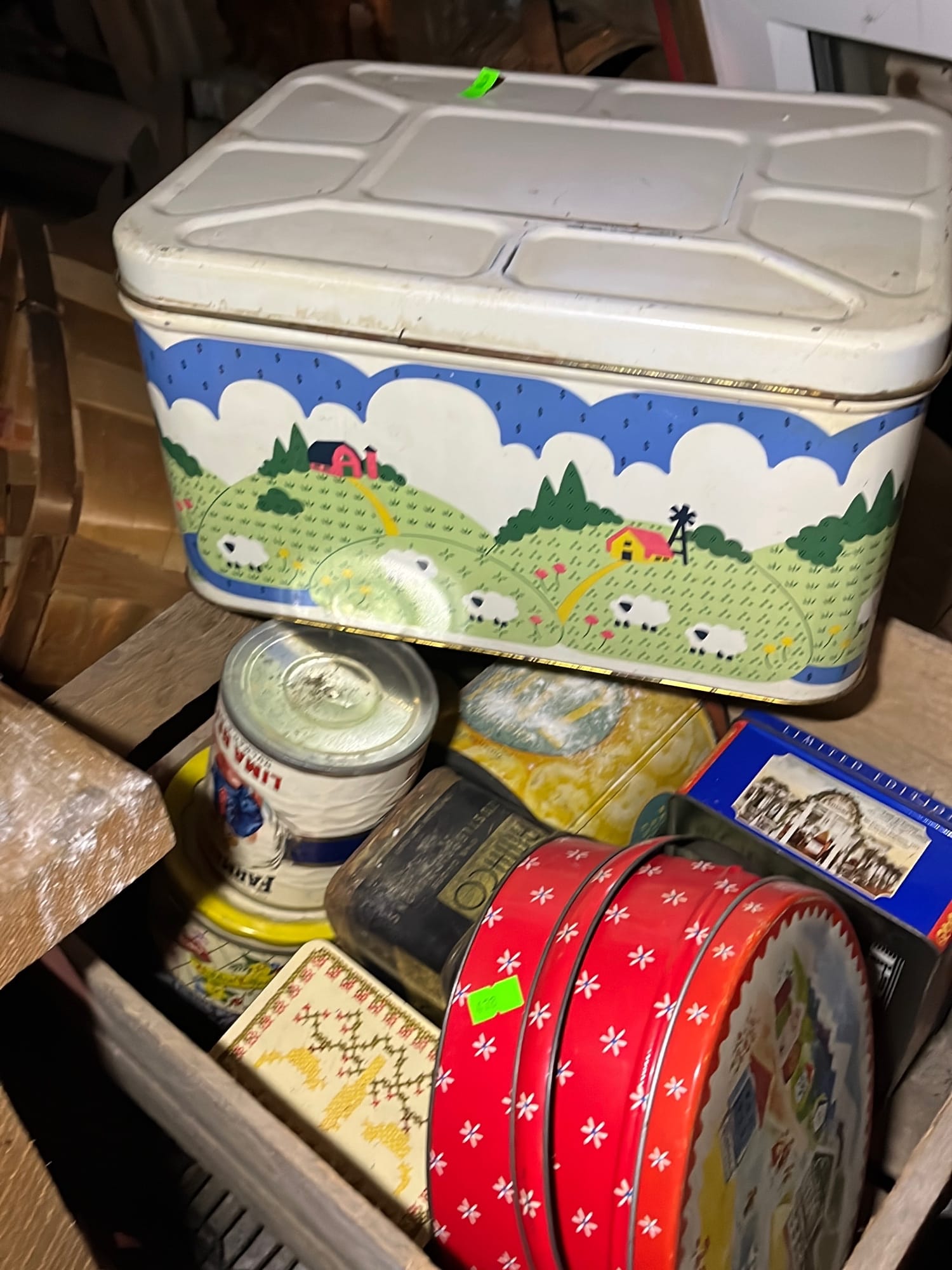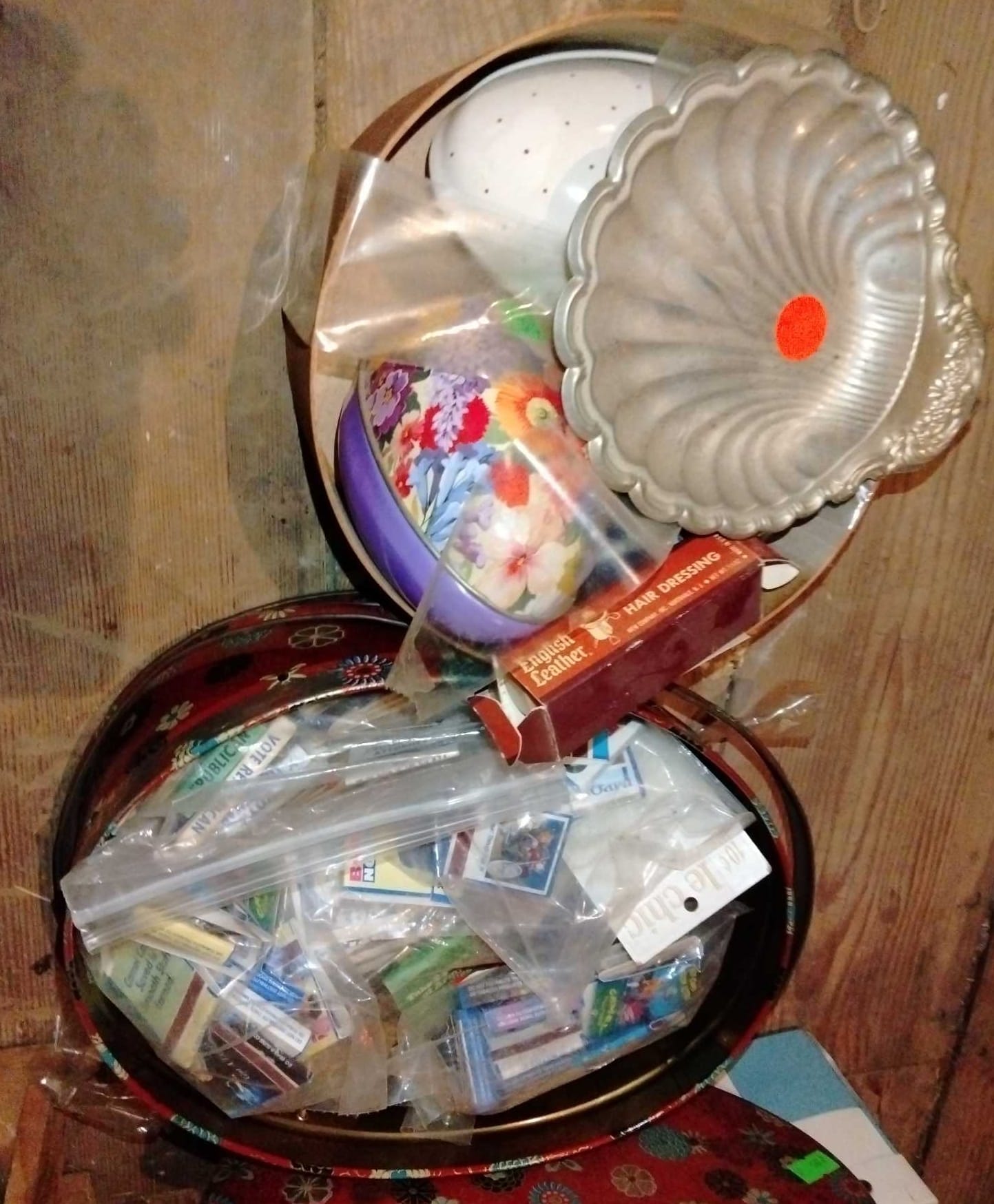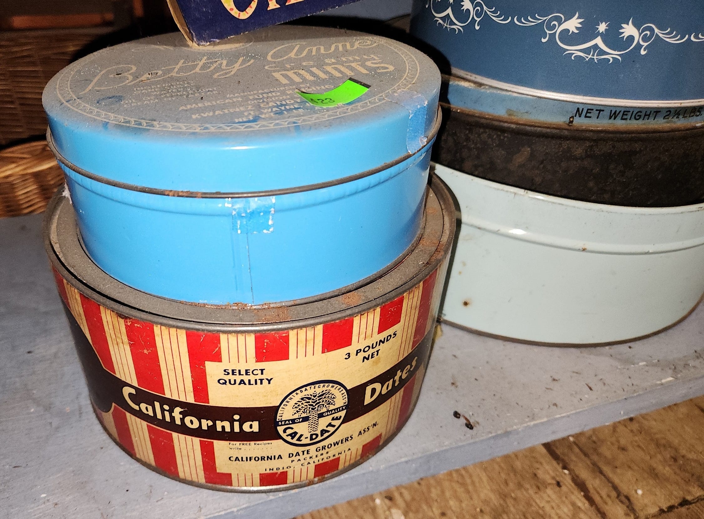 475 Metal bread boxes, hat boxes, picnic basket, tin