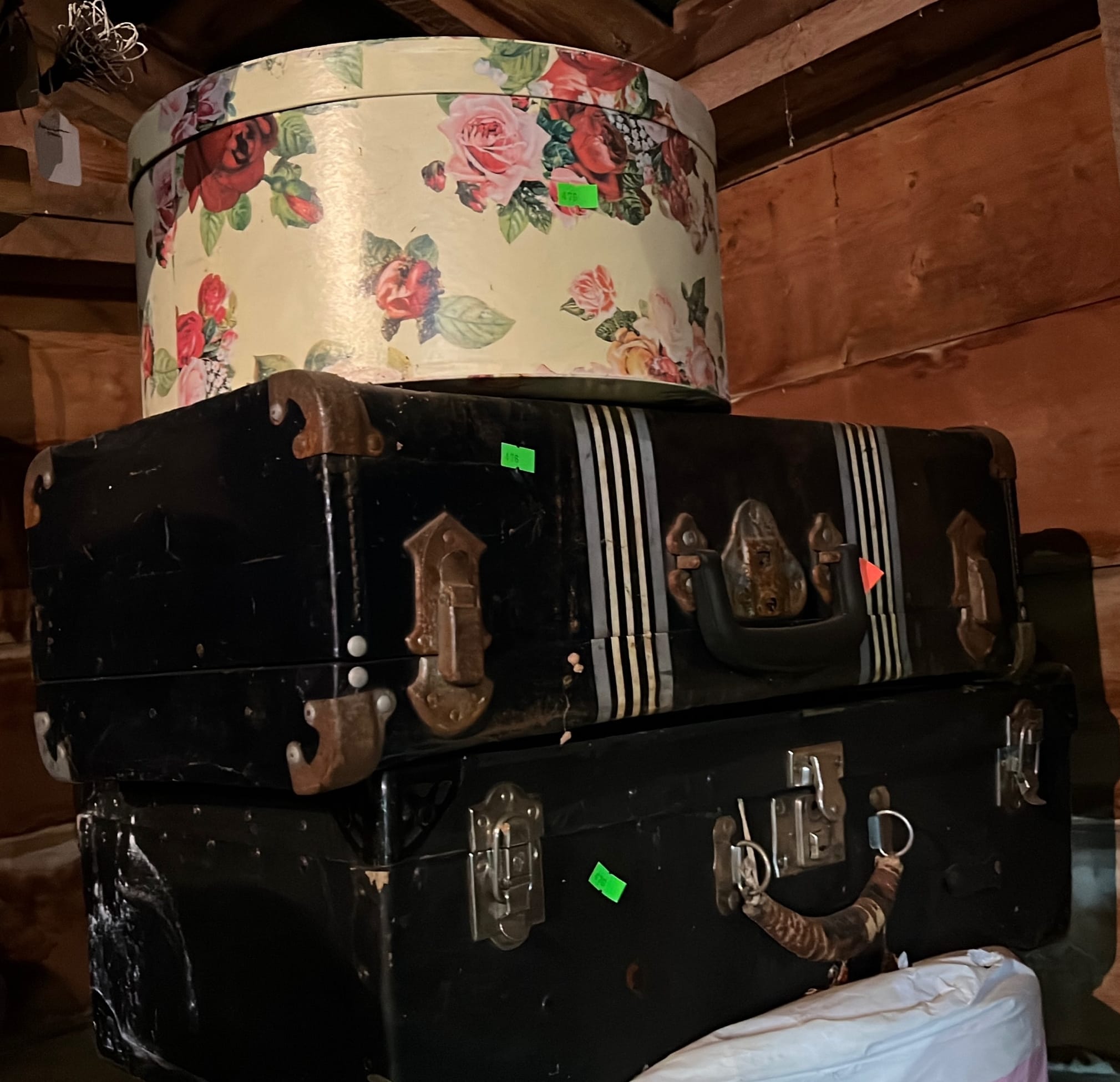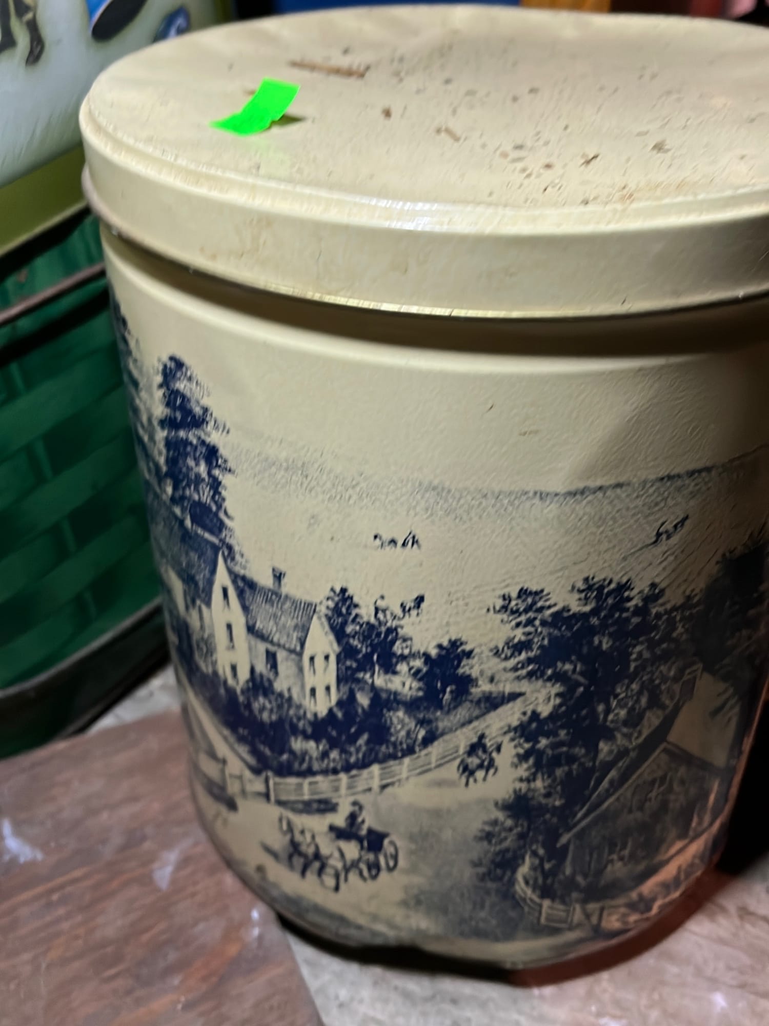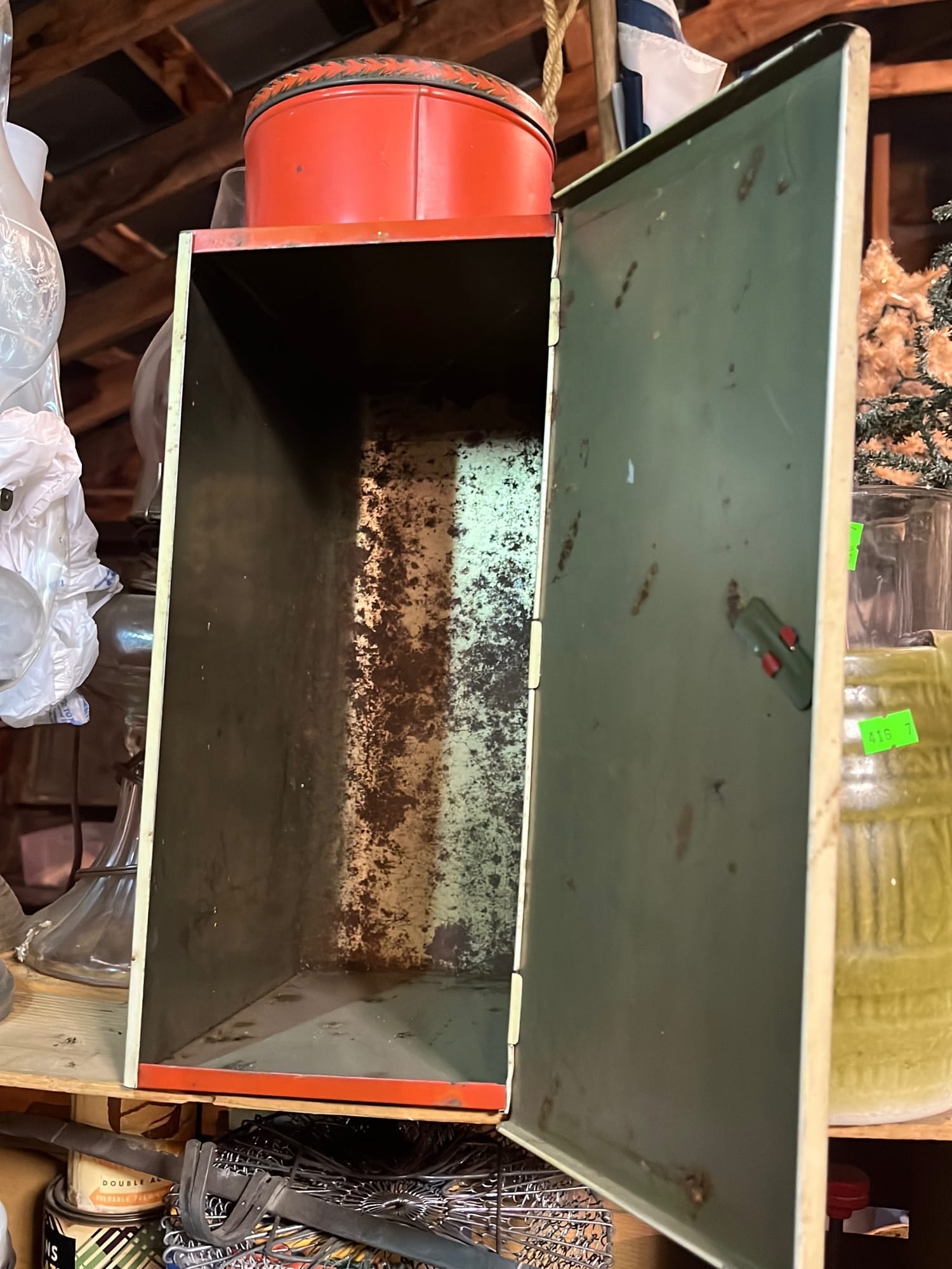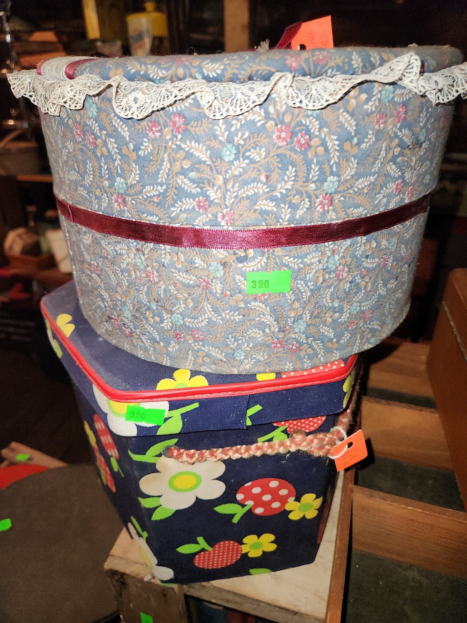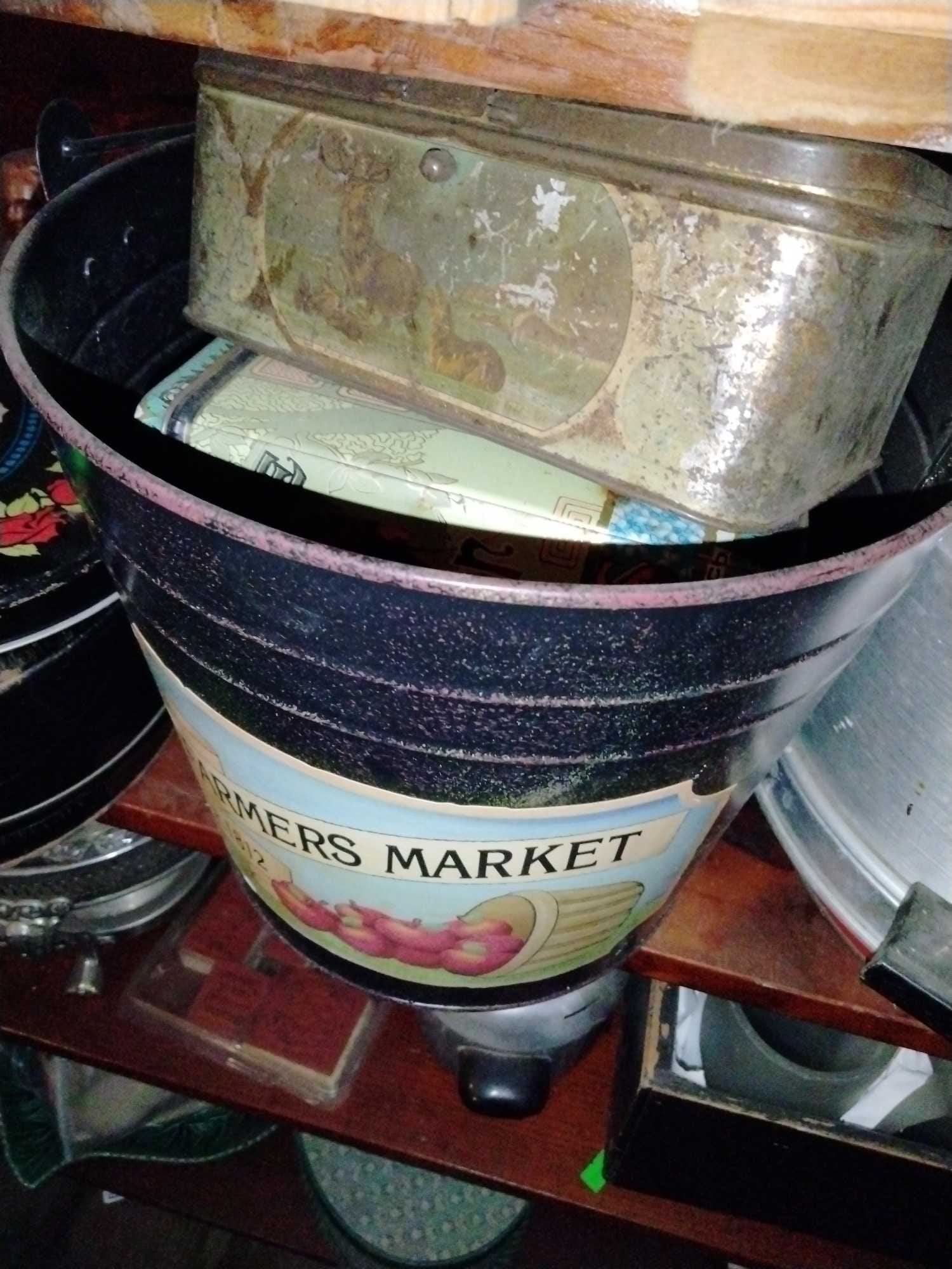 475 Metal bread boxes, hat boxes, picnic basket, tin
