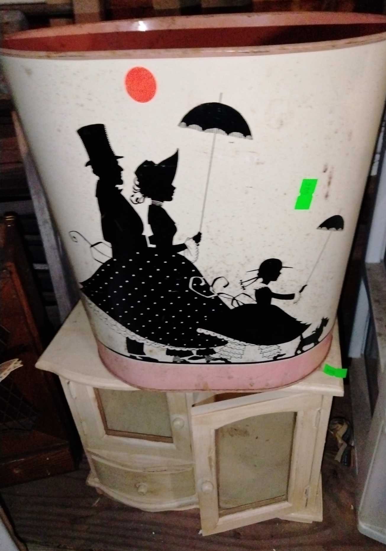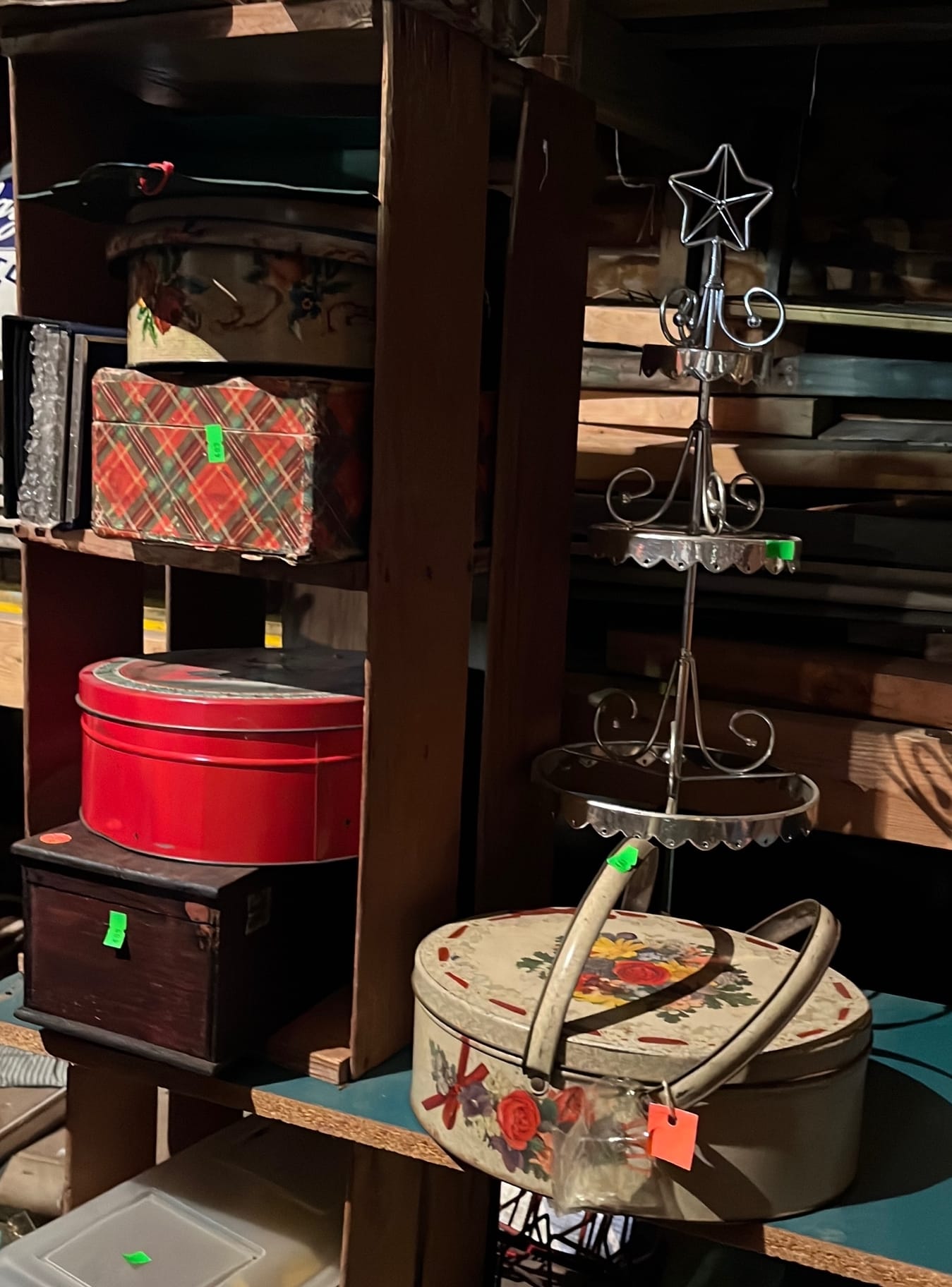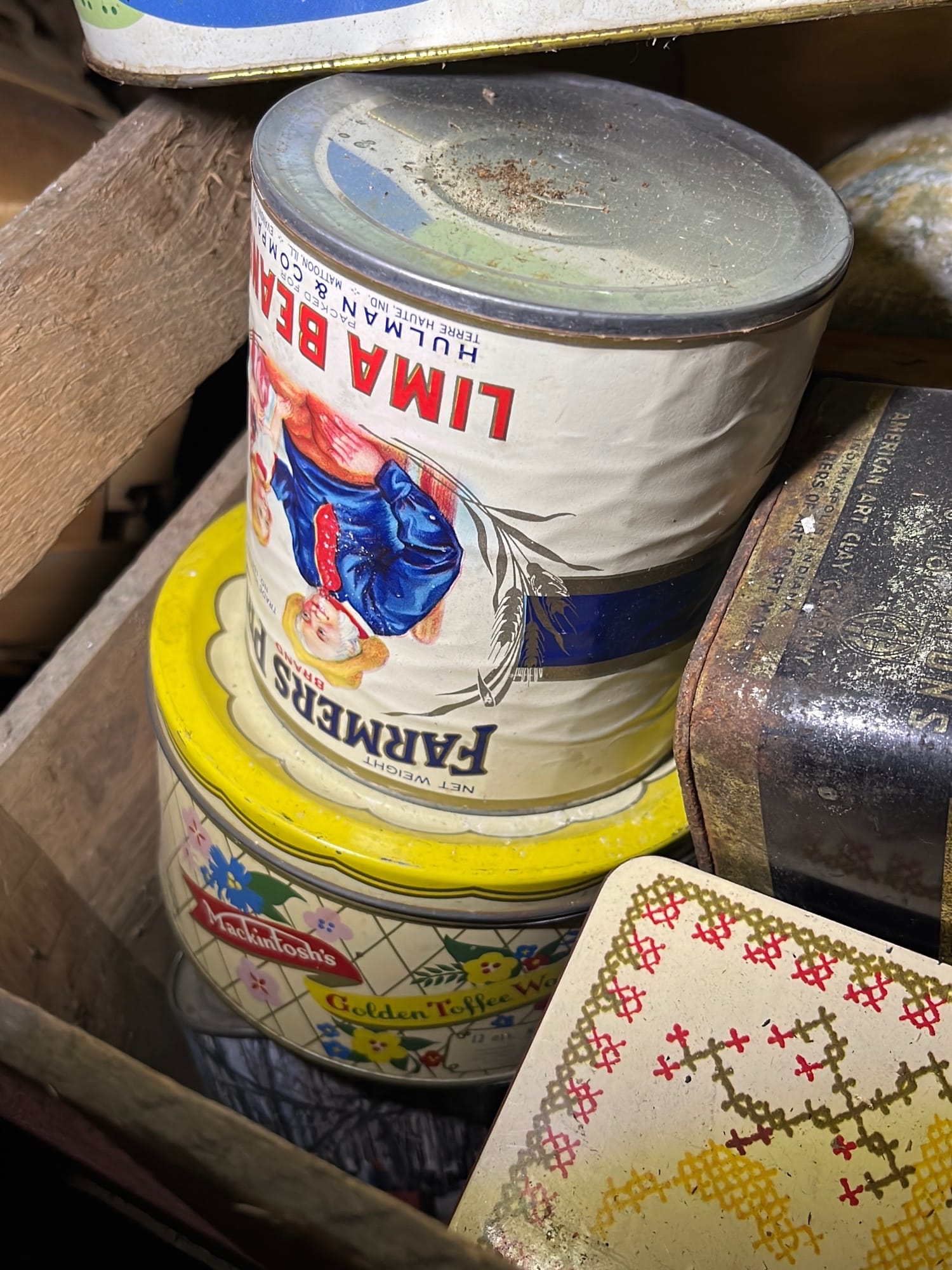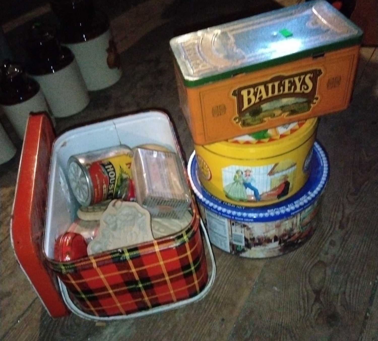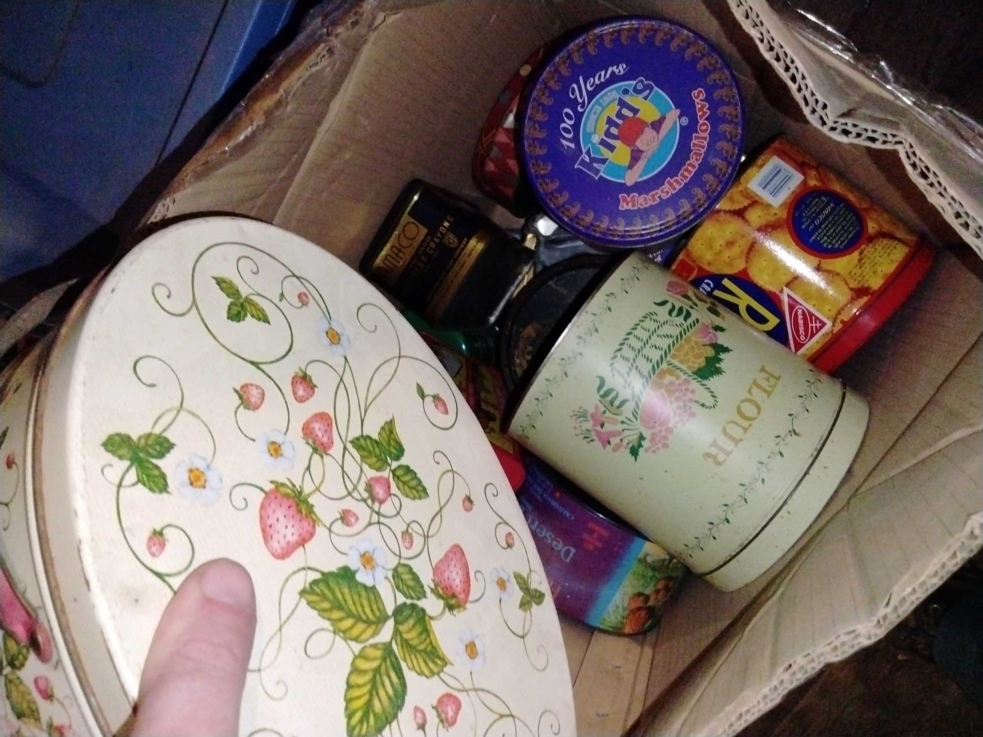 475 Metal bread boxes, hat boxes, picnic basket, tin