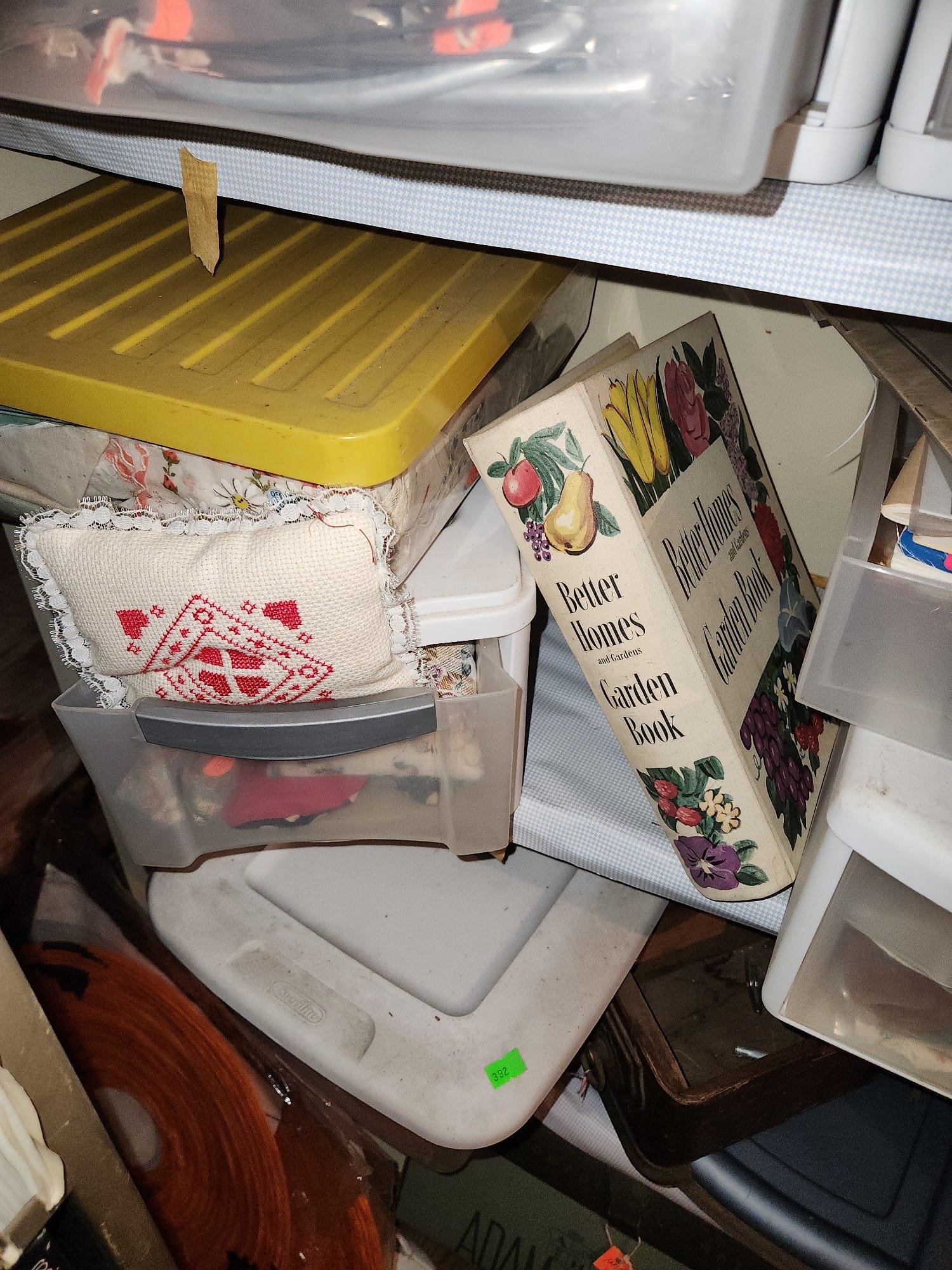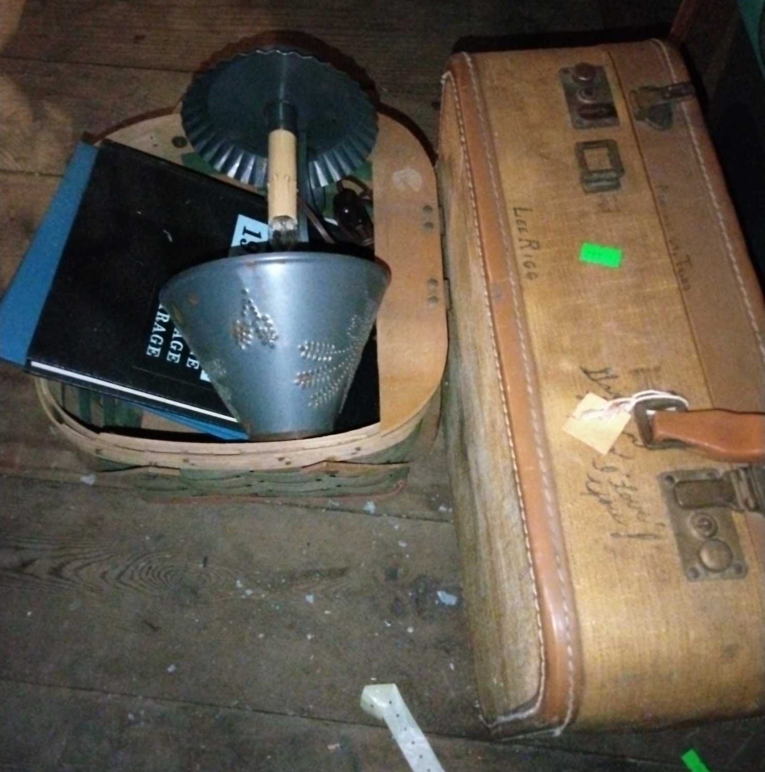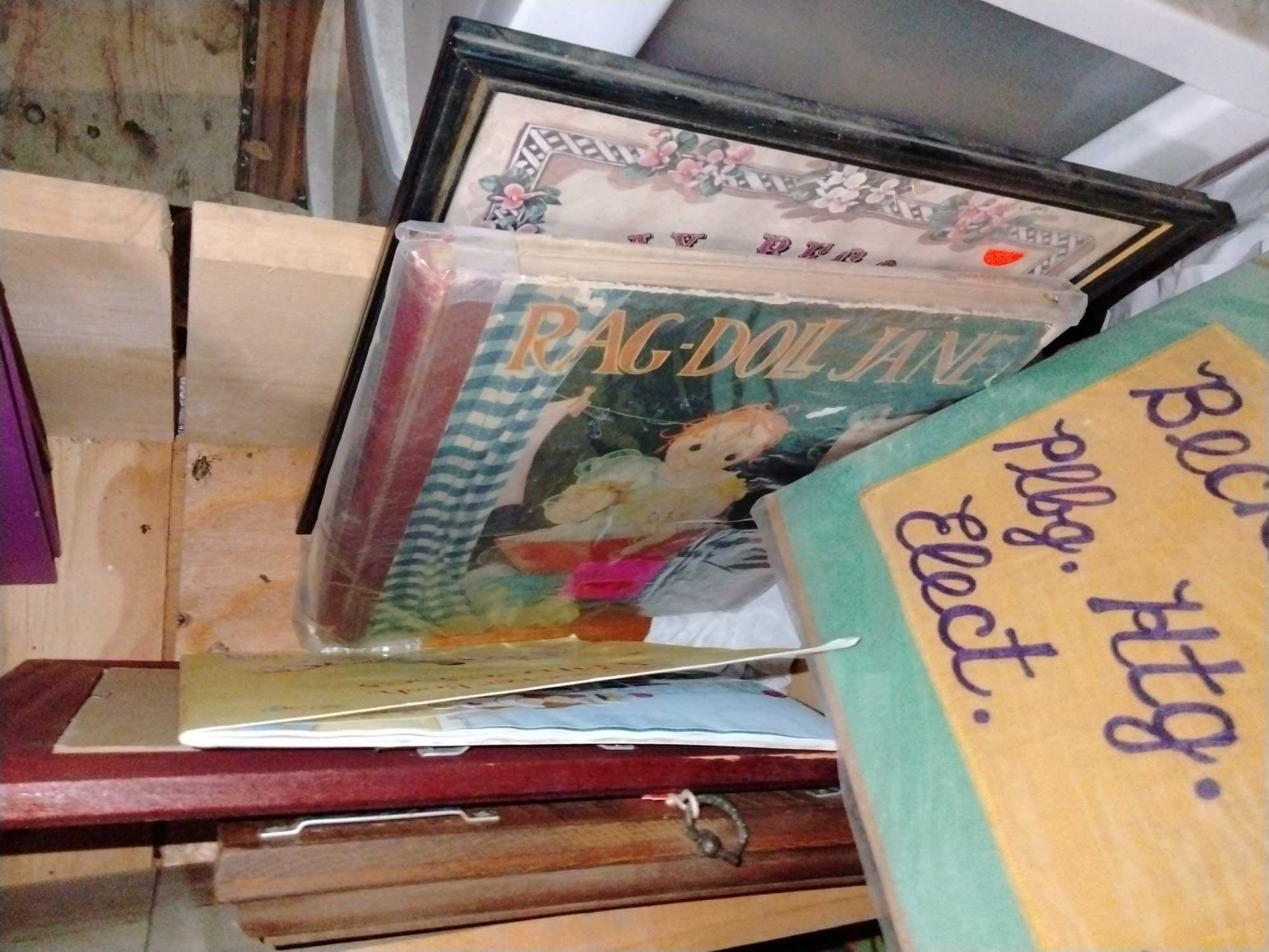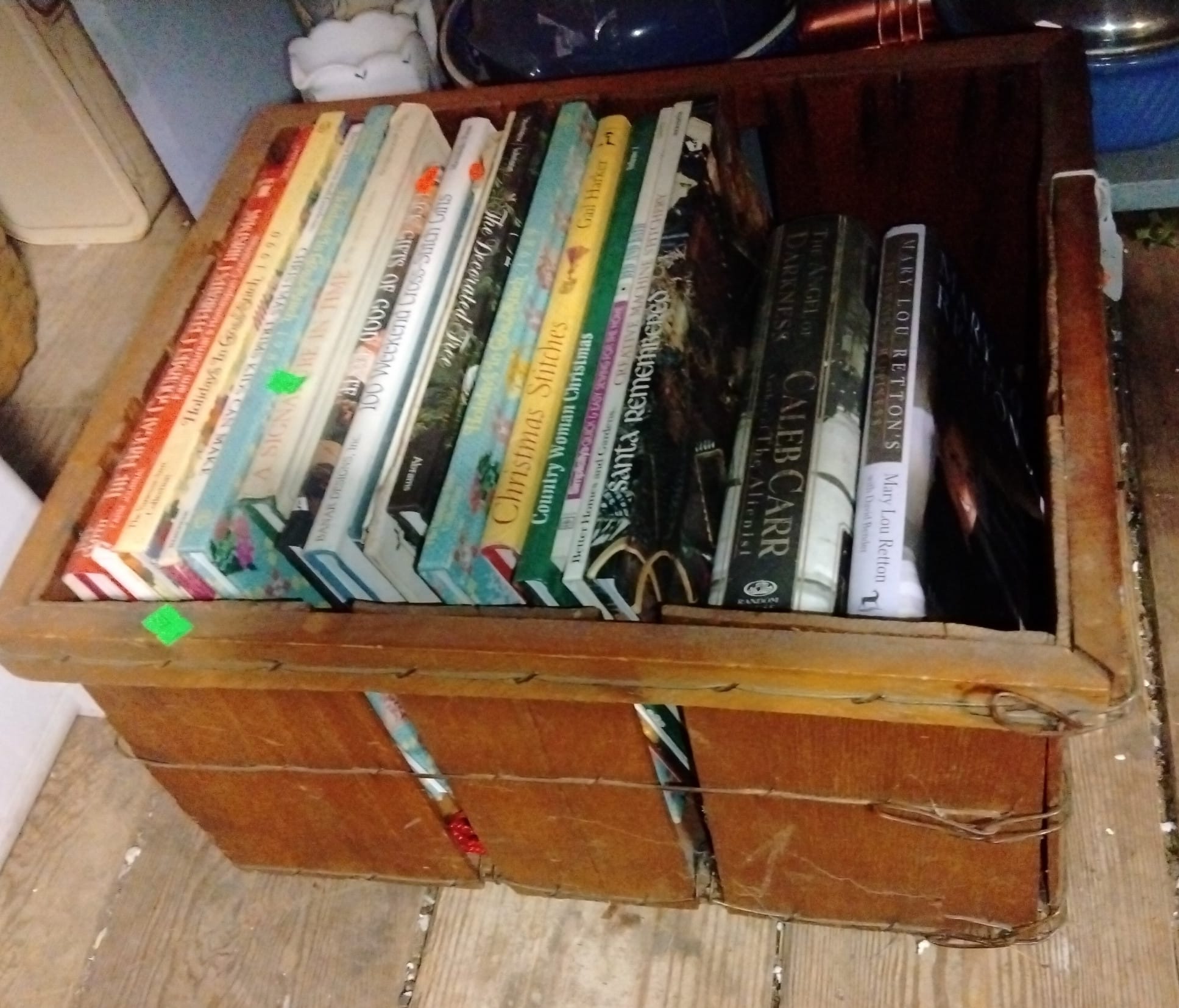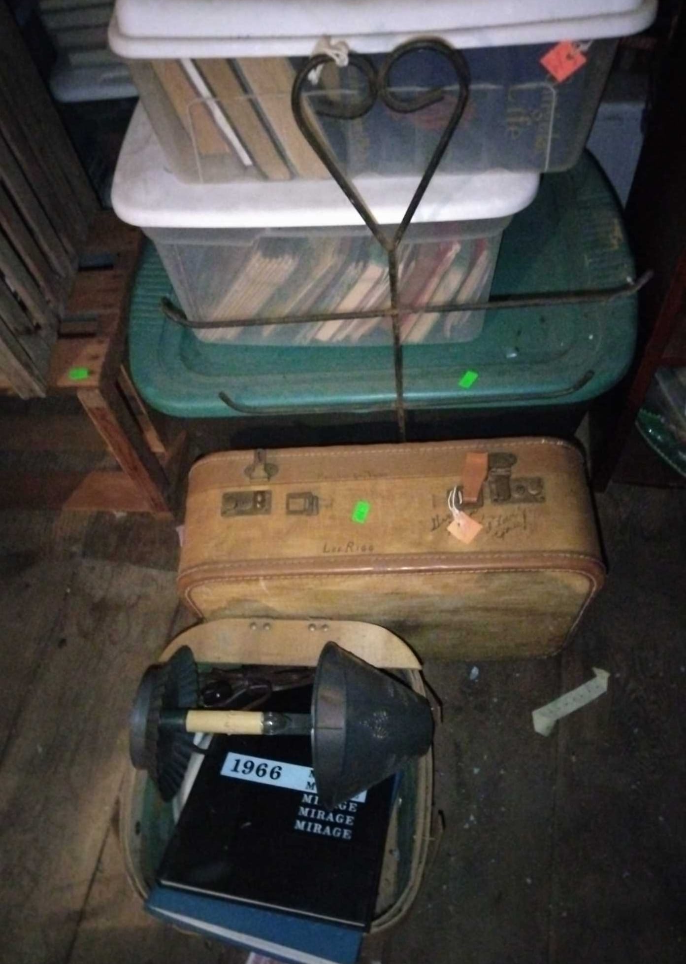 203 Books, suitcase, hanging rack, lamp, picnic basket