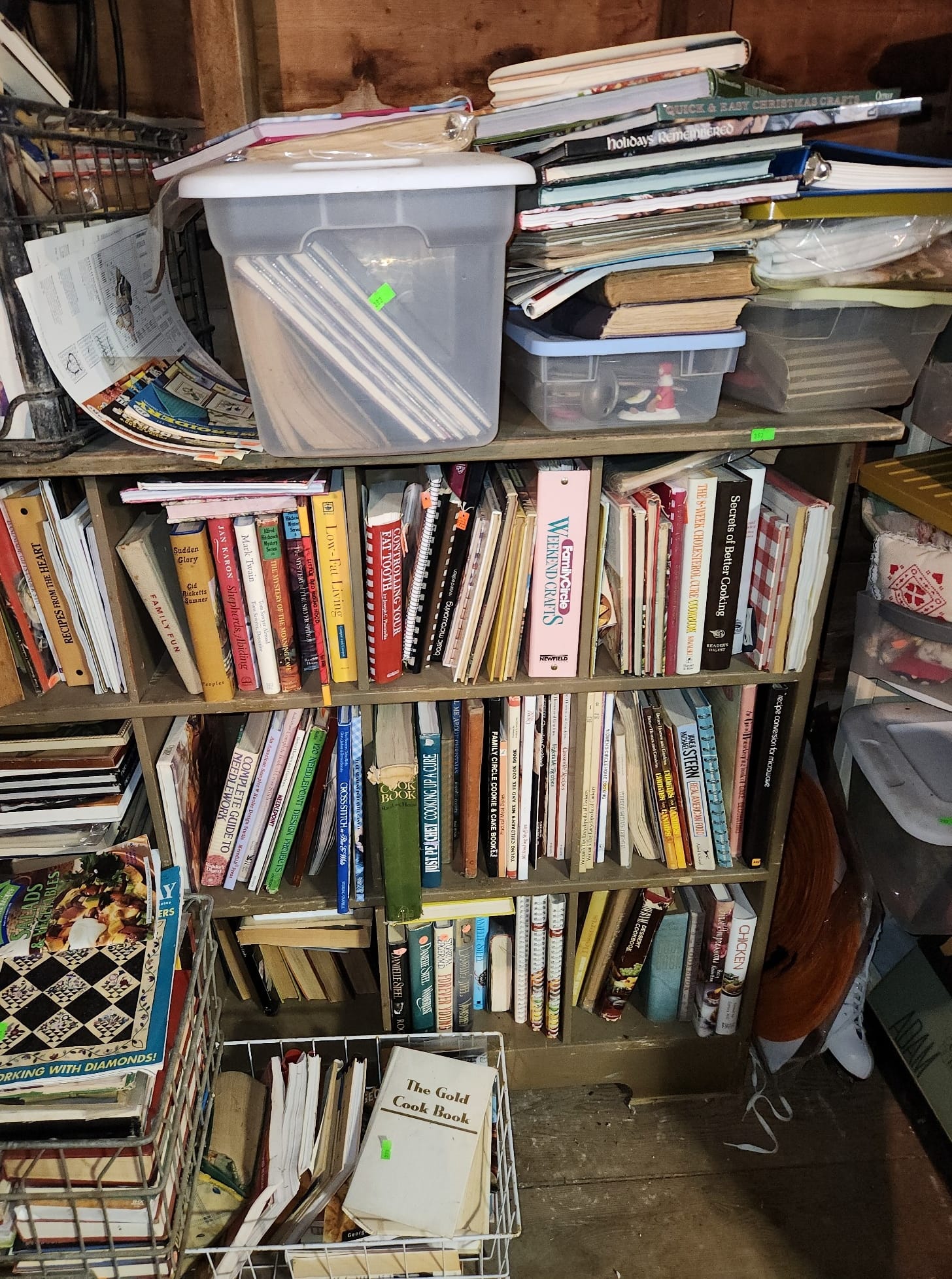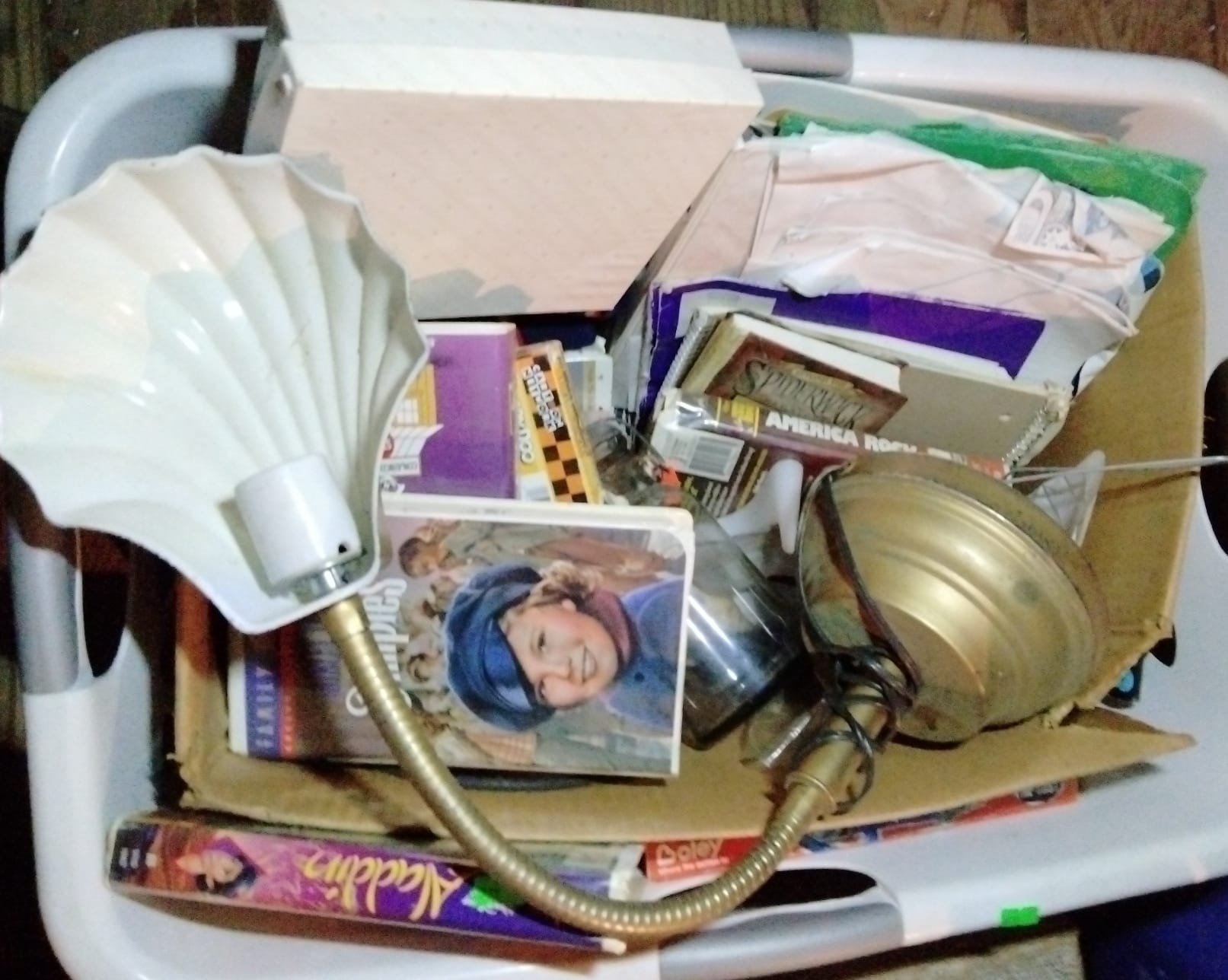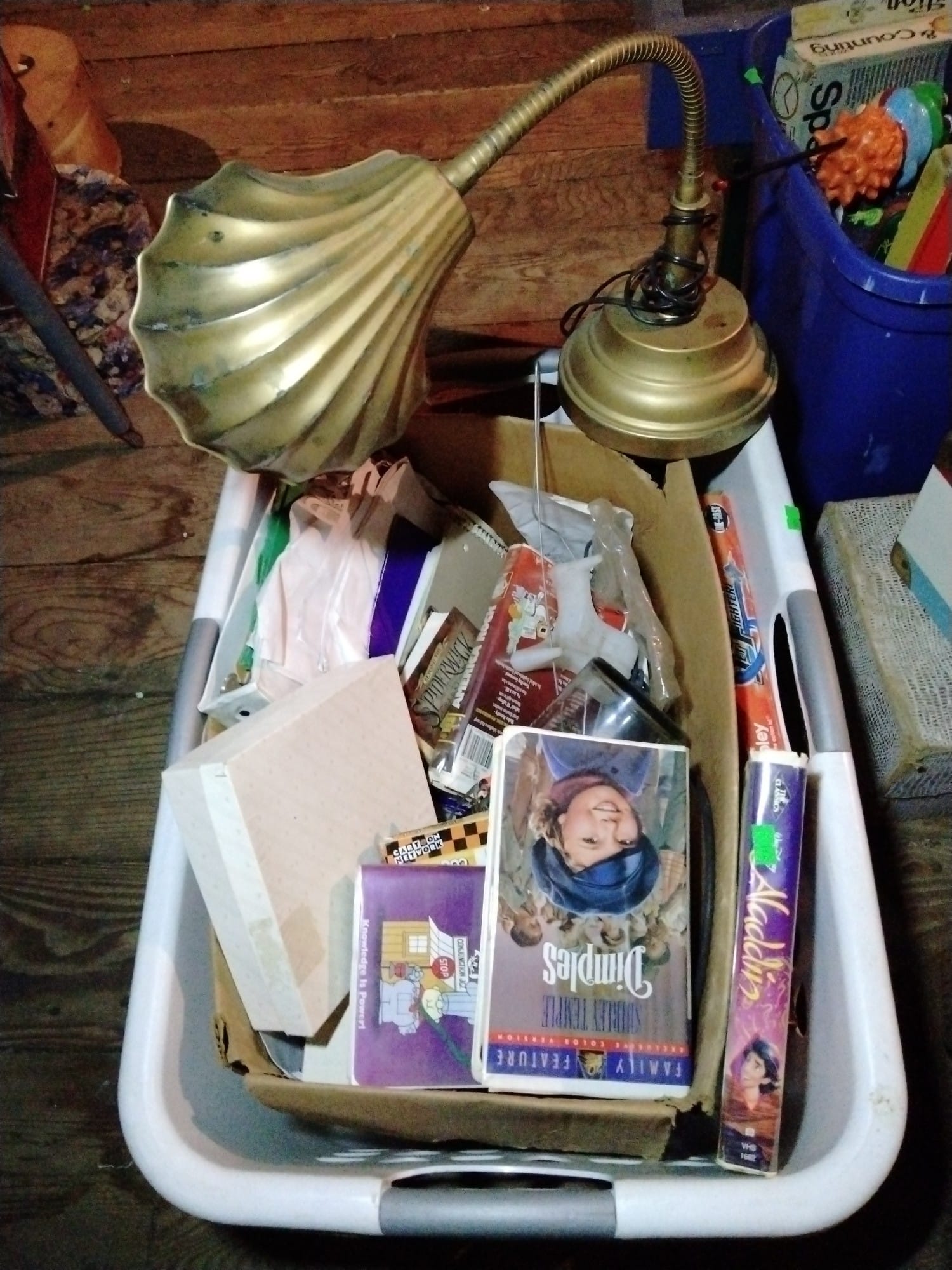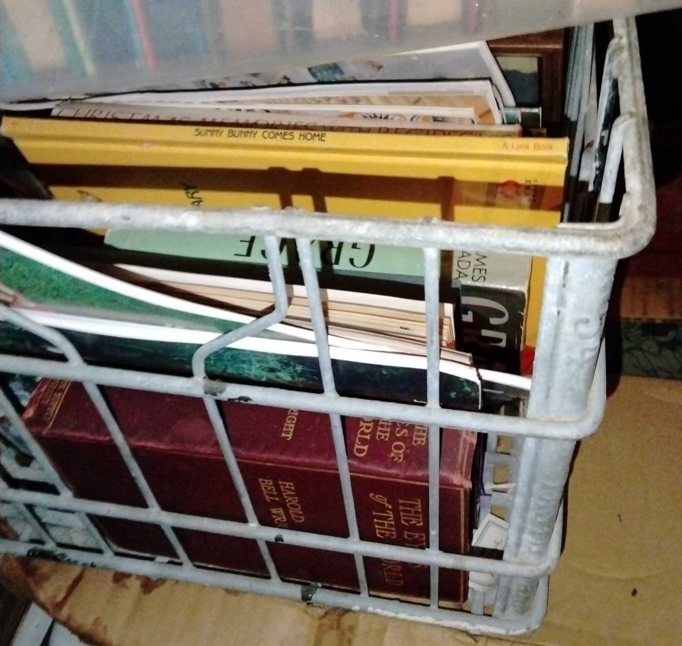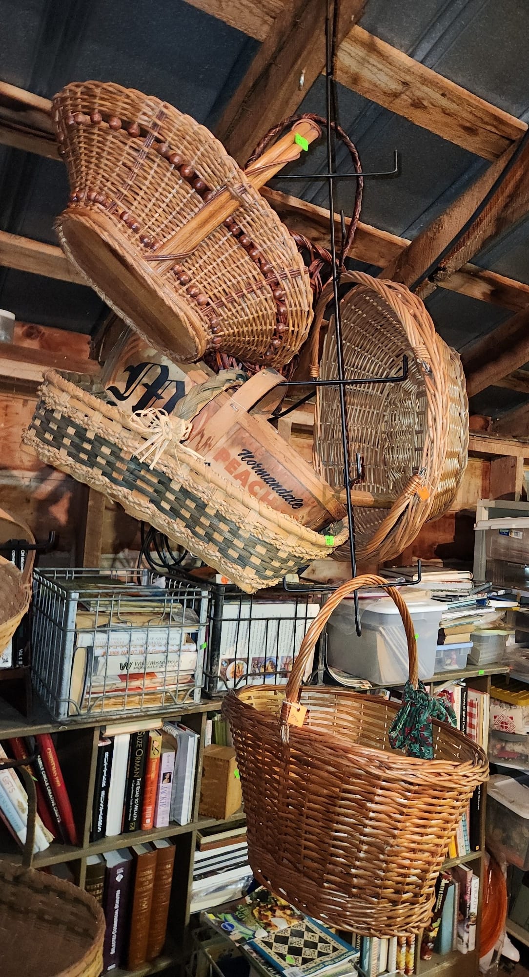 203 Books, suitcase, hanging rack, lamp, picnic basket
