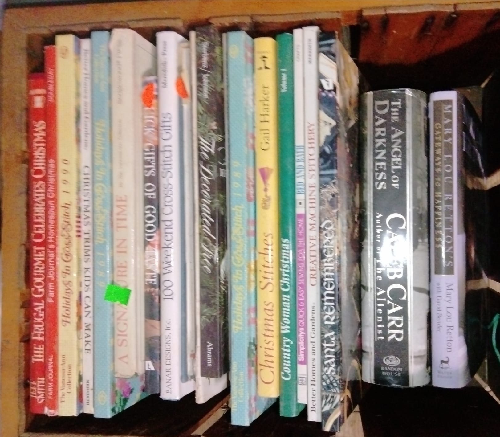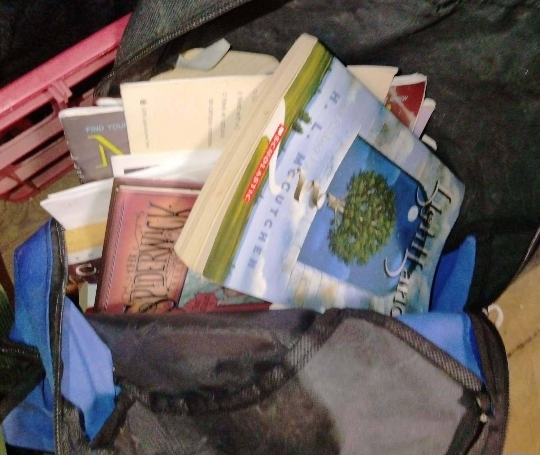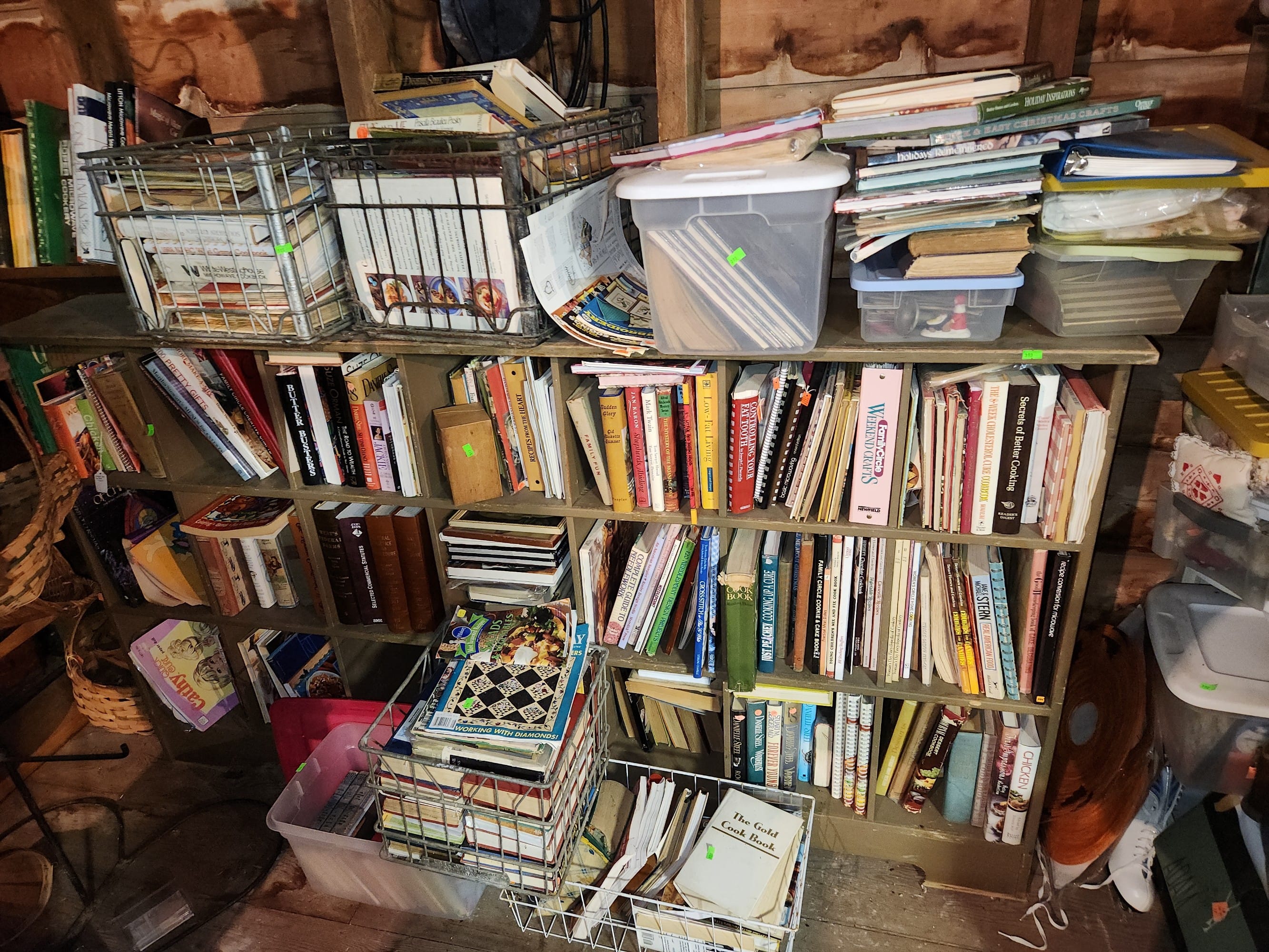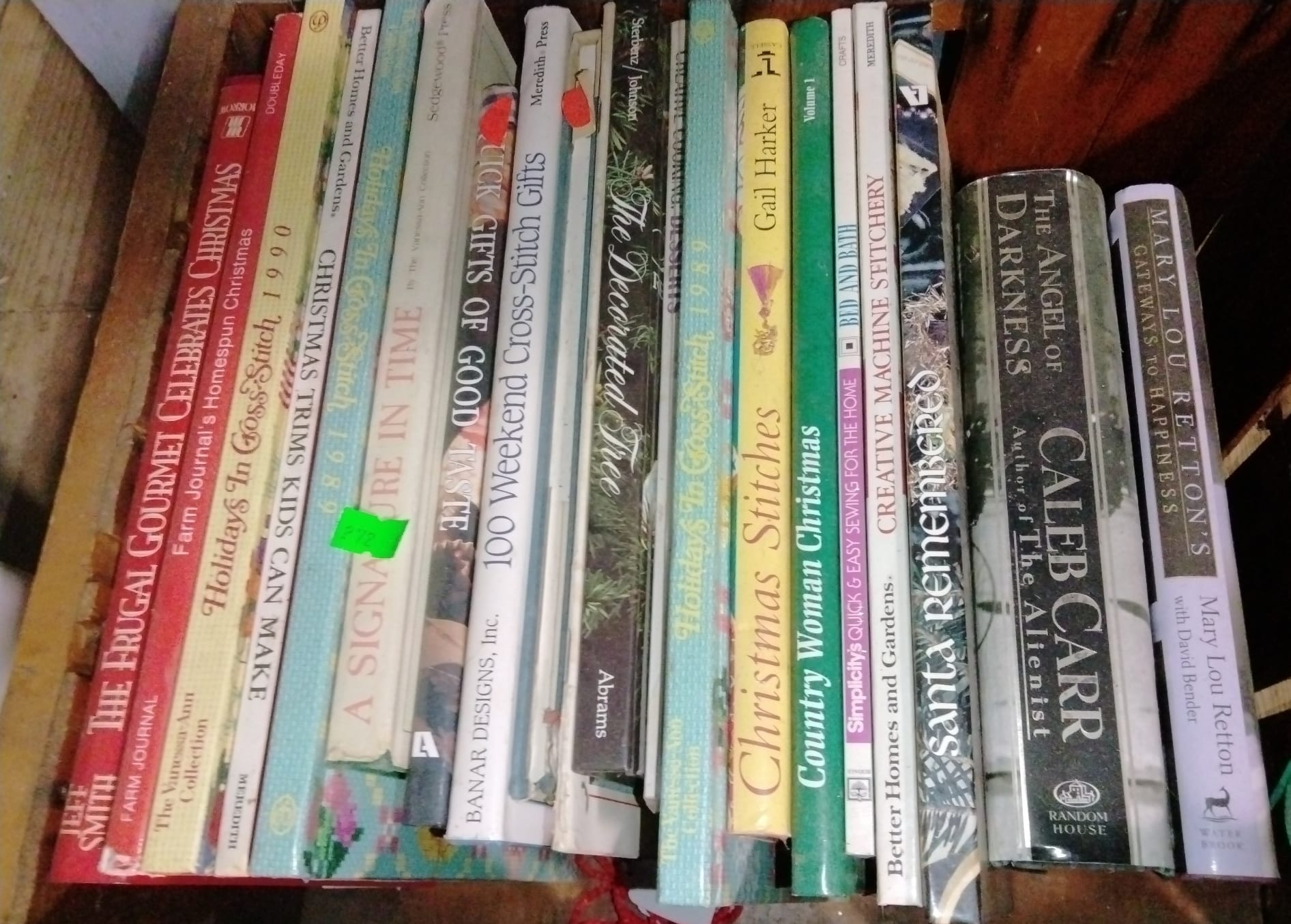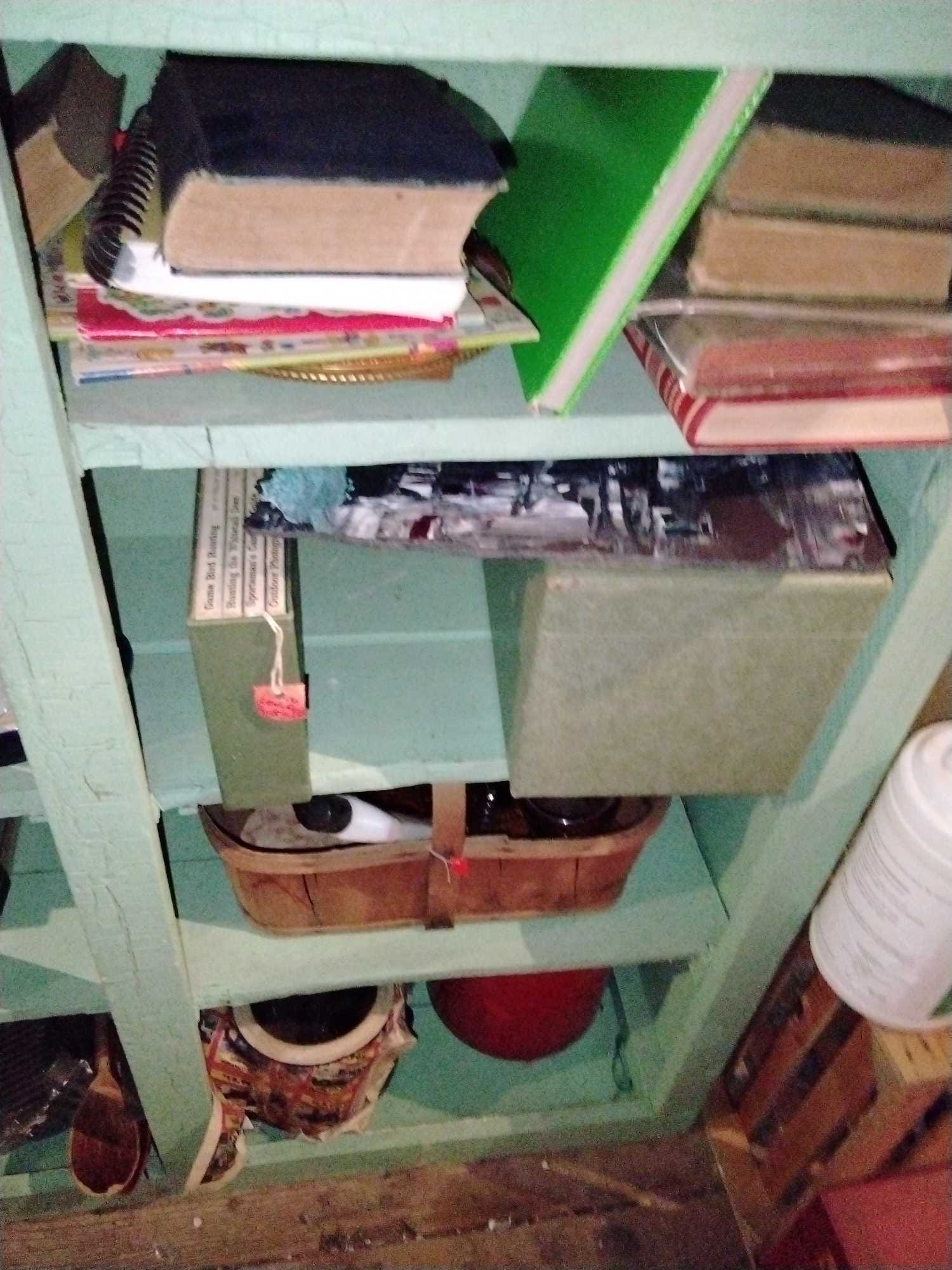 203 Books, suitcase, hanging rack, lamp, picnic basket