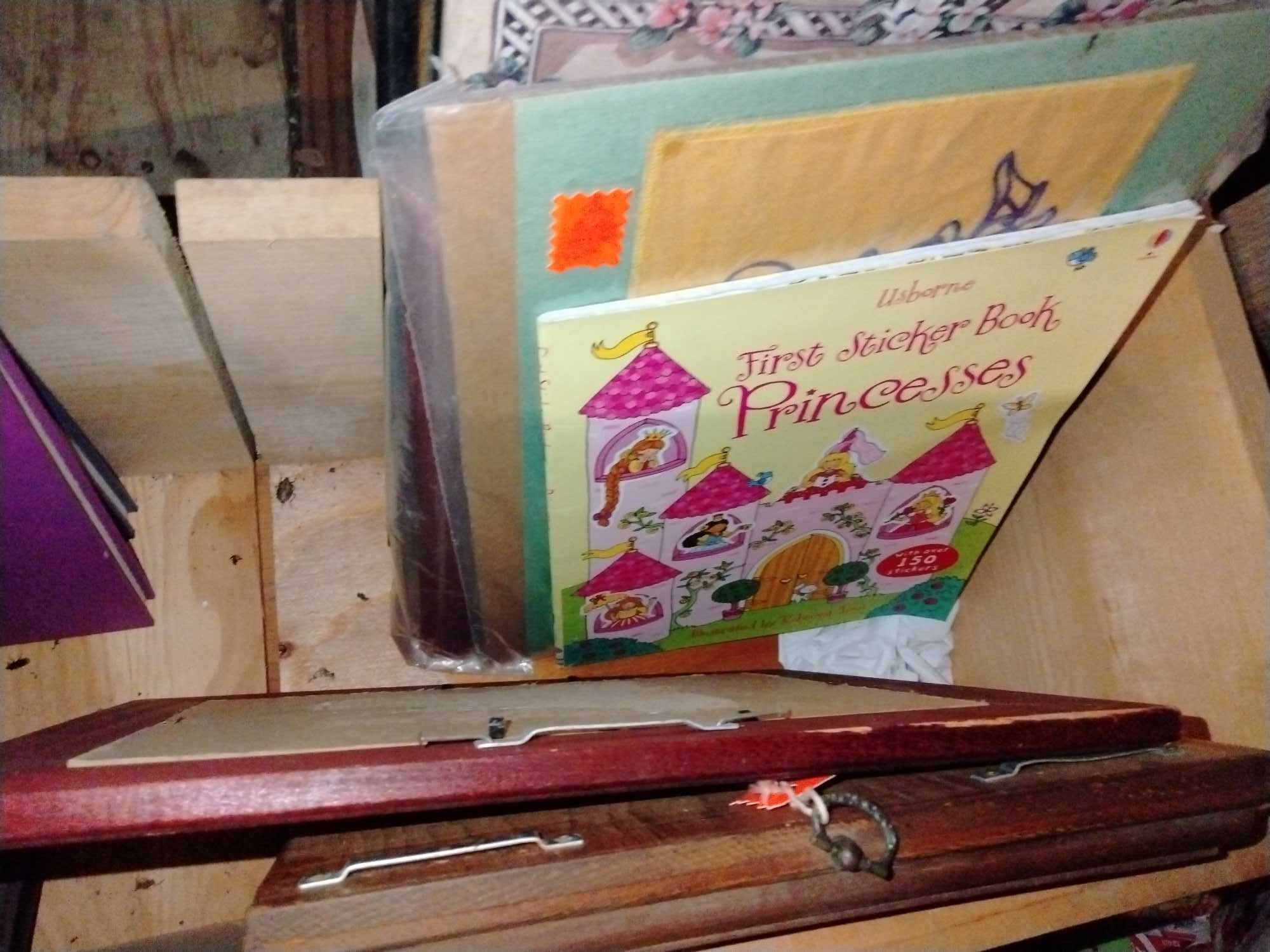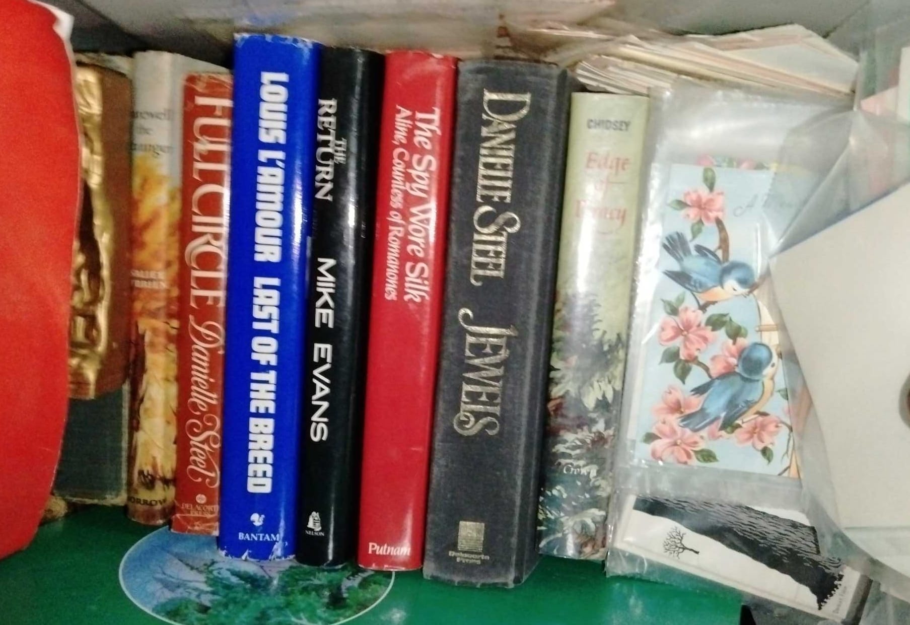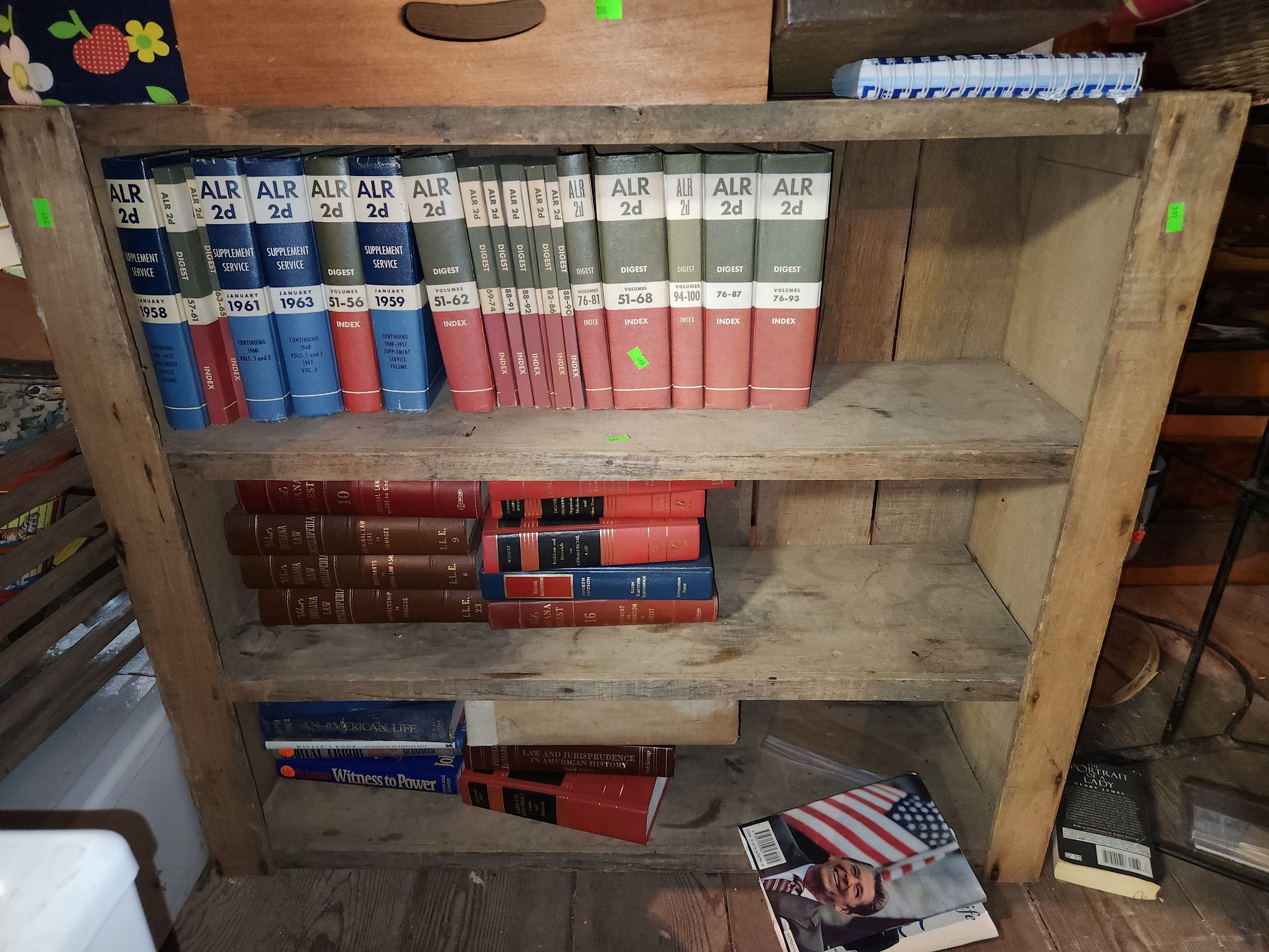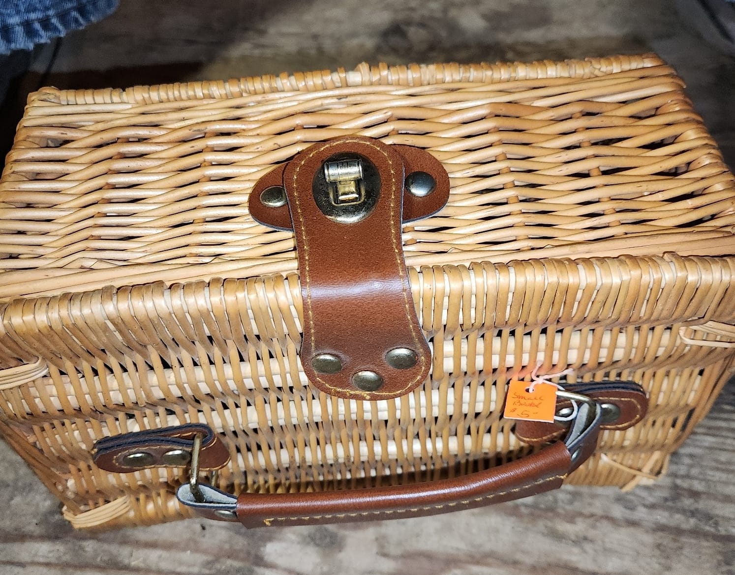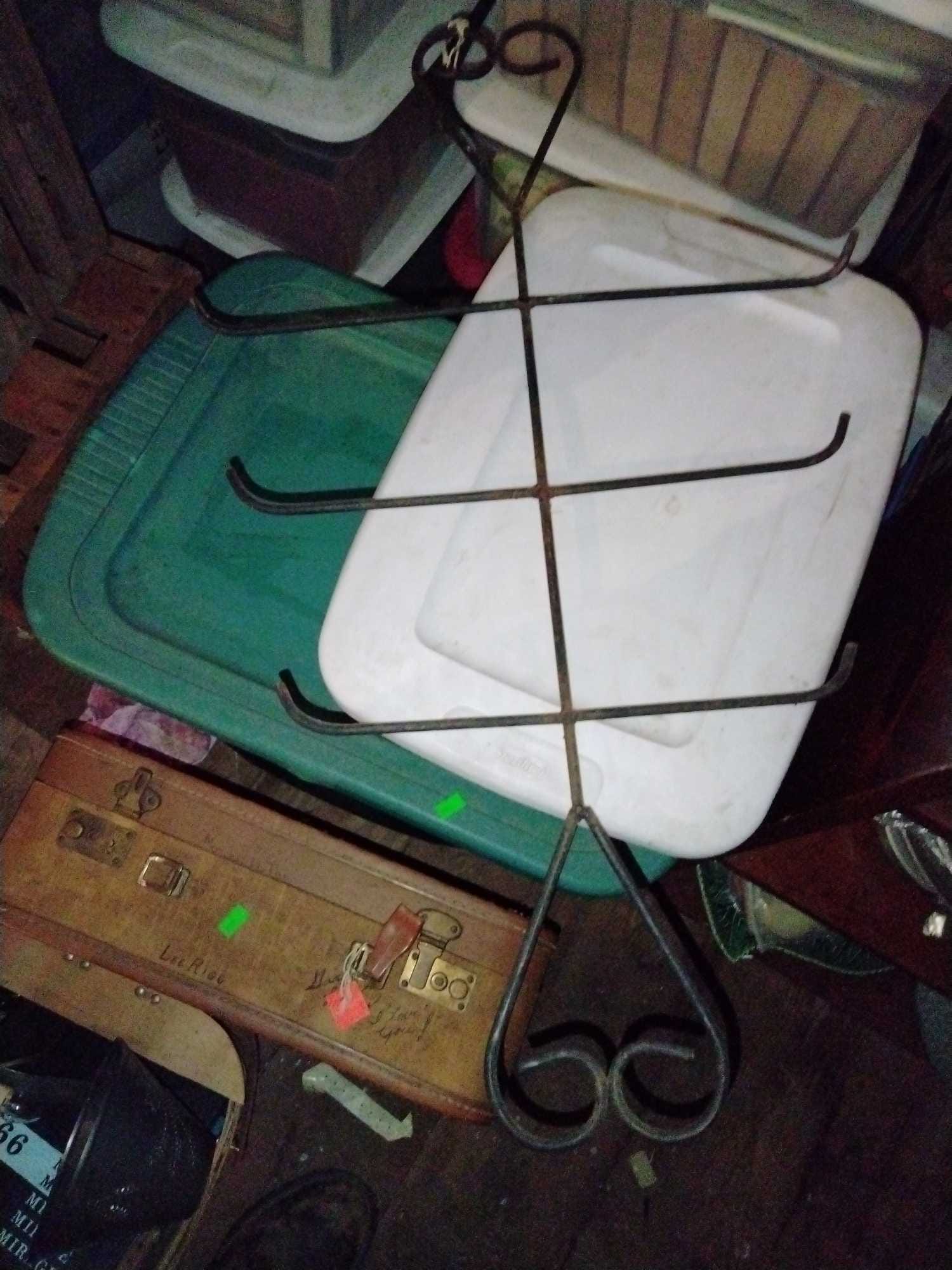 203 Books, suitcase, hanging rack, lamp, picnic basket