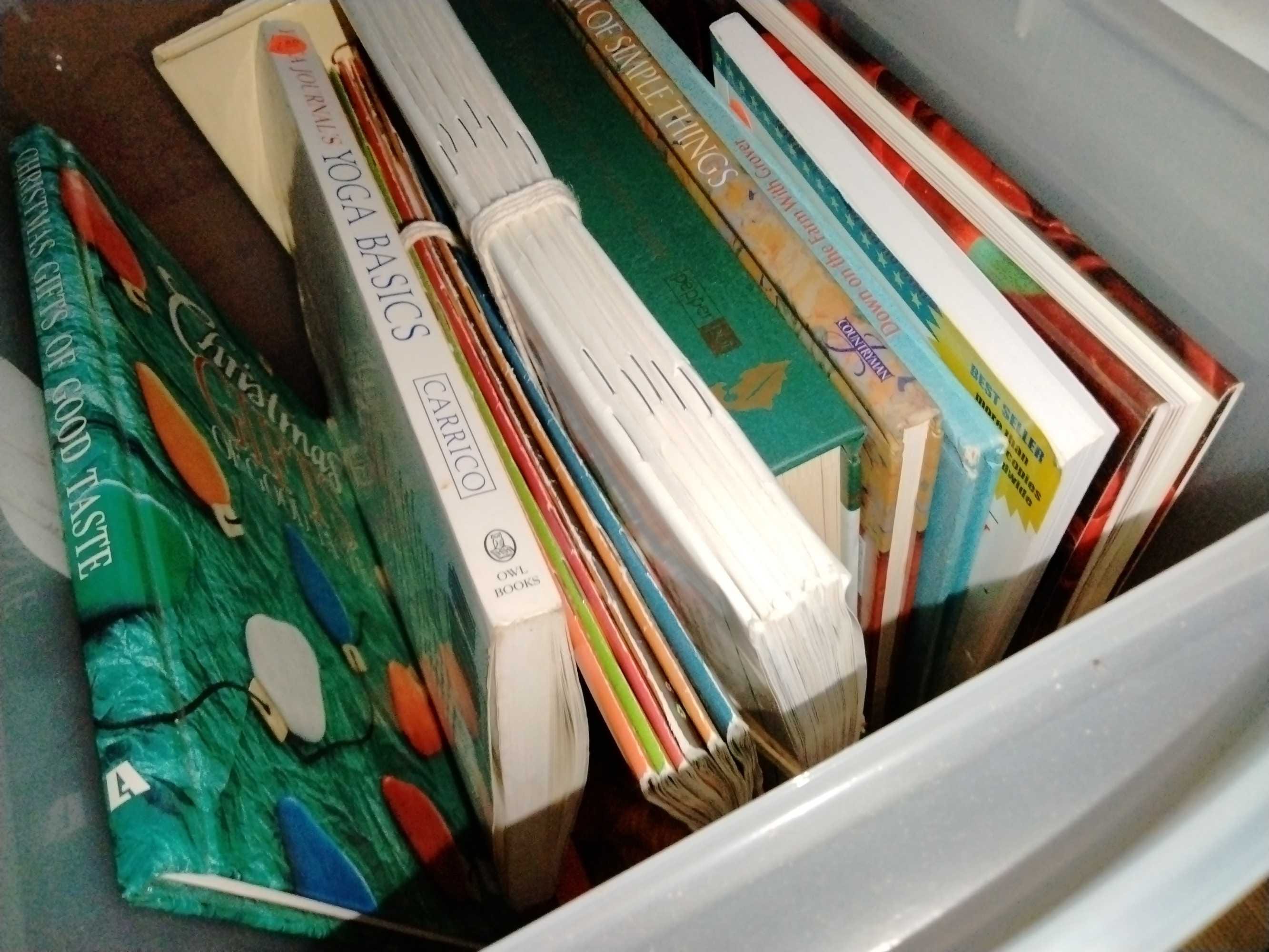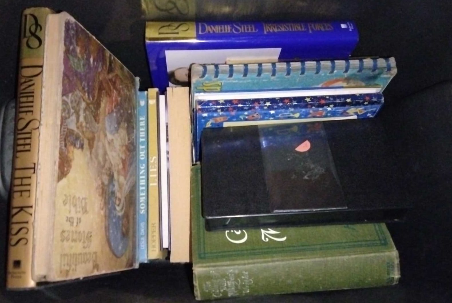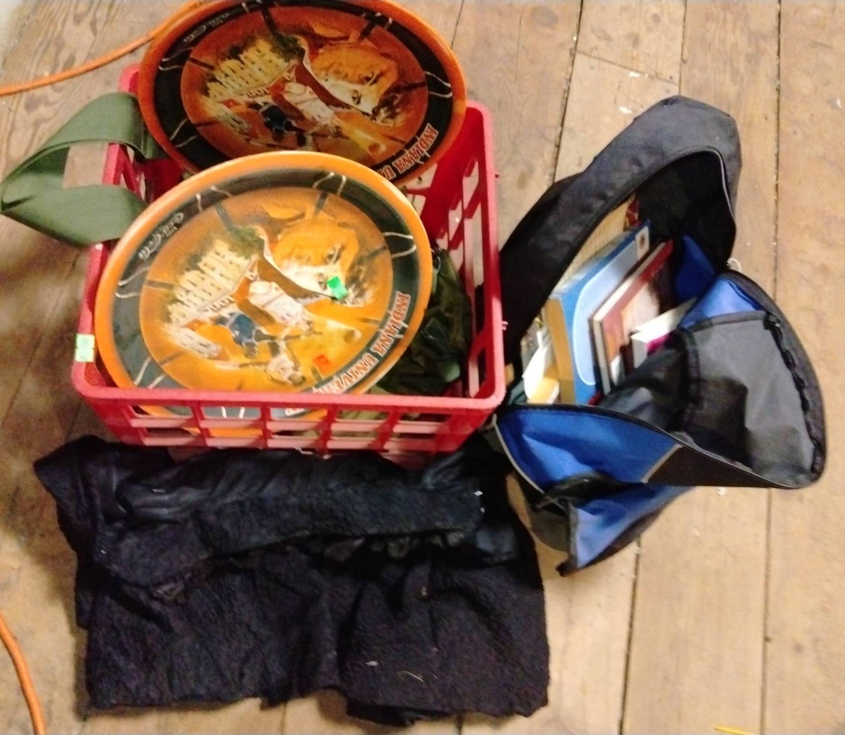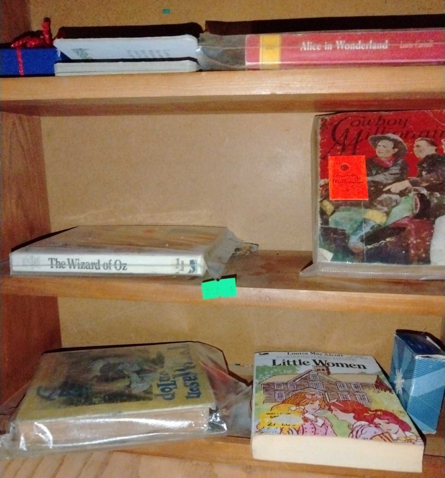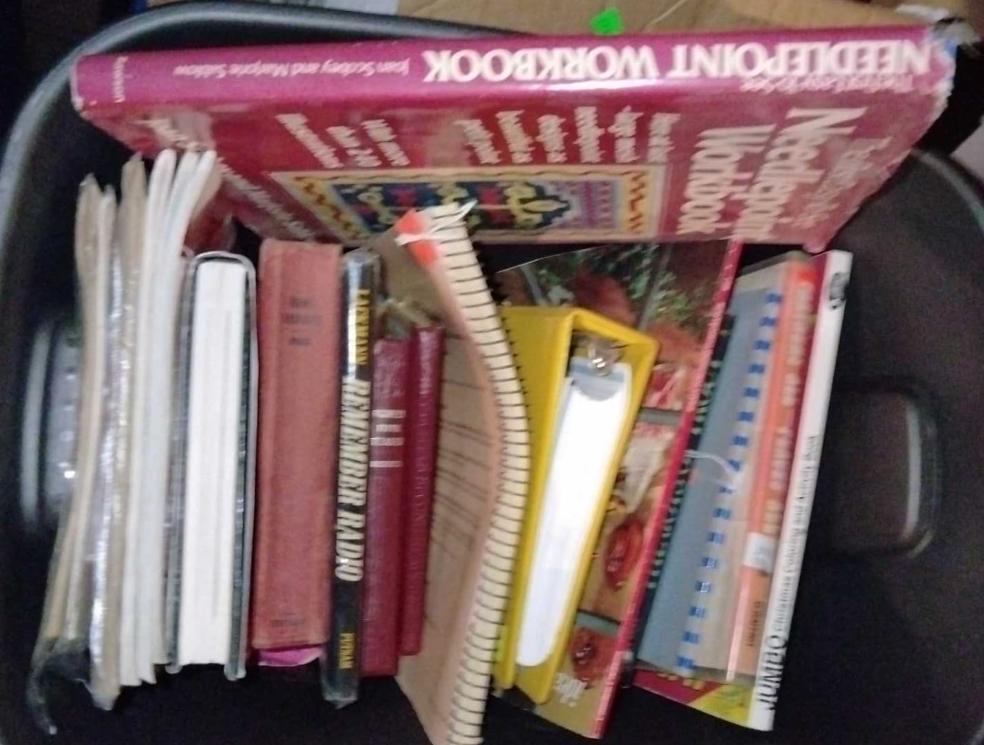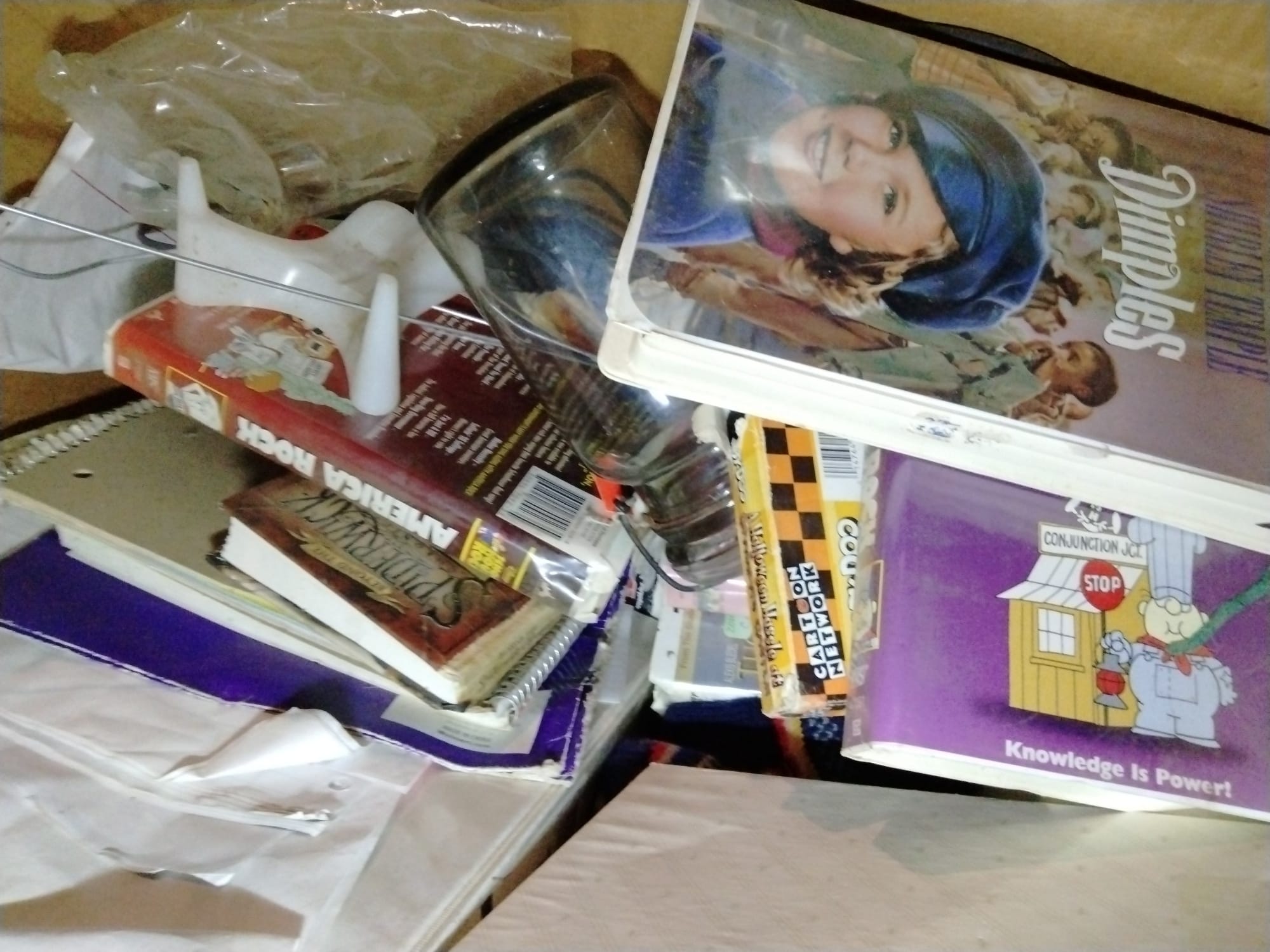 203 Books, suitcase, hanging rack, lamp, picnic basket