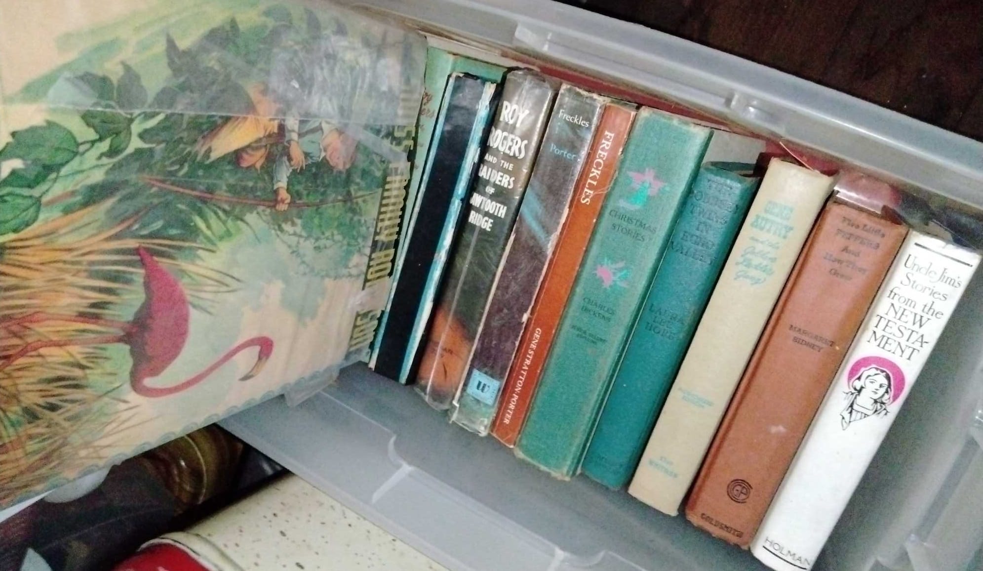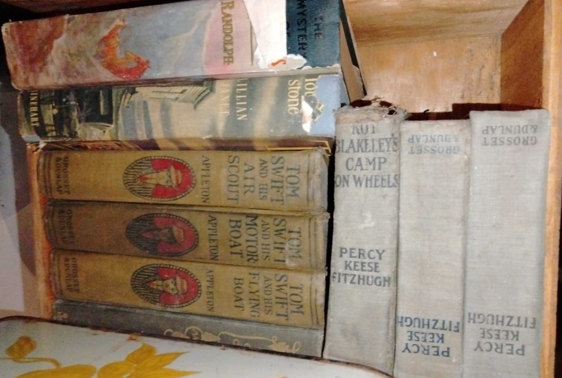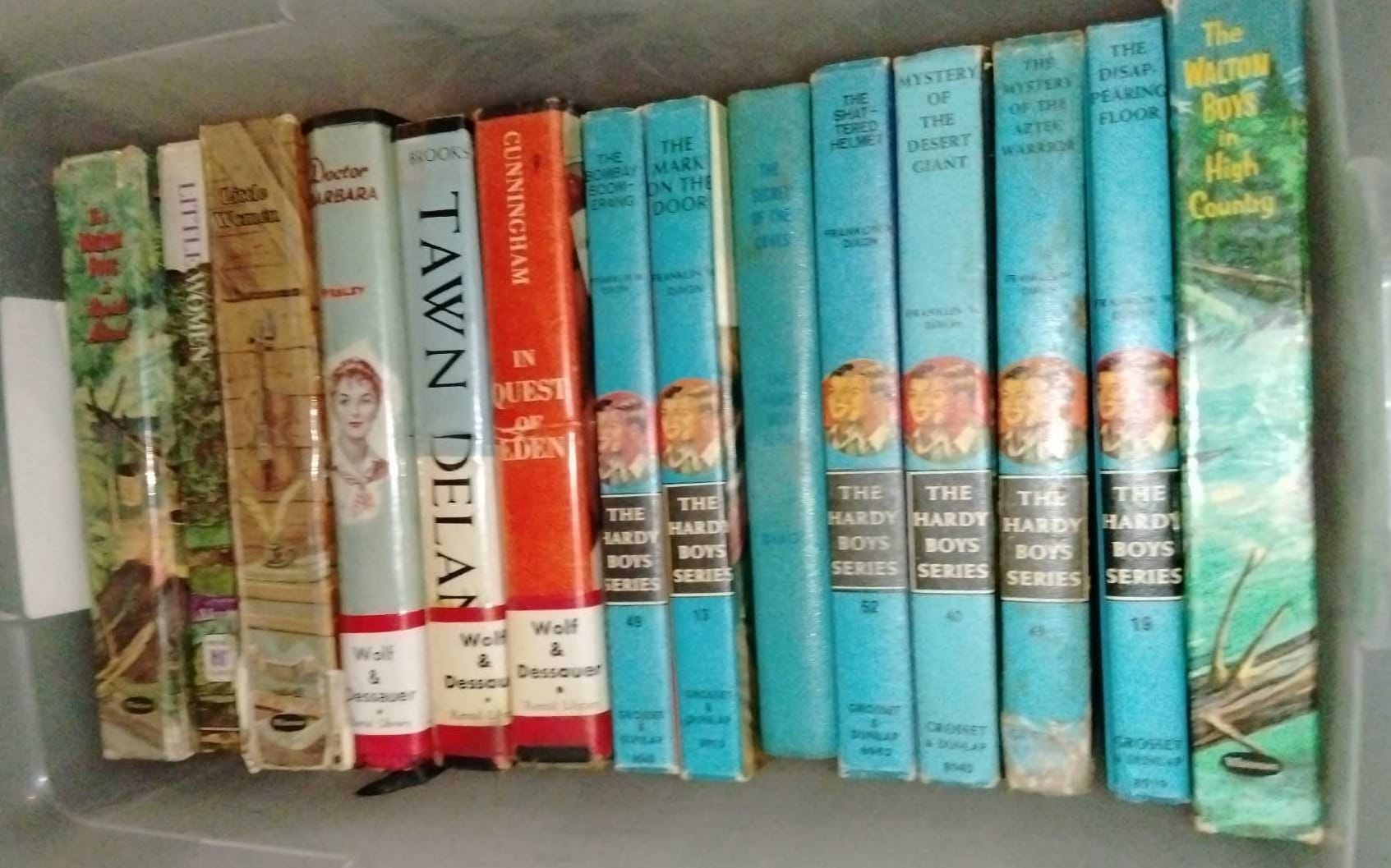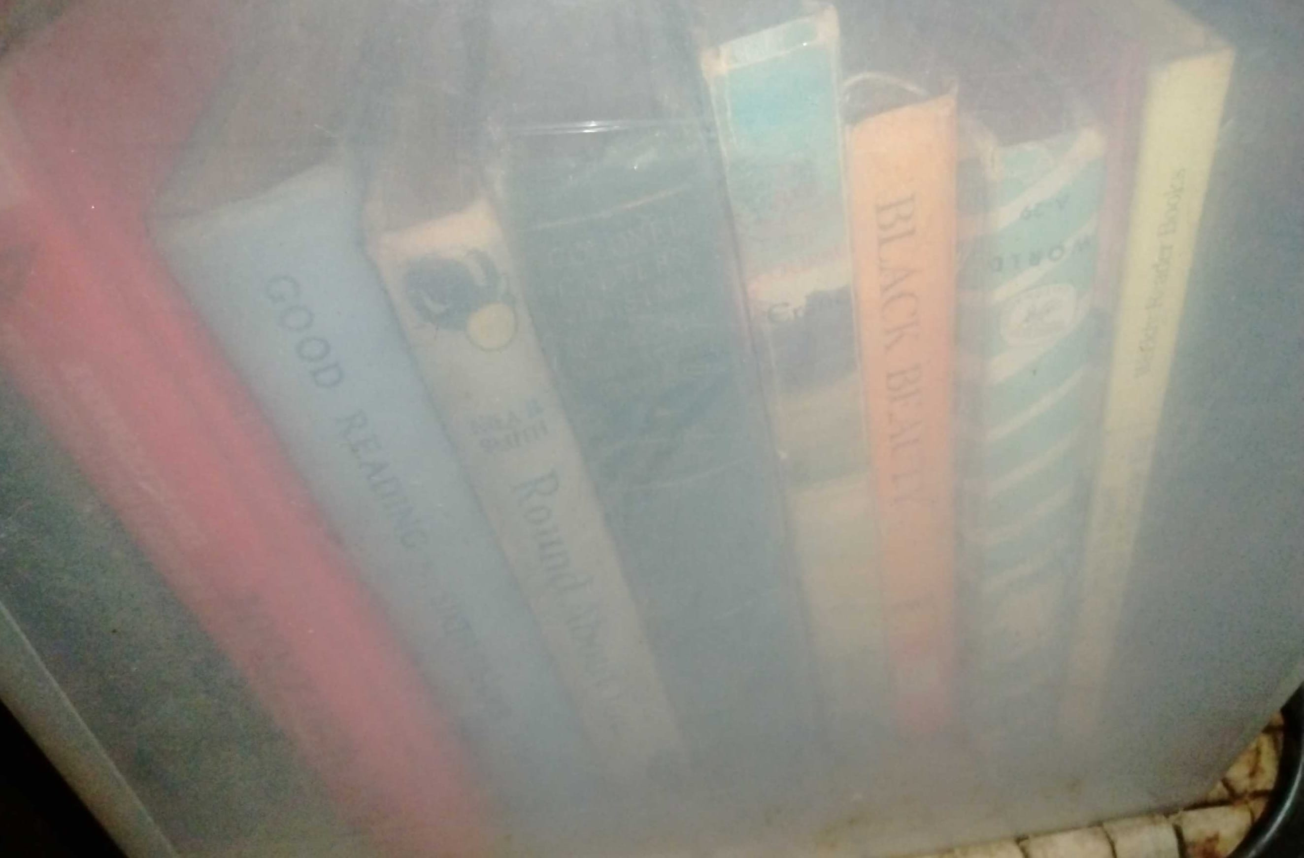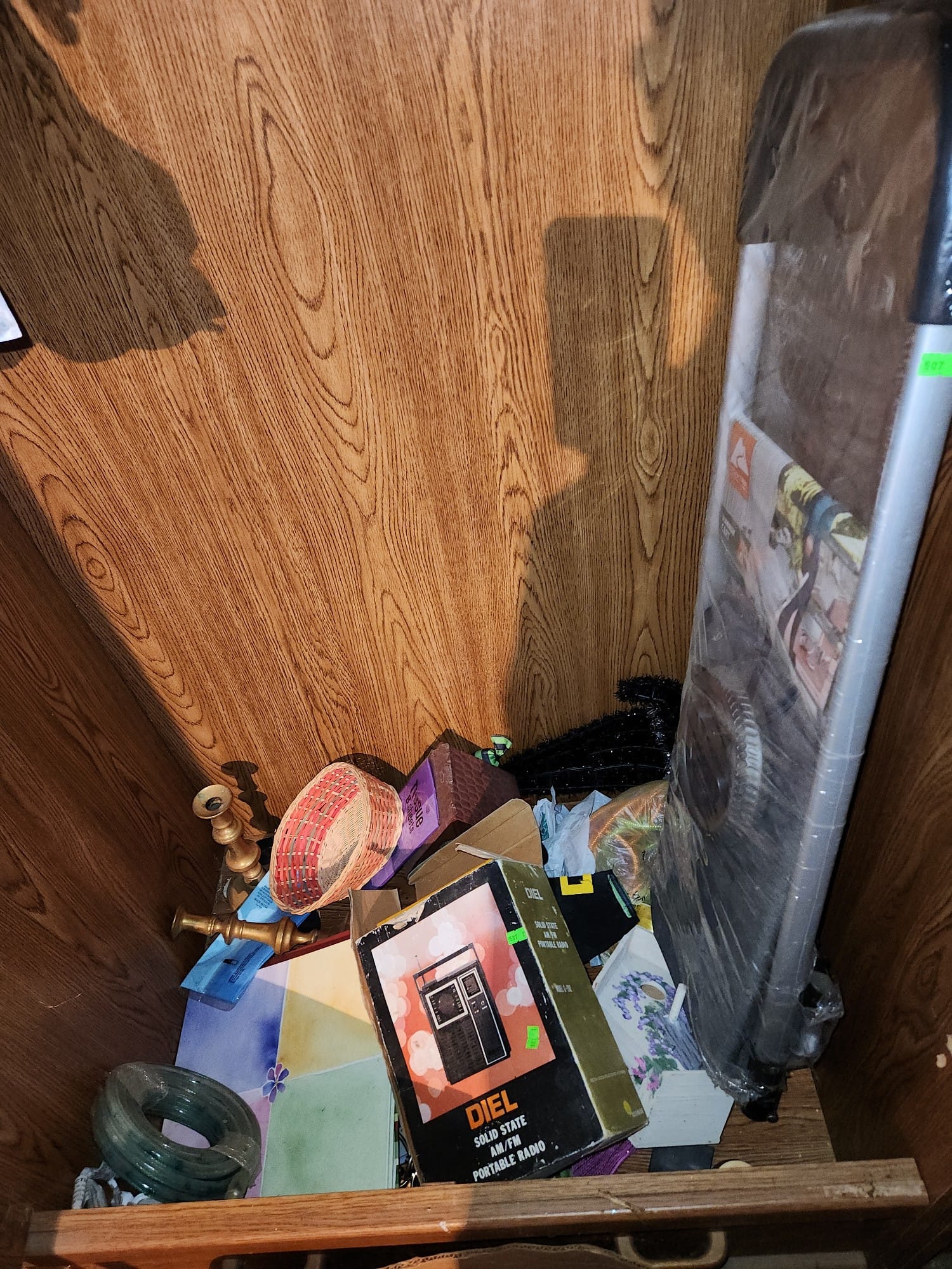 203 Books, suitcase, hanging rack, lamp, picnic basket