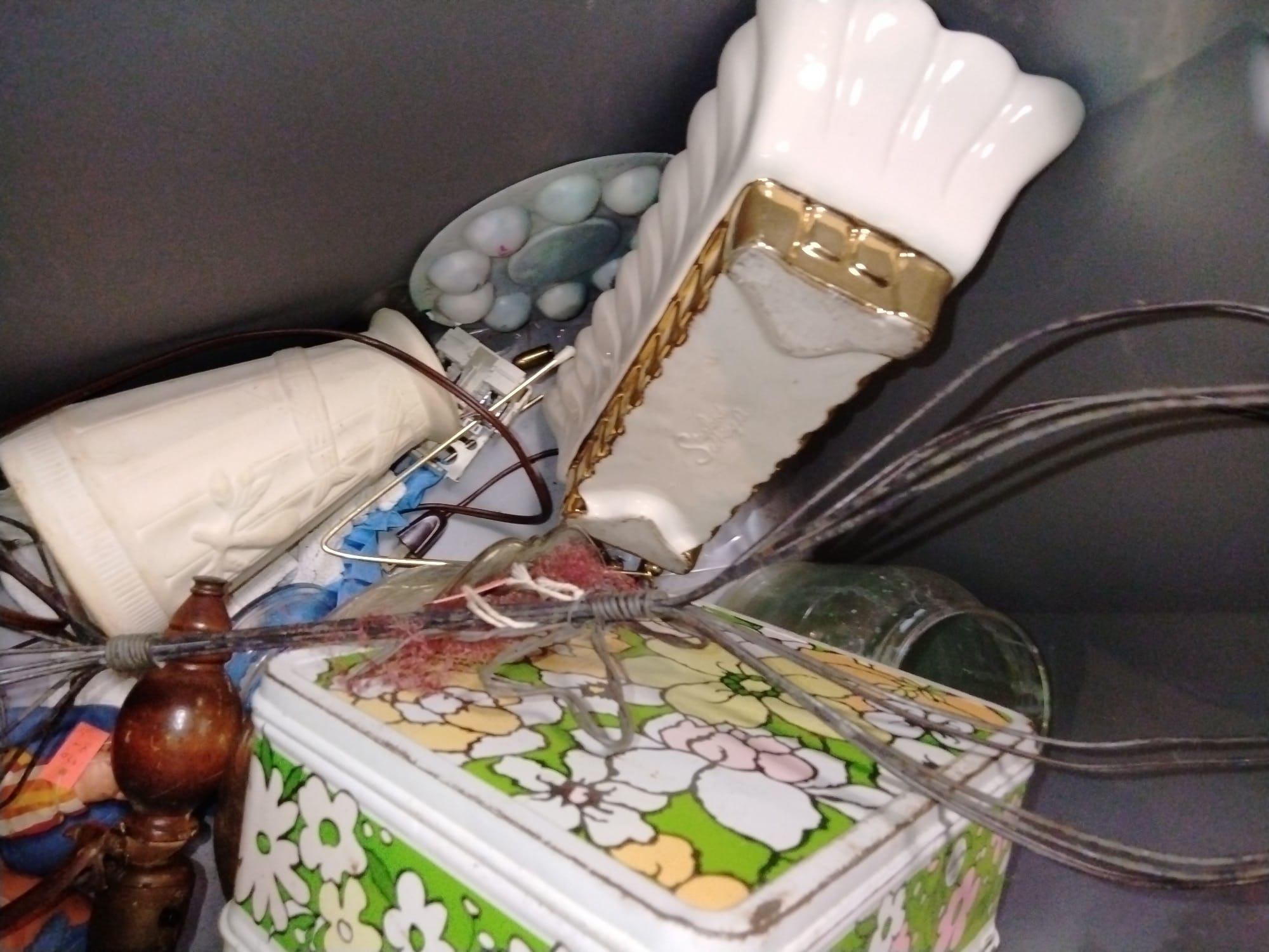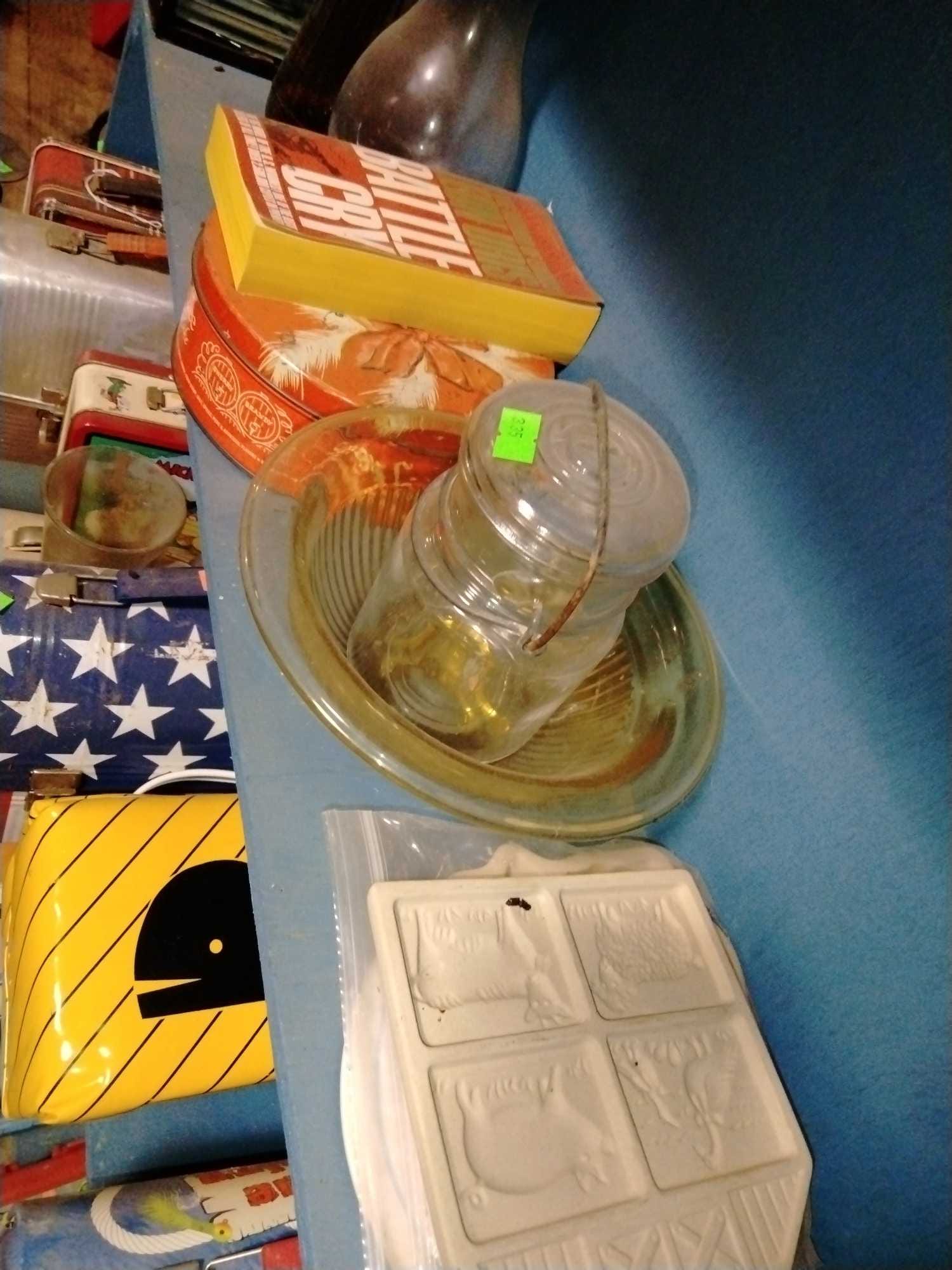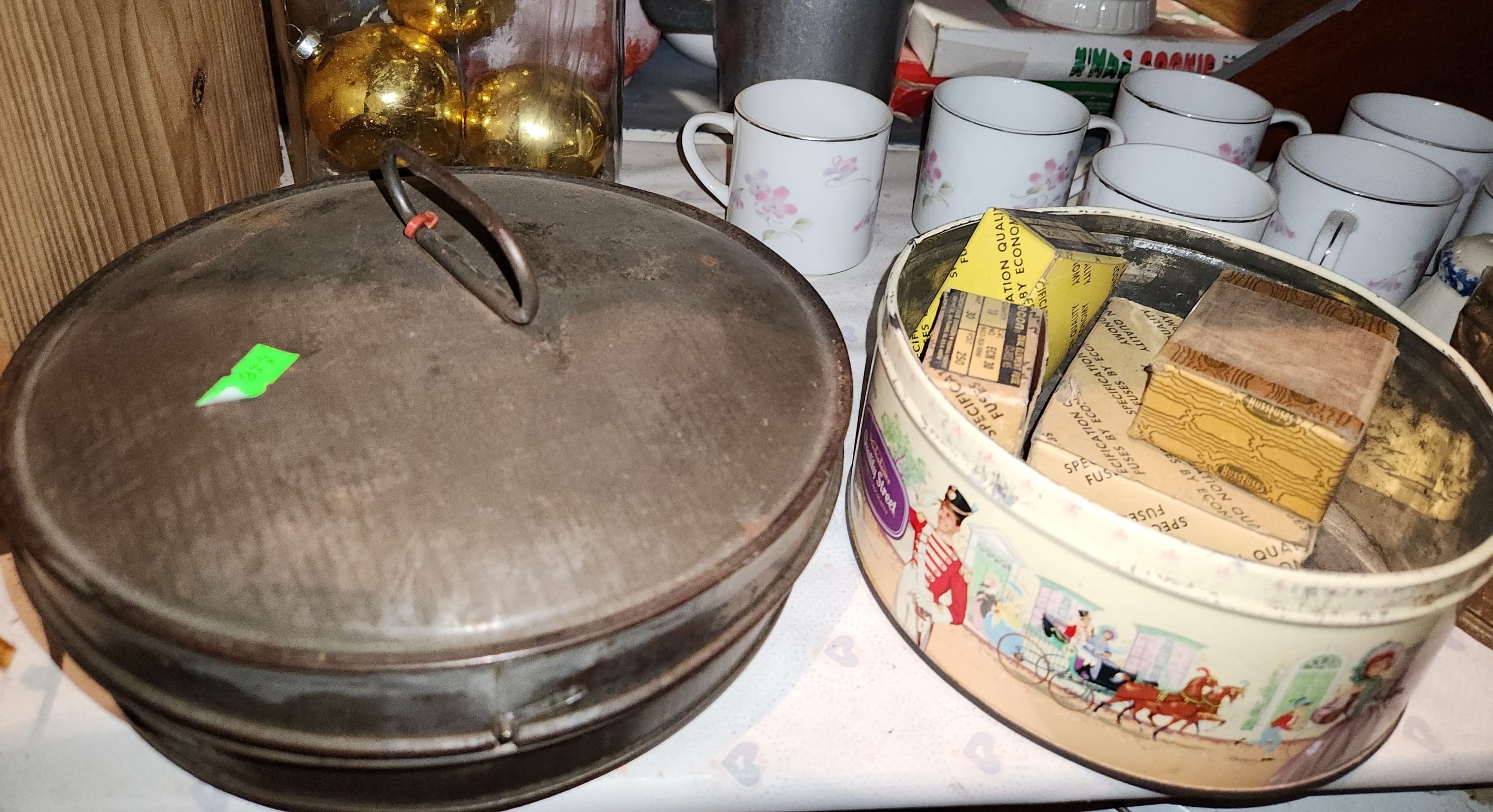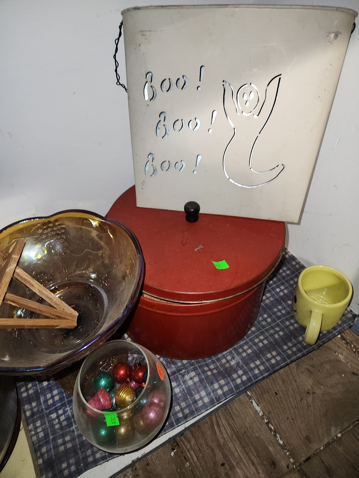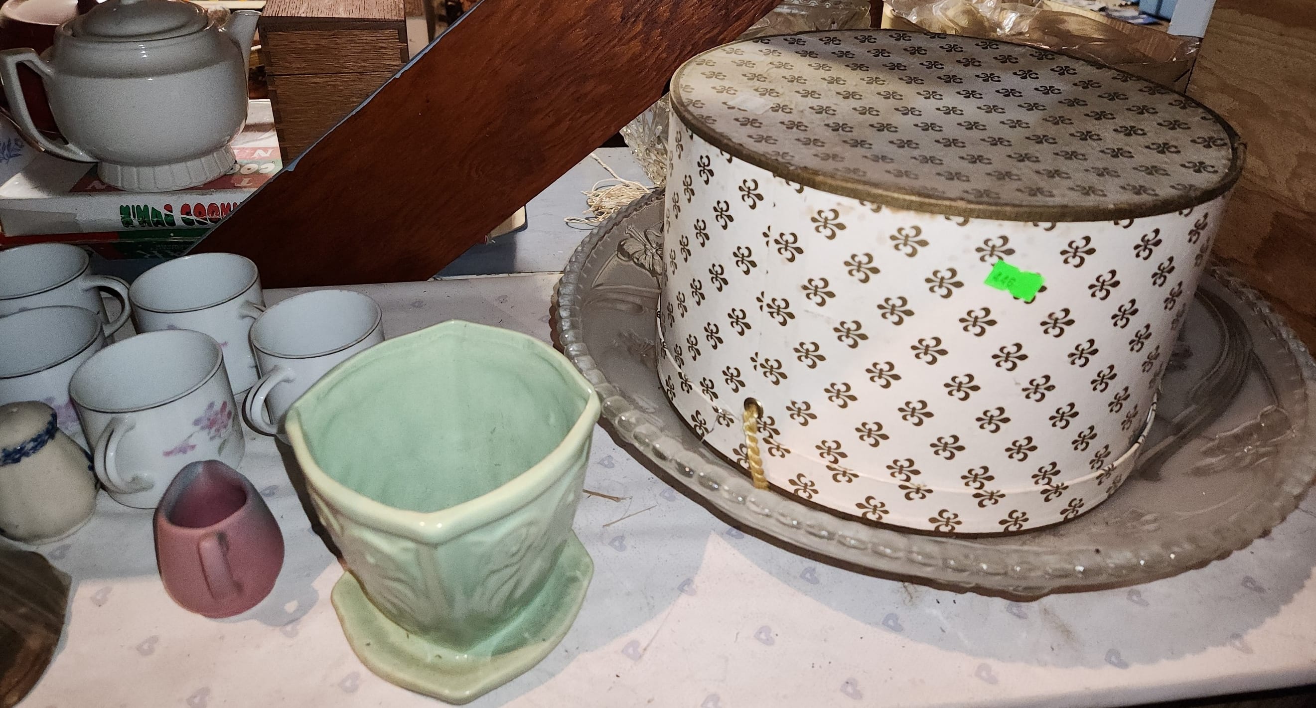 446 Tin cake pan with lid, light, bookends, fuses, planter, glass shade, hat box, cups, fuses, miscellaneous