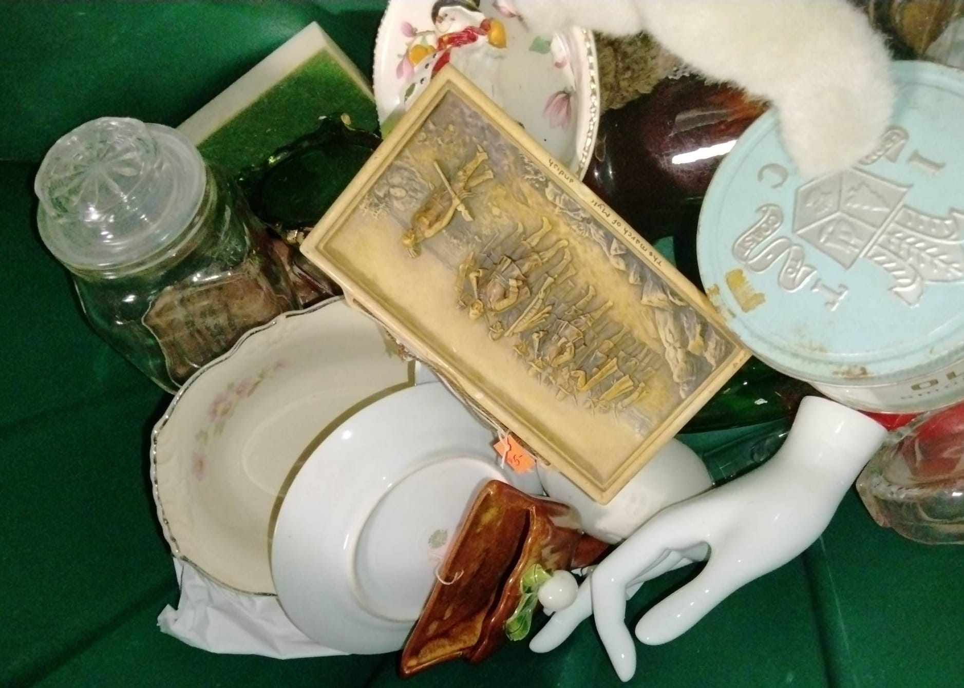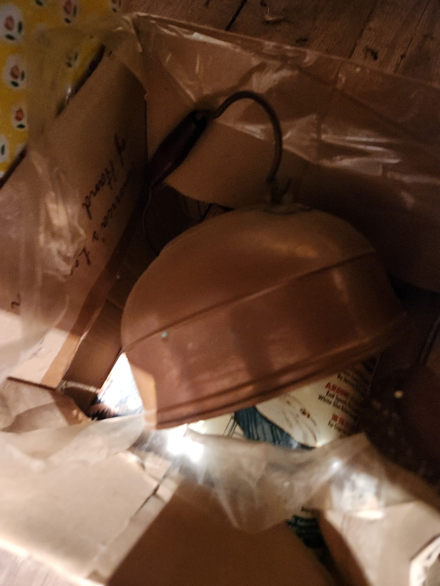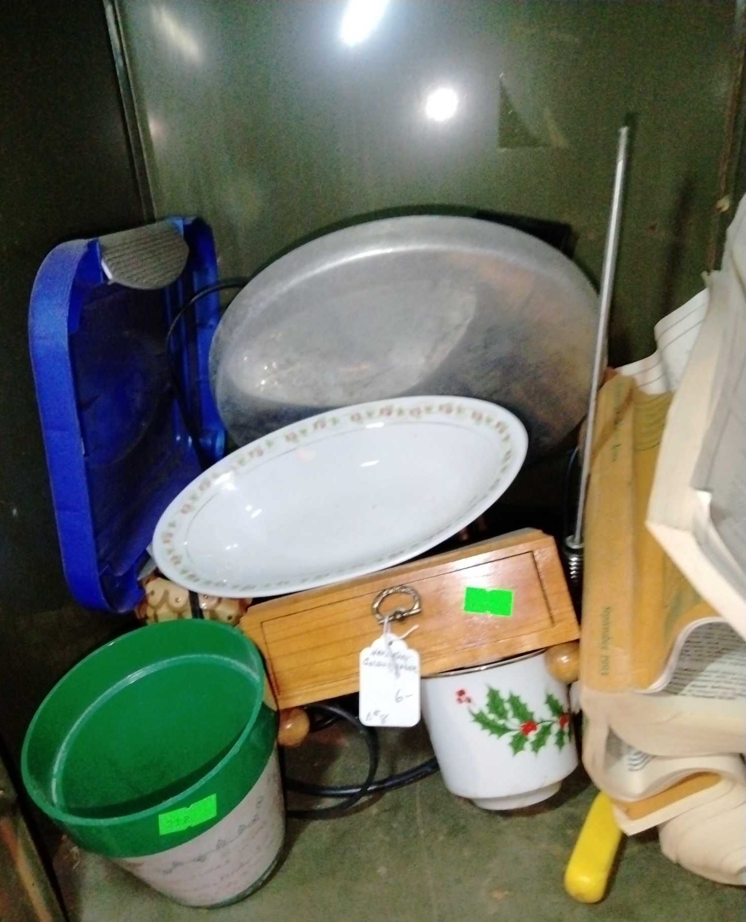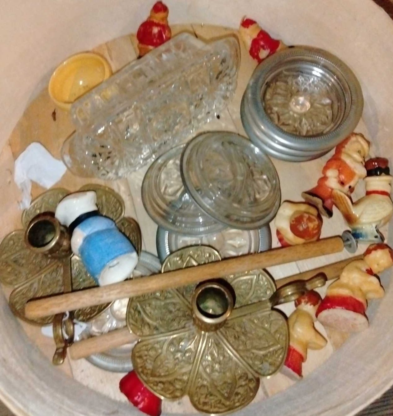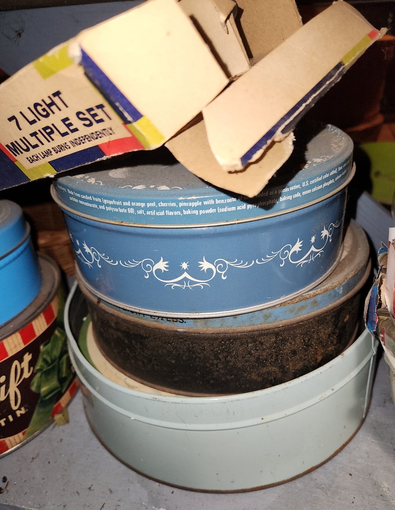 446 Tin cake pan with lid, light, bookends, fuses, planter, glass shade, hat box, cups, fuses, miscellaneous