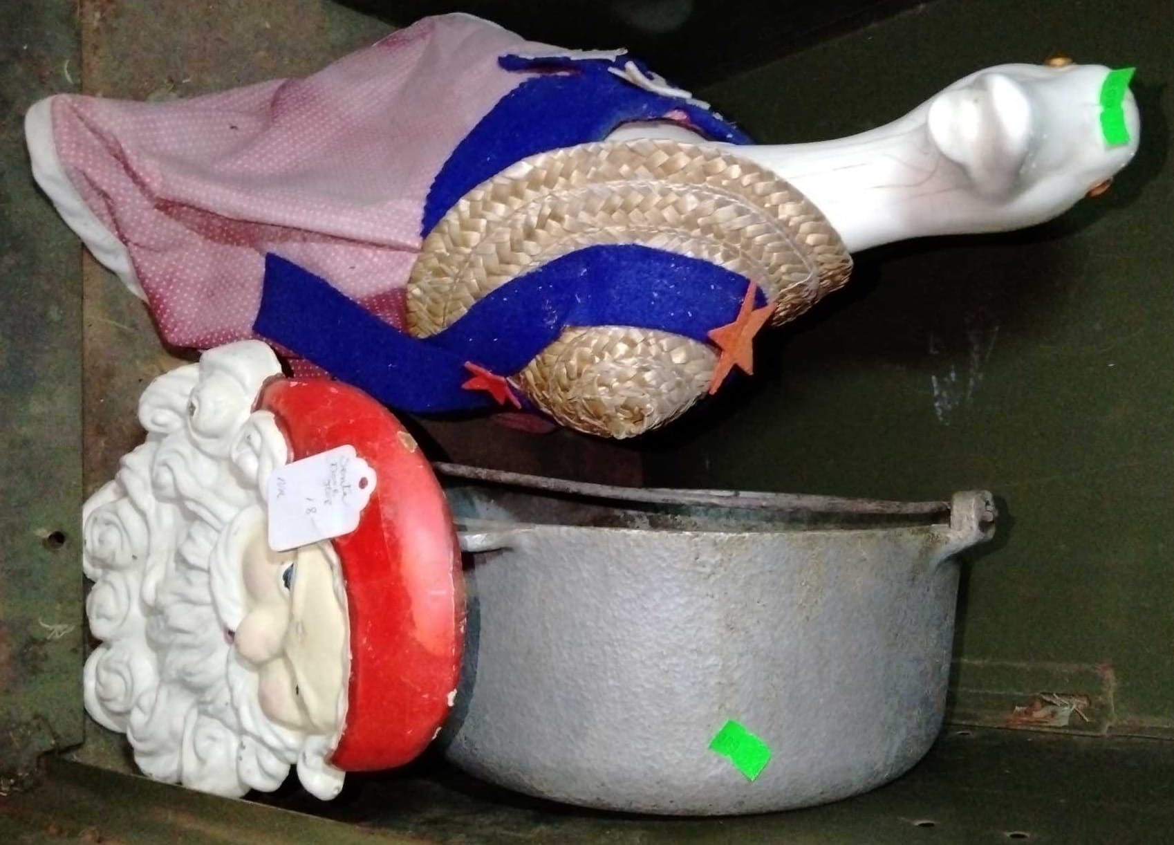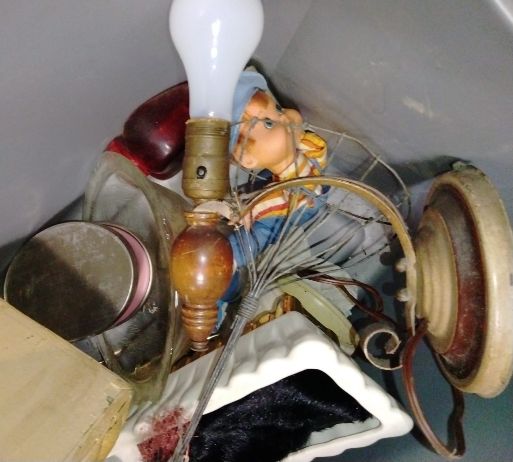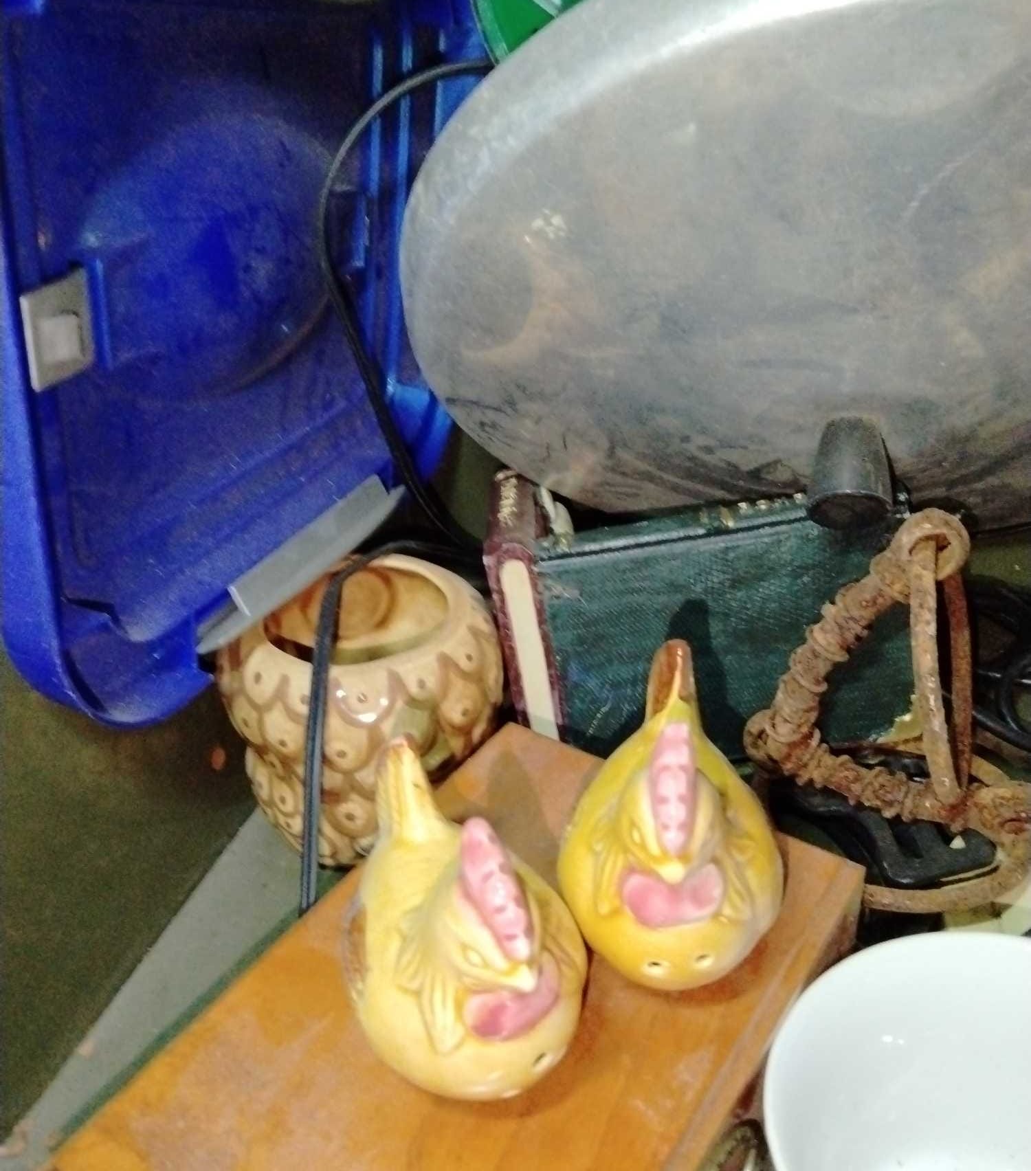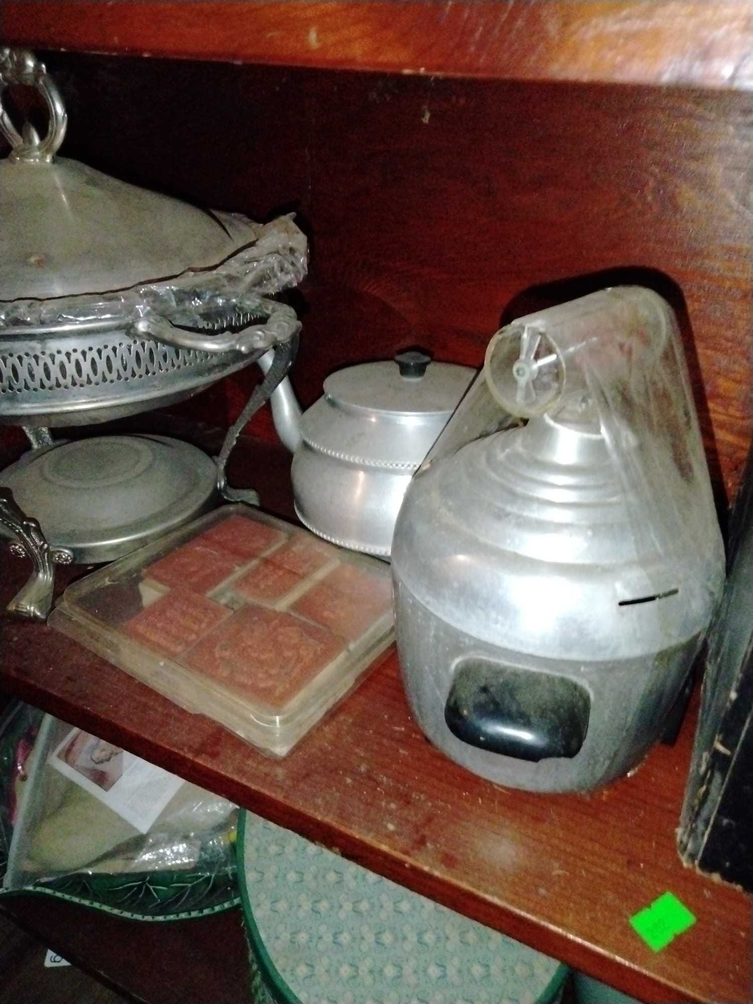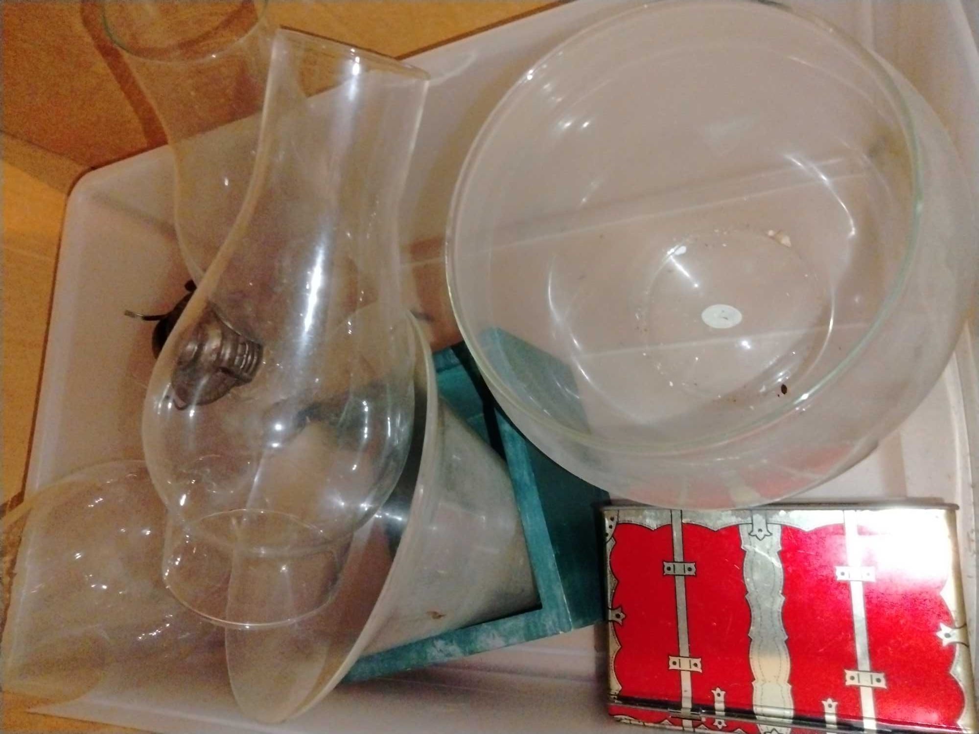 446 Tin cake pan with lid, light, bookends, fuses, planter, glass shade, hat box, cups, fuses, miscellaneous