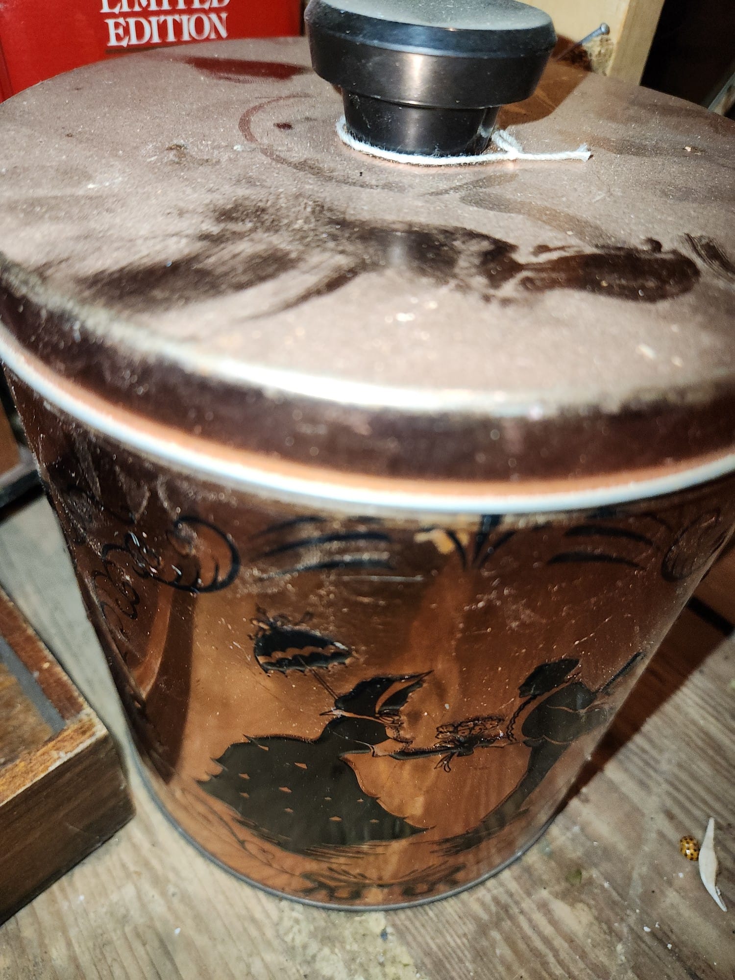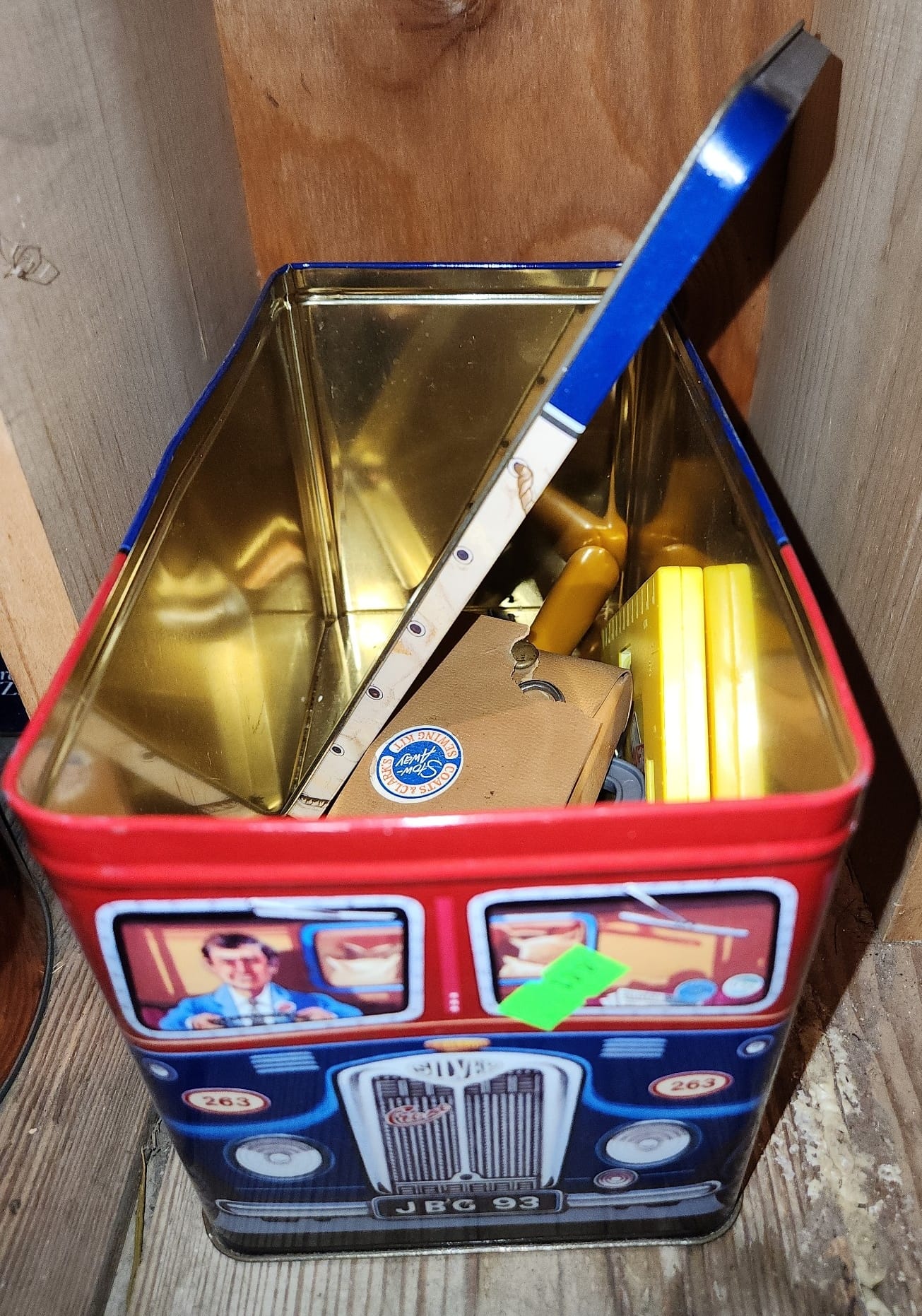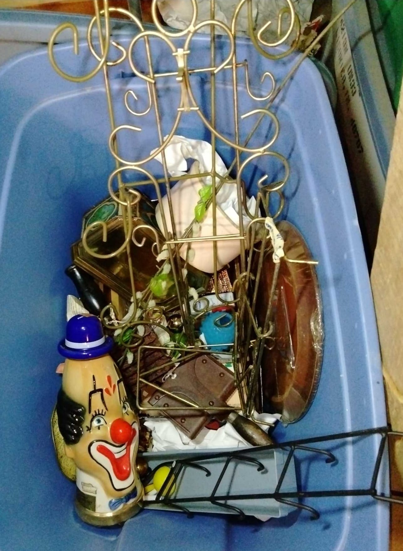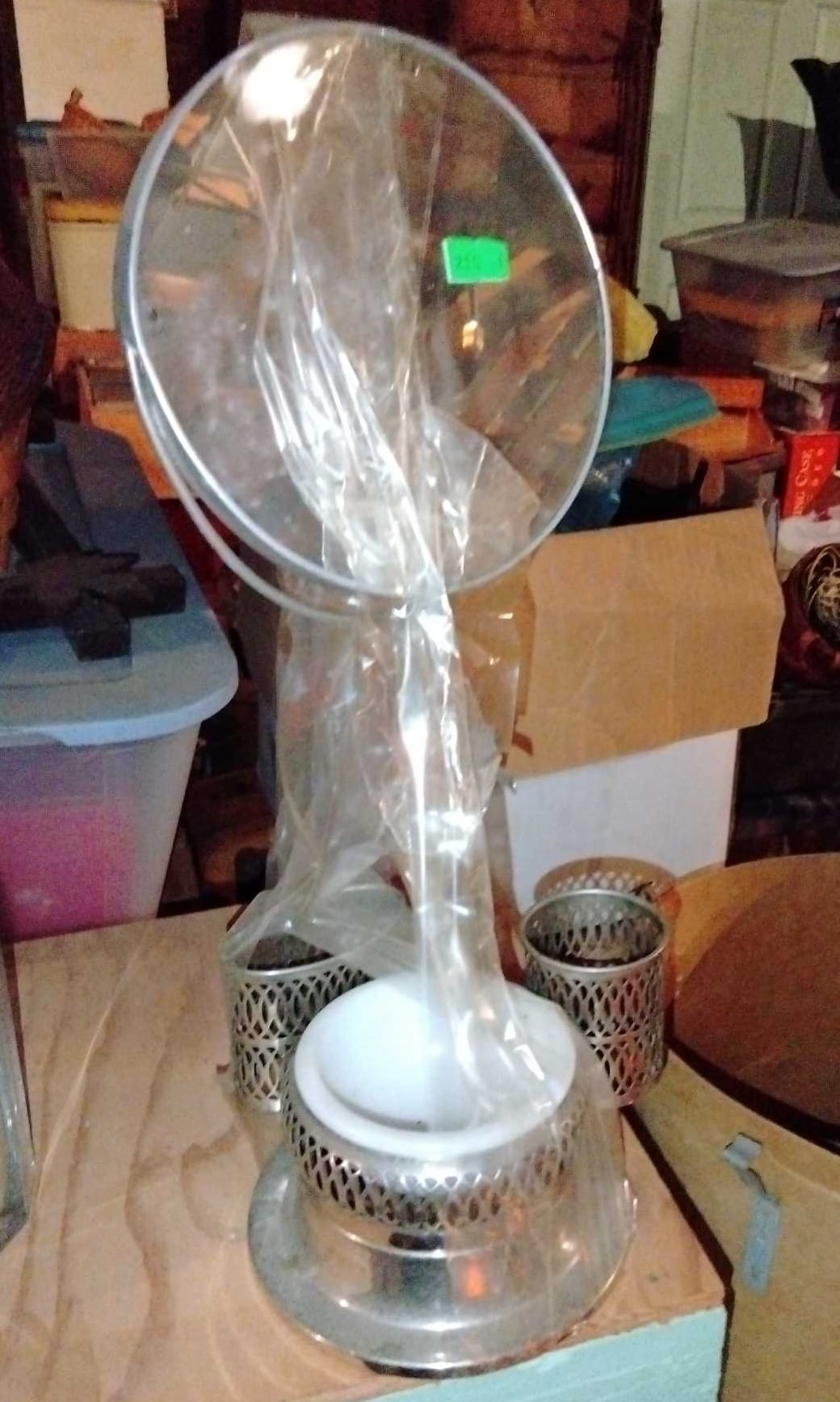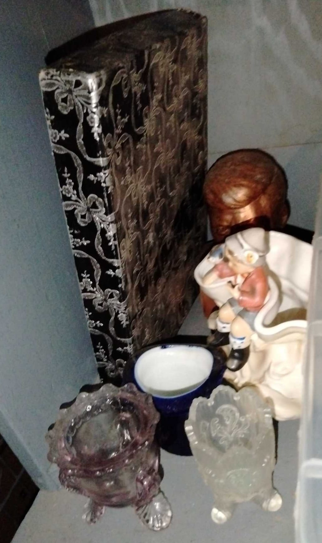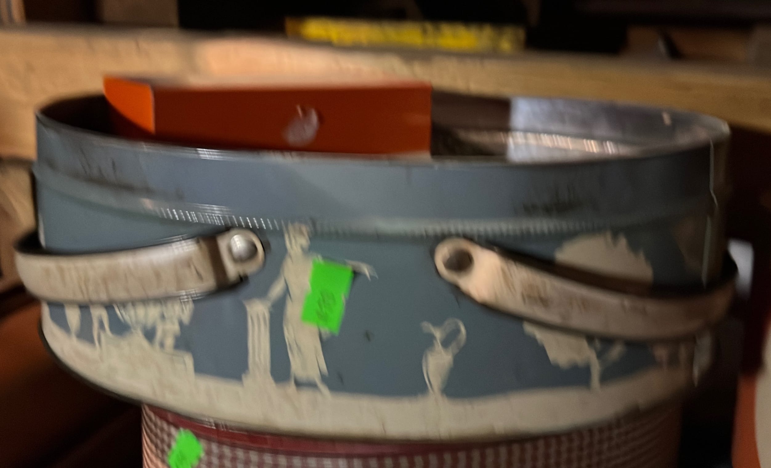 446 Tin cake pan with lid, light, bookends, fuses, planter, glass shade, hat box, cups, fuses, miscellaneous