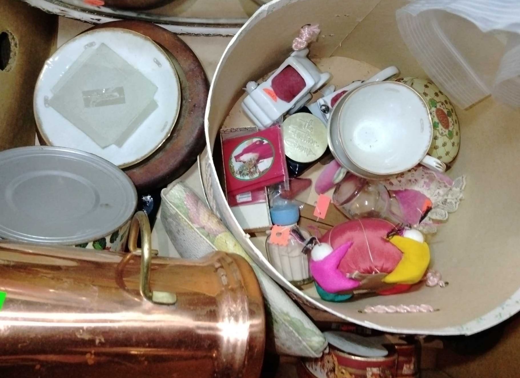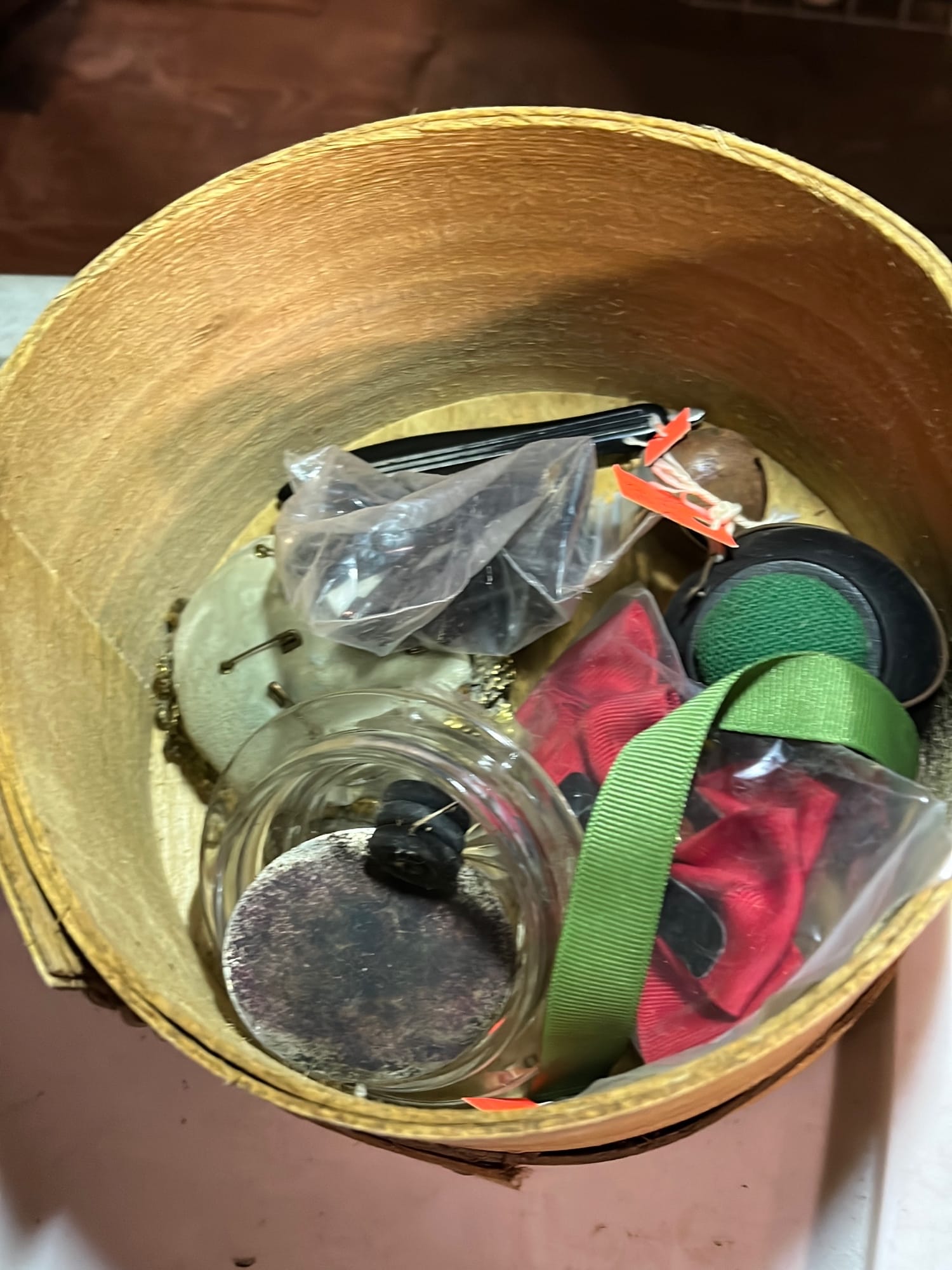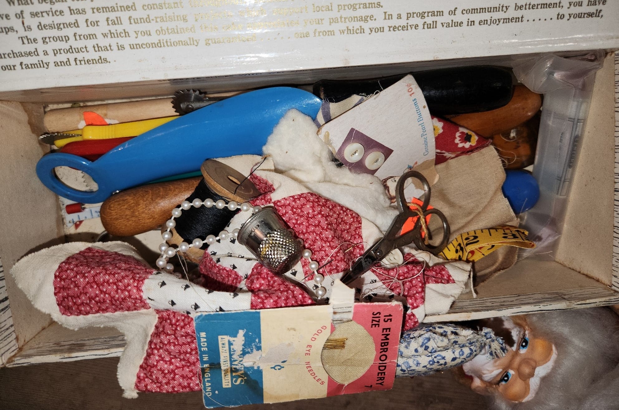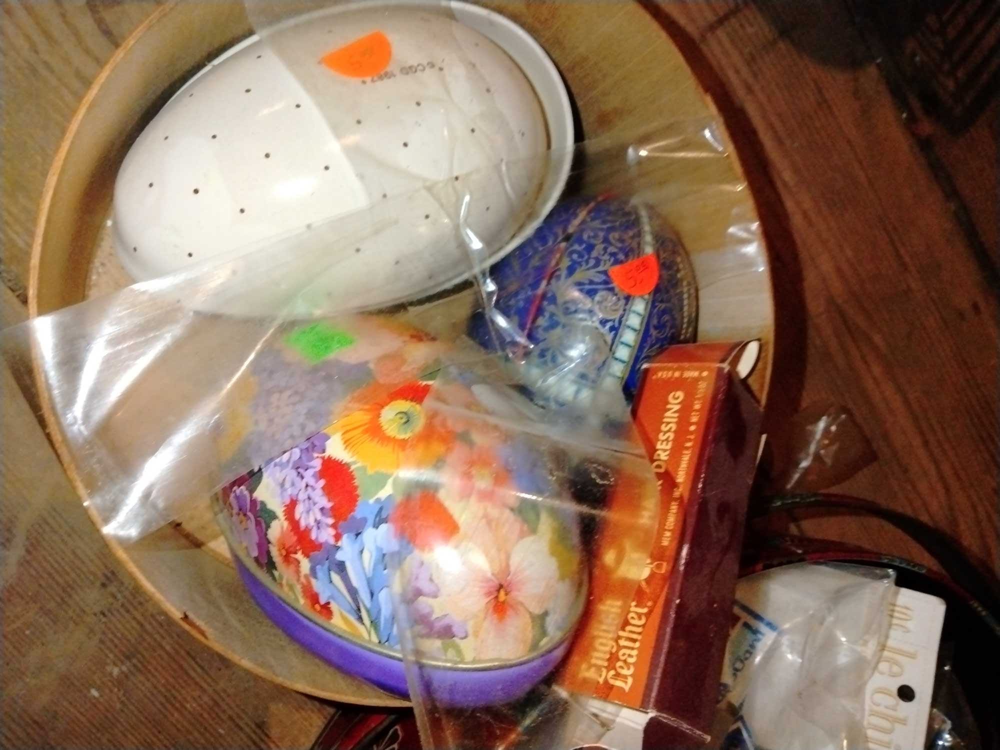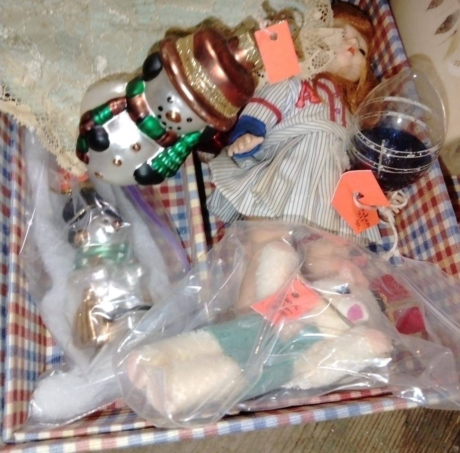 262 Divided box with Christmas ornaments, doll, glass sugar bowl, bobbins and Tin and hat box with craft items
