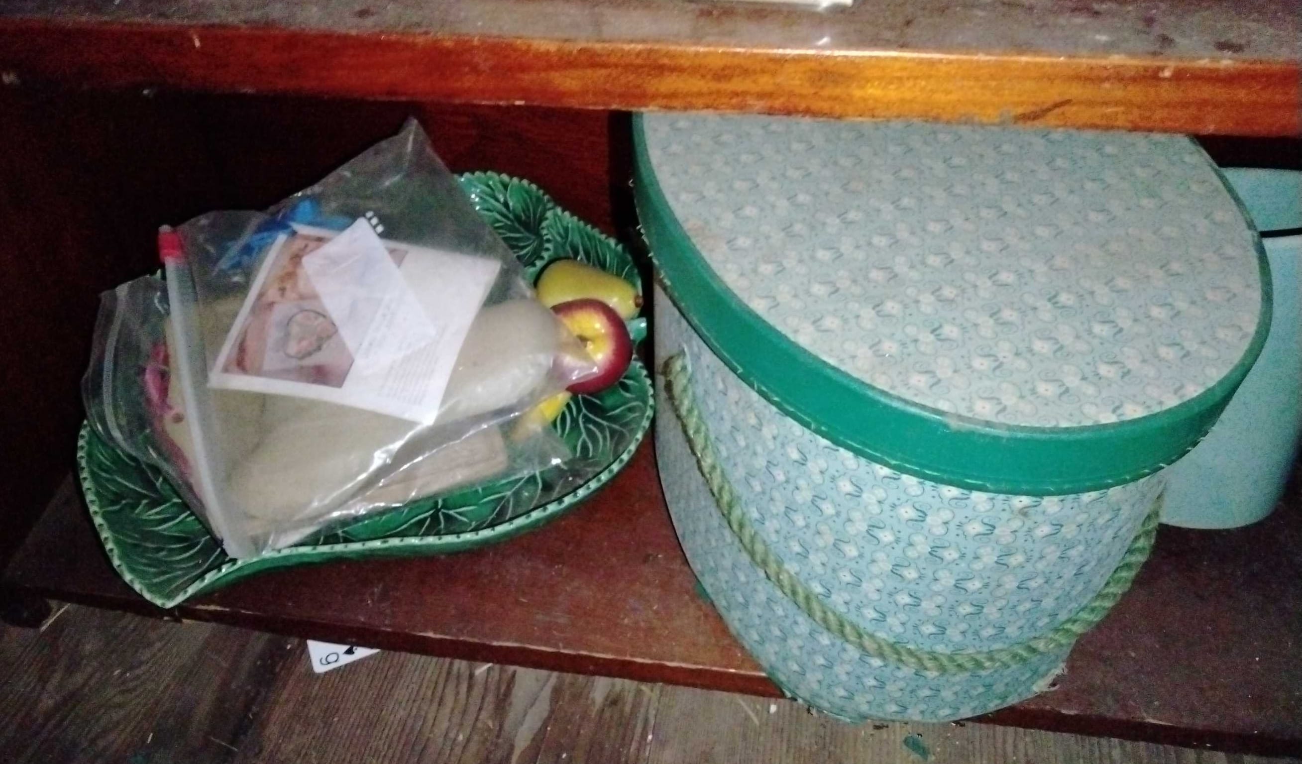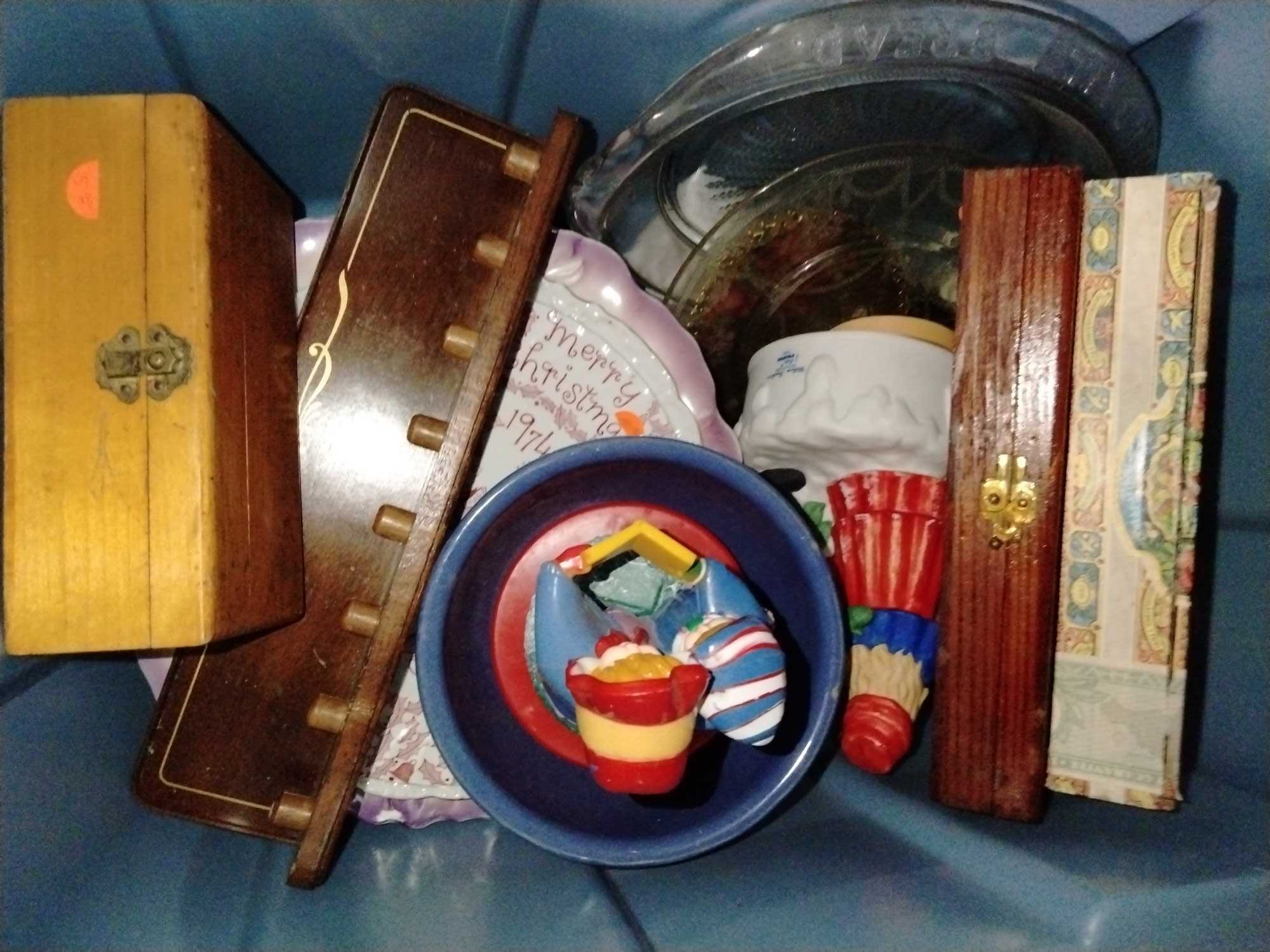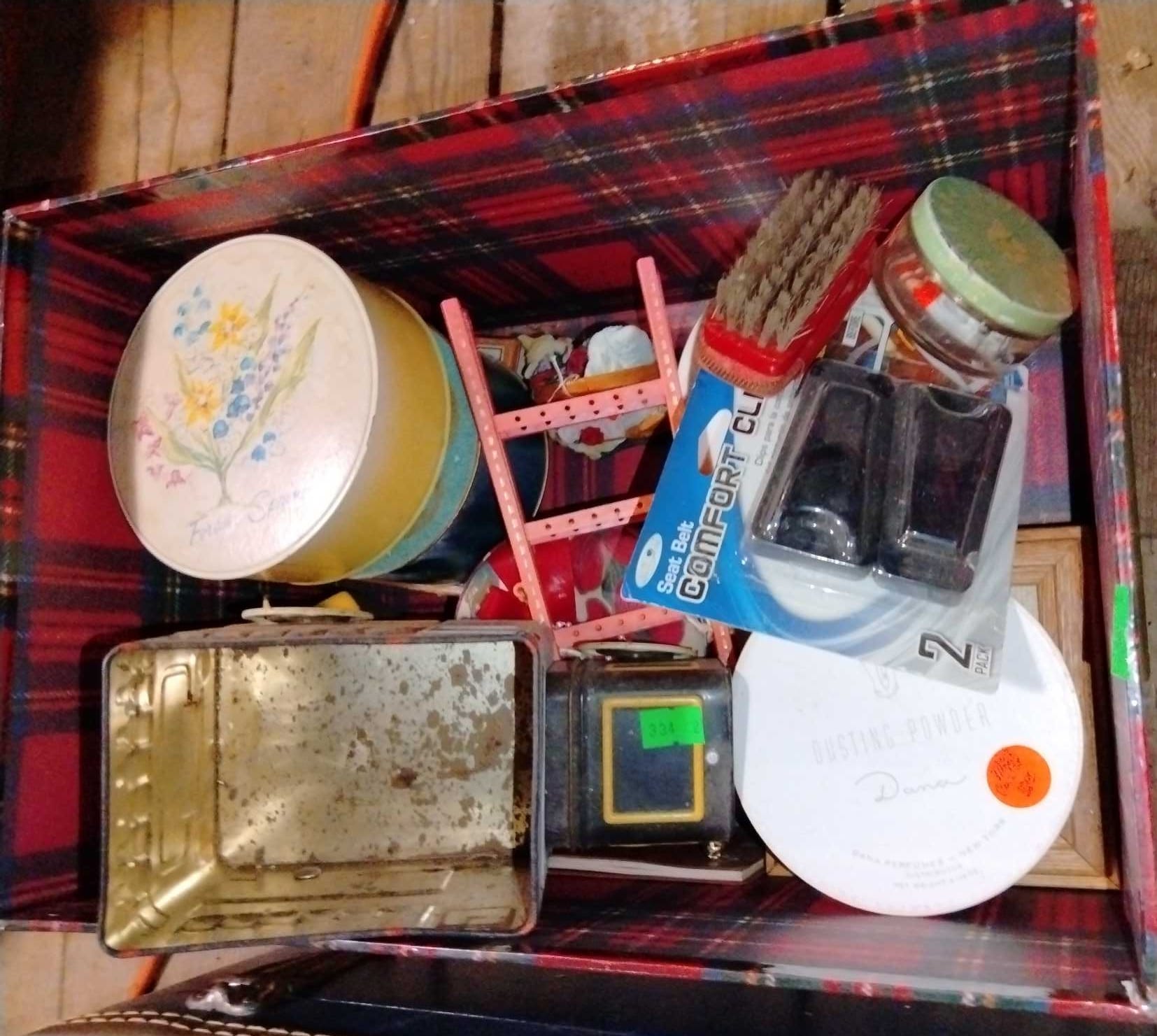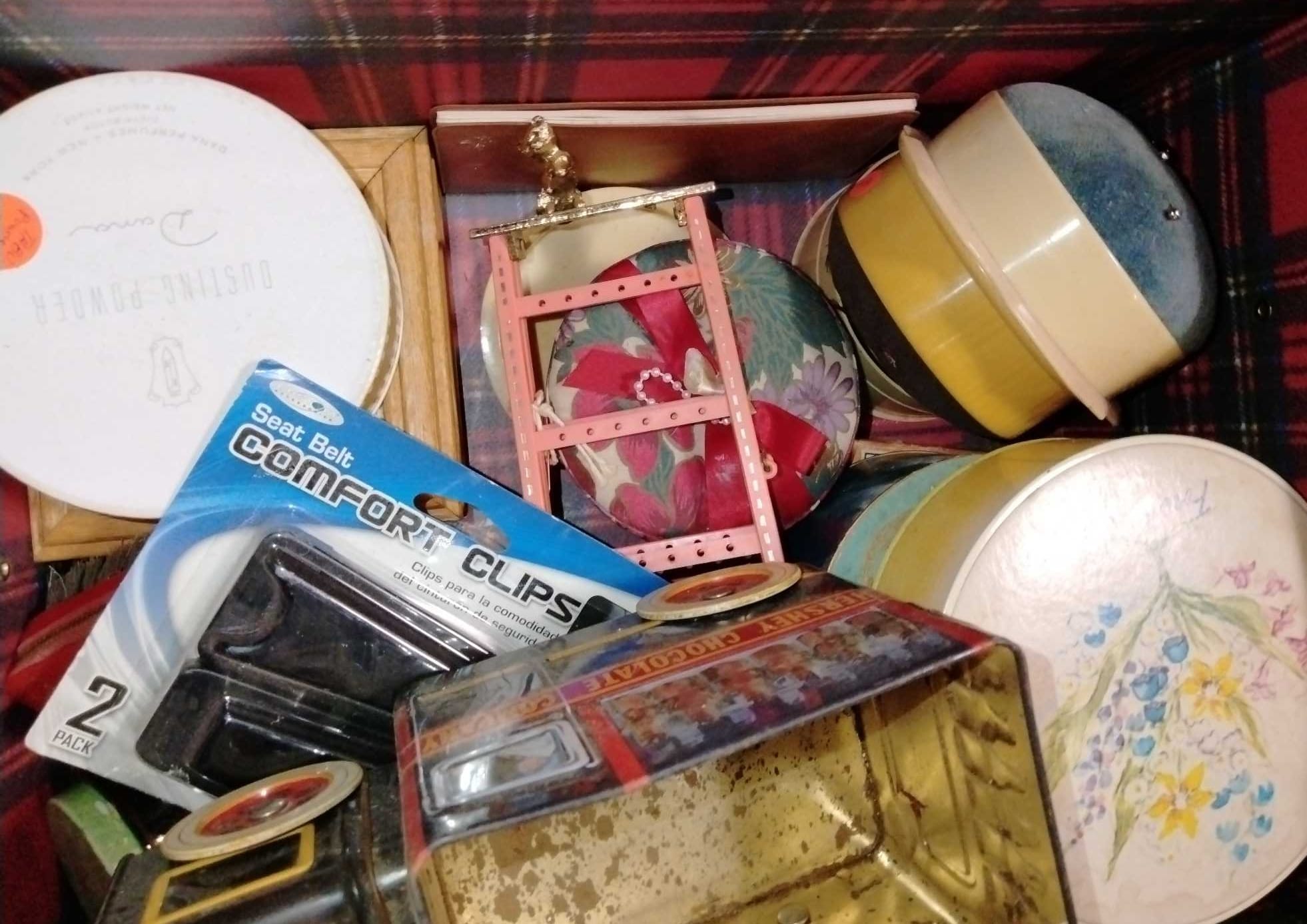262 Divided box with Christmas ornaments, doll, glass sugar bowl, bobbins and Tin and hat box with craft items