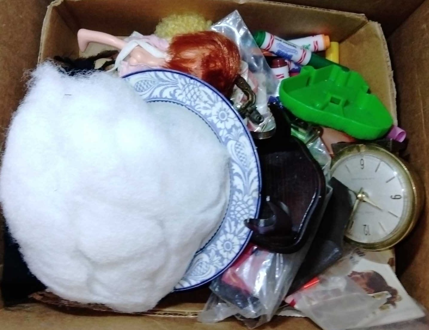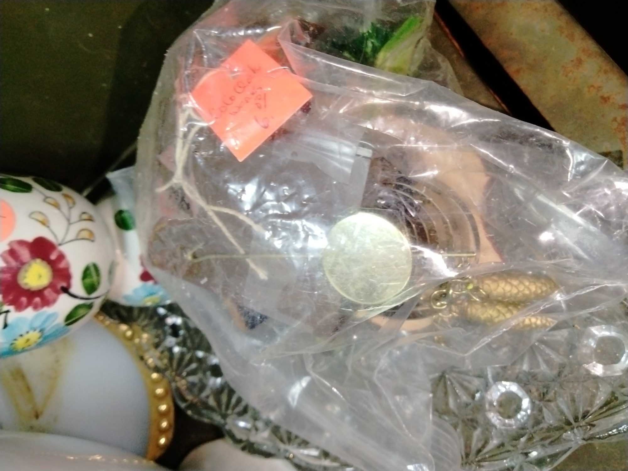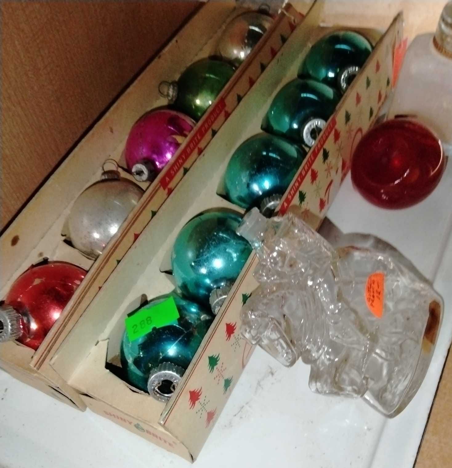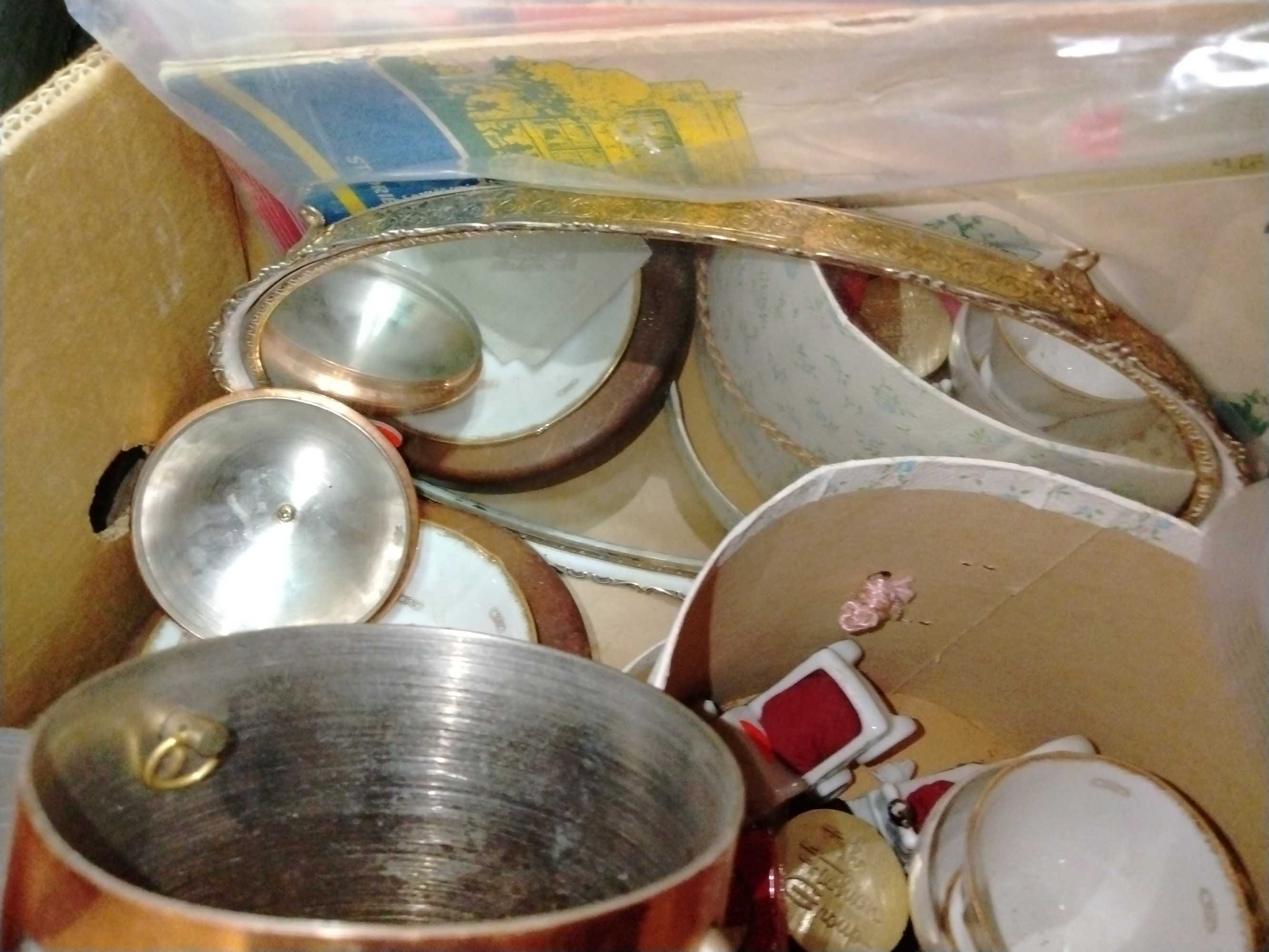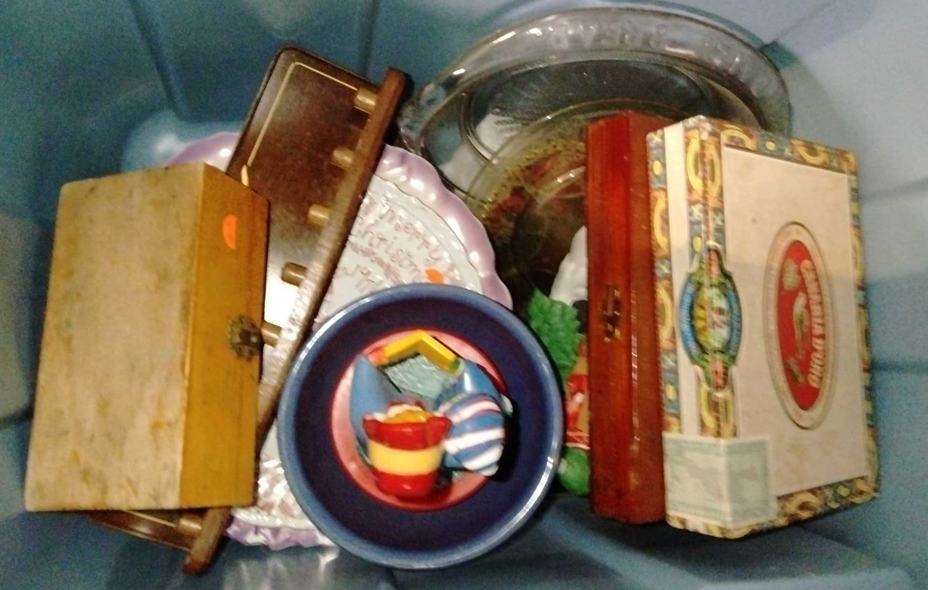 262 Divided box with Christmas ornaments, doll, glass sugar bowl, bobbins and Tin and hat box with craft items