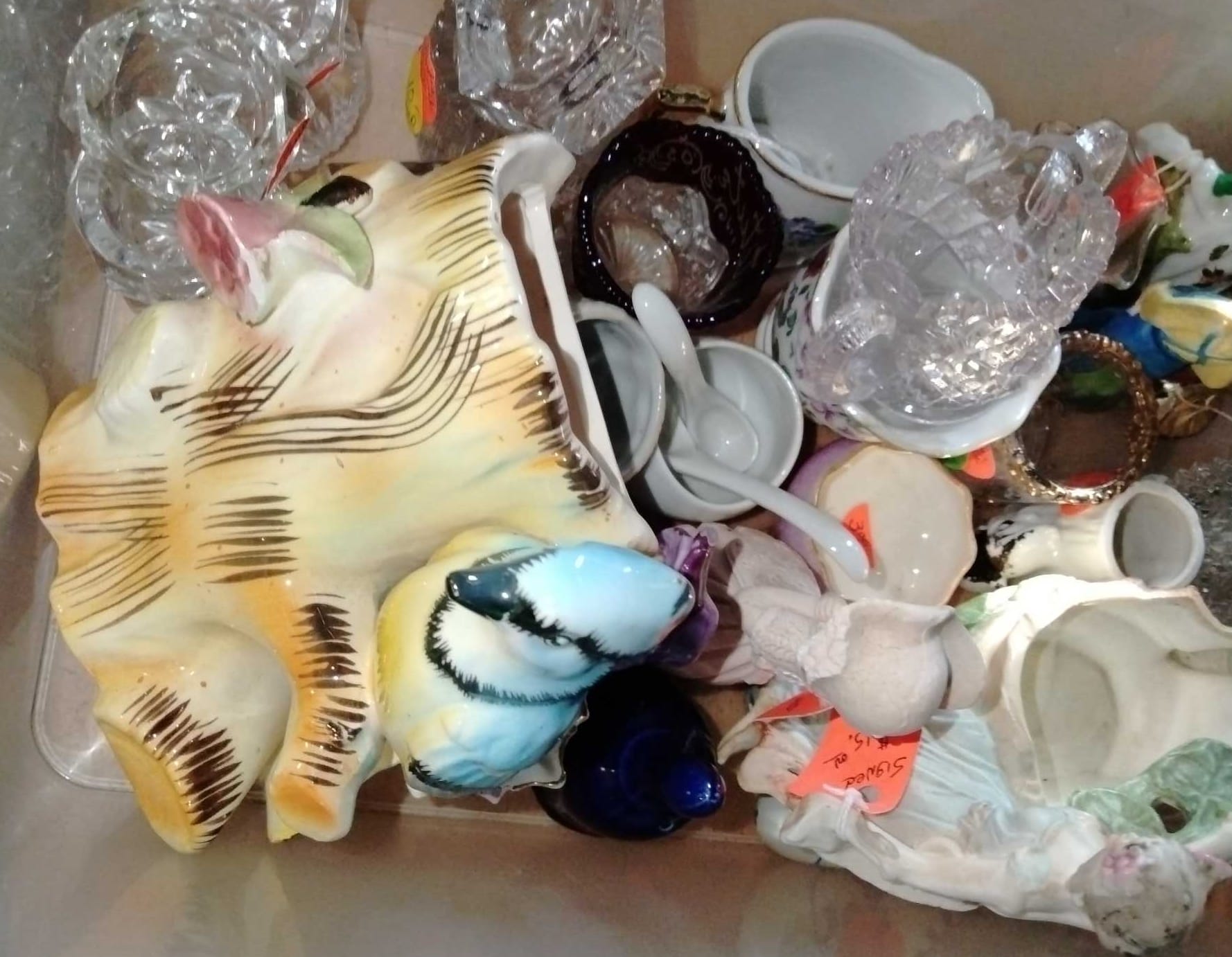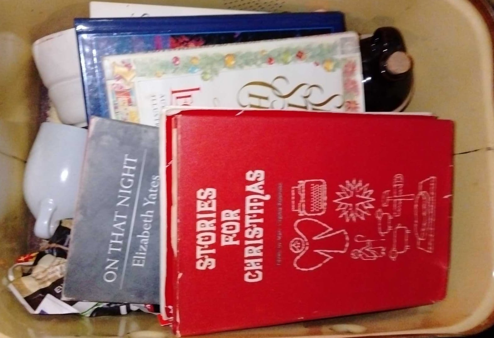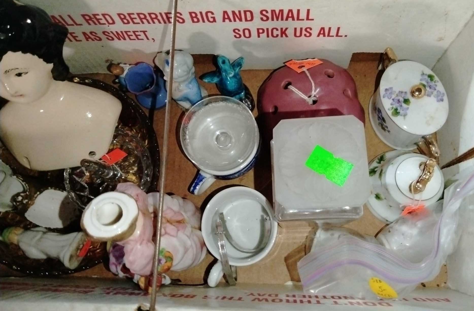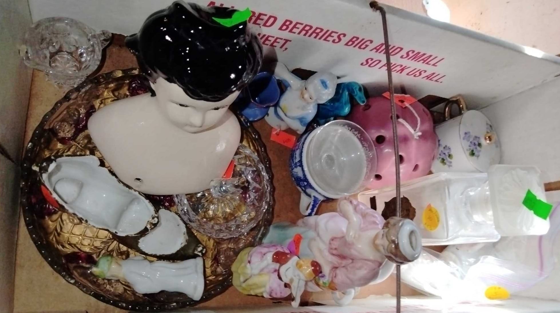 262 Divided box with Christmas ornaments, doll, glass sugar bowl, bobbins and Tin and hat box with craft items