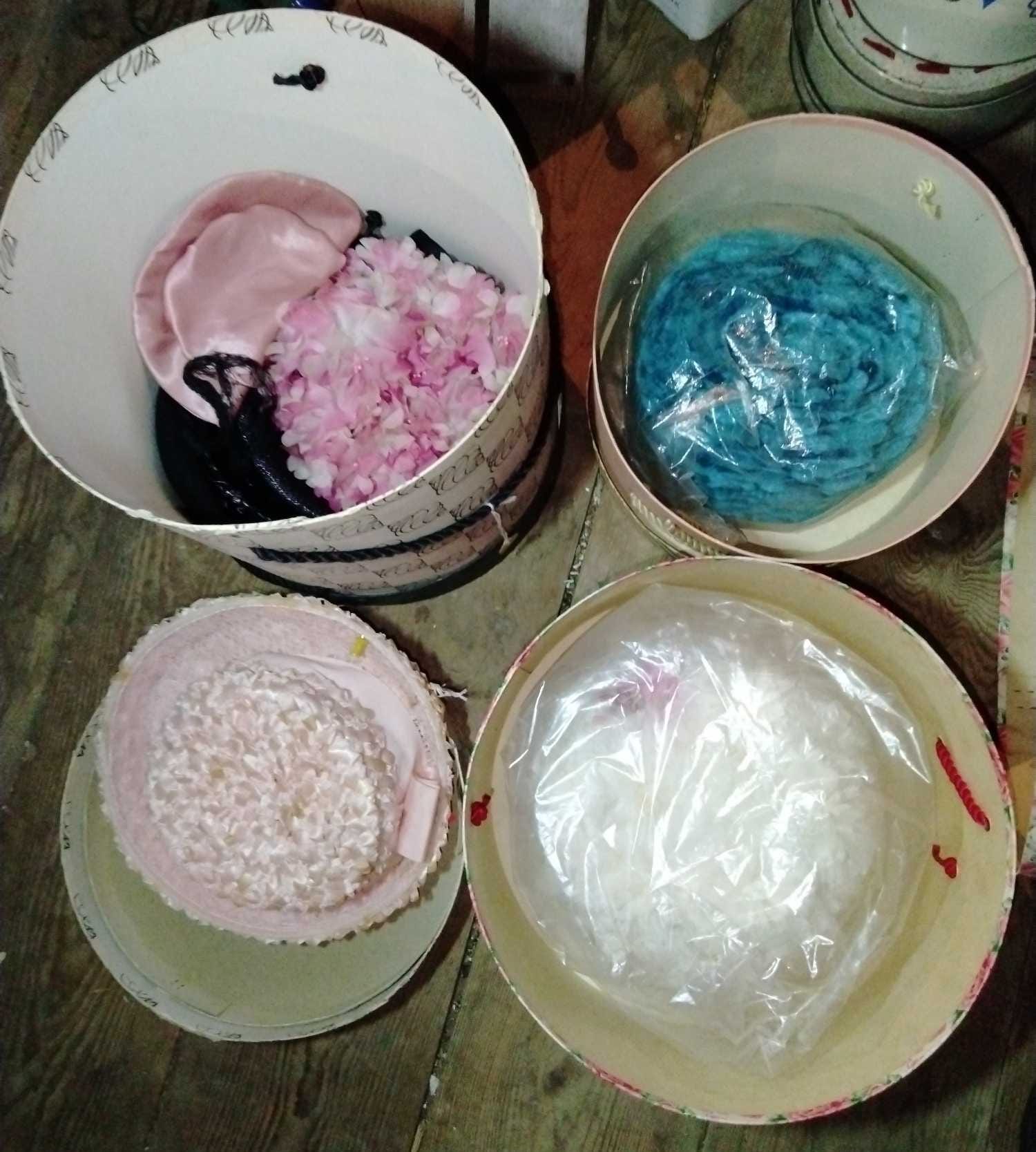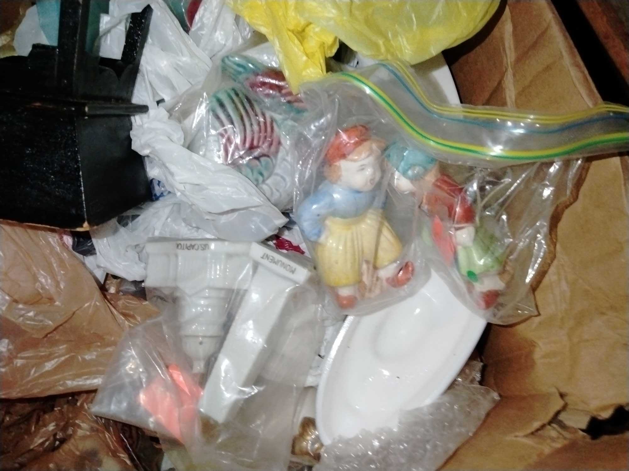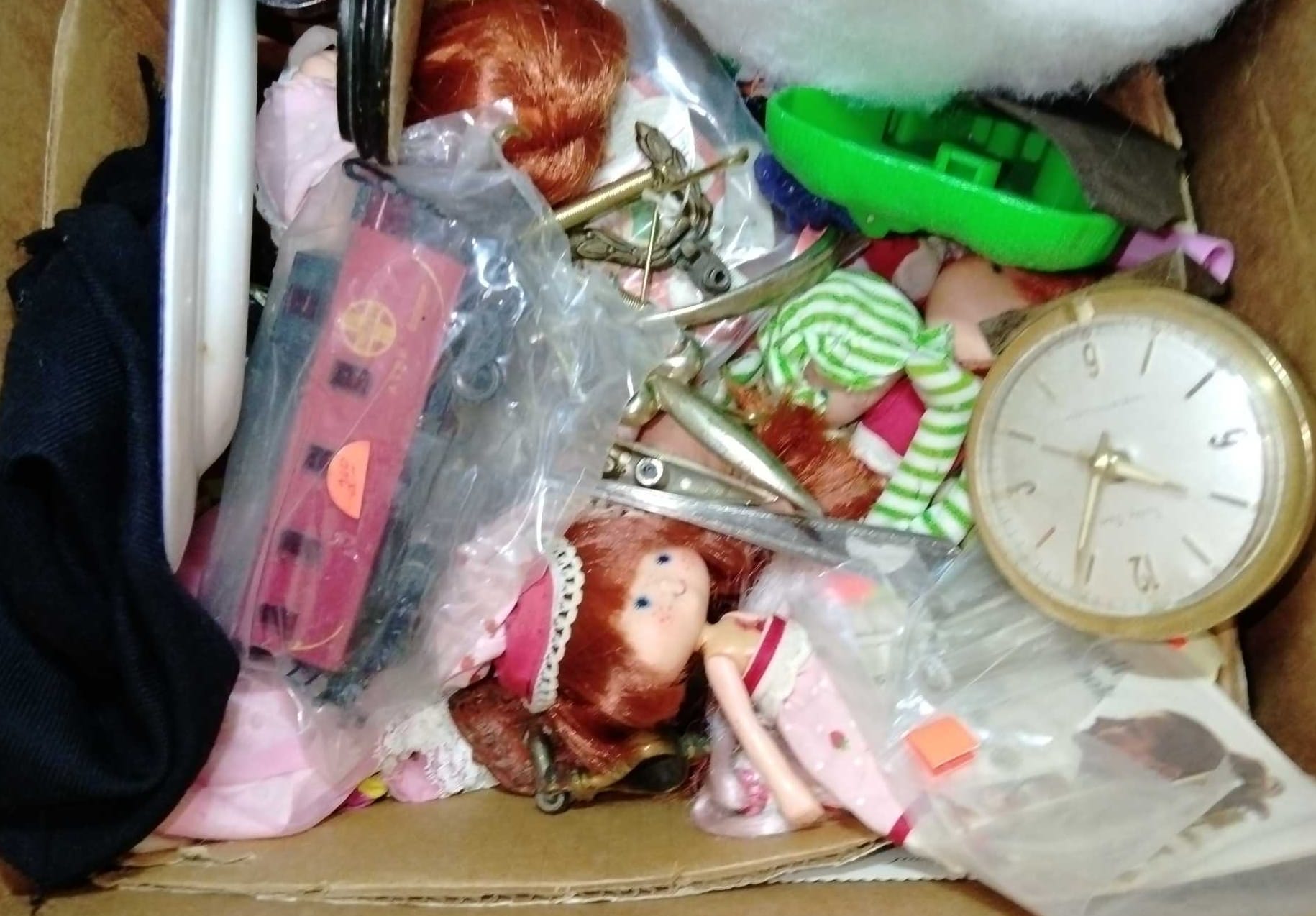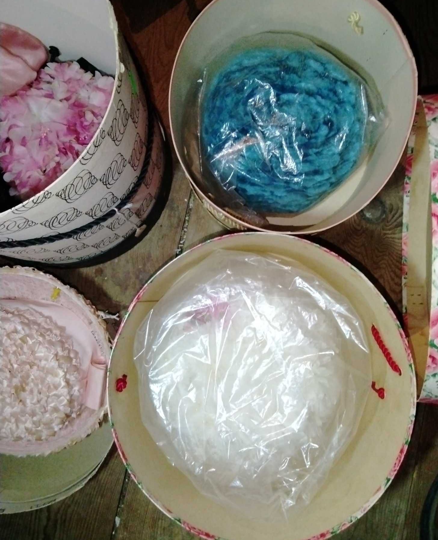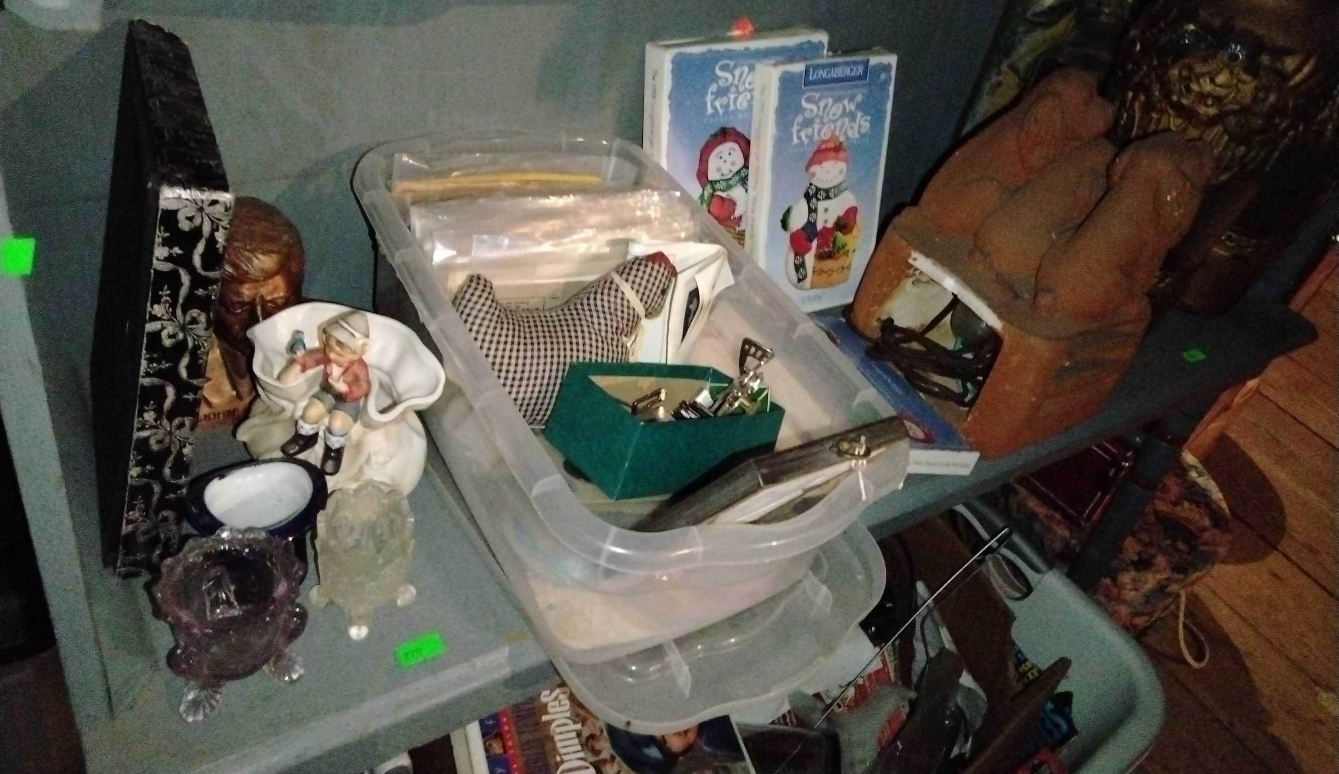 262 Divided box with Christmas ornaments, doll, glass sugar bowl, bobbins and Tin and hat box with craft items