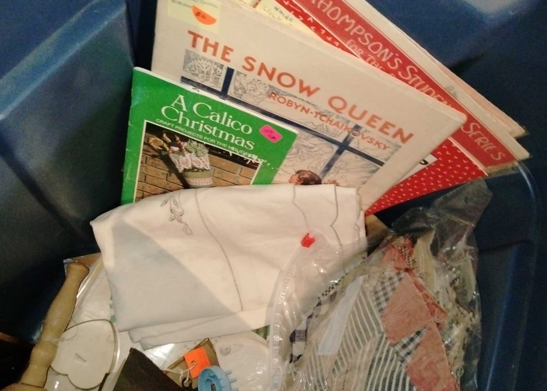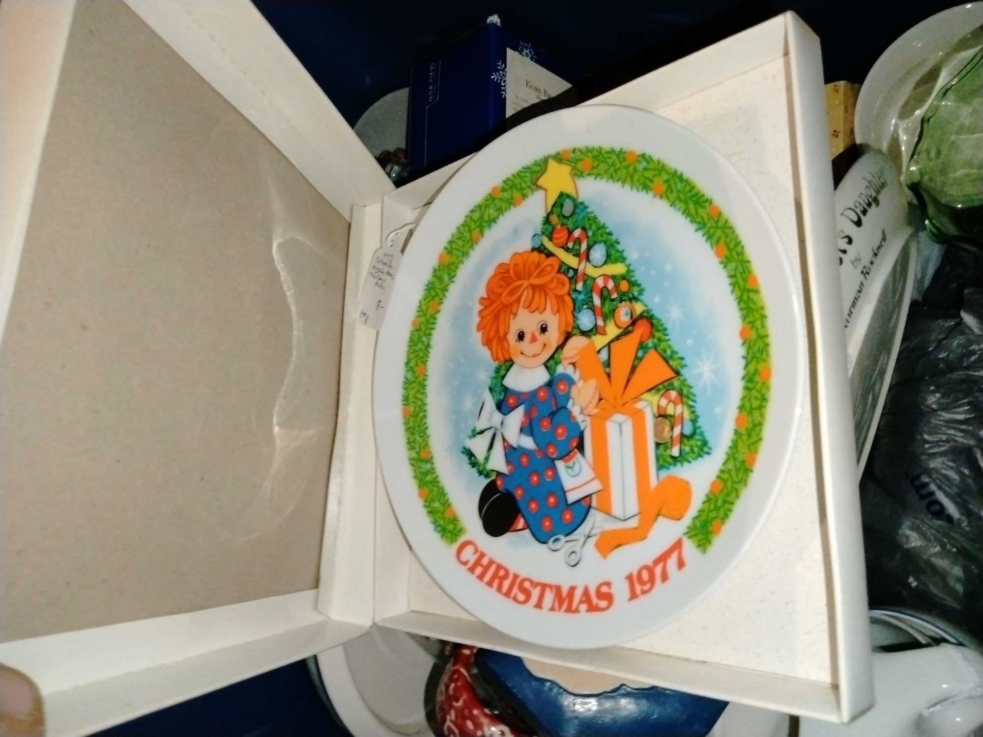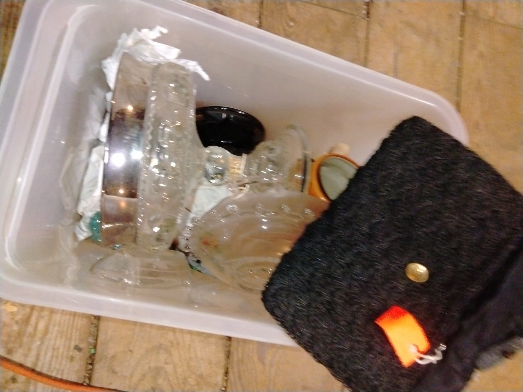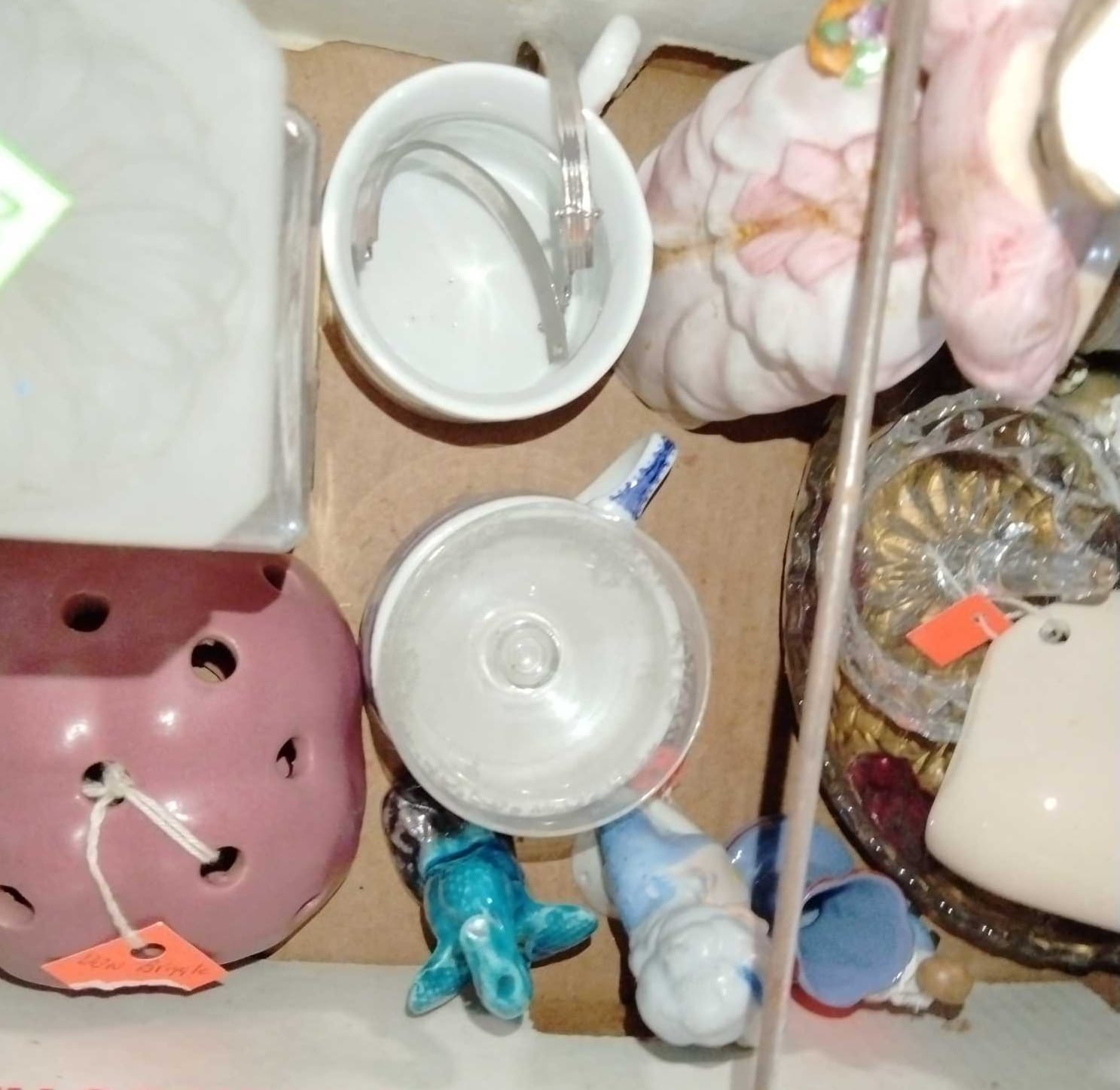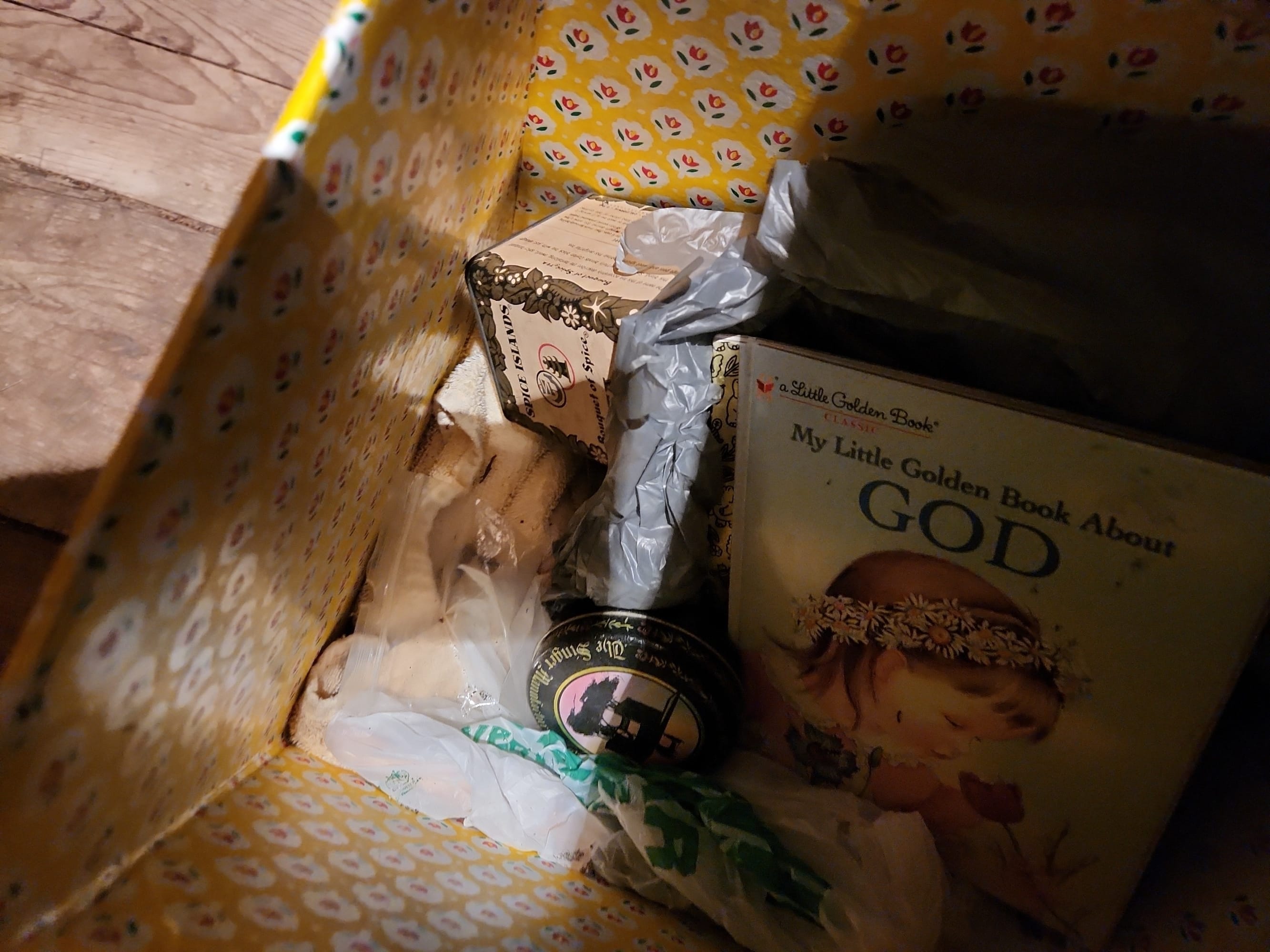 262 Divided box with Christmas ornaments, doll, glass sugar bowl, bobbins and Tin and hat box with craft items