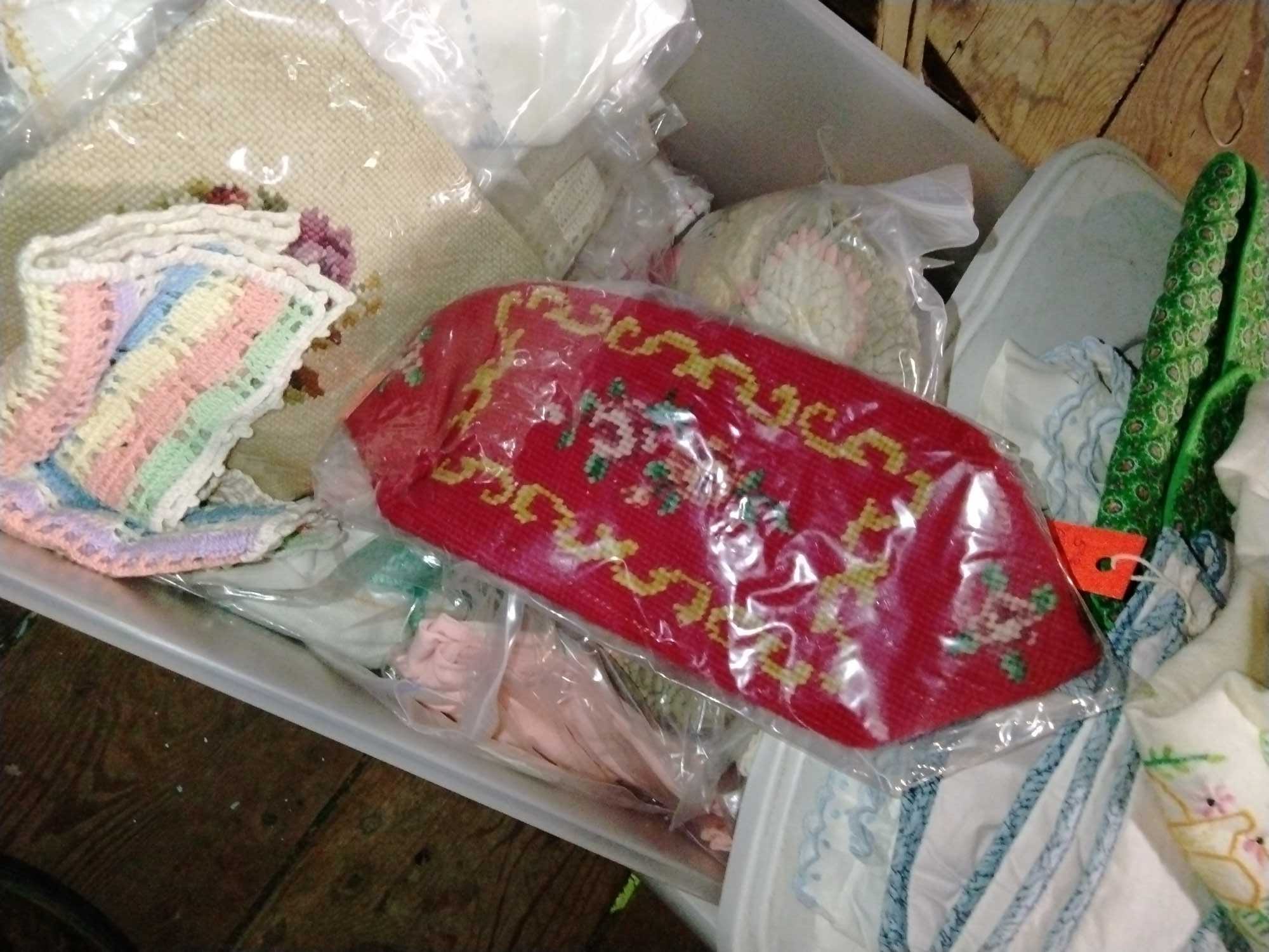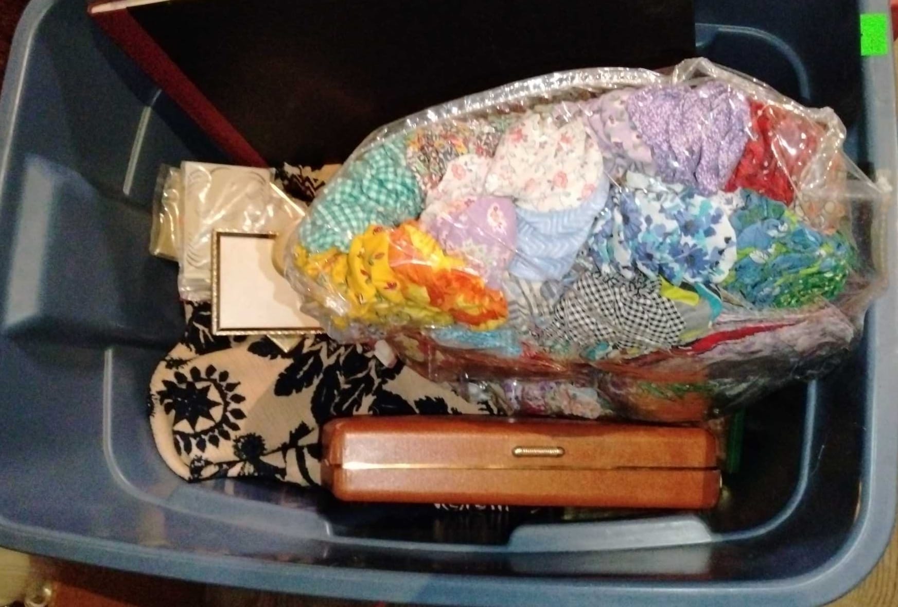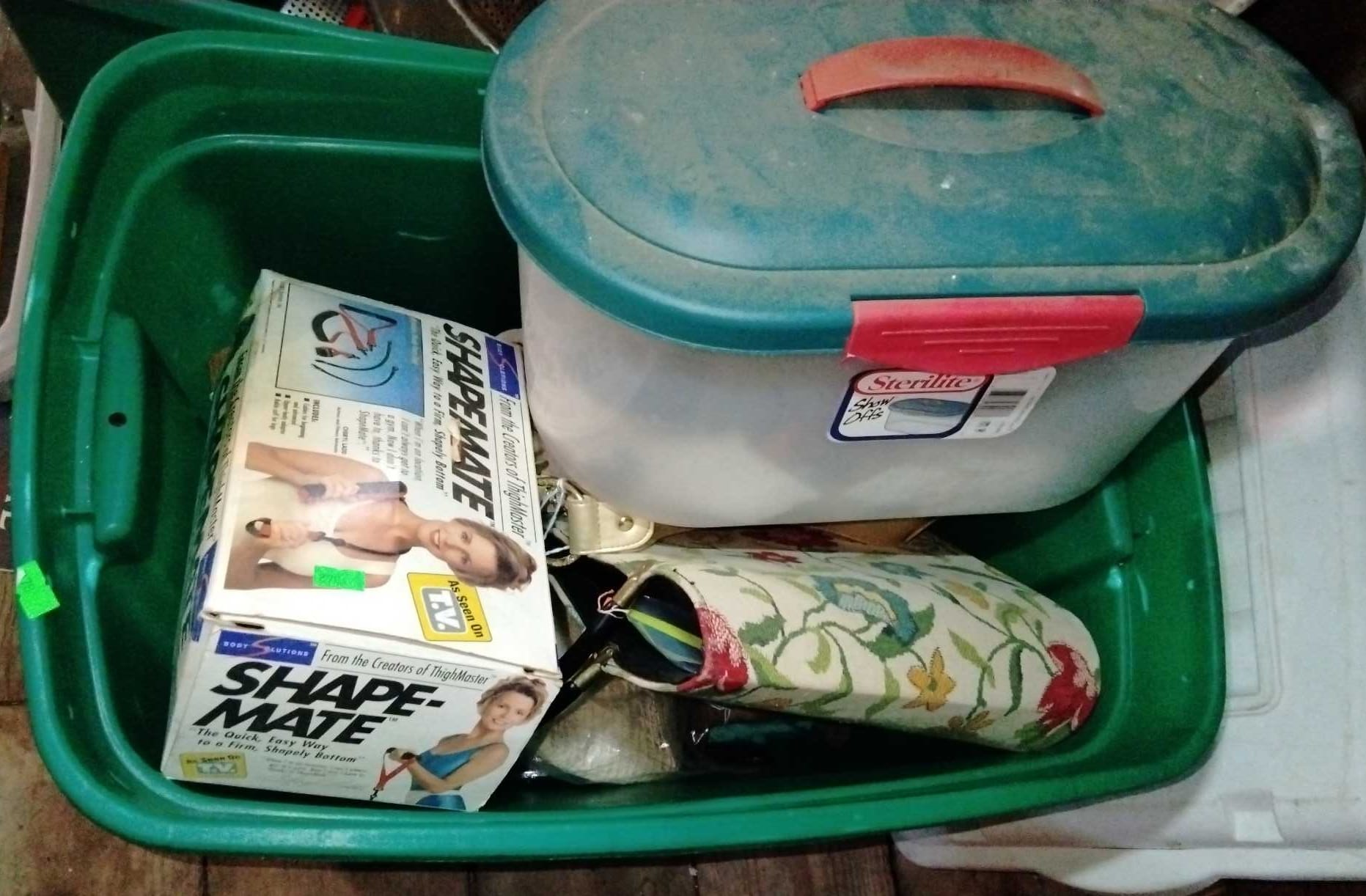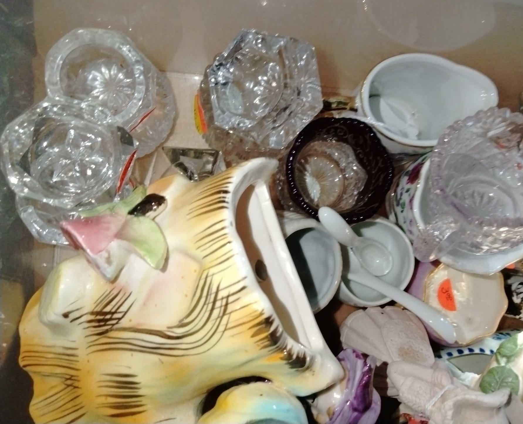 262 Divided box with Christmas ornaments, doll, glass sugar bowl, bobbins and Tin and hat box with craft items
