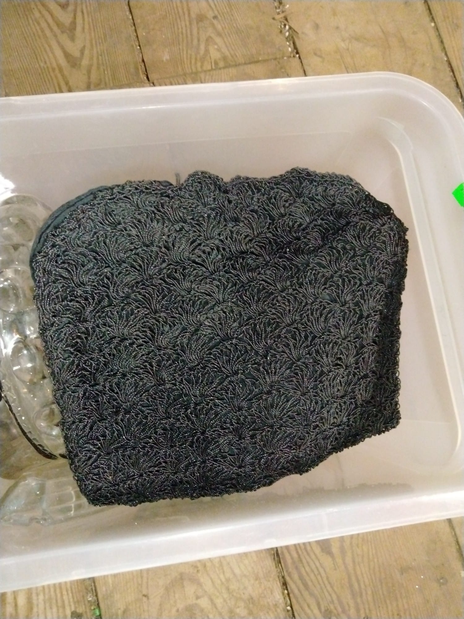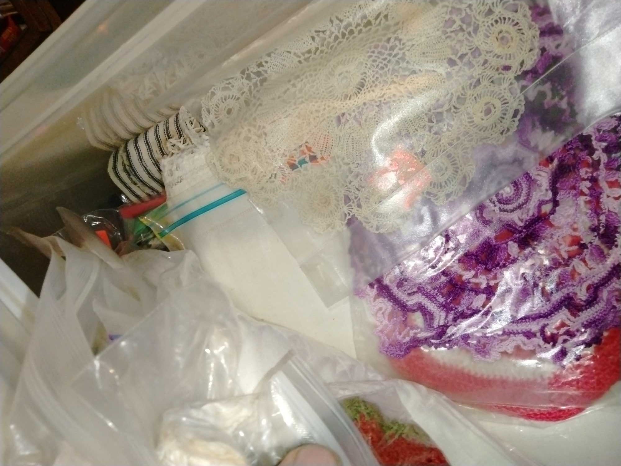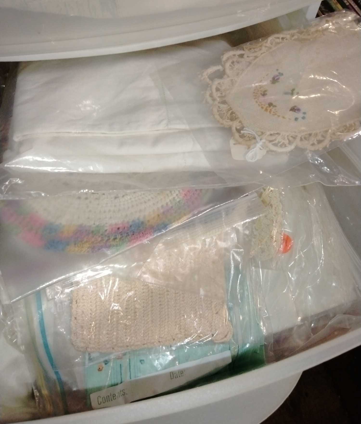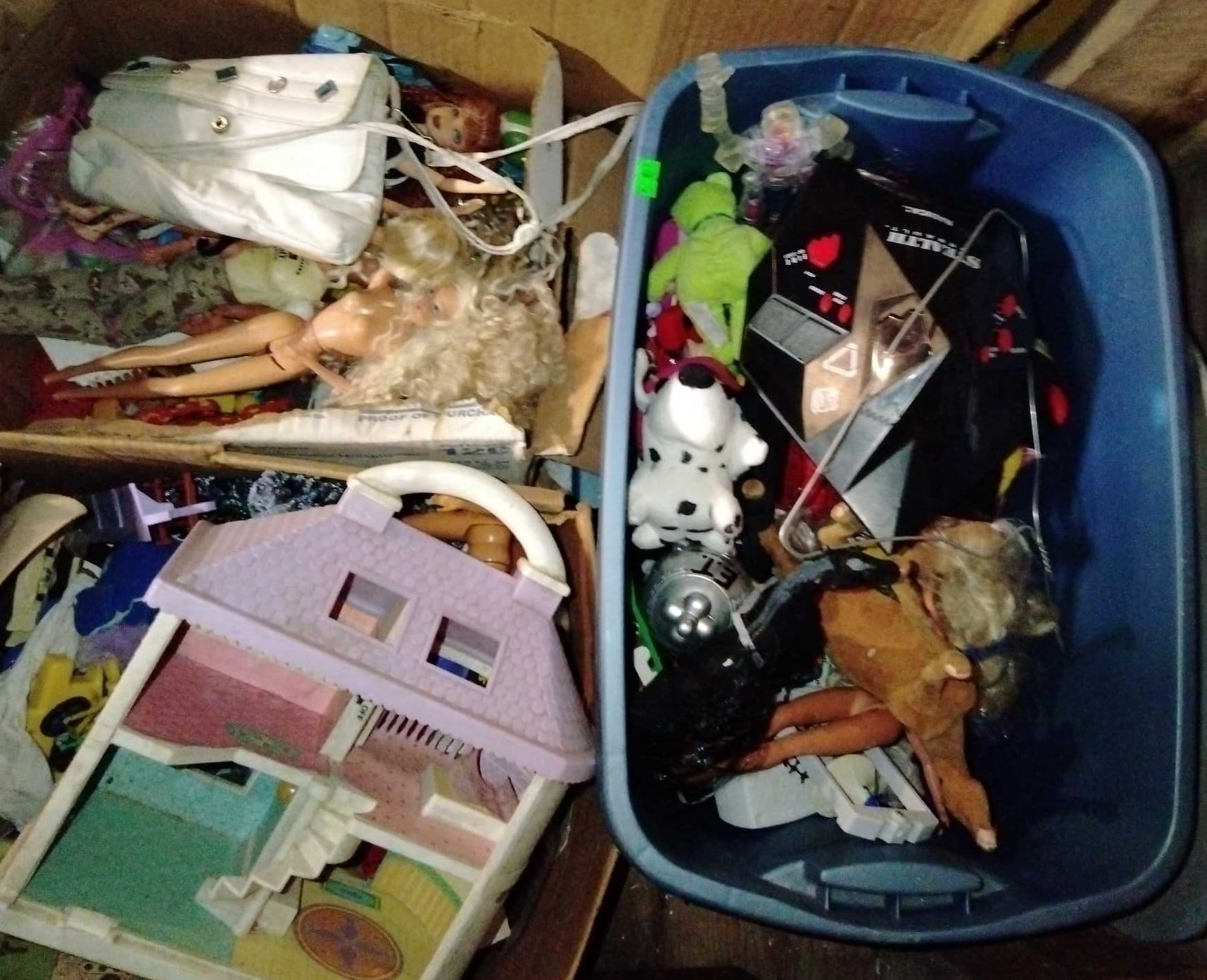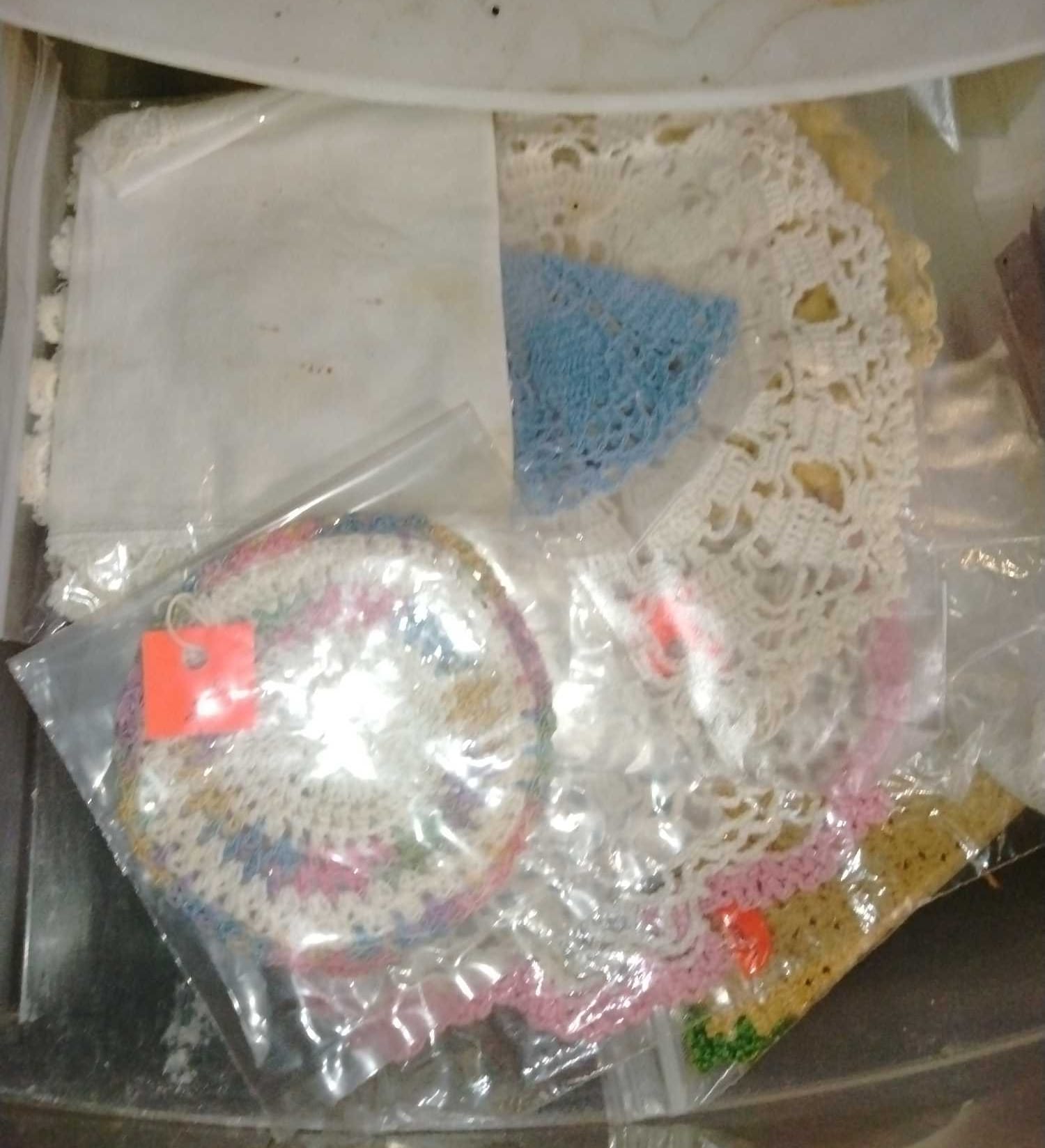 262 Divided box with Christmas ornaments, doll, glass sugar bowl, bobbins and Tin and hat box with craft items