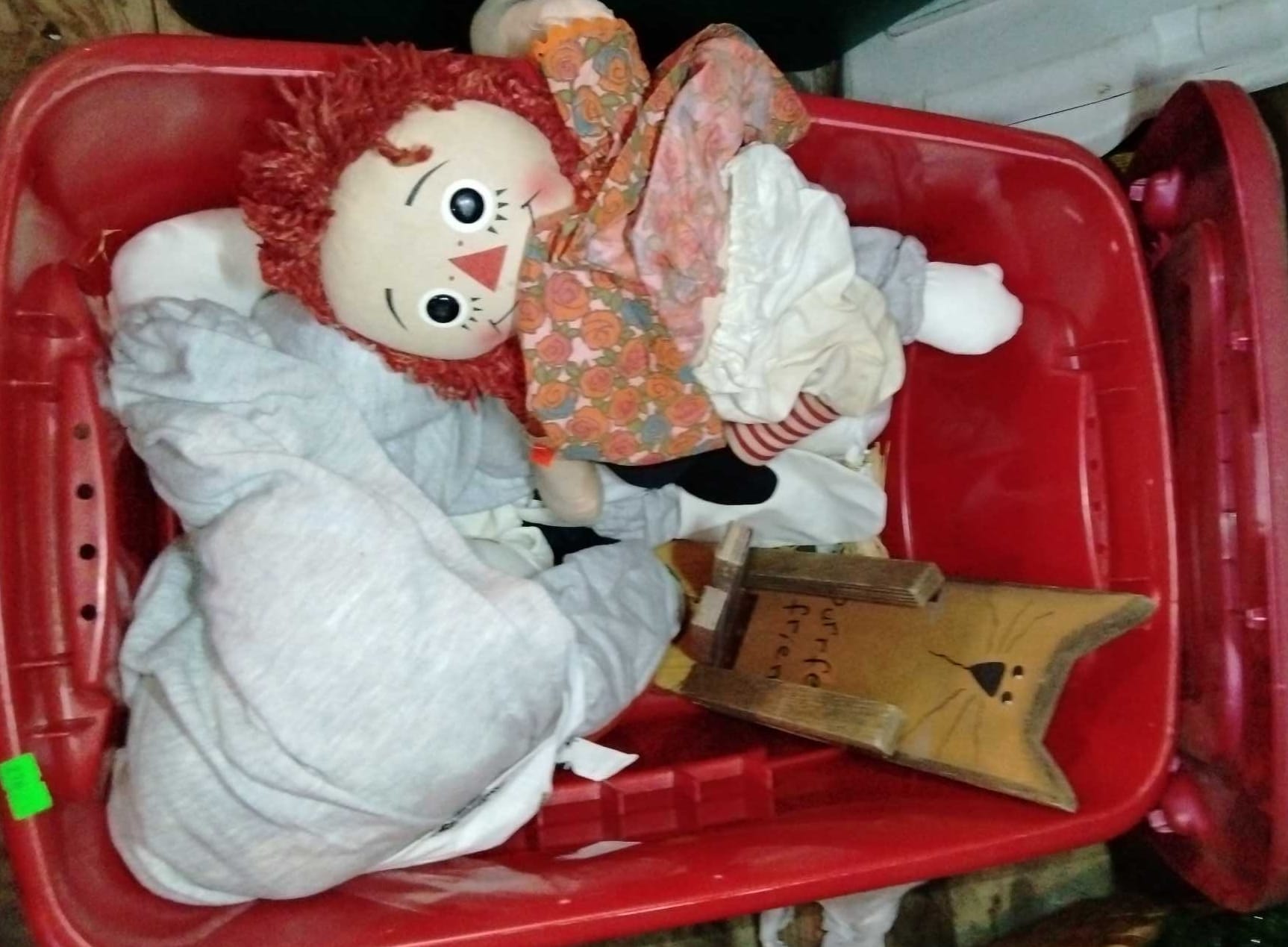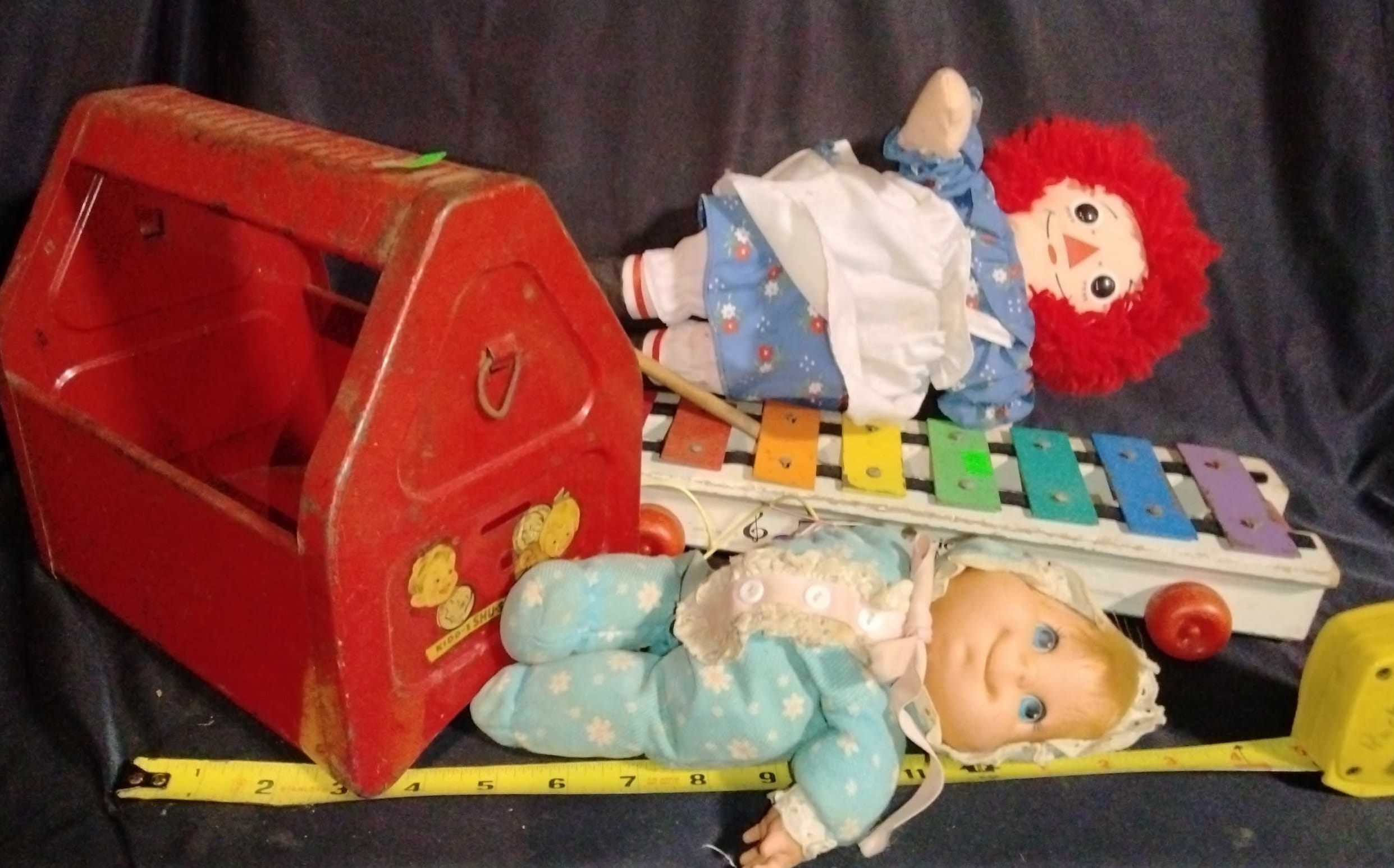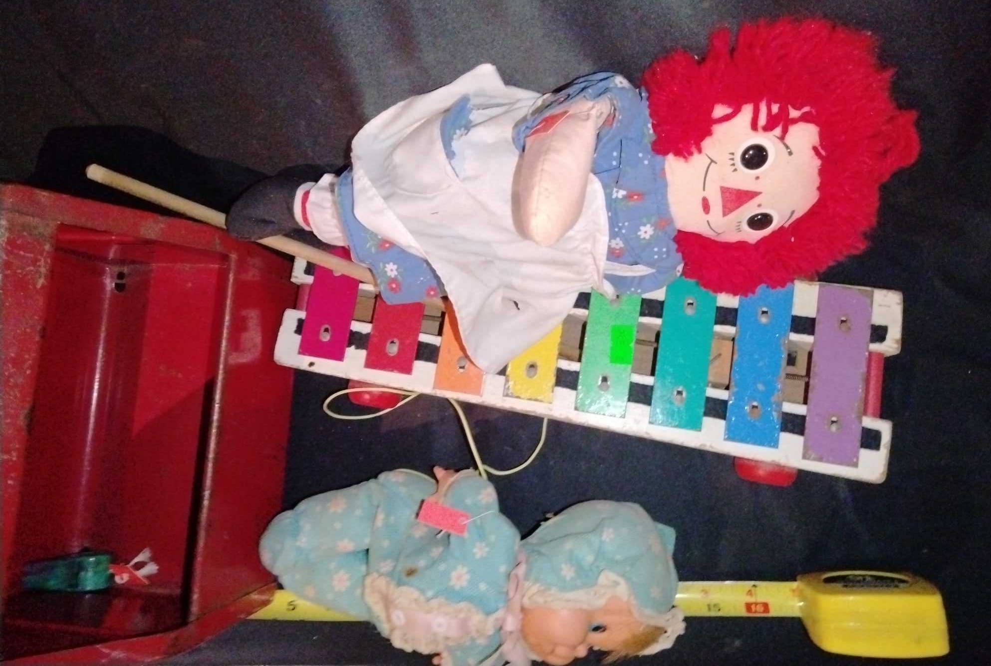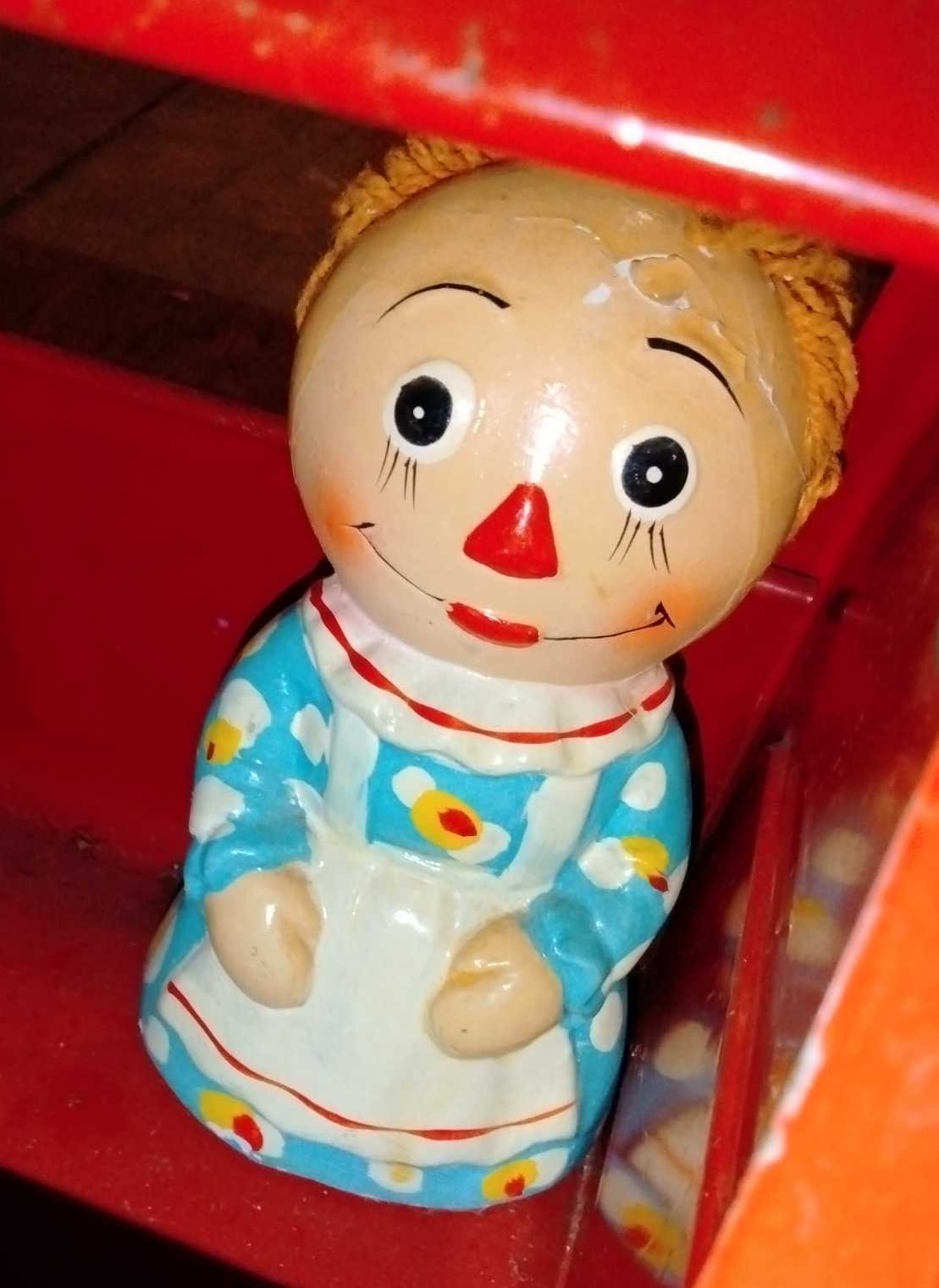 207 Amsco Sunshine Bank, wood whistle and Raggedy Ann bank