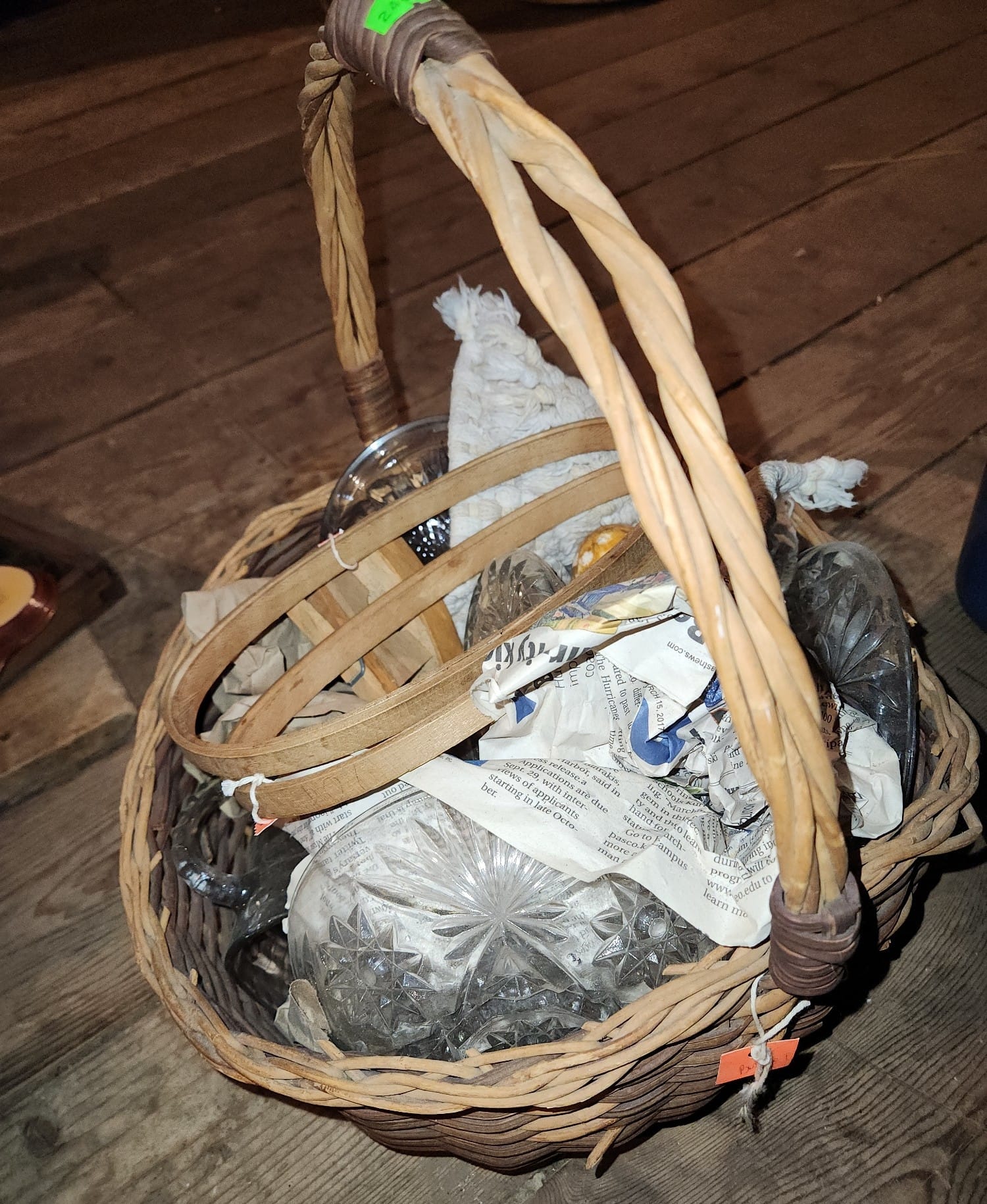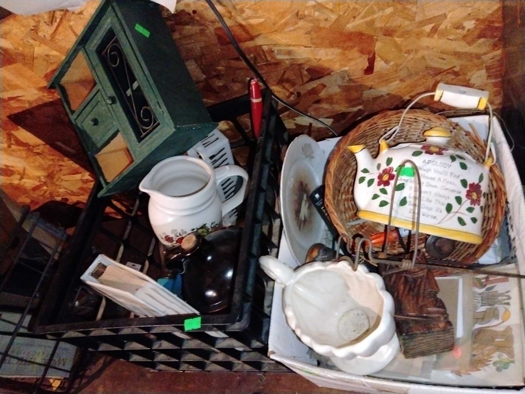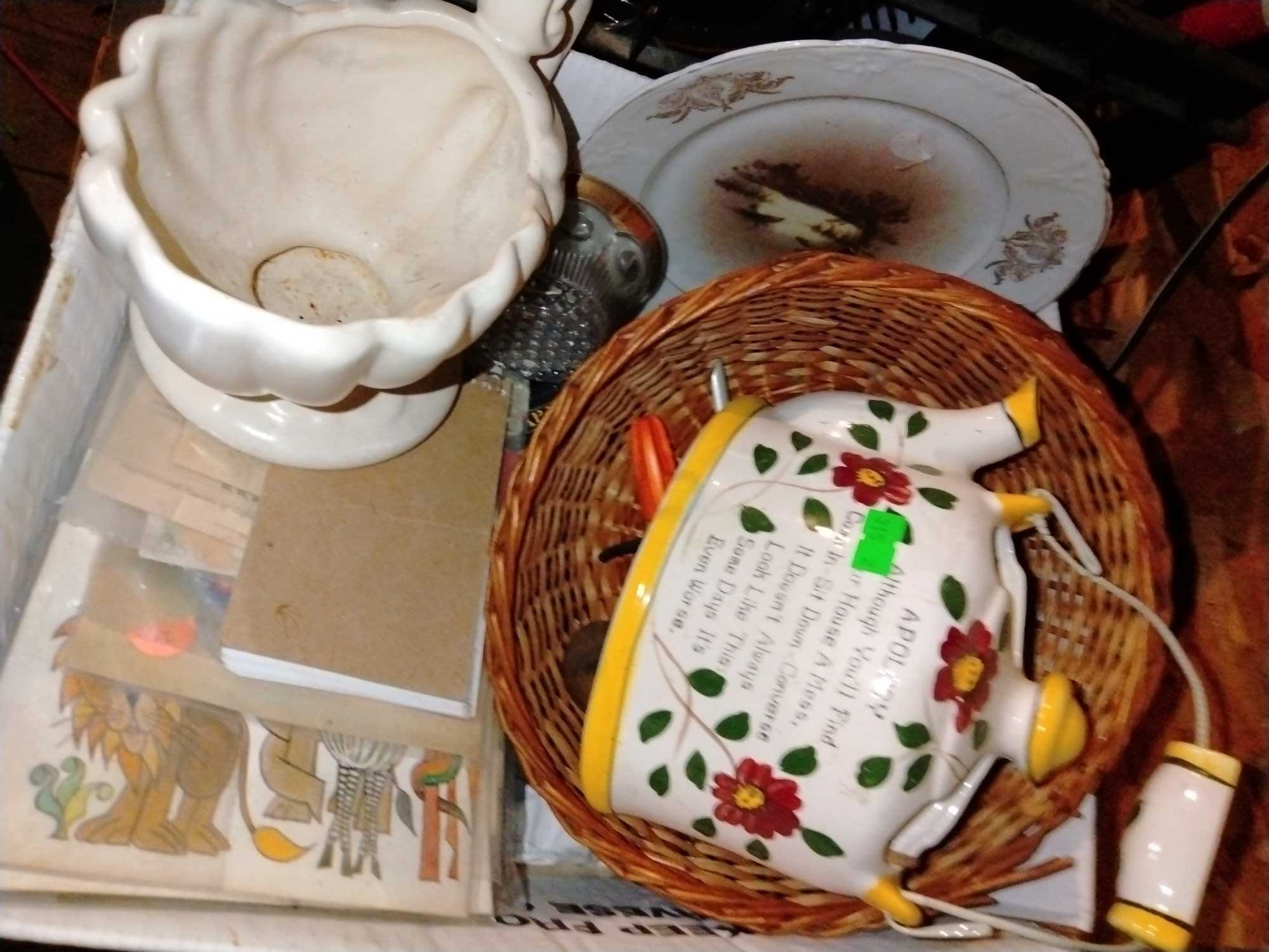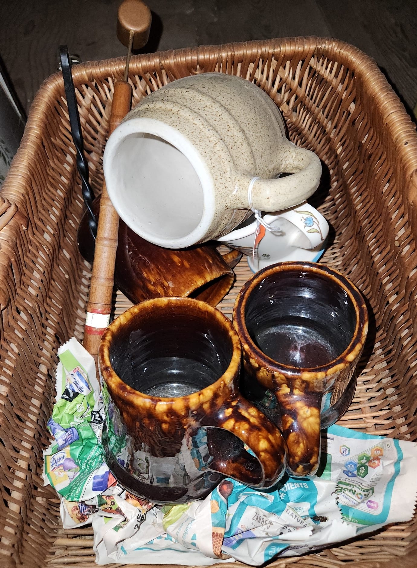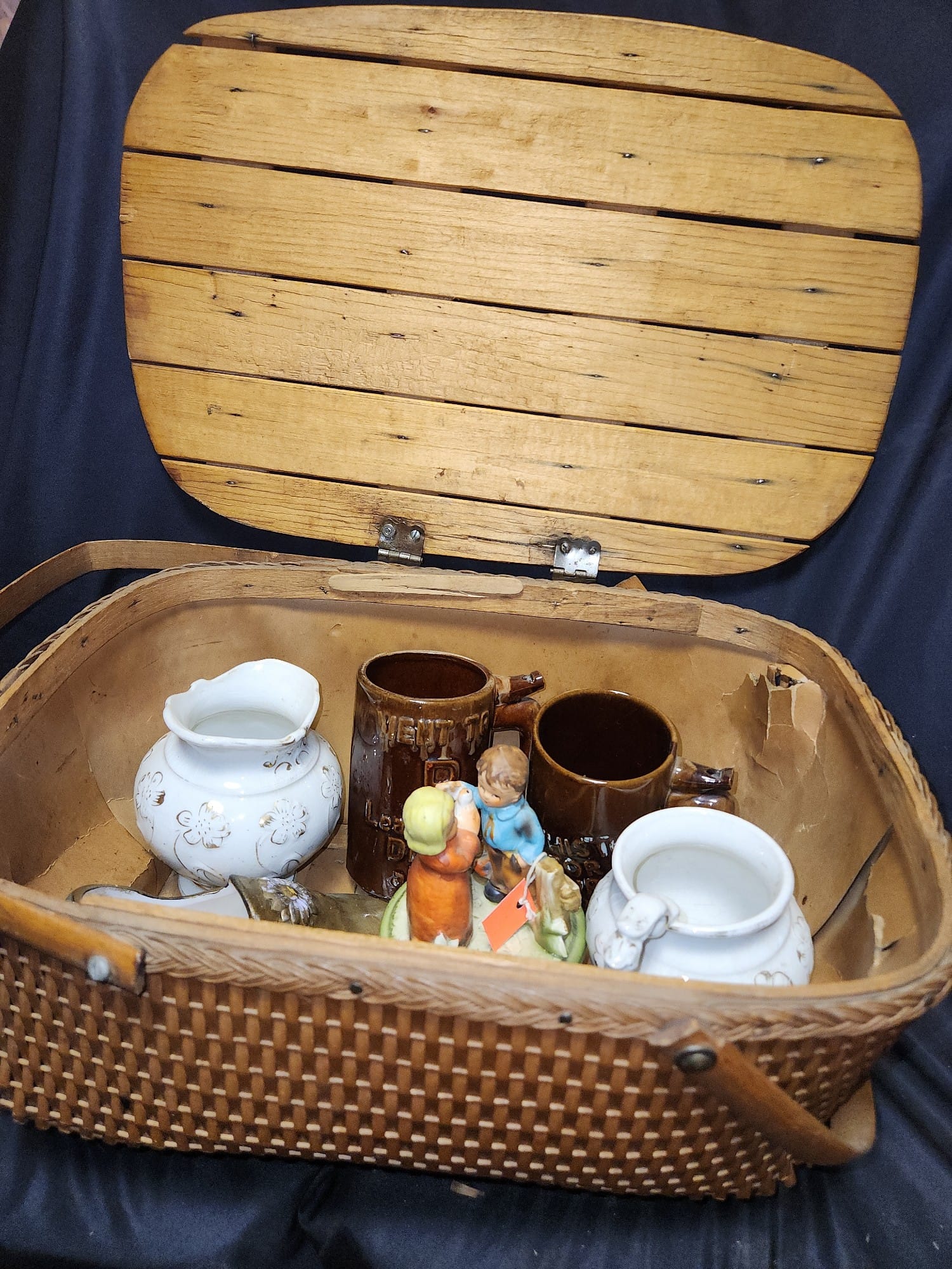 459 Basket, copper teapot - no lid, mugs, miscellaneous